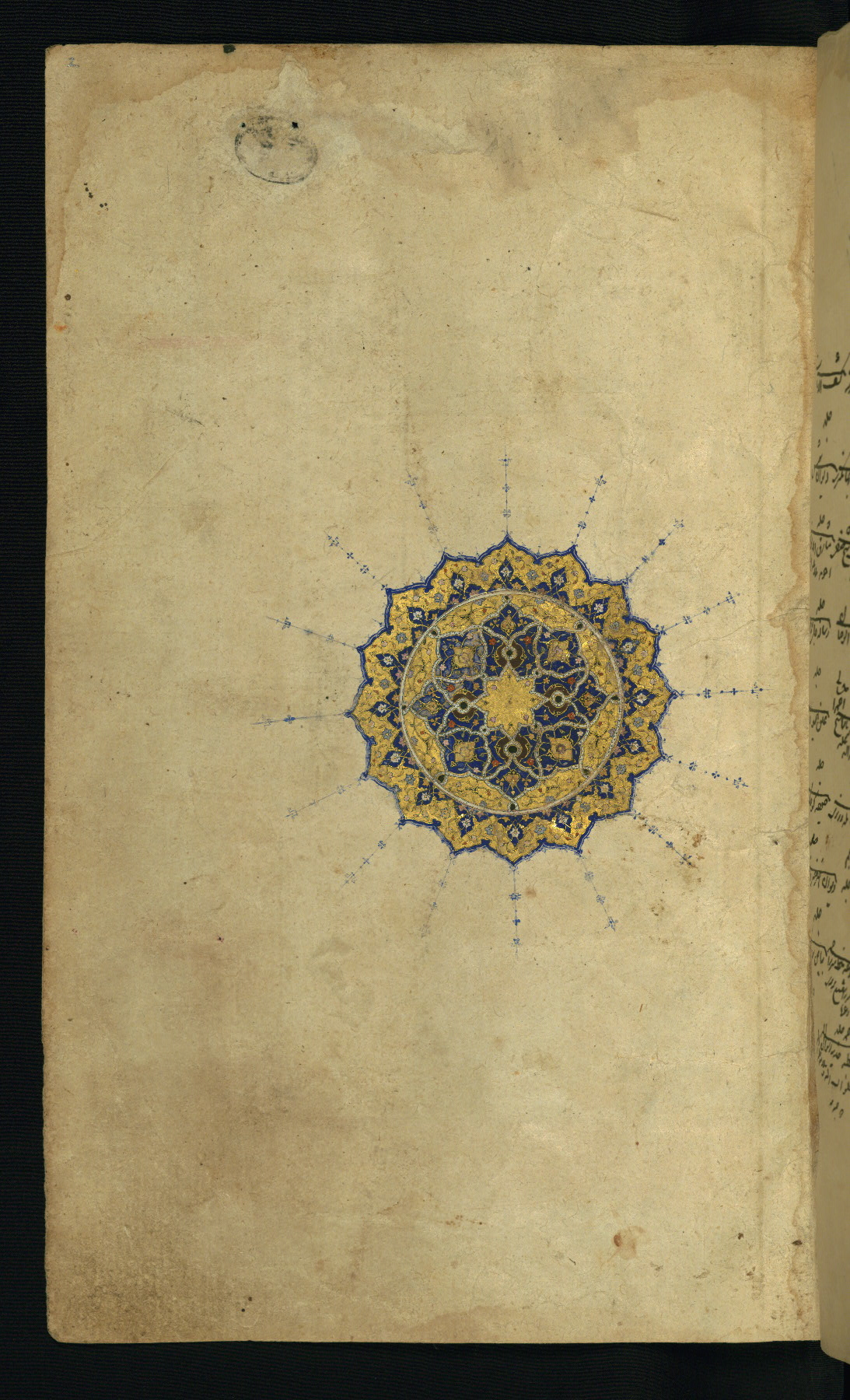 Largely attributable to the tenth century AH / sixteenth CE, with later additions; brown leather (incorrectly bound with the flap on the wrong side and folded back on itself); central lobed oval and pendants with gold-brushed scroll and floral design; blue outer margin