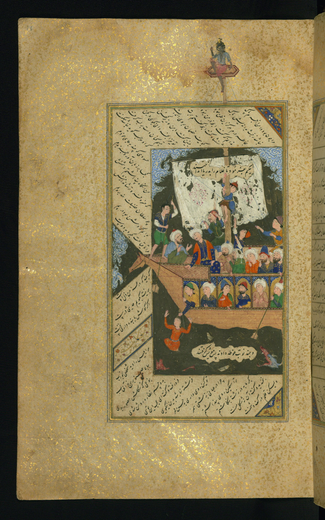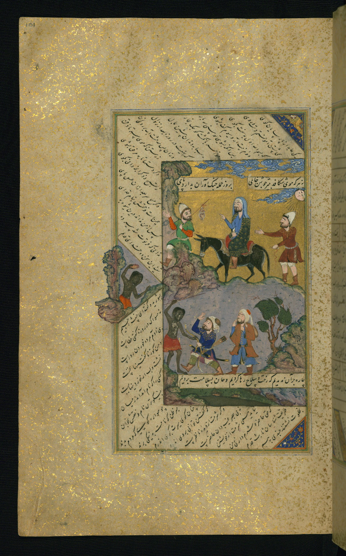 - Hand note: Written mainly in black nastaʿlīq script, with incidentals and titles/chapter headings in gold riqāʿ script