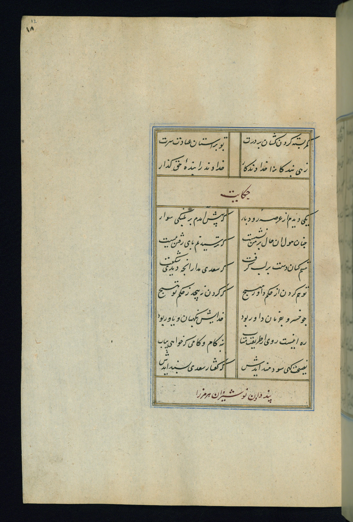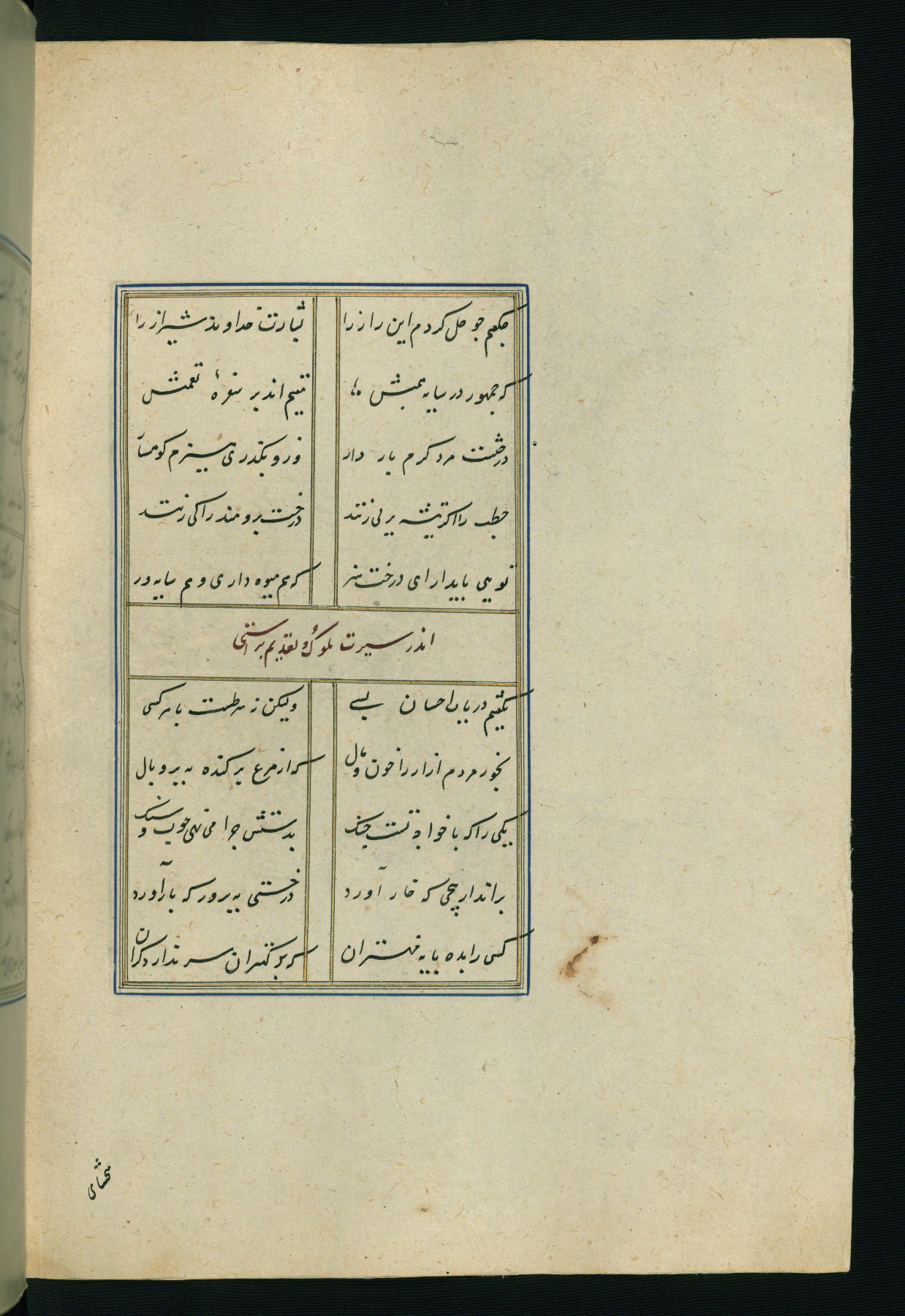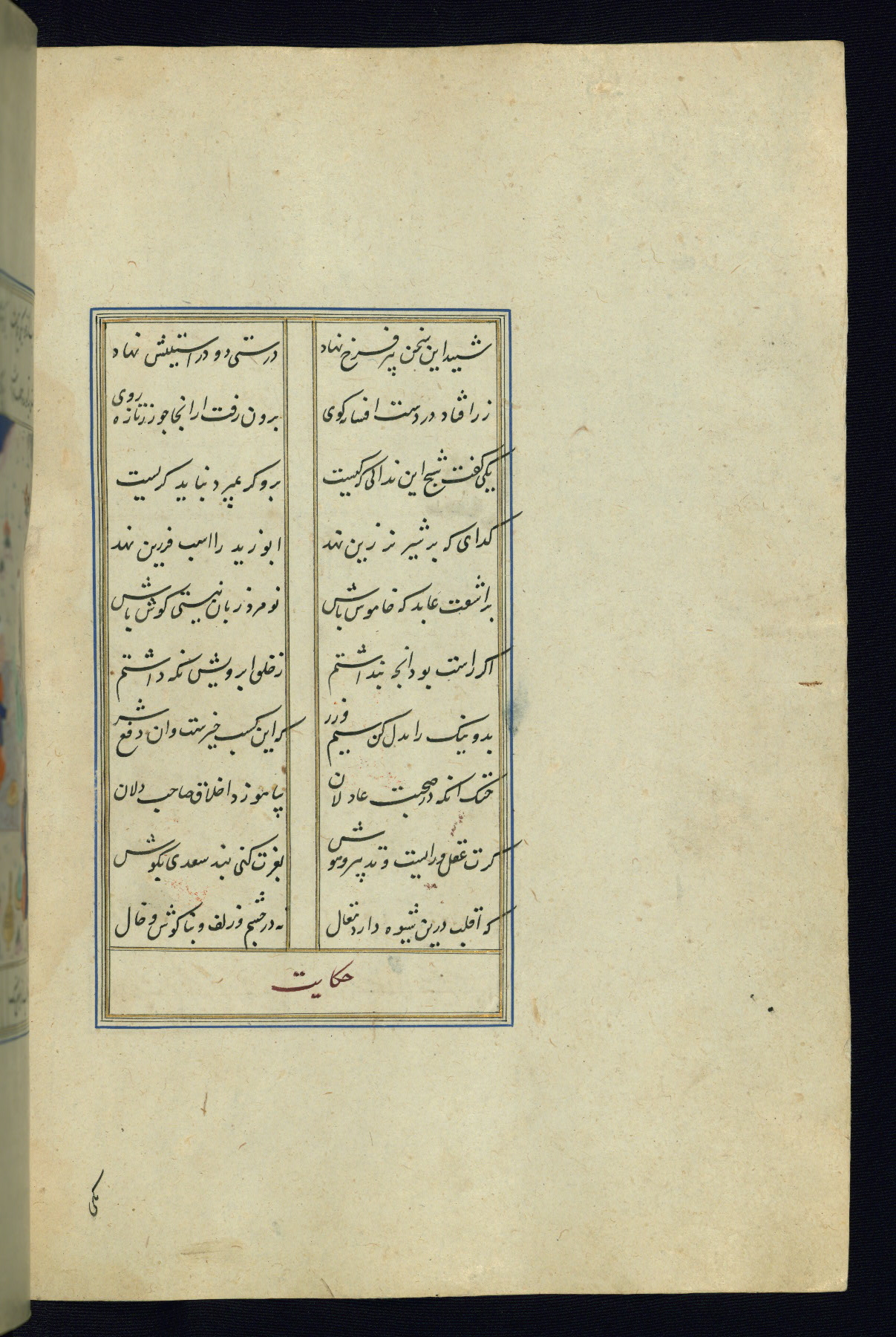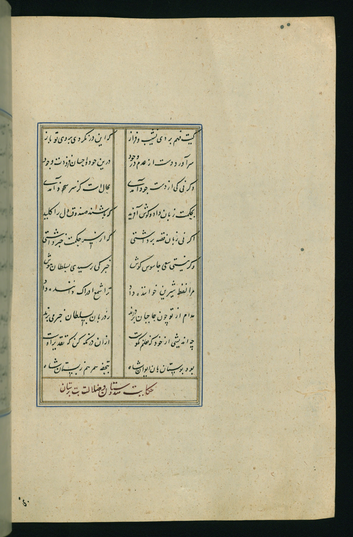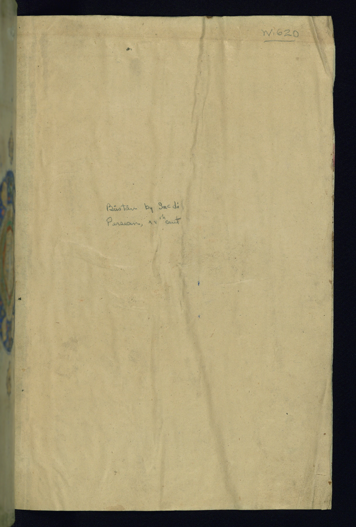 This is an illuminated and illustrated Safavid copy of the Būstān (The garden or The orchard), composed by Sa’dī (d. 691 AH / 1292 CE). It was written in black nasta’līq script in the ninth century AH / sixteenth CE in Iran. The codex opens with a frontispiece with the title Kitāb-i būstān inscribed in an illuminated medallion (fol. 1a), followed by a double-page illustration of a banquet scene in a landscape (fols. 1b-2a). Additionally, there are five paintings illustrating the text (fols. 25a, 55b, 58a, 93b, and 119b). The brown leather, blind-stamped binding decorated with a central oval and pendants is not contemporary with the manuscript.