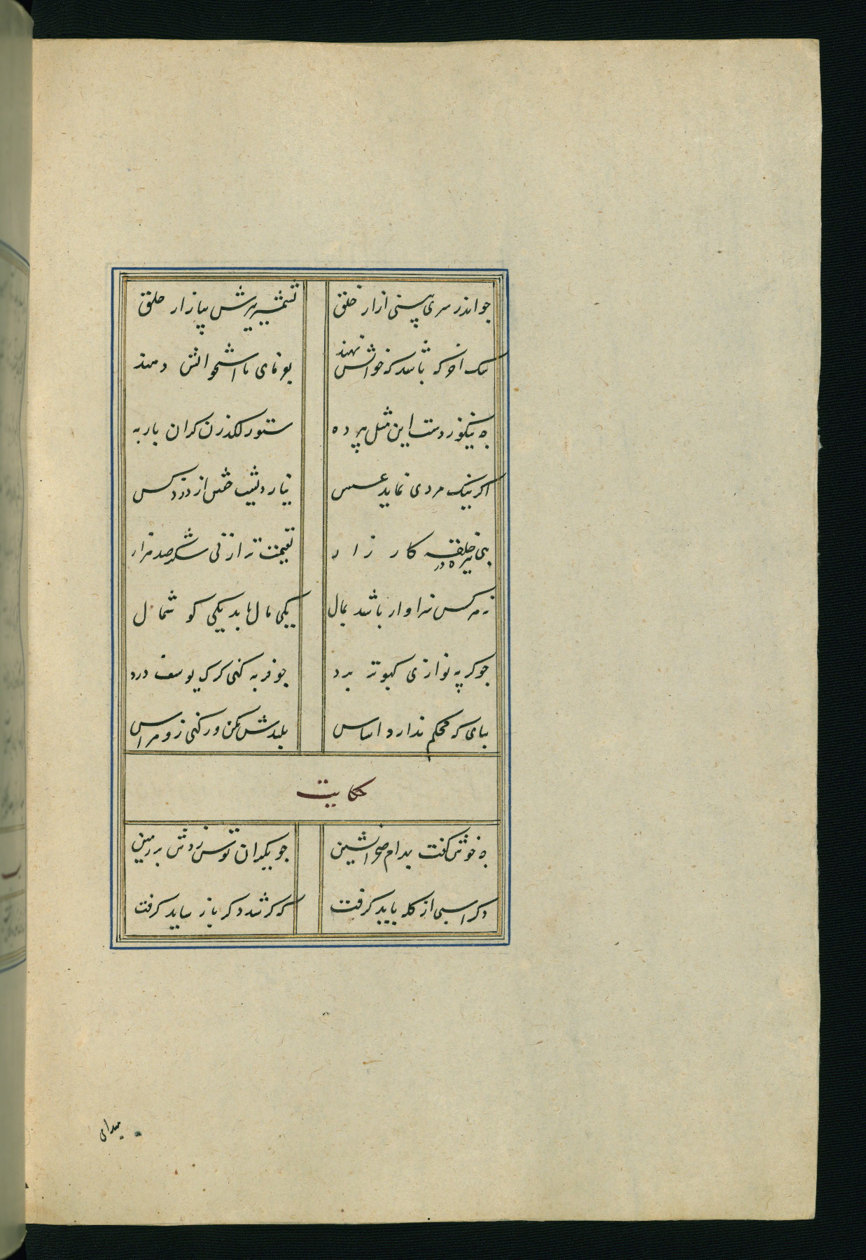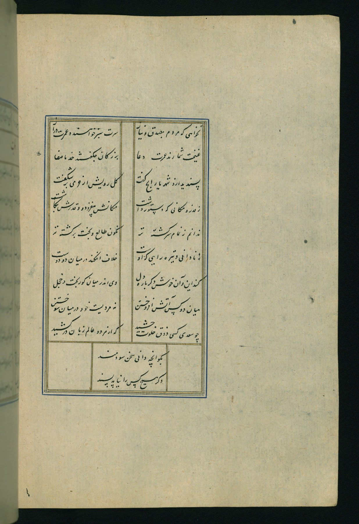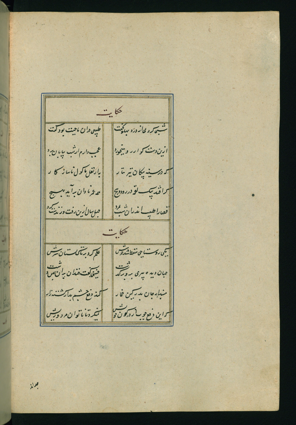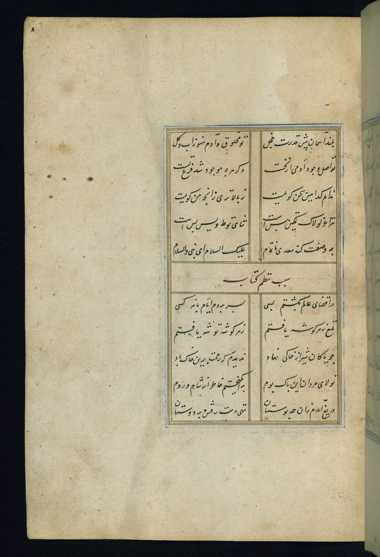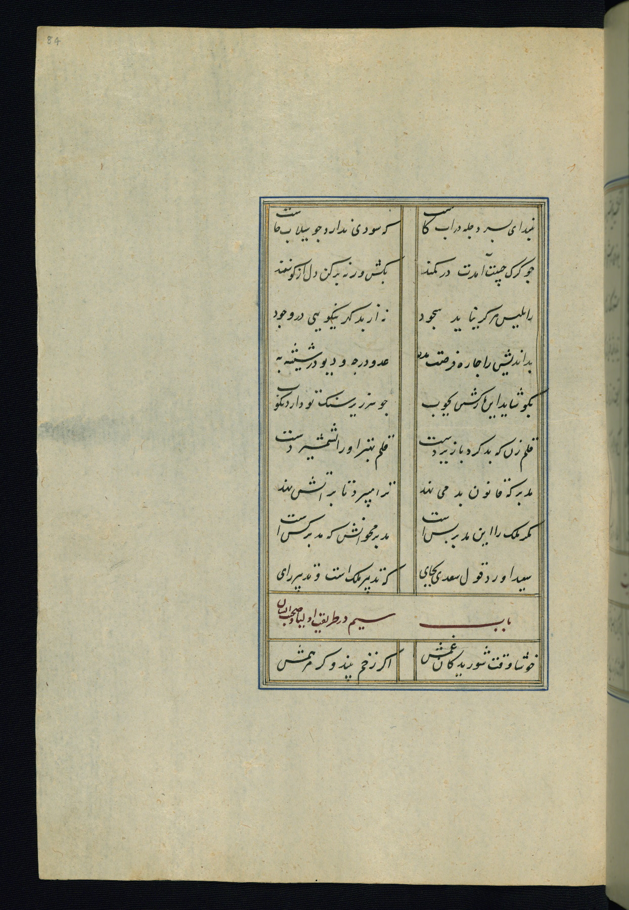 This is an illuminated and illustrated Safavid copy of the Būstān (The garden or The orchard), composed by Sa’dī (d. 691 AH / 1292 CE). It was written in black nasta’līq script in the ninth century AH / sixteenth CE in Iran. The codex opens with a frontispiece with the title Kitāb-i būstān inscribed in an illuminated medallion (fol. 1a), followed by a double-page illustration of a banquet scene in a landscape (fols. 1b-2a). Additionally, there are five paintings illustrating the text (fols. 25a, 55b, 58a, 93b, and 119b). The brown leather, blind-stamped binding decorated with a central oval and pendants is not contemporary with the manuscript.