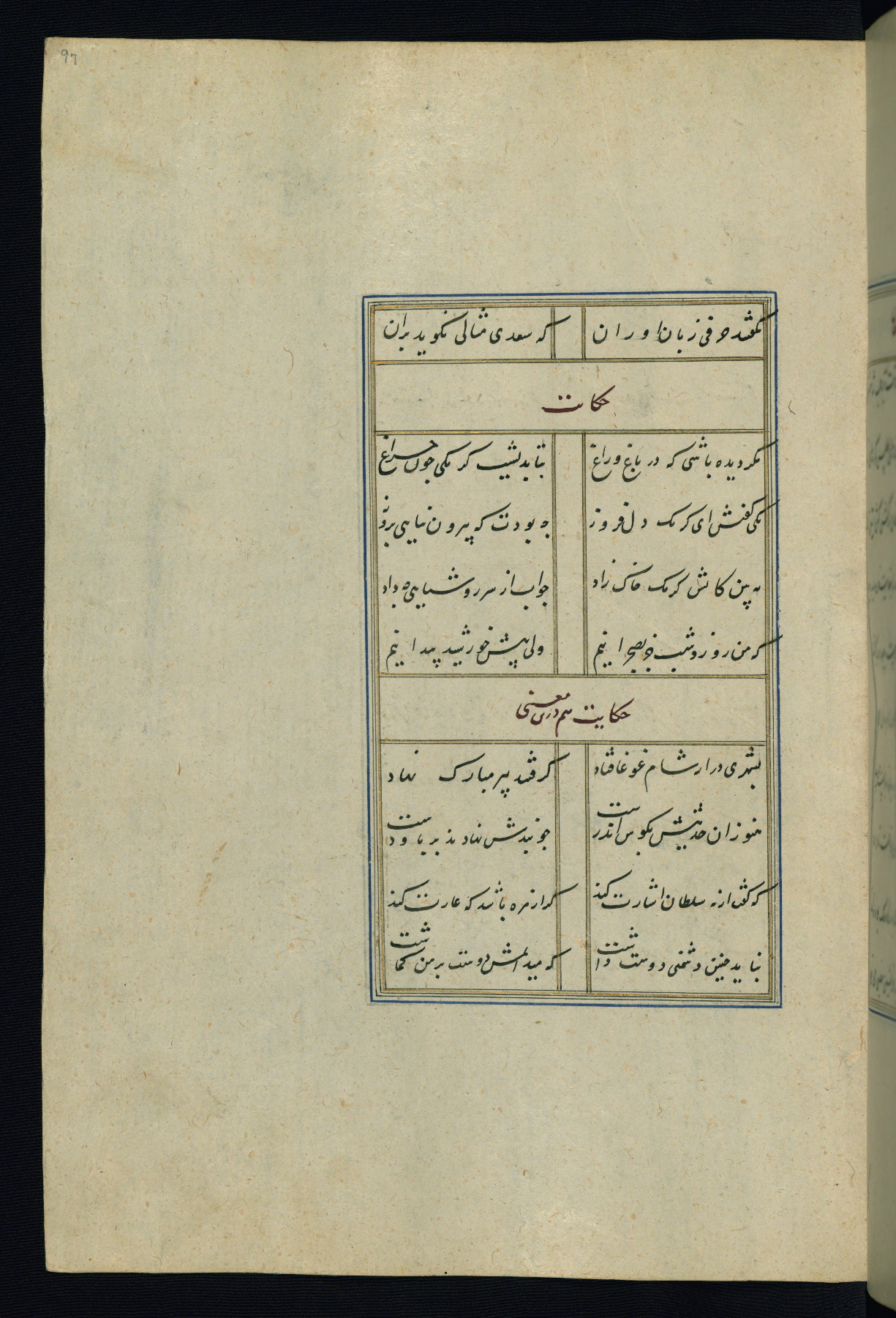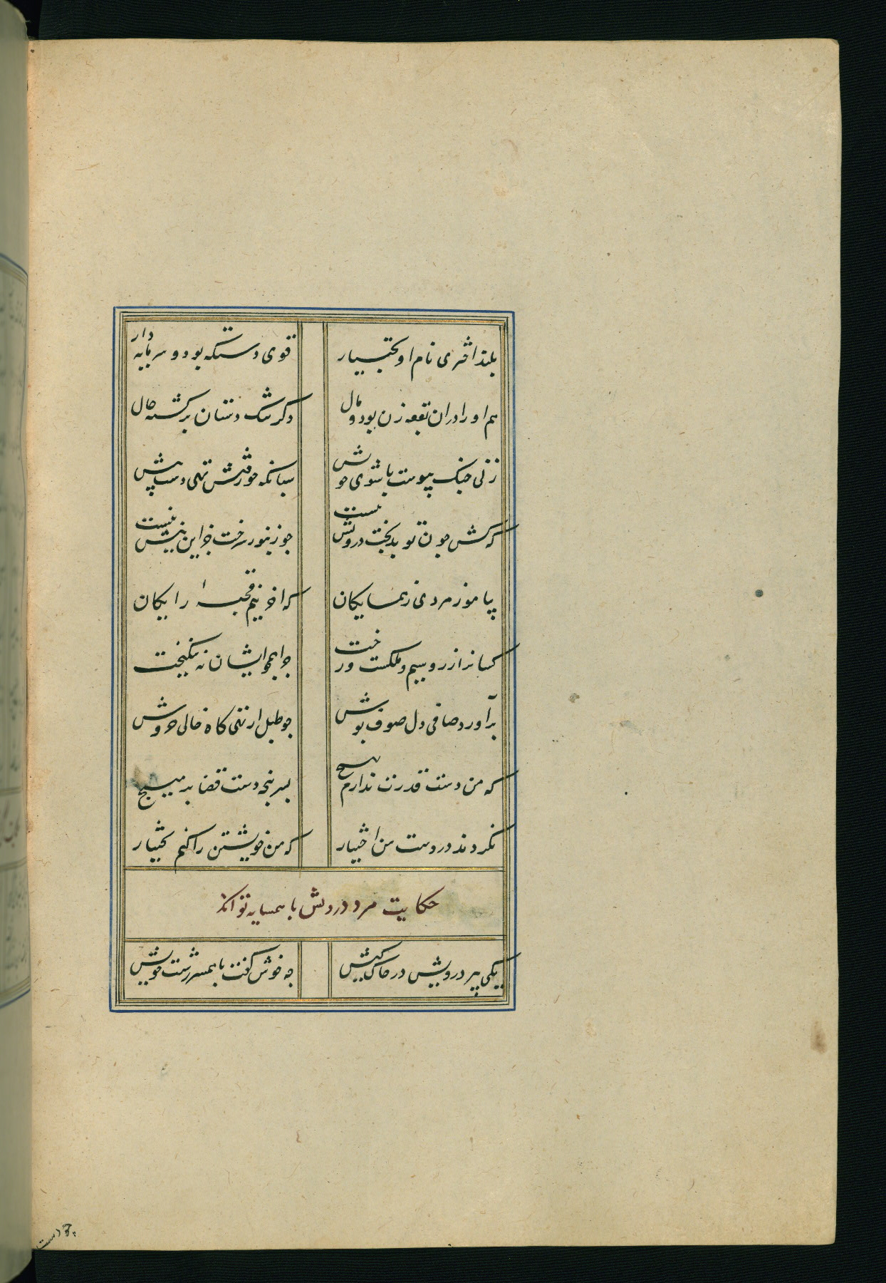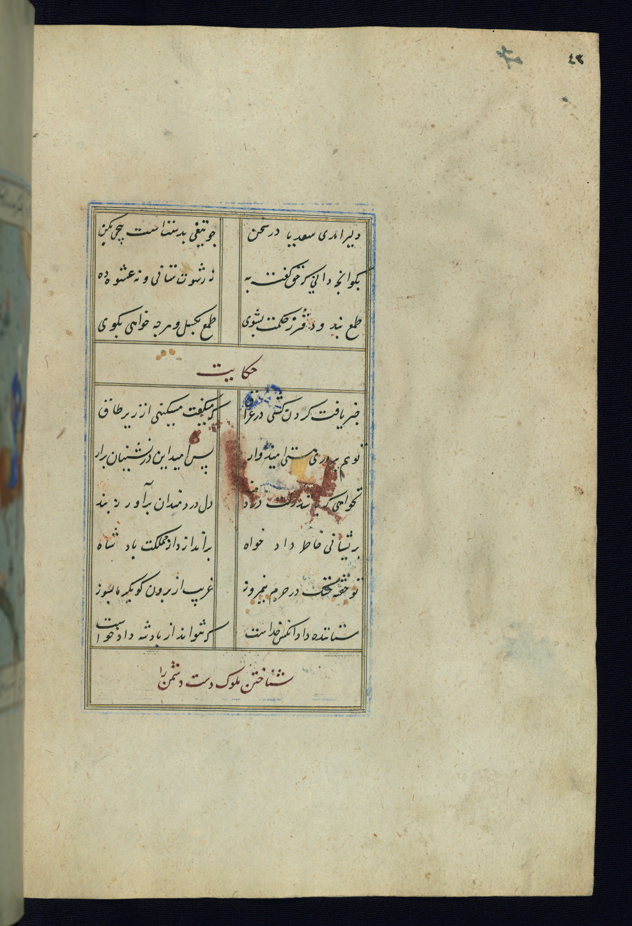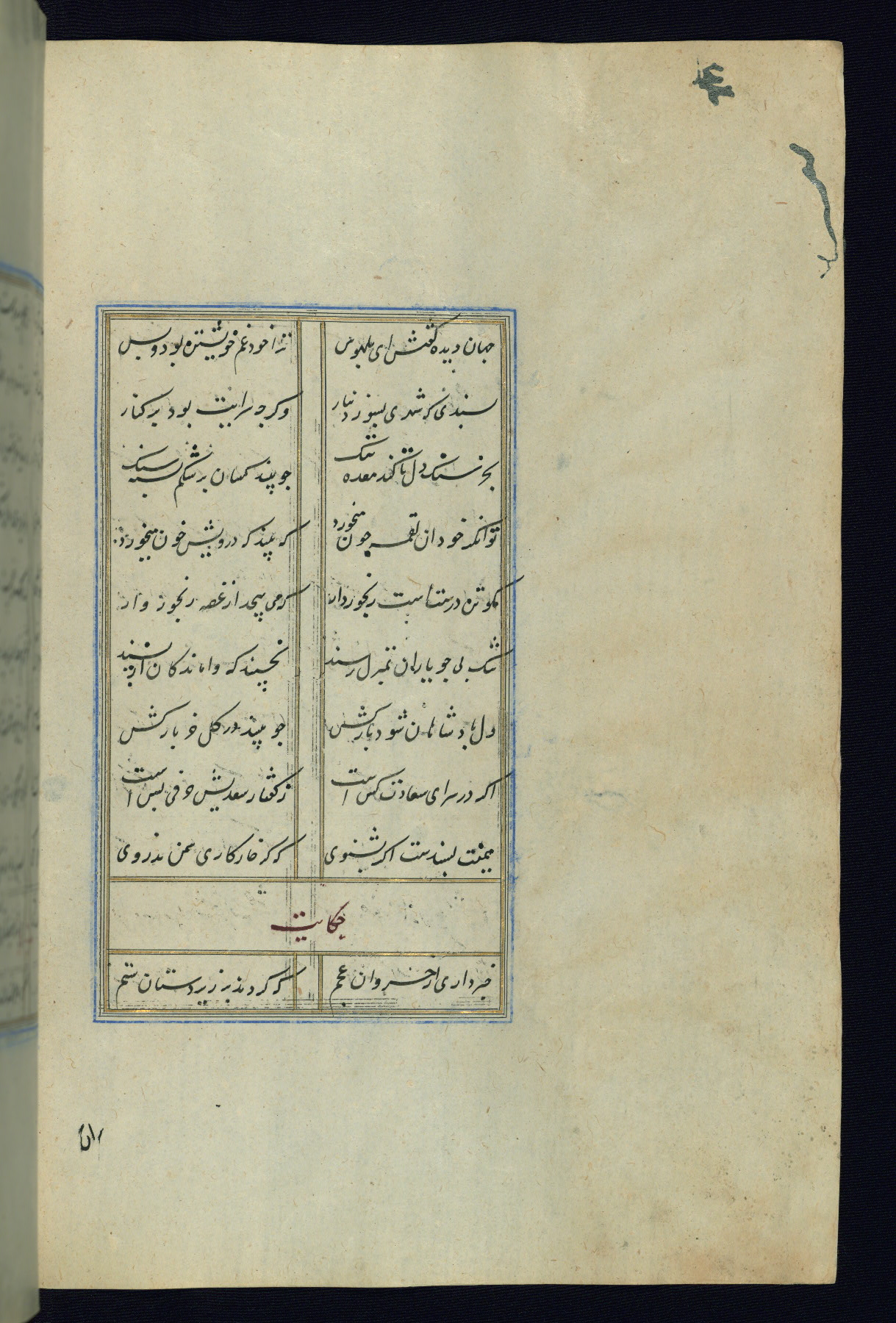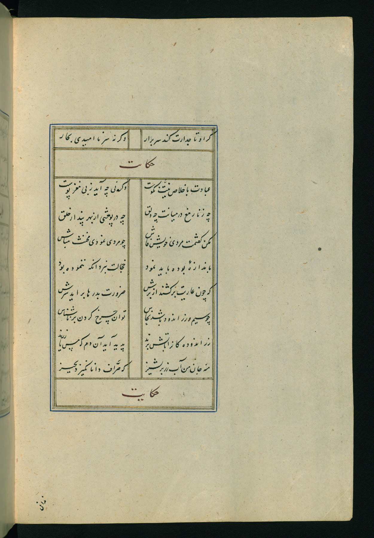 This is an illuminated and illustrated Safavid copy of the Būstān (The garden or The orchard), composed by Sa’dī (d. 691 AH / 1292 CE). It was written in black nasta’līq script in the ninth century AH / sixteenth CE in Iran. The codex opens with a frontispiece with the title Kitāb-i būstān inscribed in an illuminated medallion (fol. 1a), followed by a double-page illustration of a banquet scene in a landscape (fols. 1b-2a). Additionally, there are five paintings illustrating the text (fols. 25a, 55b, 58a, 93b, and 119b). The brown leather, blind-stamped binding decorated with a central oval and pendants is not contemporary with the manuscript.