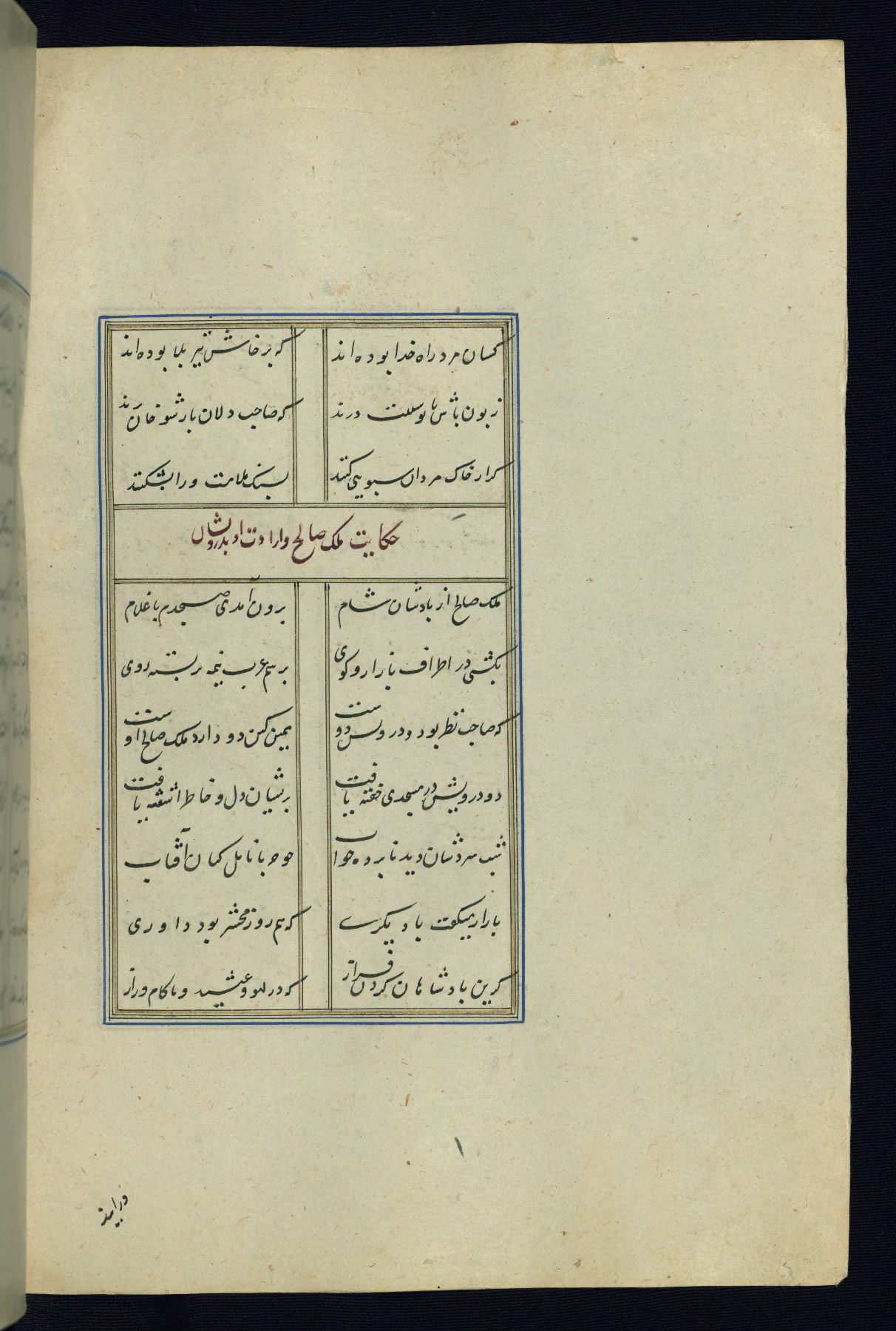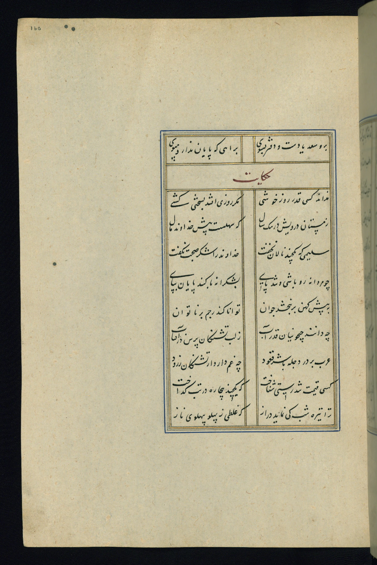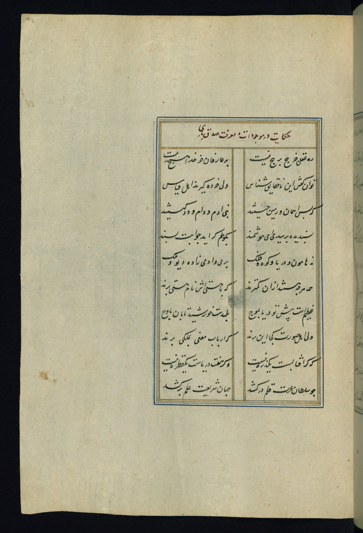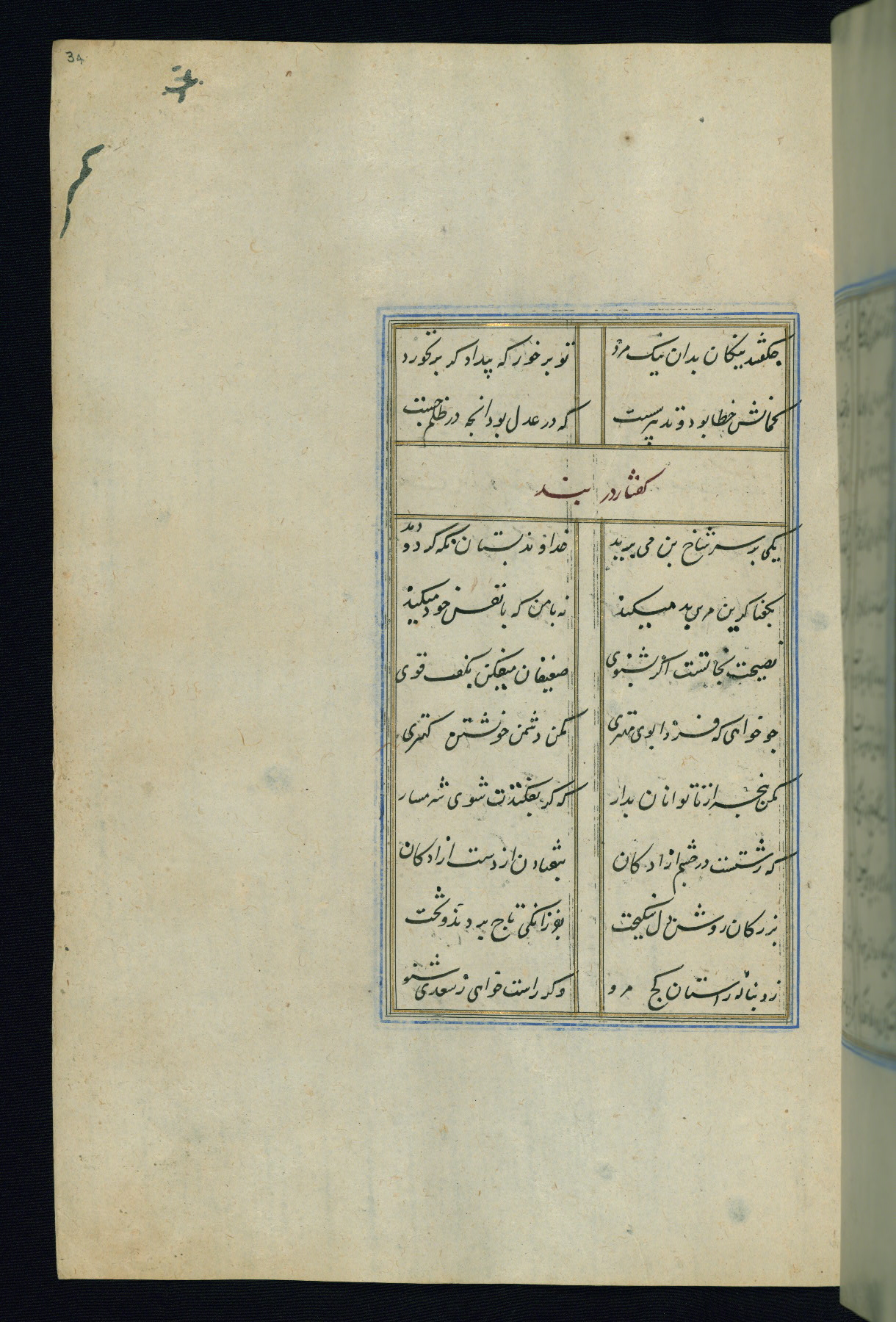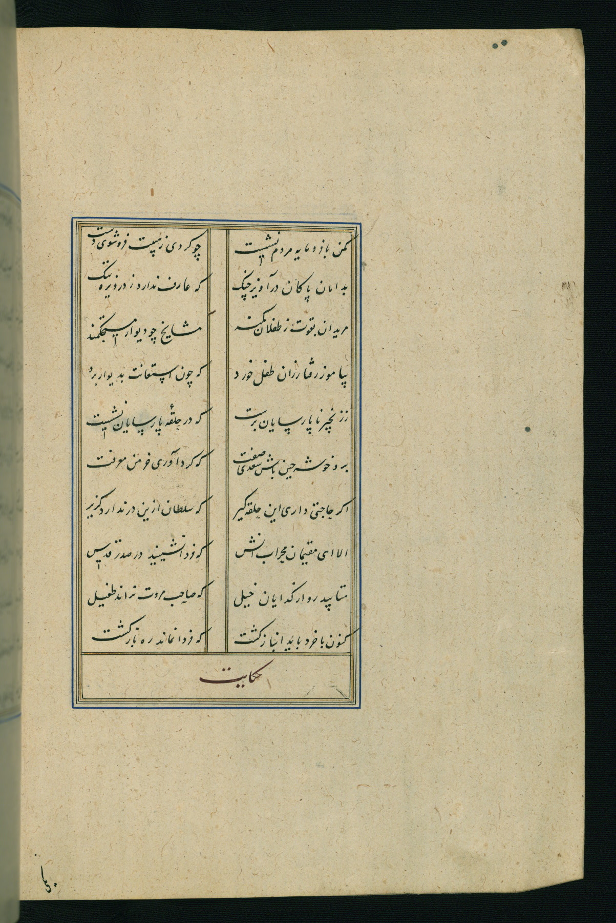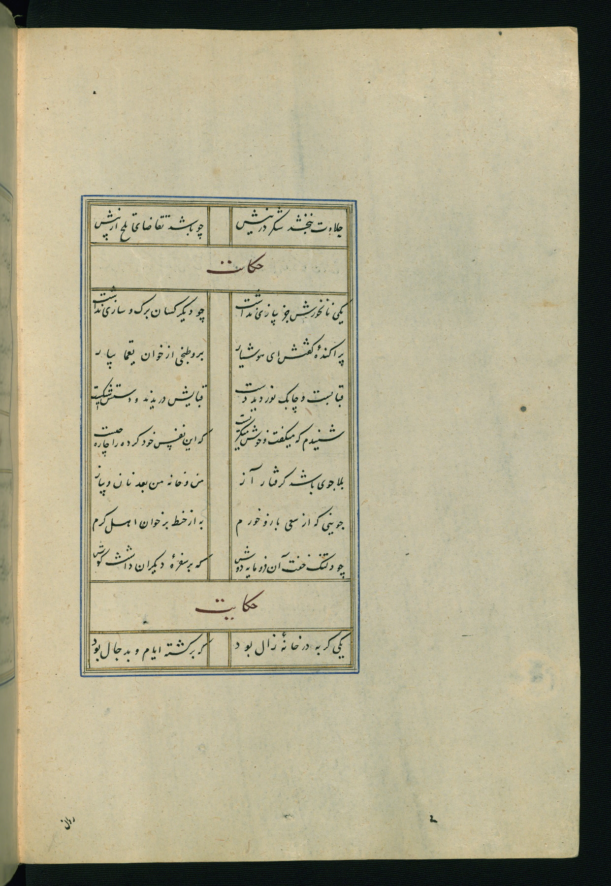 This is an illuminated and illustrated Safavid copy of the Būstān (The garden or The orchard), composed by Sa’dī (d. 691 AH / 1292 CE). It was written in black nasta’līq script in the ninth century AH / sixteenth CE in Iran. The codex opens with a frontispiece with the title Kitāb-i būstān inscribed in an illuminated medallion (fol. 1a), followed by a double-page illustration of a banquet scene in a landscape (fols. 1b-2a). Additionally, there are five paintings illustrating the text (fols. 25a, 55b, 58a, 93b, and 119b). The brown leather, blind-stamped binding decorated with a central oval and pendants is not contemporary with the manuscript.
