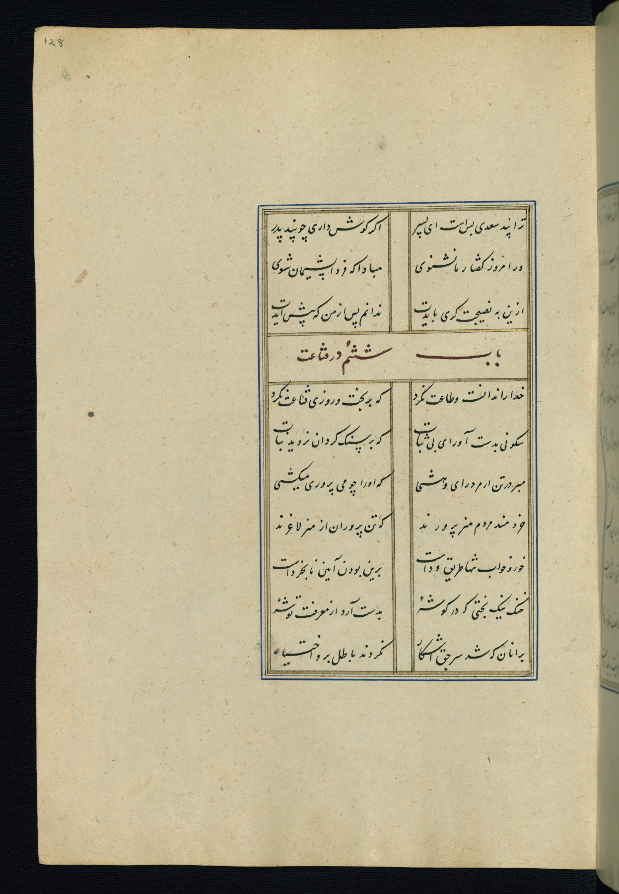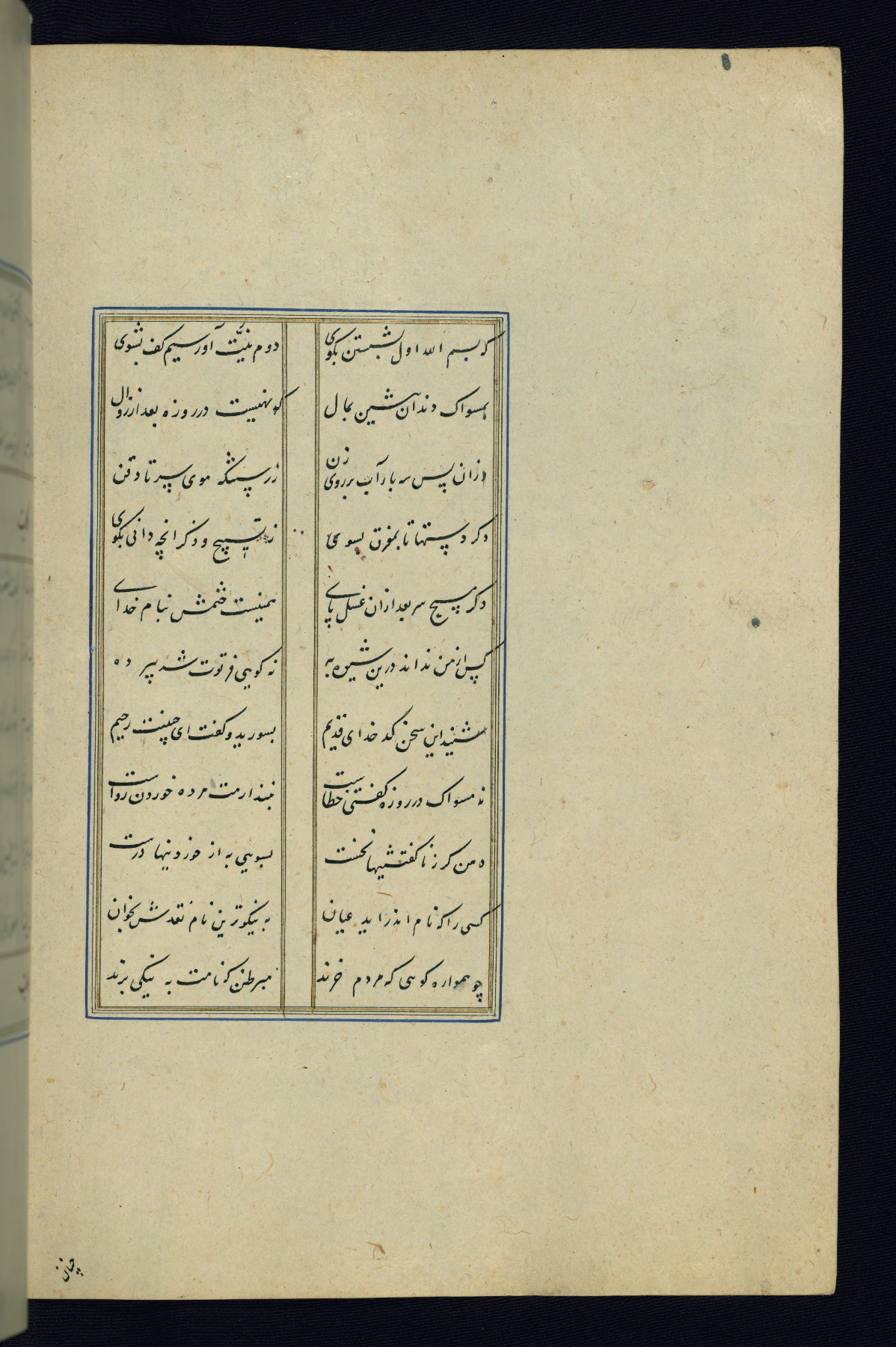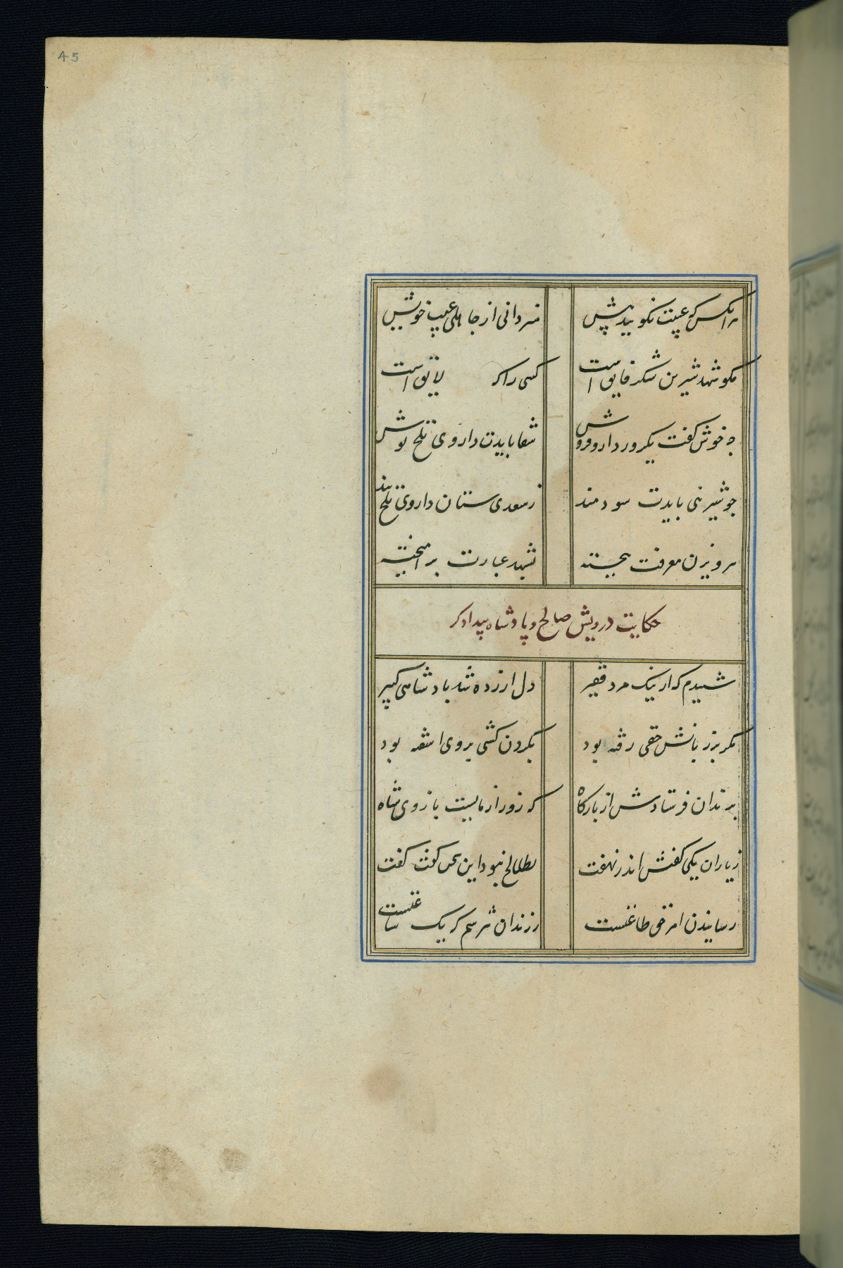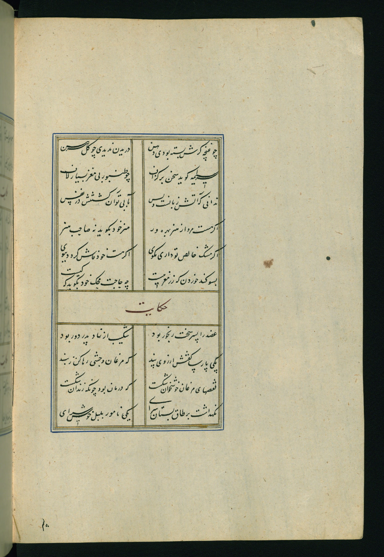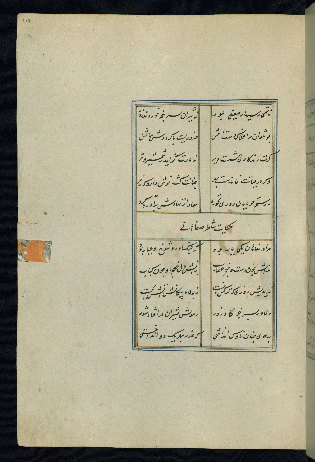 This is an illuminated and illustrated Safavid copy of the Būstān (The garden or The orchard), composed by Sa’dī (d. 691 AH / 1292 CE). It was written in black nasta’līq script in the ninth century AH / sixteenth CE in Iran. The codex opens with a frontispiece with the title Kitāb-i būstān inscribed in an illuminated medallion (fol. 1a), followed by a double-page illustration of a banquet scene in a landscape (fols. 1b-2a). Additionally, there are five paintings illustrating the text (fols. 25a, 55b, 58a, 93b, and 119b). The brown leather, blind-stamped binding decorated with a central oval and pendants is not contemporary with the manuscript.