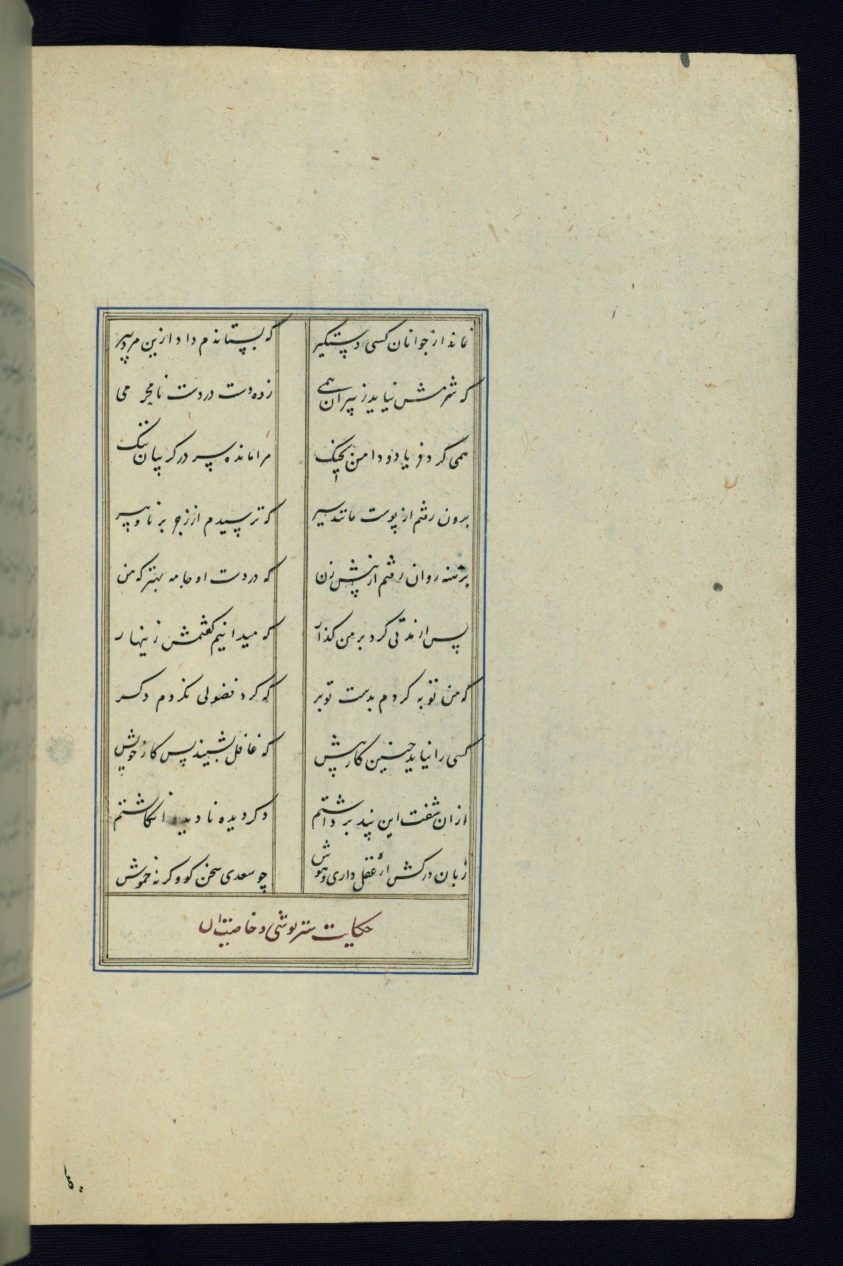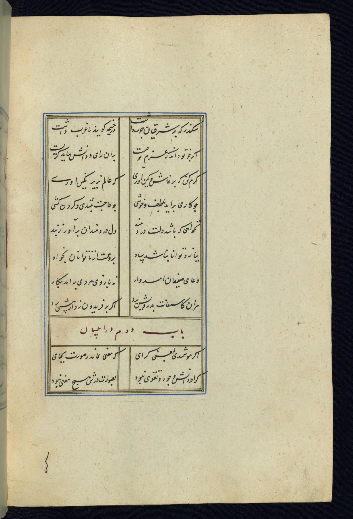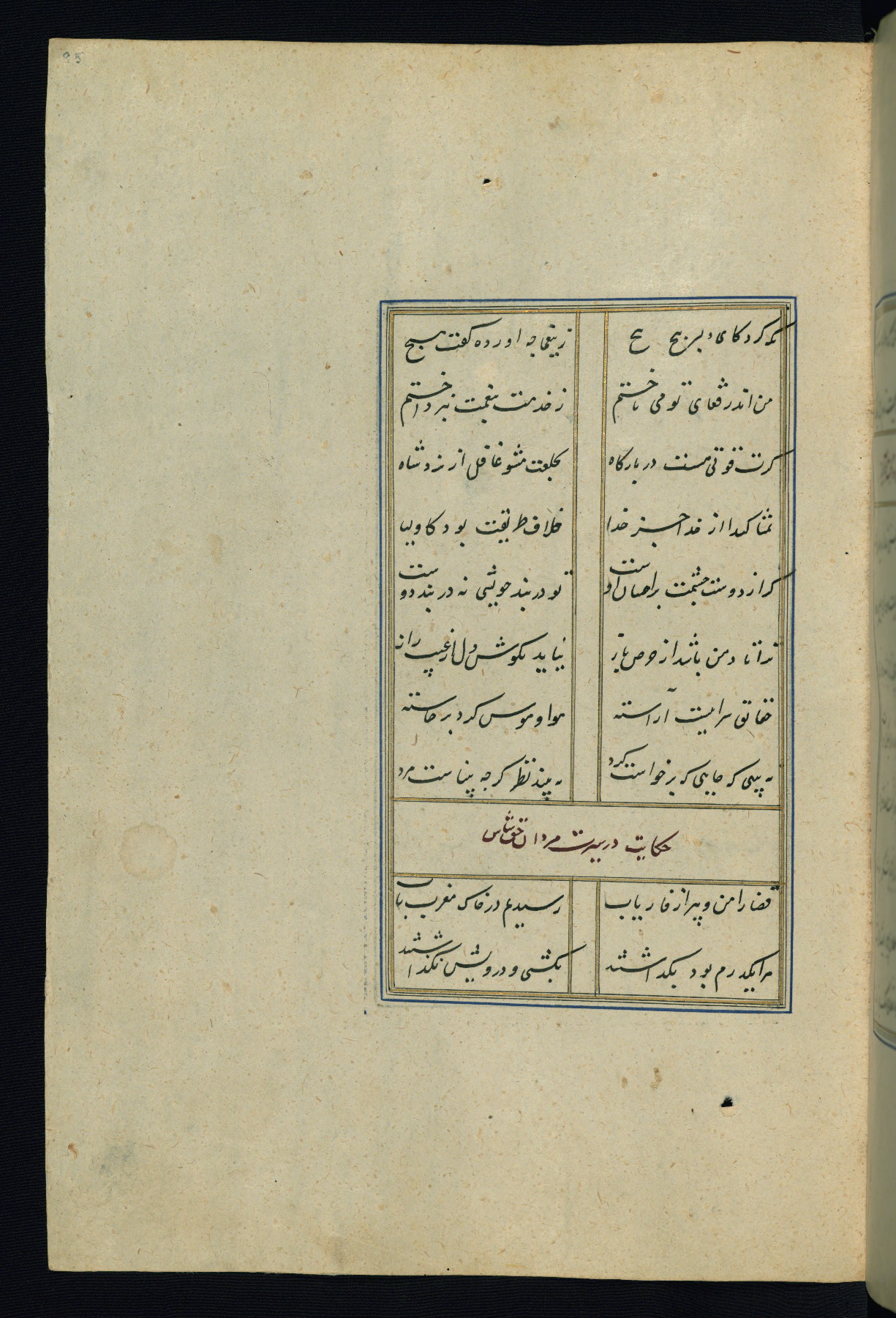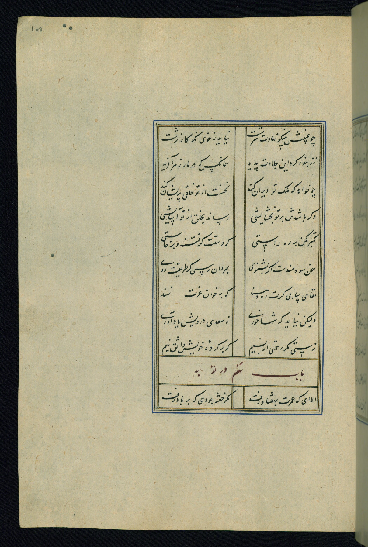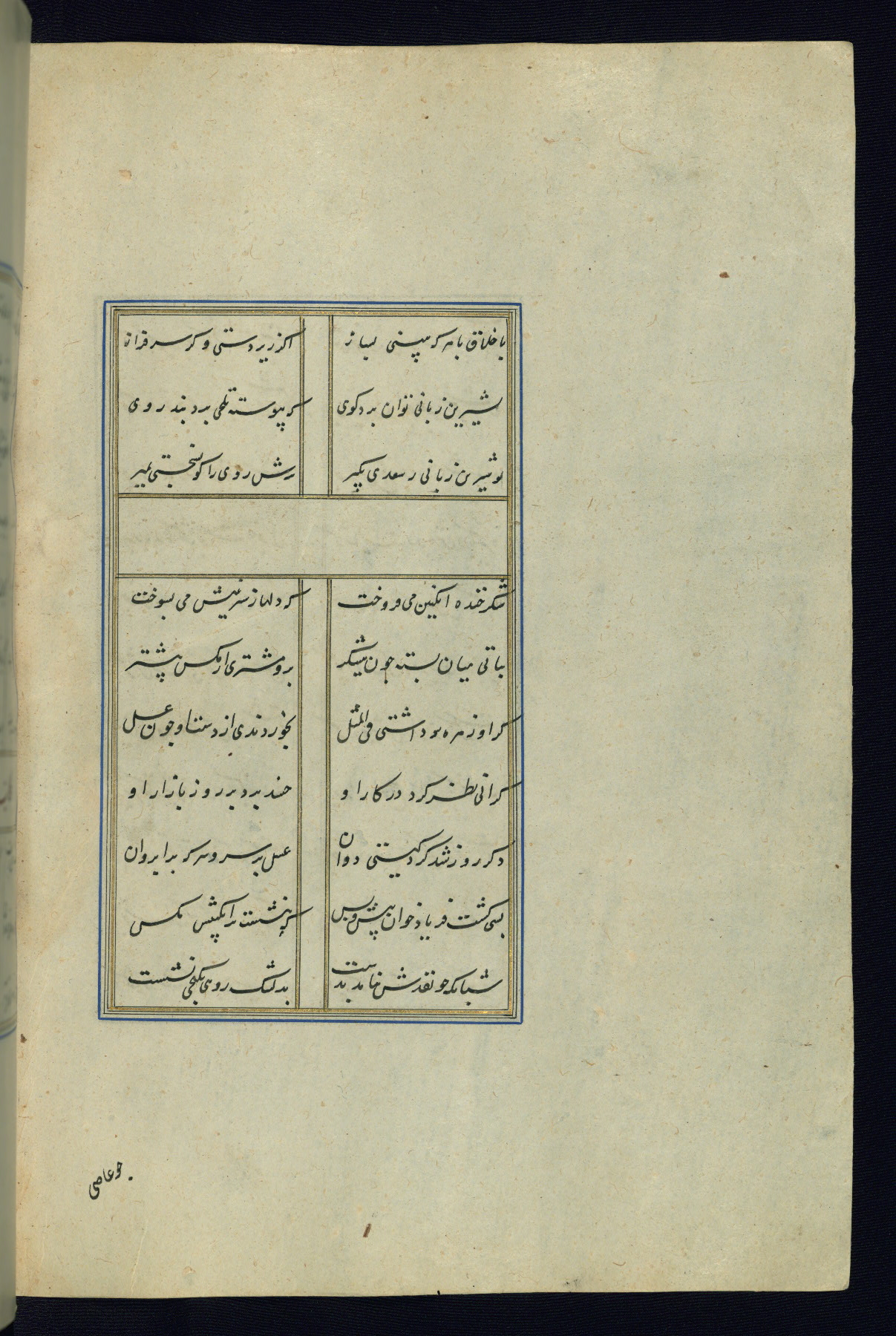 This is an illuminated and illustrated Safavid copy of the Būstān (The garden or The orchard), composed by Sa’dī (d. 691 AH / 1292 CE). It was written in black nasta’līq script in the ninth century AH / sixteenth CE in Iran. The codex opens with a frontispiece with the title Kitāb-i būstān inscribed in an illuminated medallion (fol. 1a), followed by a double-page illustration of a banquet scene in a landscape (fols. 1b-2a). Additionally, there are five paintings illustrating the text (fols. 25a, 55b, 58a, 93b, and 119b). The brown leather, blind-stamped binding decorated with a central oval and pendants is not contemporary with the manuscript.