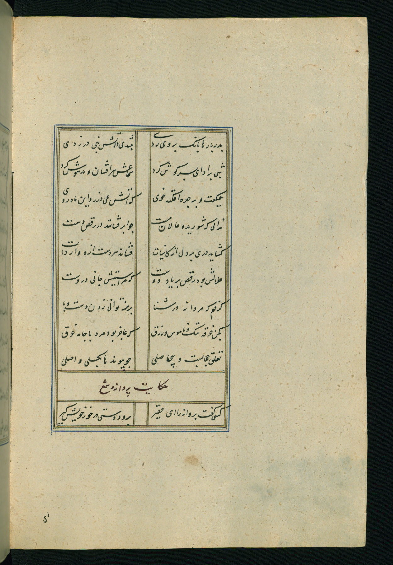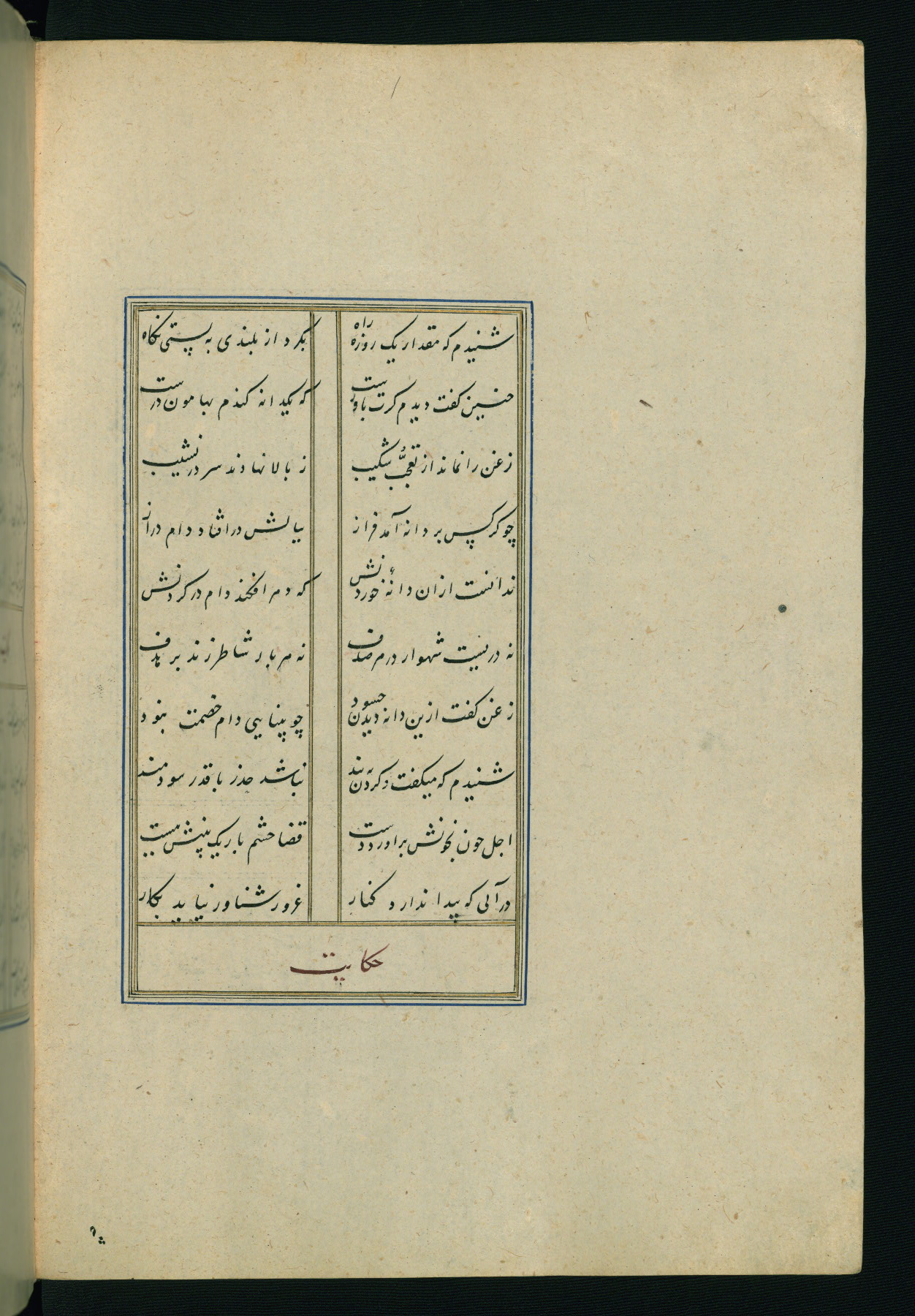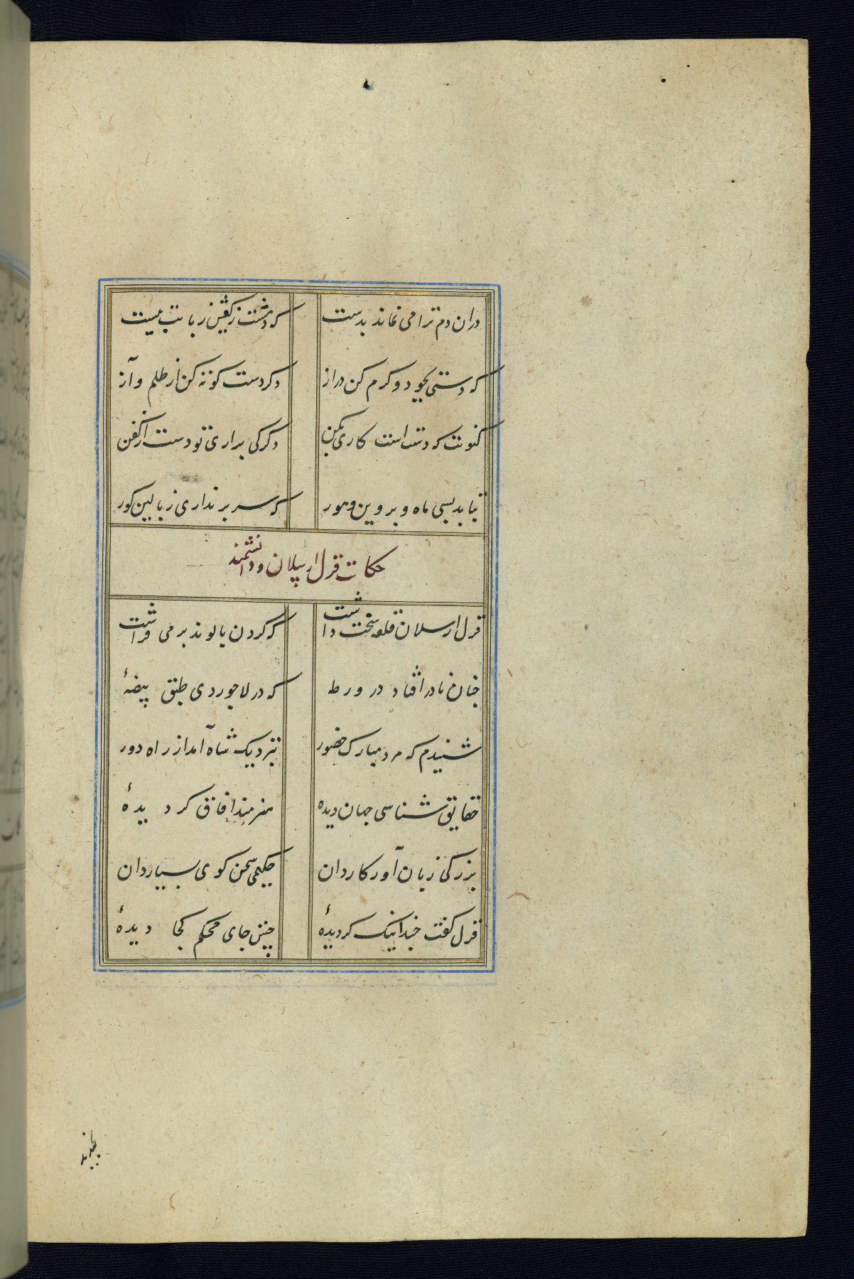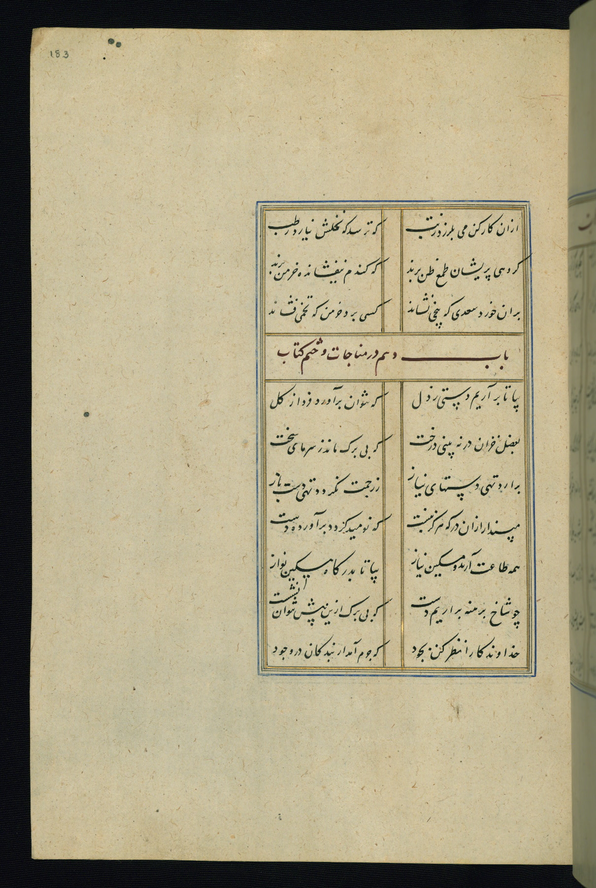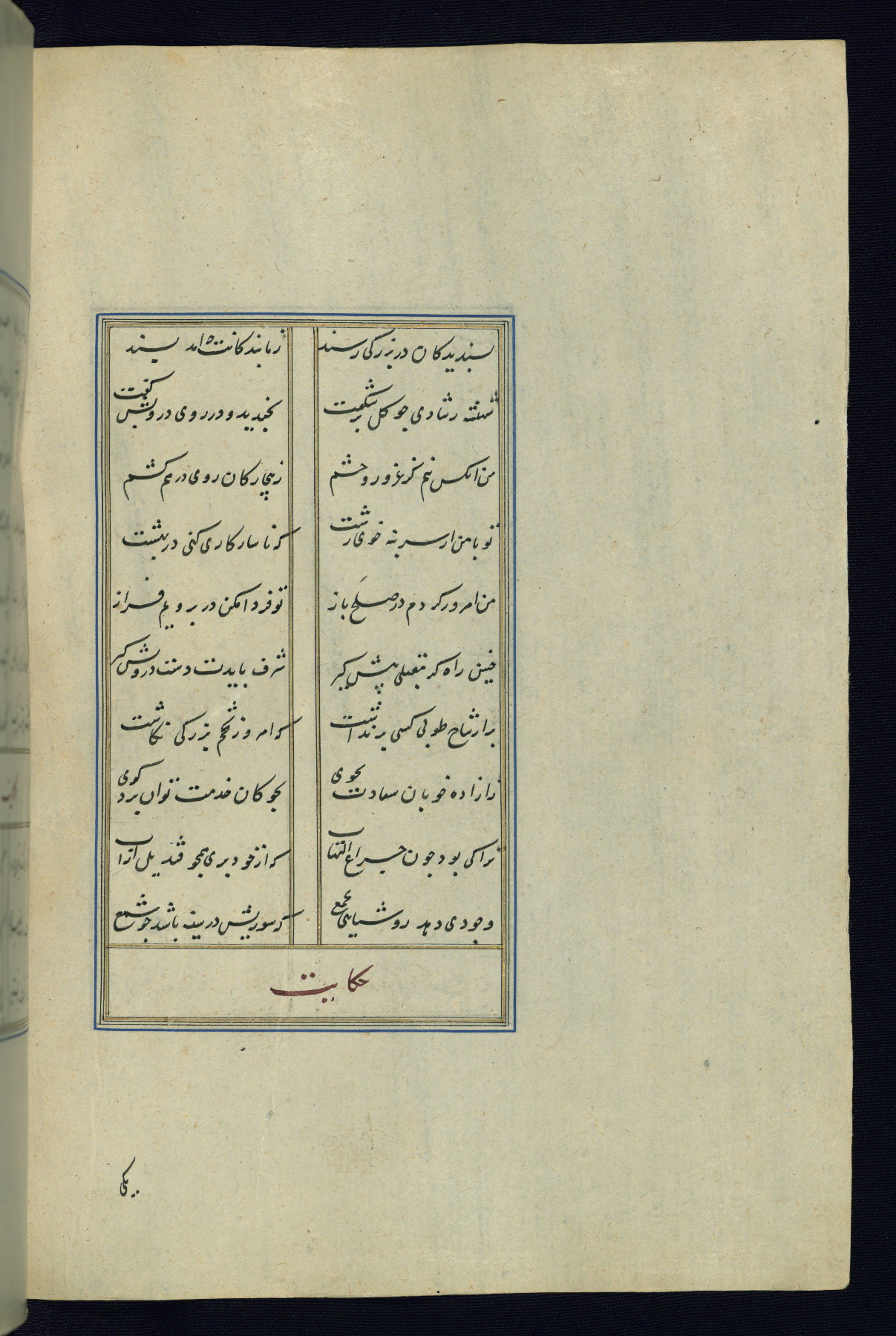 This is an illuminated and illustrated Safavid copy of the Būstān (The garden or The orchard), composed by Sa’dī (d. 691 AH / 1292 CE). It was written in black nasta’līq script in the ninth century AH / sixteenth CE in Iran. The codex opens with a frontispiece with the title Kitāb-i būstān inscribed in an illuminated medallion (fol. 1a), followed by a double-page illustration of a banquet scene in a landscape (fols. 1b-2a). Additionally, there are five paintings illustrating the text (fols. 25a, 55b, 58a, 93b, and 119b). The brown leather, blind-stamped binding decorated with a central oval and pendants is not contemporary with the manuscript.