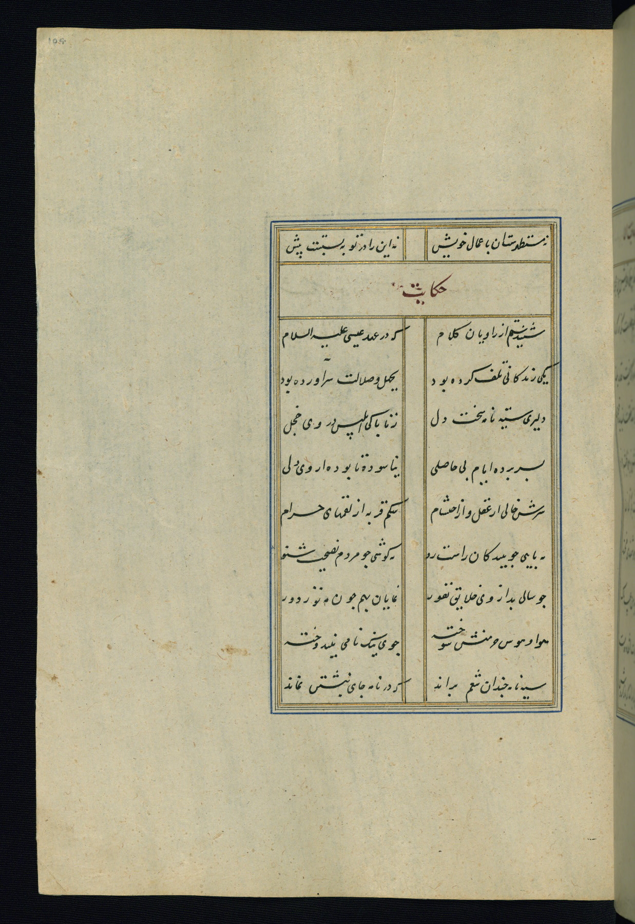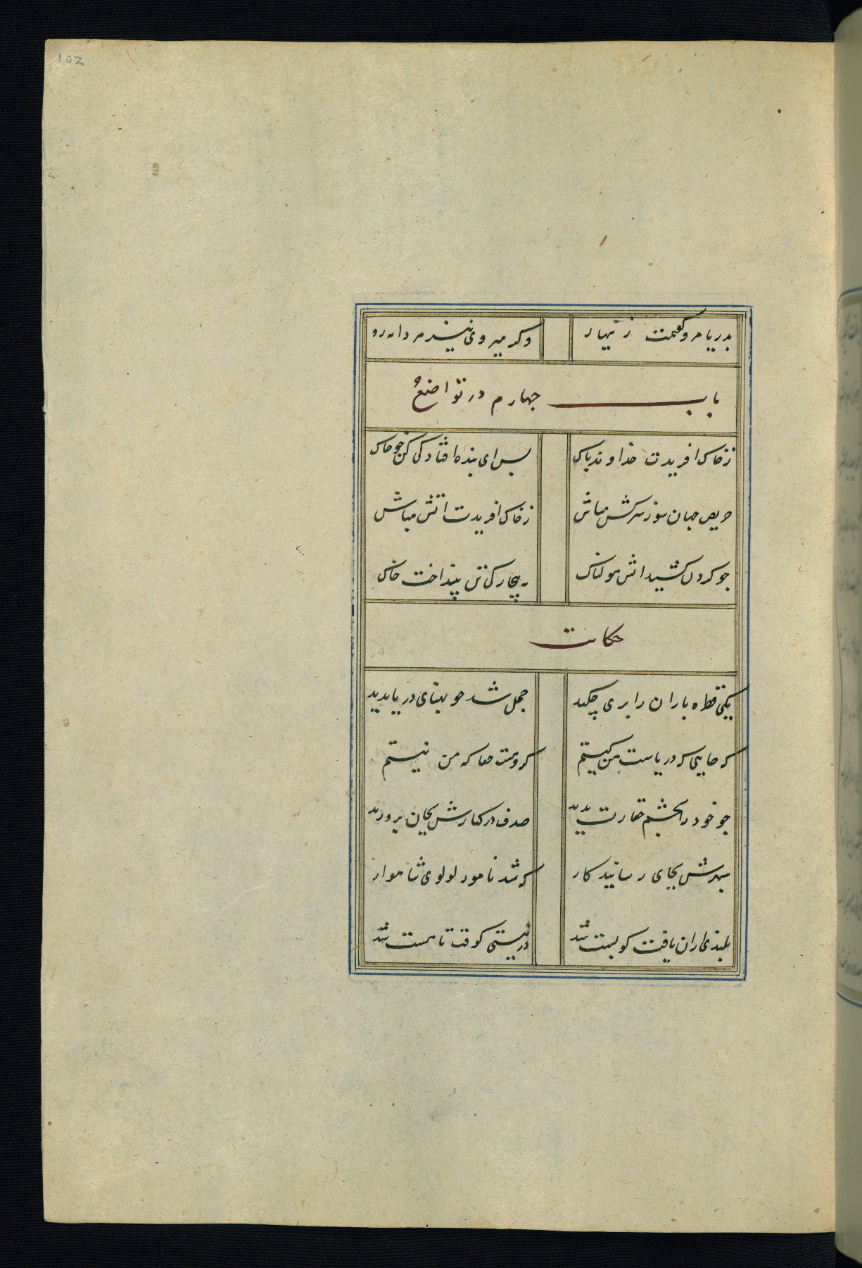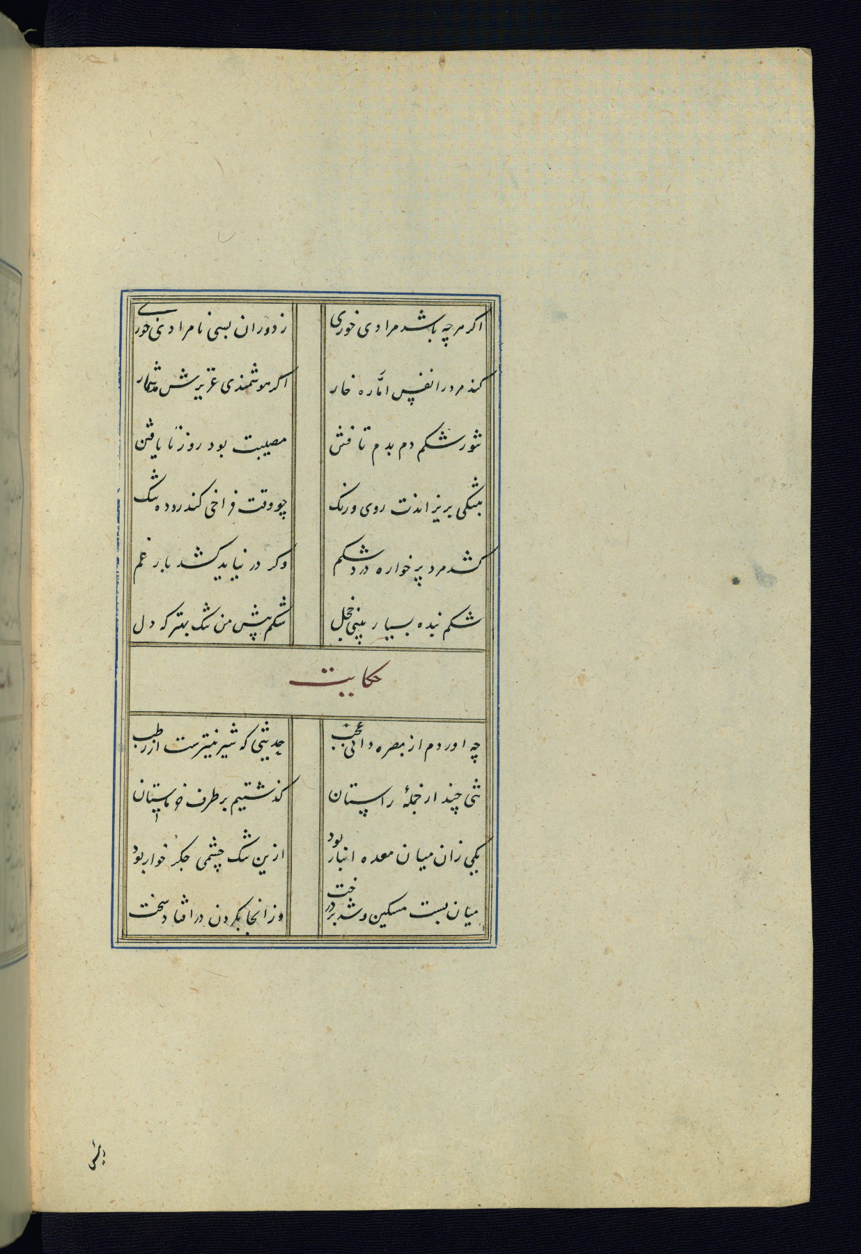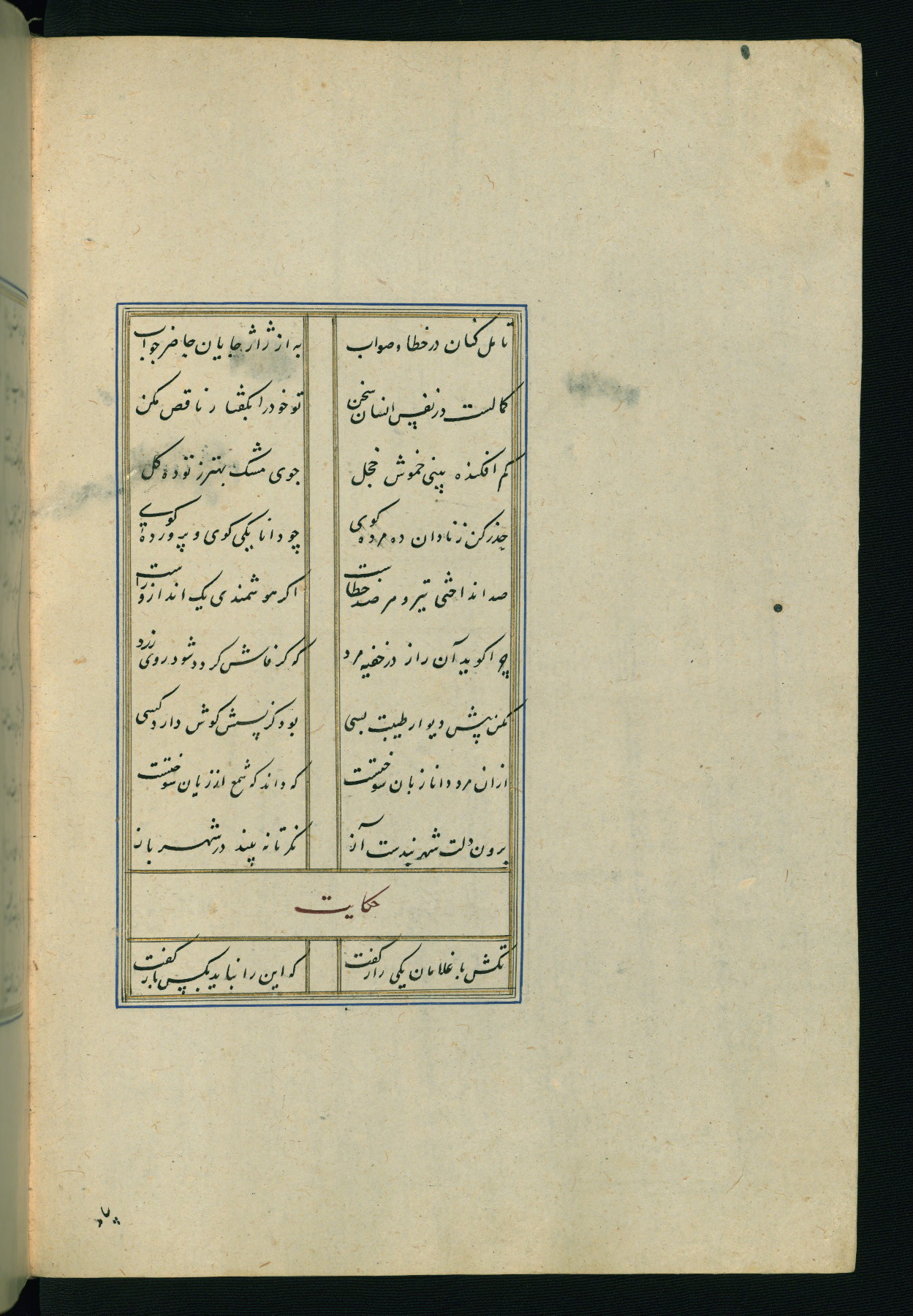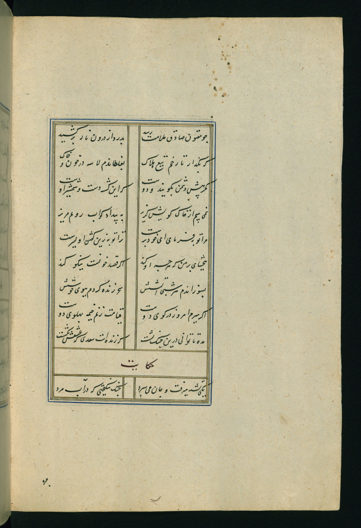 This is an illuminated and illustrated Safavid copy of the Būstān (The garden or The orchard), composed by Sa’dī (d. 691 AH / 1292 CE). It was written in black nasta’līq script in the ninth century AH / sixteenth CE in Iran. The codex opens with a frontispiece with the title Kitāb-i būstān inscribed in an illuminated medallion (fol. 1a), followed by a double-page illustration of a banquet scene in a landscape (fols. 1b-2a). Additionally, there are five paintings illustrating the text (fols. 25a, 55b, 58a, 93b, and 119b). The brown leather, blind-stamped binding decorated with a central oval and pendants is not contemporary with the manuscript.