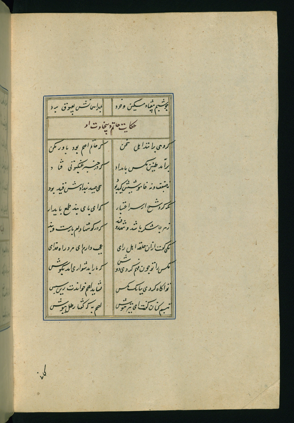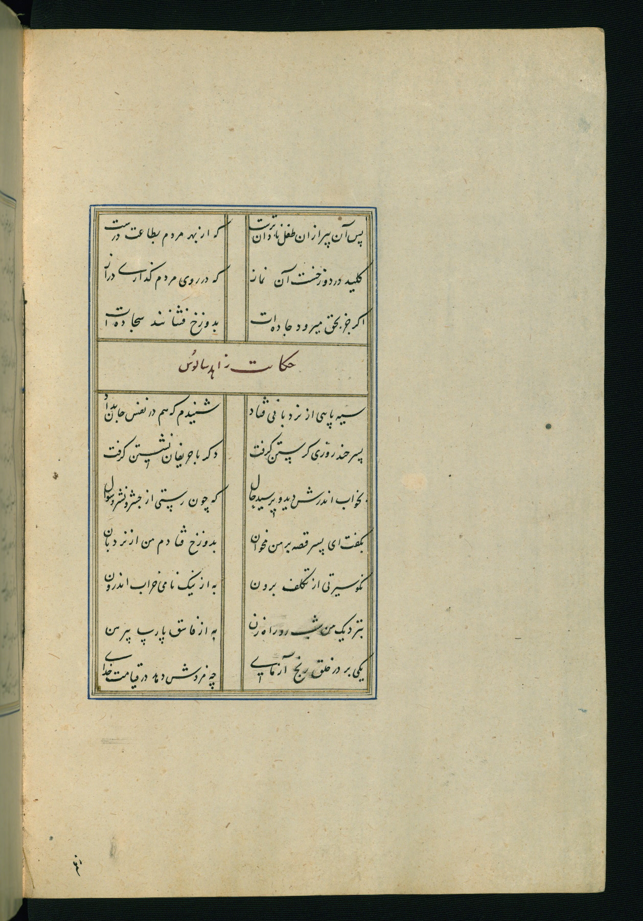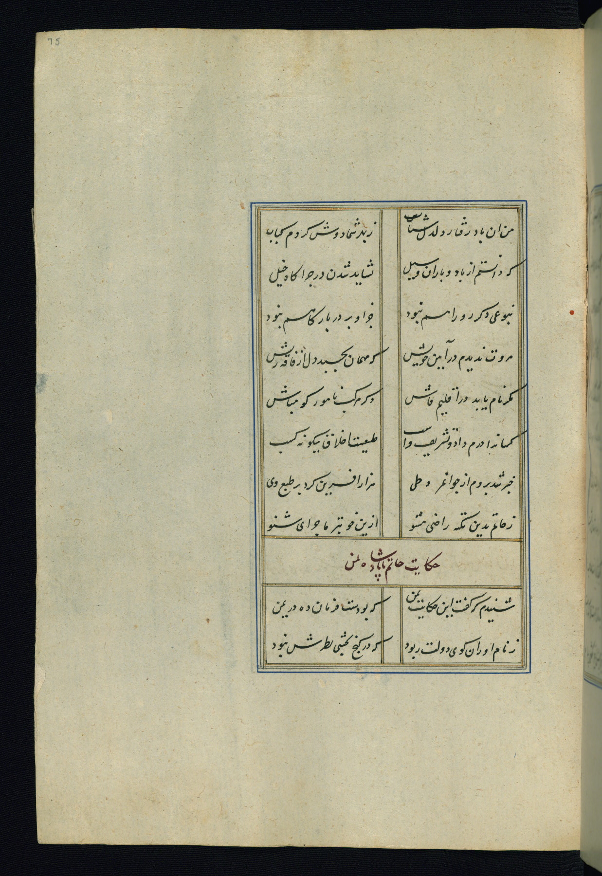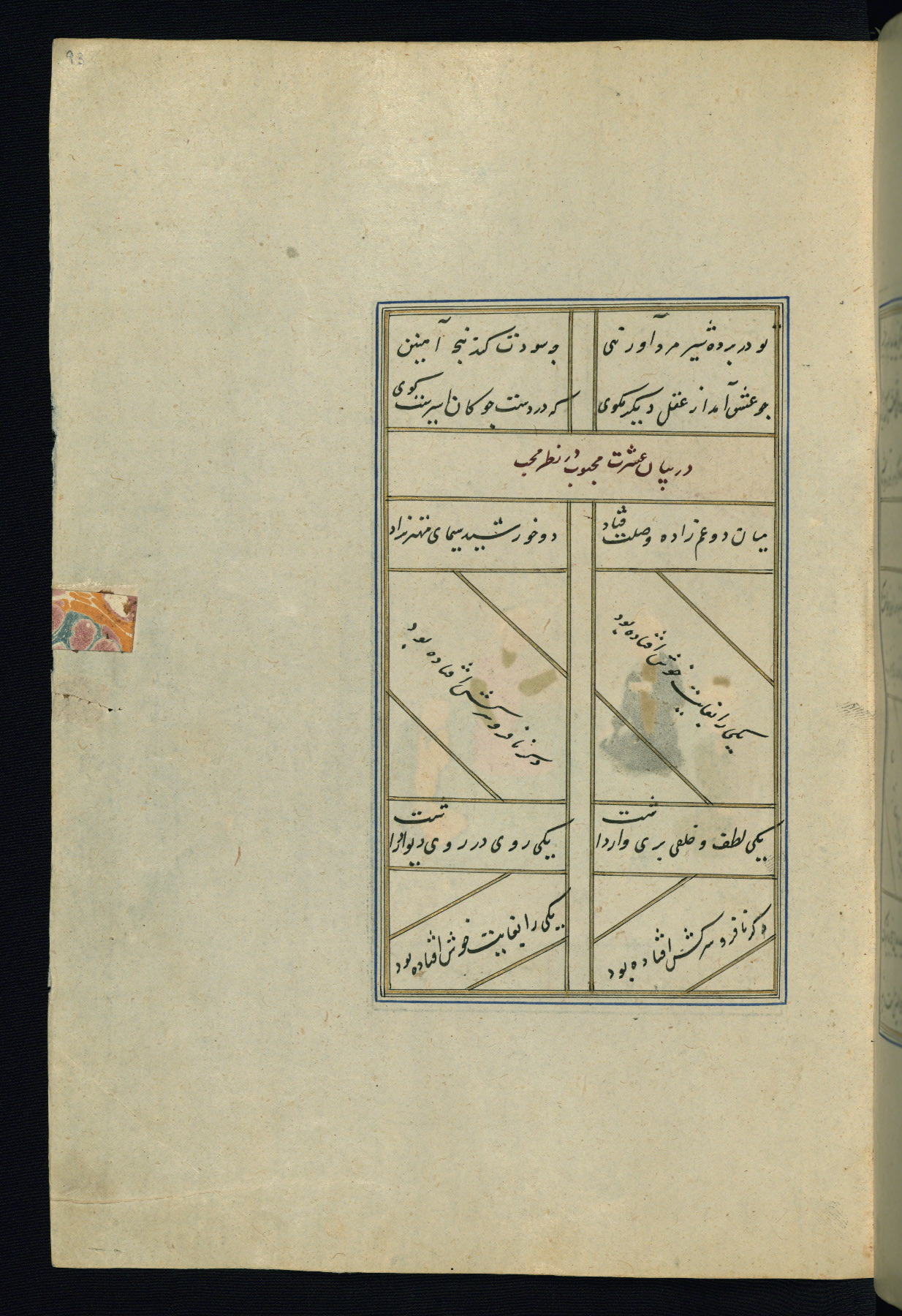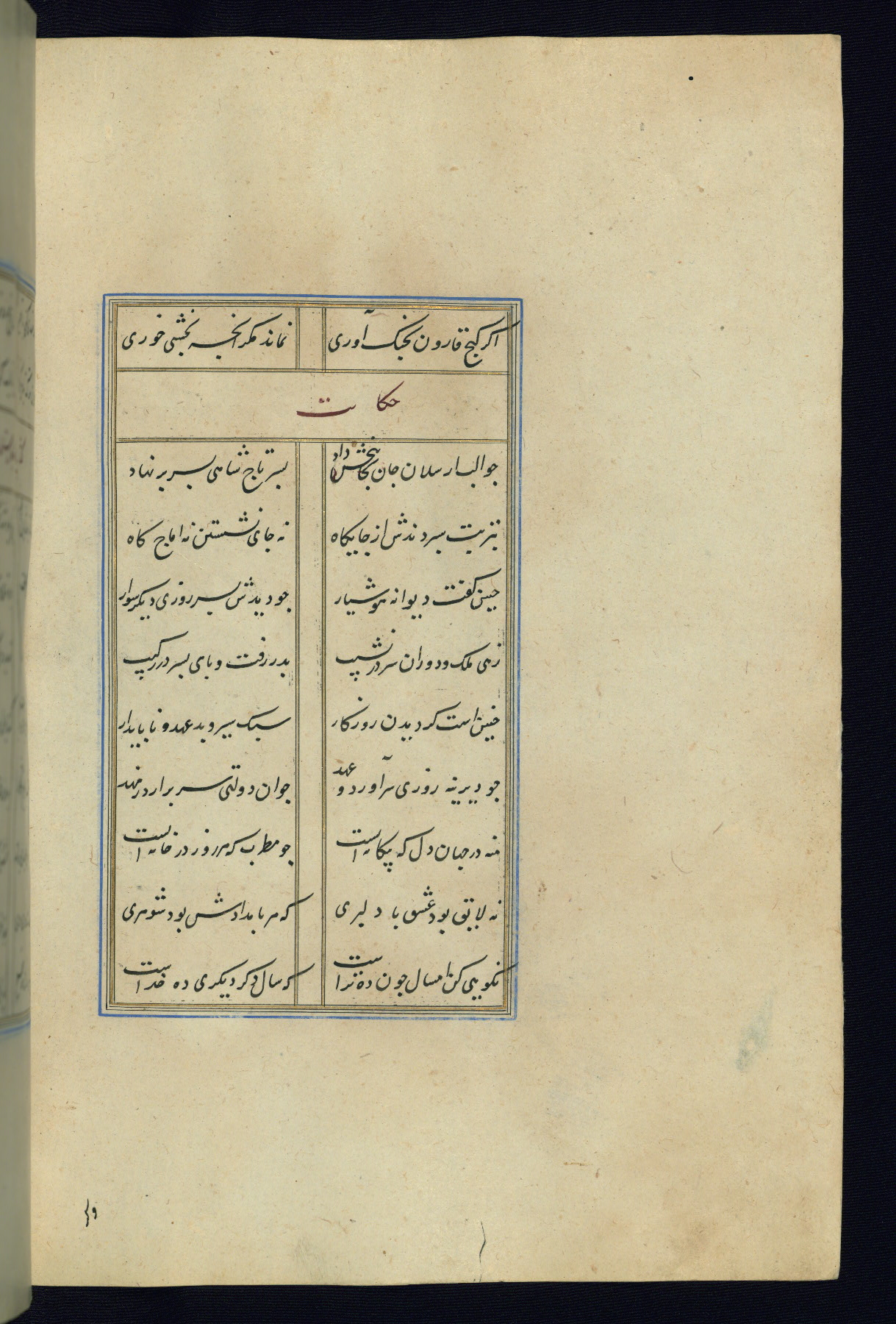 This is an illuminated and illustrated Safavid copy of the Būstān (The garden or The orchard), composed by Sa’dī (d. 691 AH / 1292 CE). It was written in black nasta’līq script in the ninth century AH / sixteenth CE in Iran. The codex opens with a frontispiece with the title Kitāb-i būstān inscribed in an illuminated medallion (fol. 1a), followed by a double-page illustration of a banquet scene in a landscape (fols. 1b-2a). Additionally, there are five paintings illustrating the text (fols. 25a, 55b, 58a, 93b, and 119b). The brown leather, blind-stamped binding decorated with a central oval and pendants is not contemporary with the manuscript.