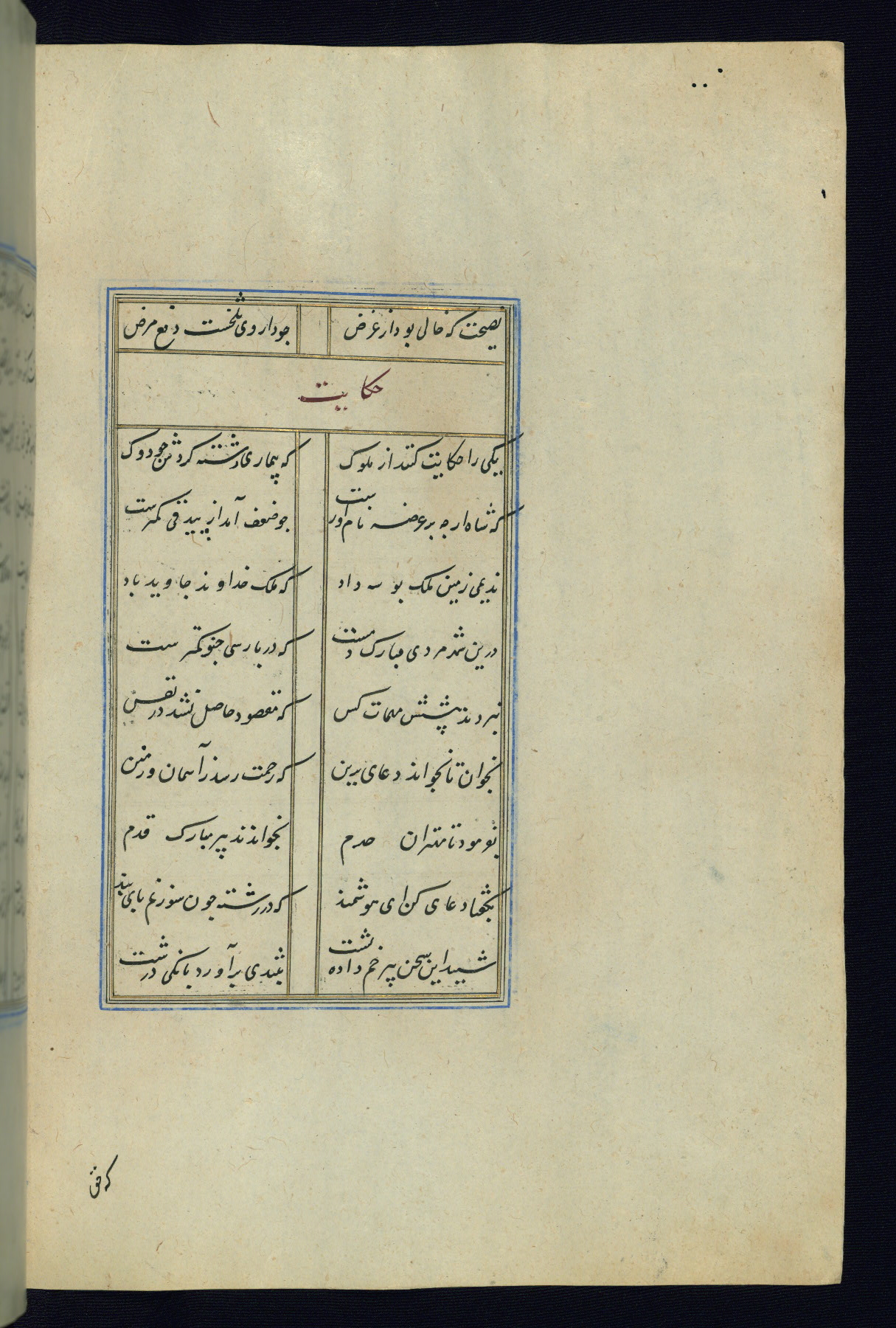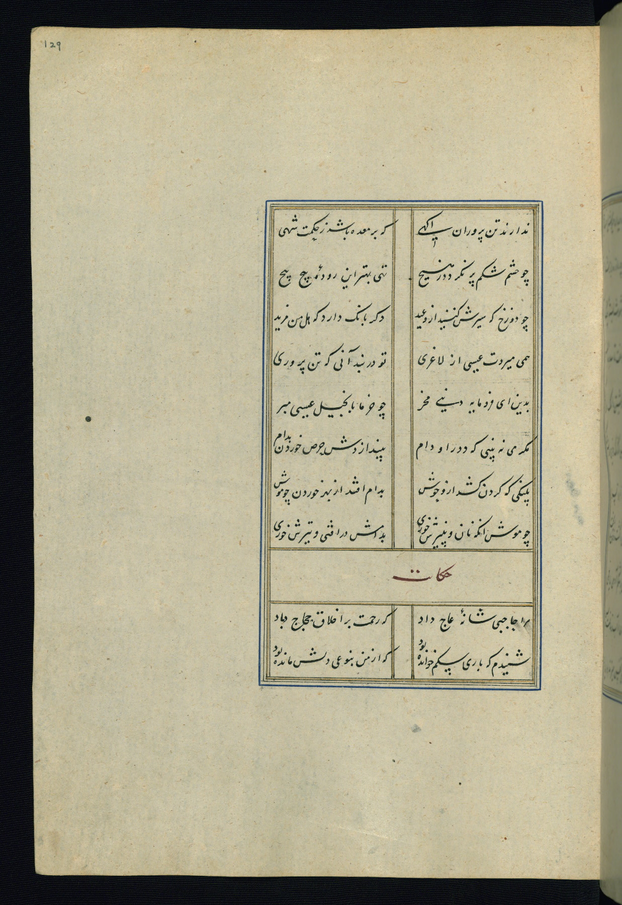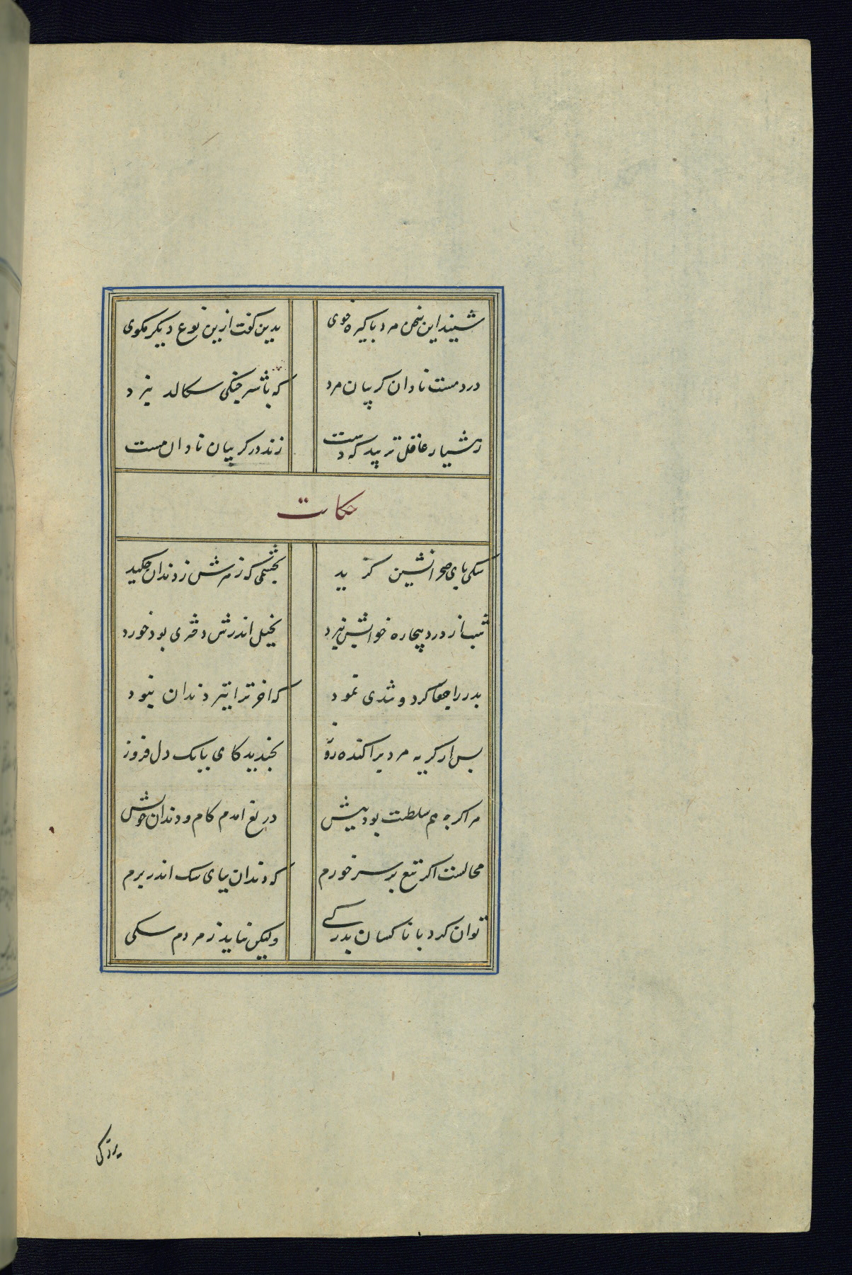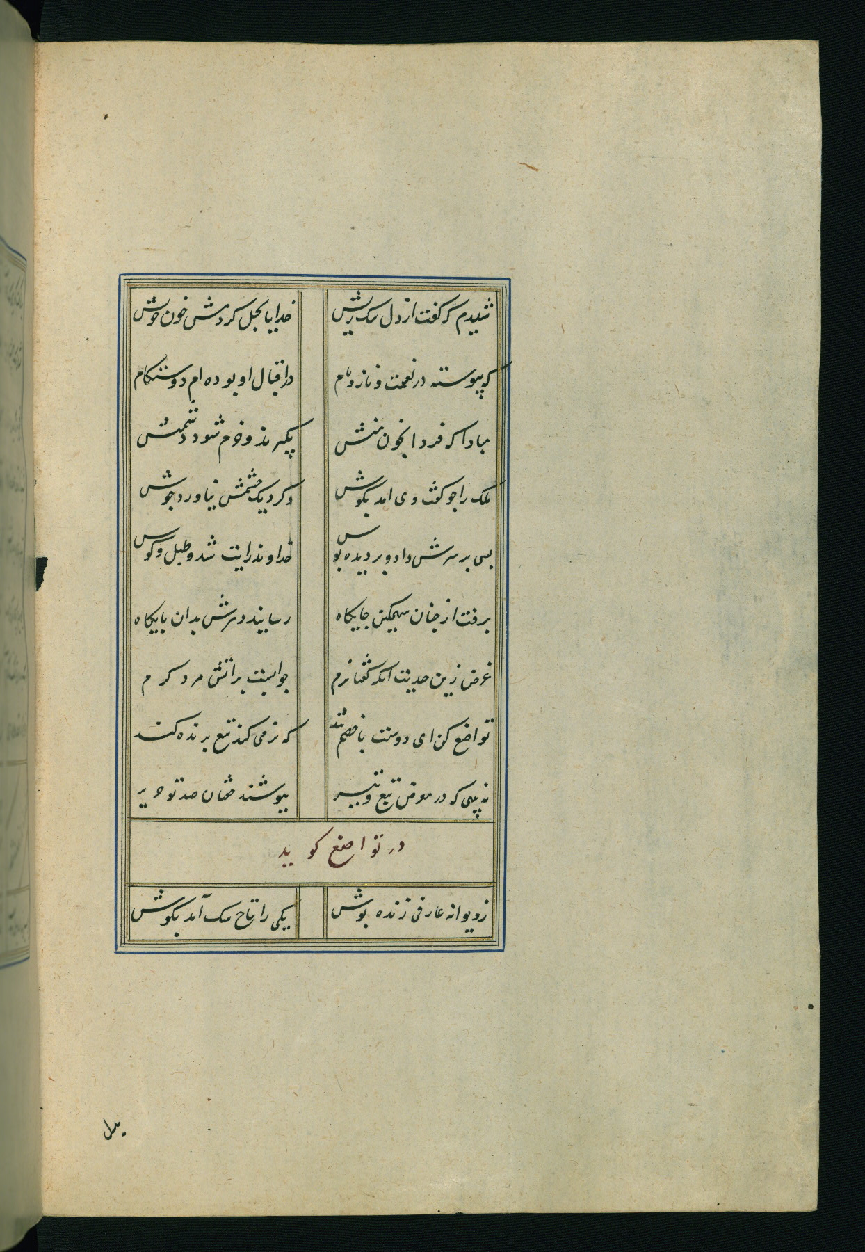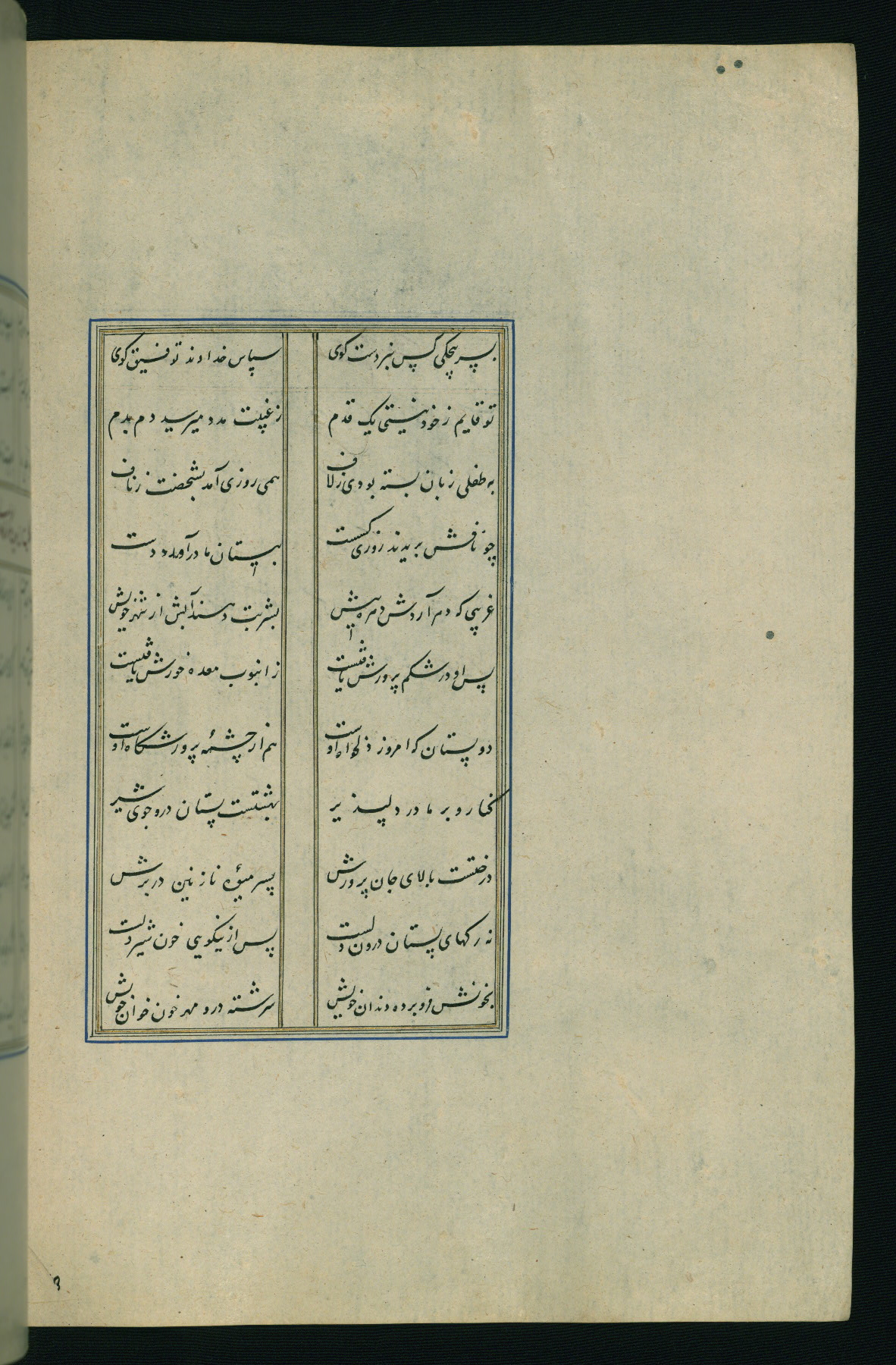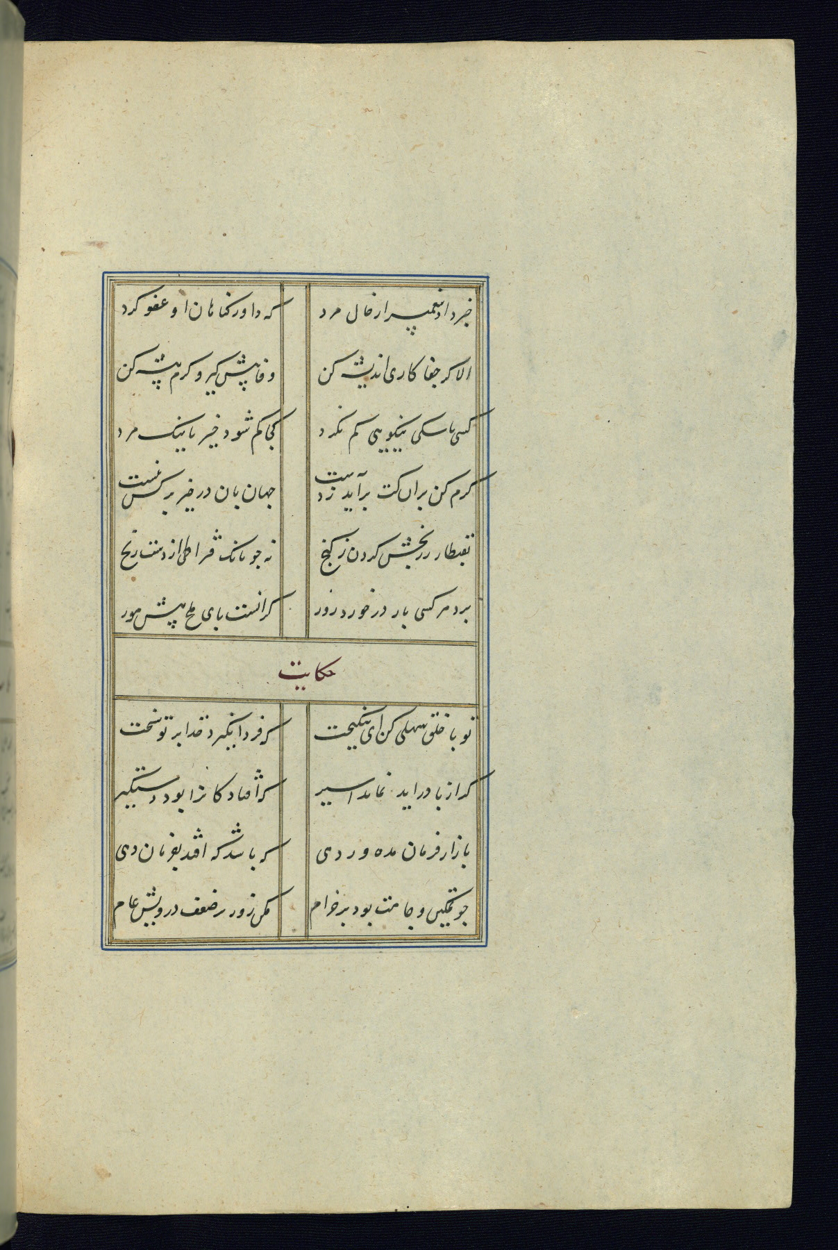 This is an illuminated and illustrated Safavid copy of the Būstān (The garden or The orchard), composed by Sa’dī (d. 691 AH / 1292 CE). It was written in black nasta’līq script in the ninth century AH / sixteenth CE in Iran. The codex opens with a frontispiece with the title Kitāb-i būstān inscribed in an illuminated medallion (fol. 1a), followed by a double-page illustration of a banquet scene in a landscape (fols. 1b-2a). Additionally, there are five paintings illustrating the text (fols. 25a, 55b, 58a, 93b, and 119b). The brown leather, blind-stamped binding decorated with a central oval and pendants is not contemporary with the manuscript.