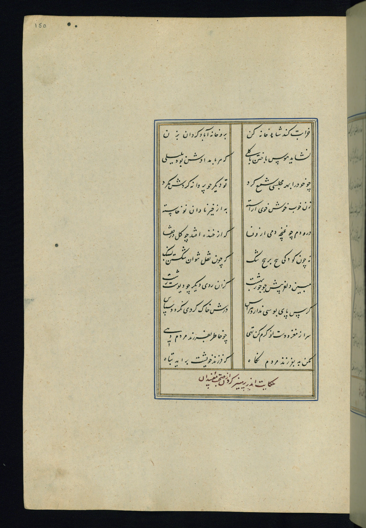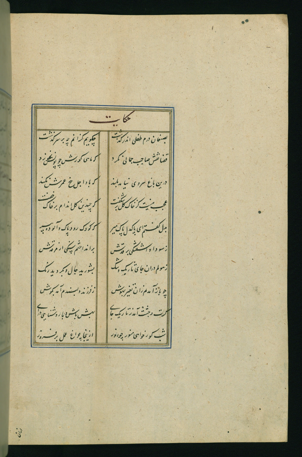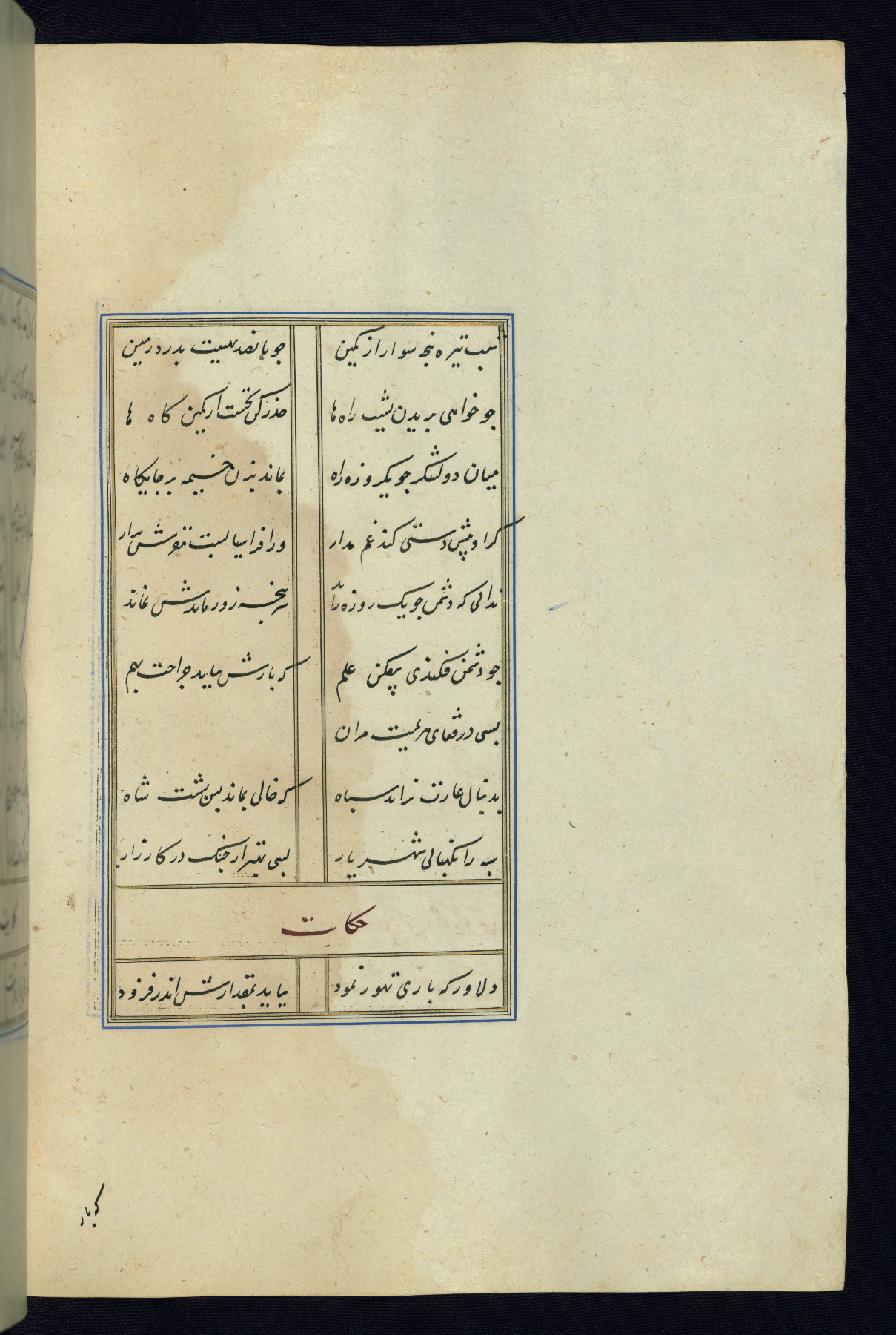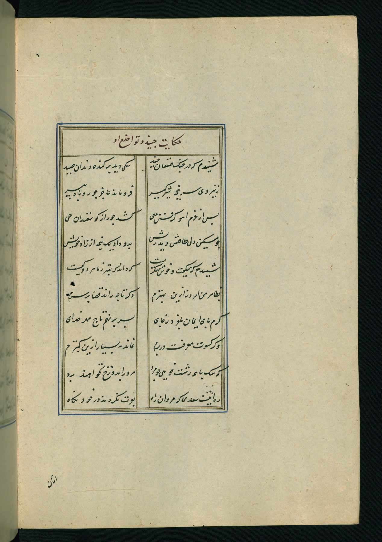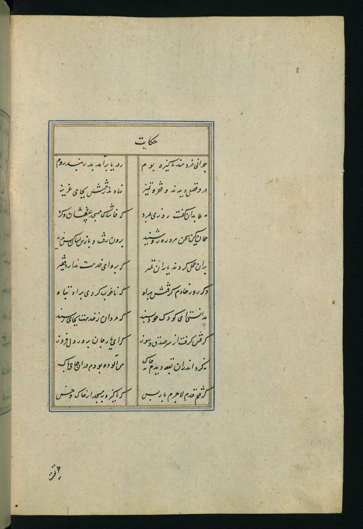 This is an illuminated and illustrated Safavid copy of the Būstān (The garden or The orchard), composed by Sa’dī (d. 691 AH / 1292 CE). It was written in black nasta’līq script in the ninth century AH / sixteenth CE in Iran. The codex opens with a frontispiece with the title Kitāb-i būstān inscribed in an illuminated medallion (fol. 1a), followed by a double-page illustration of a banquet scene in a landscape (fols. 1b-2a). Additionally, there are five paintings illustrating the text (fols. 25a, 55b, 58a, 93b, and 119b). The brown leather, blind-stamped binding decorated with a central oval and pendants is not contemporary with the manuscript.