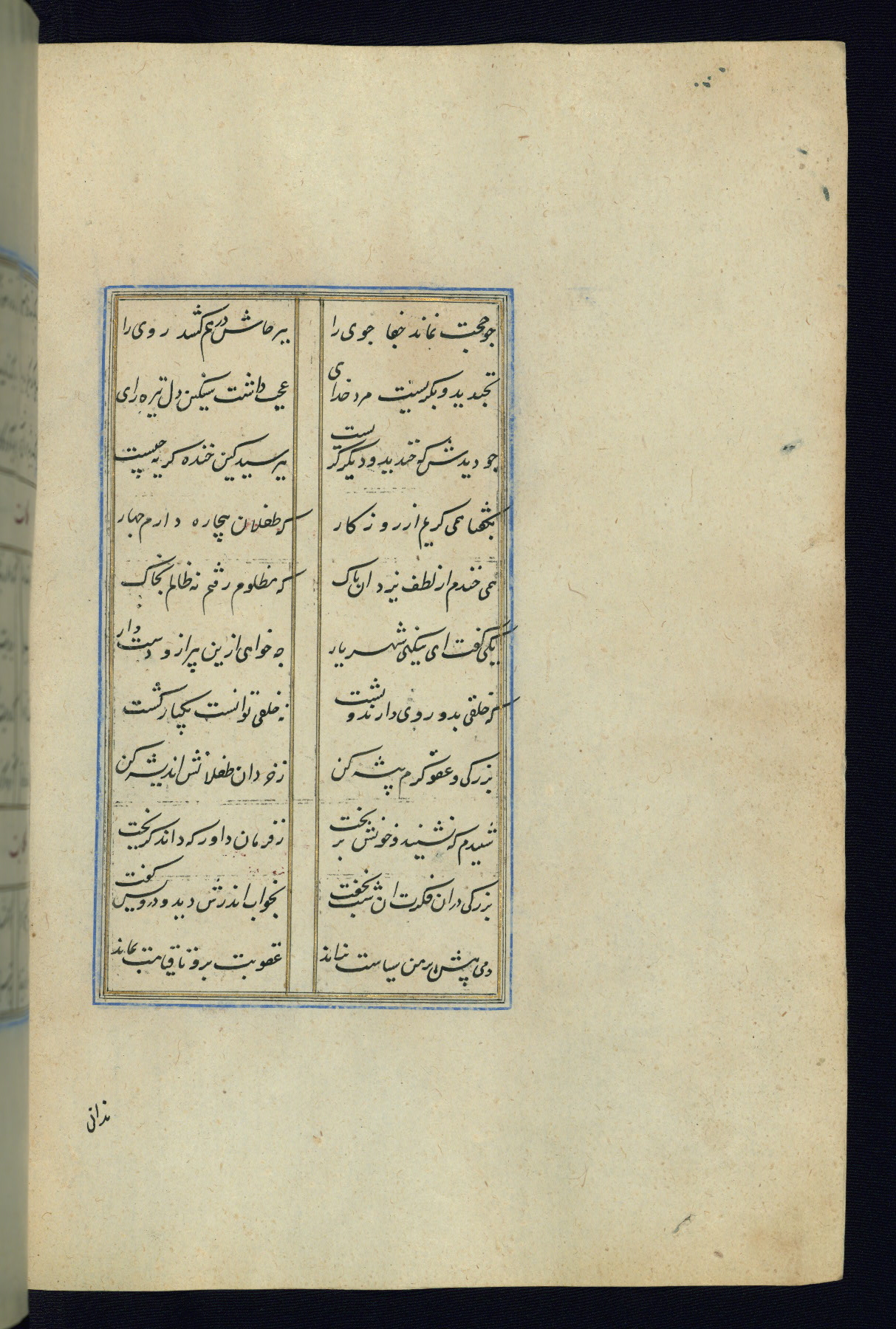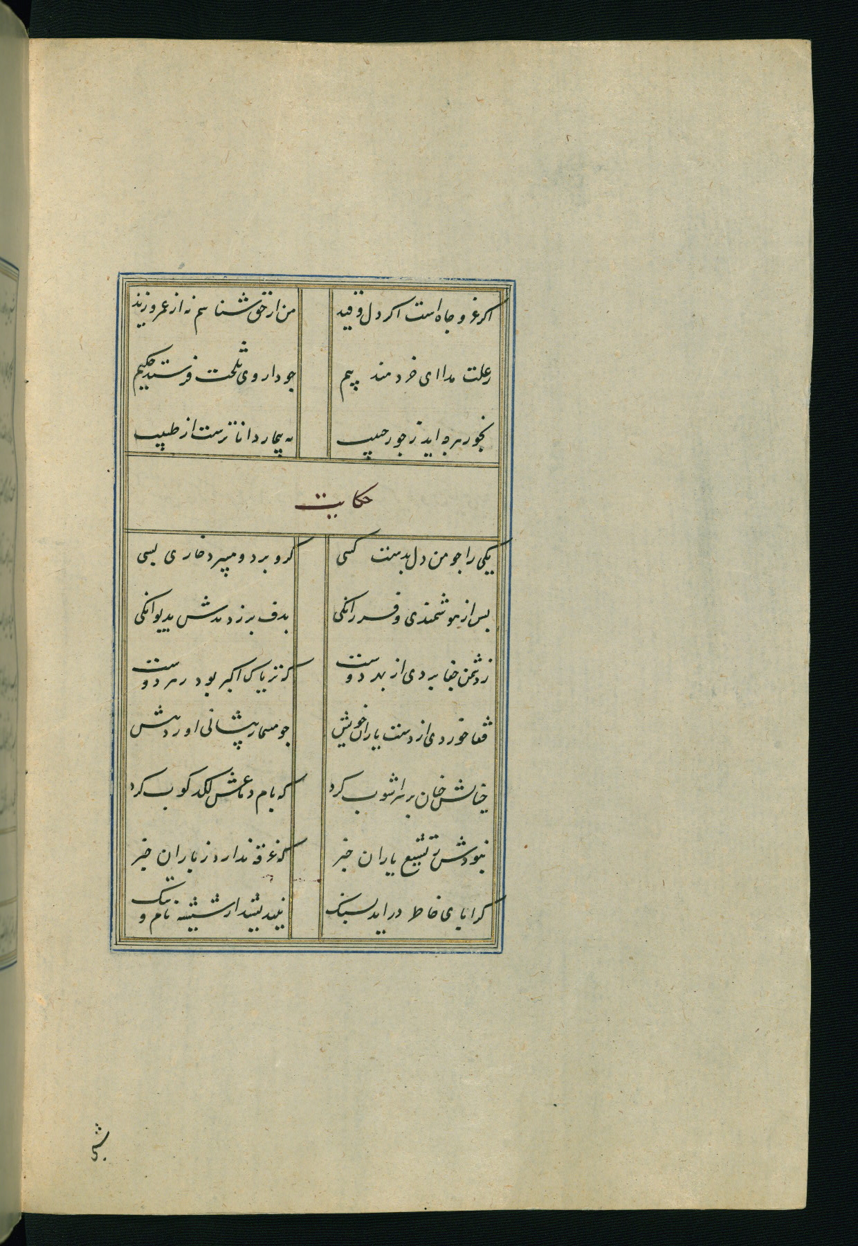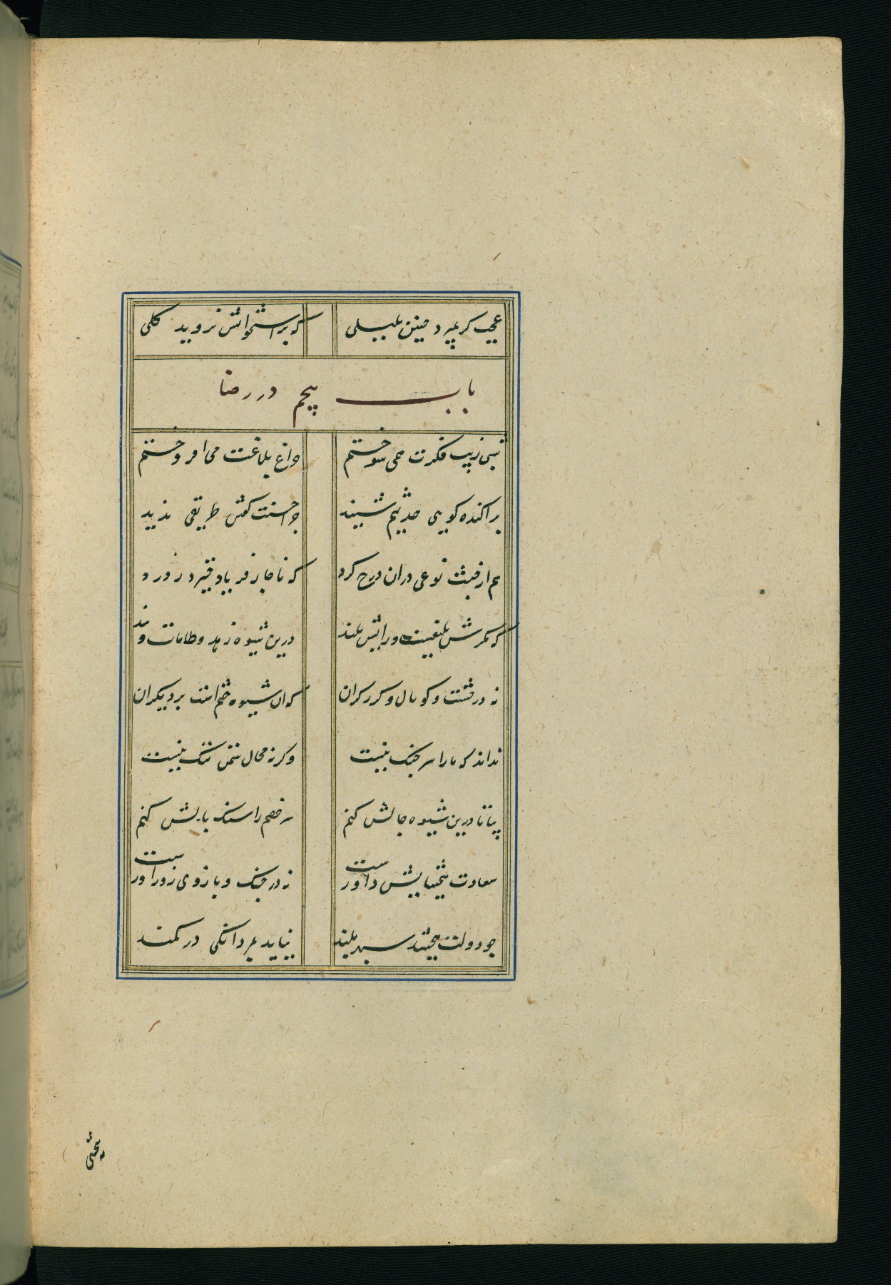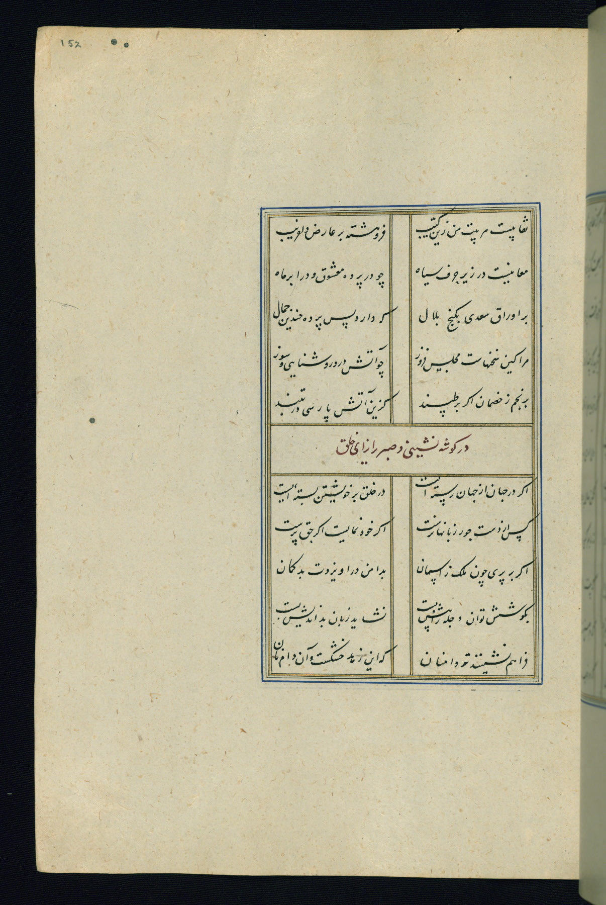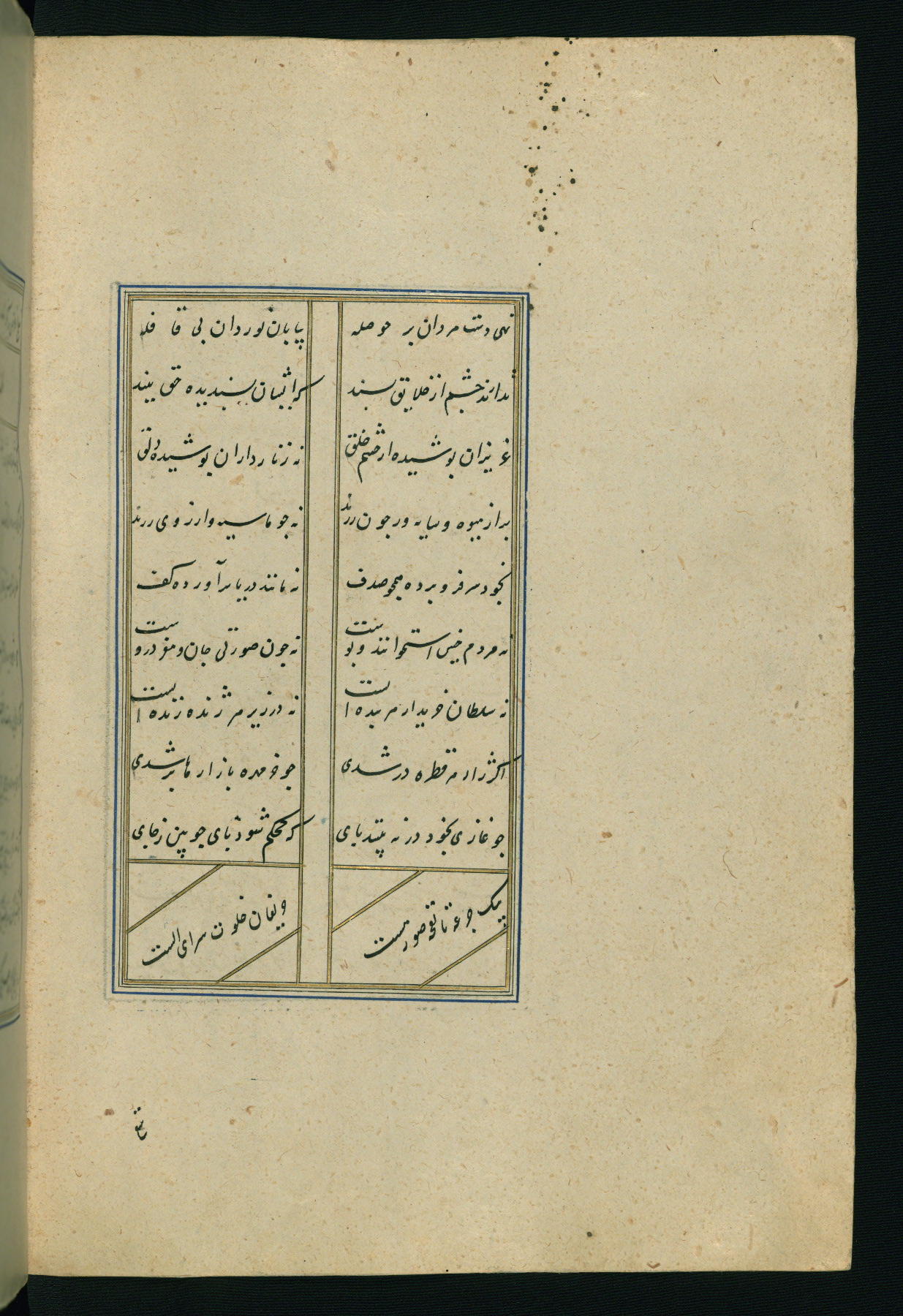 This is an illuminated and illustrated Safavid copy of the Būstān (The garden or The orchard), composed by Sa’dī (d. 691 AH / 1292 CE). It was written in black nasta’līq script in the ninth century AH / sixteenth CE in Iran. The codex opens with a frontispiece with the title Kitāb-i būstān inscribed in an illuminated medallion (fol. 1a), followed by a double-page illustration of a banquet scene in a landscape (fols. 1b-2a). Additionally, there are five paintings illustrating the text (fols. 25a, 55b, 58a, 93b, and 119b). The brown leather, blind-stamped binding decorated with a central oval and pendants is not contemporary with the manuscript.
