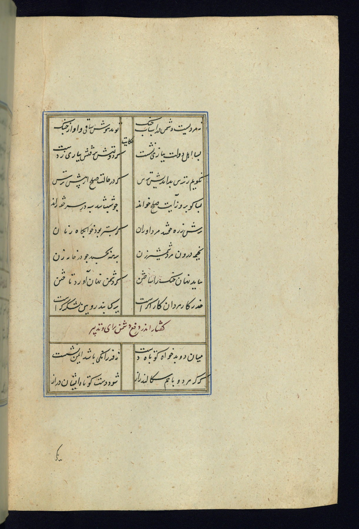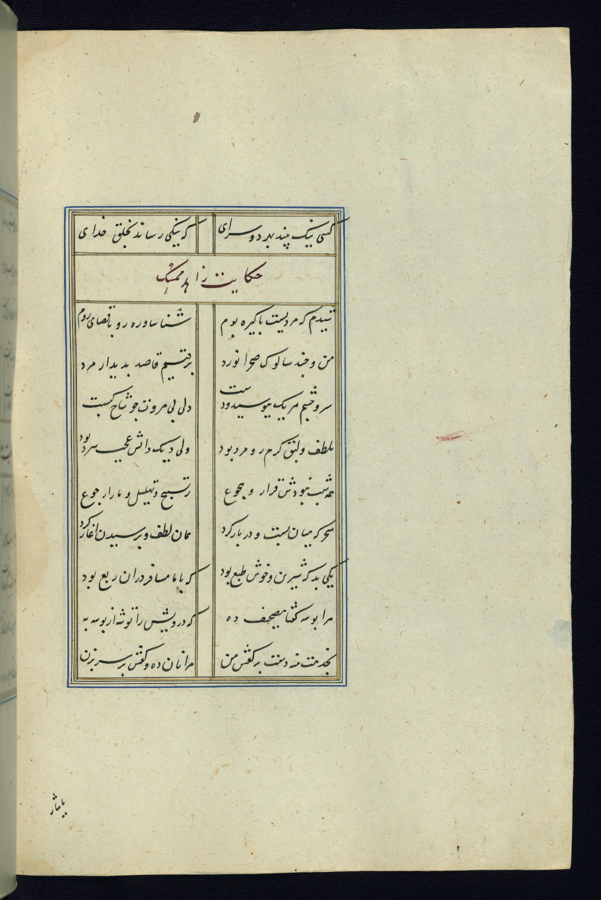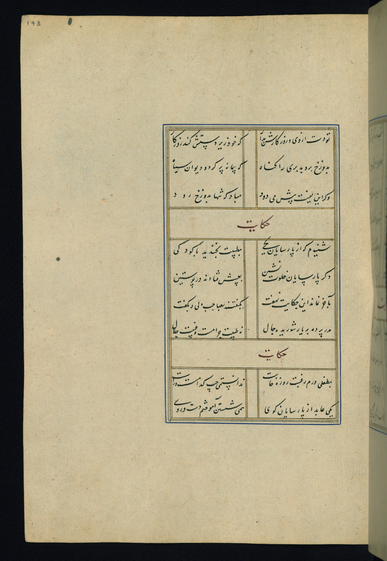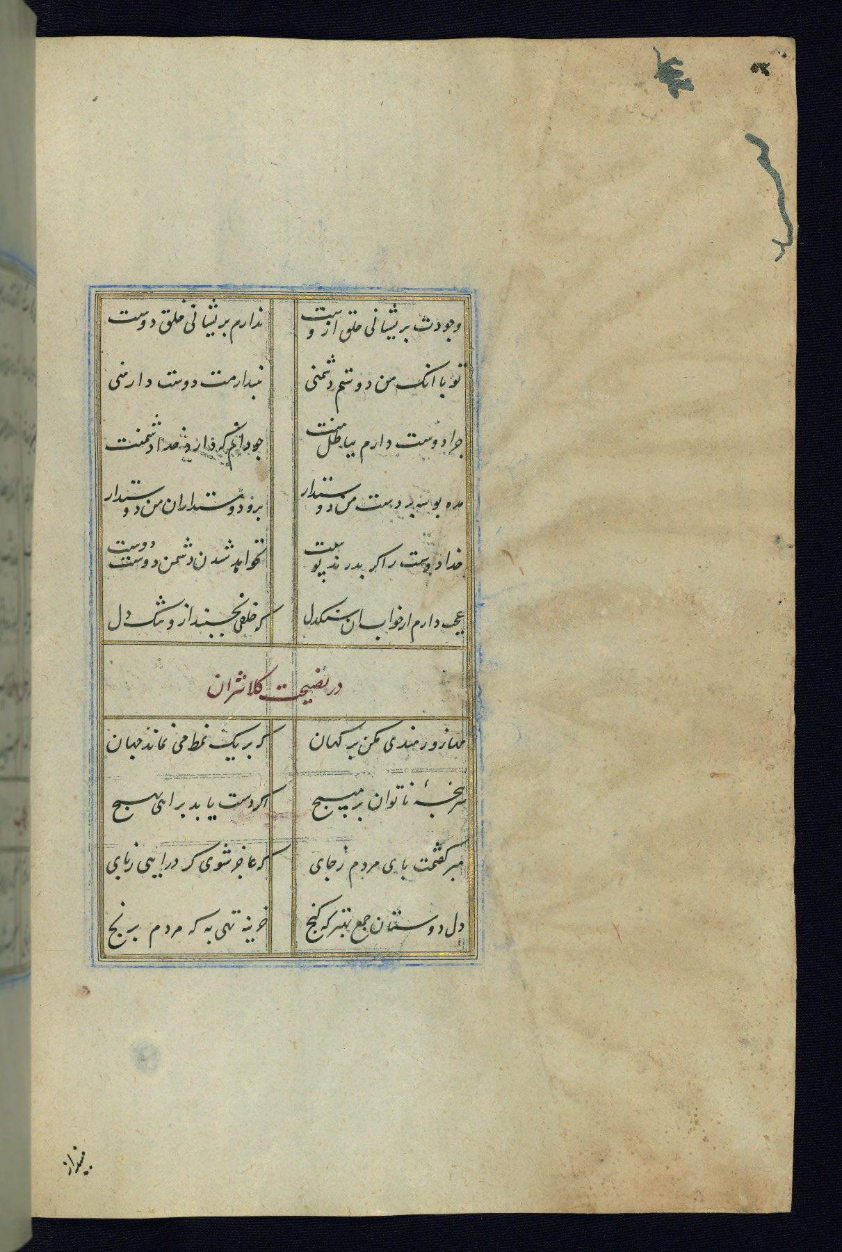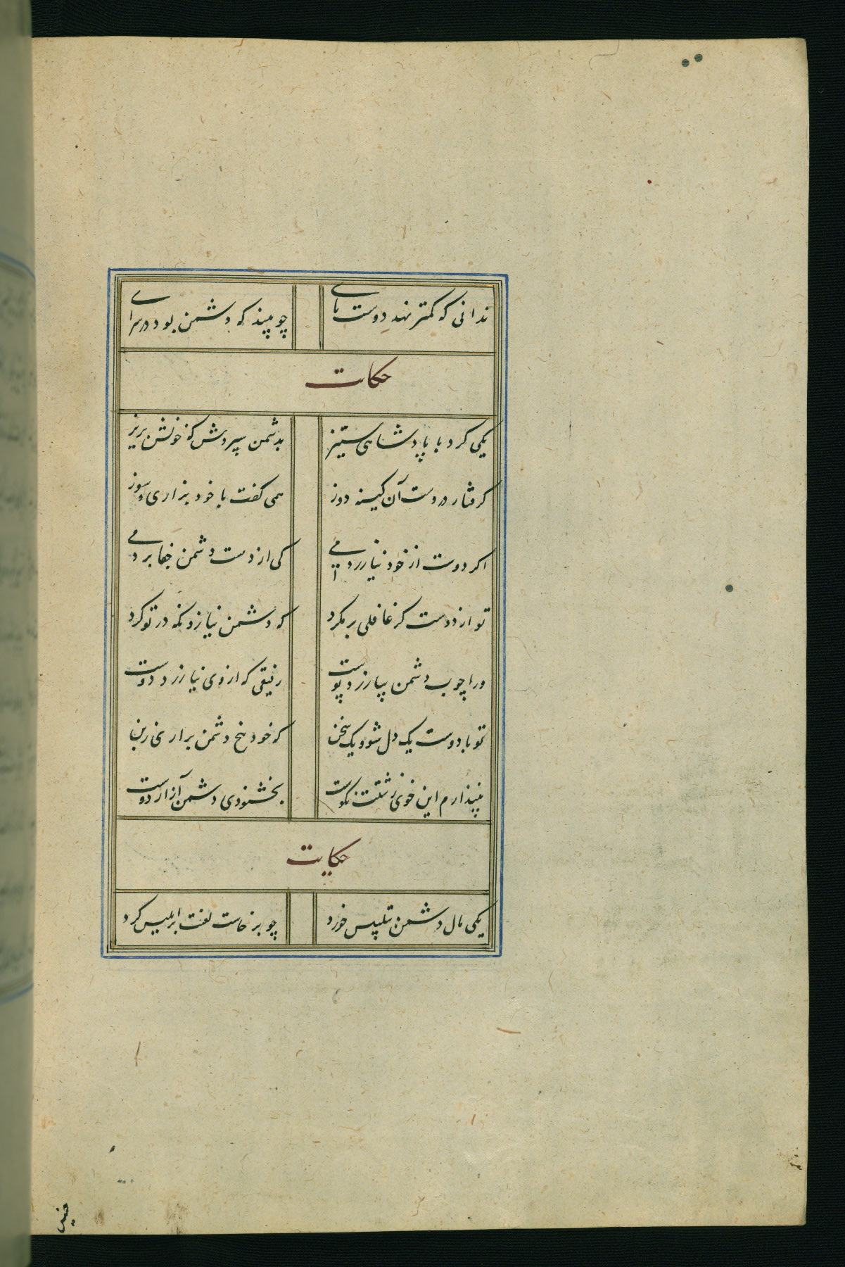 This is an illuminated and illustrated Safavid copy of the Būstān (The garden or The orchard), composed by Sa’dī (d. 691 AH / 1292 CE). It was written in black nasta’līq script in the ninth century AH / sixteenth CE in Iran. The codex opens with a frontispiece with the title Kitāb-i būstān inscribed in an illuminated medallion (fol. 1a), followed by a double-page illustration of a banquet scene in a landscape (fols. 1b-2a). Additionally, there are five paintings illustrating the text (fols. 25a, 55b, 58a, 93b, and 119b). The brown leather, blind-stamped binding decorated with a central oval and pendants is not contemporary with the manuscript.