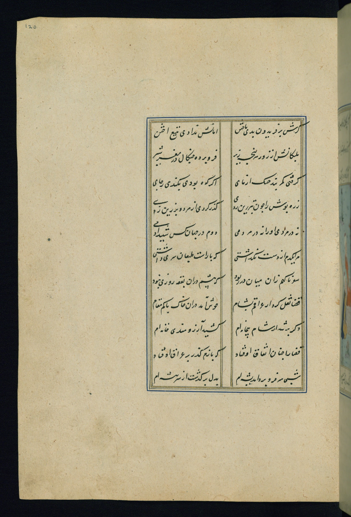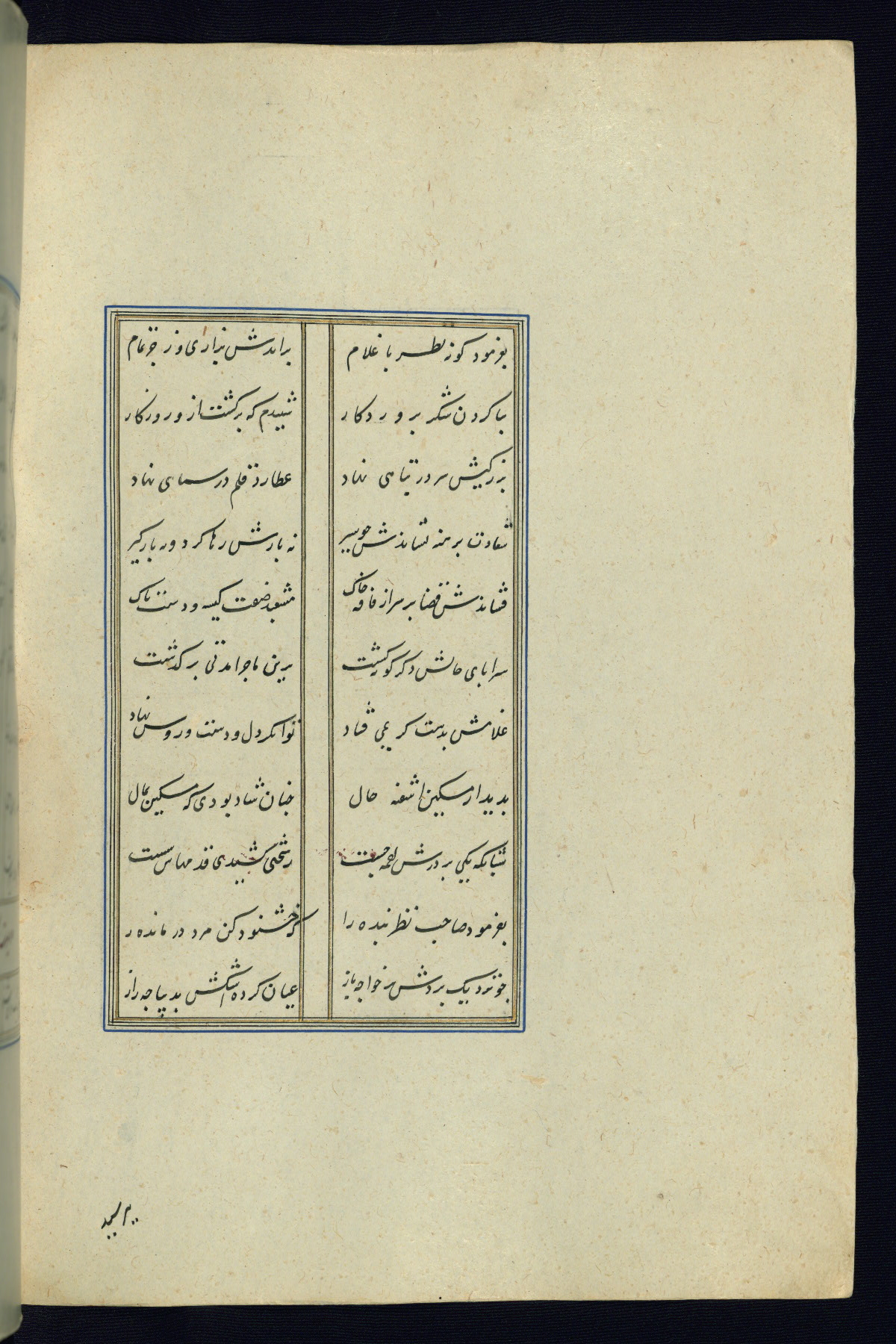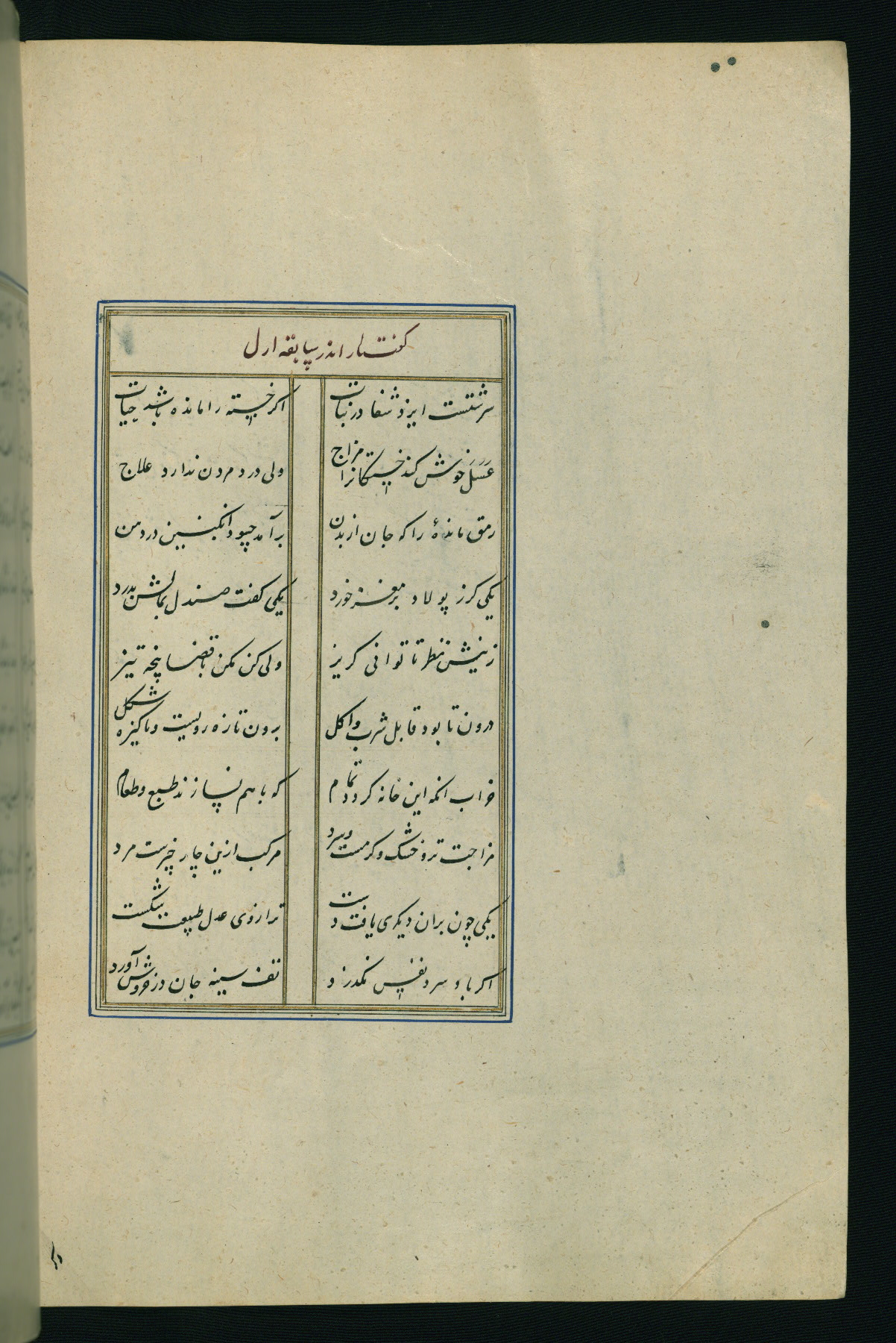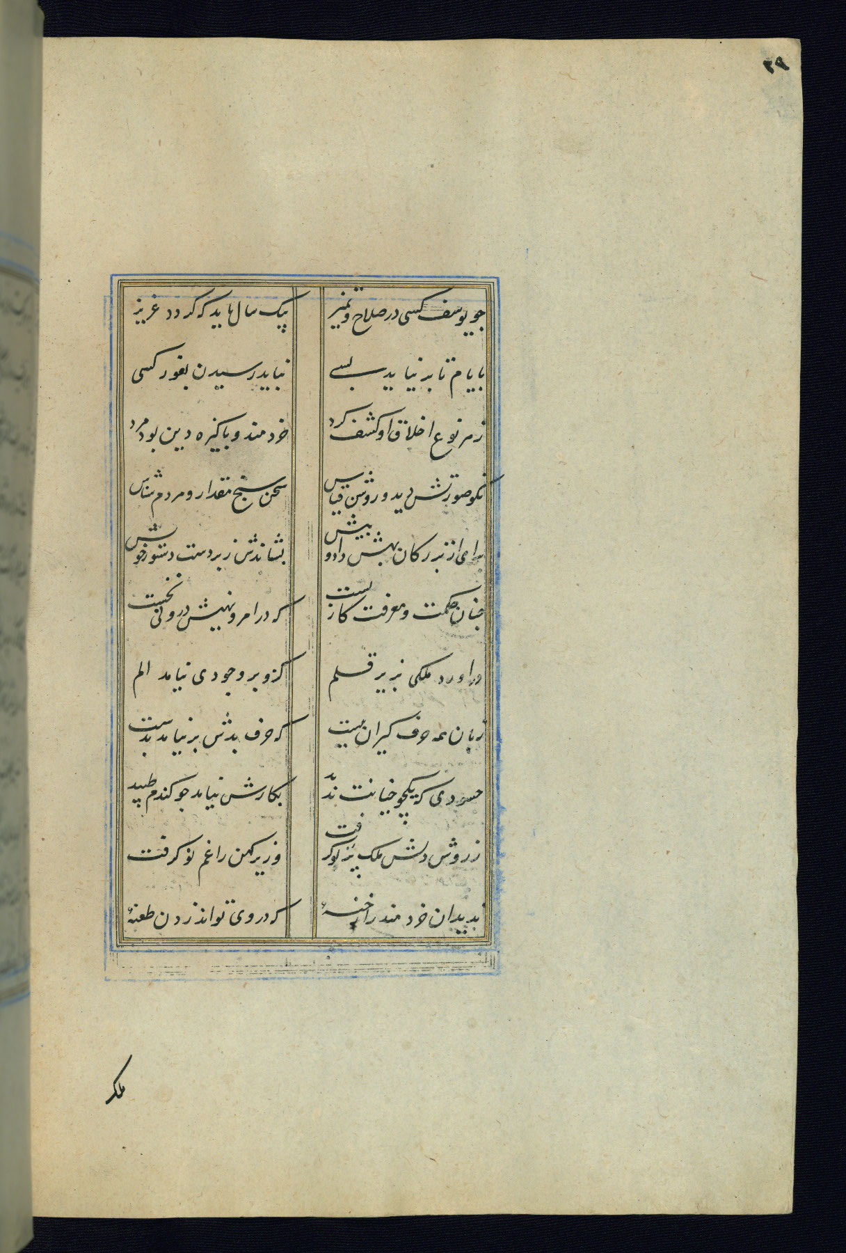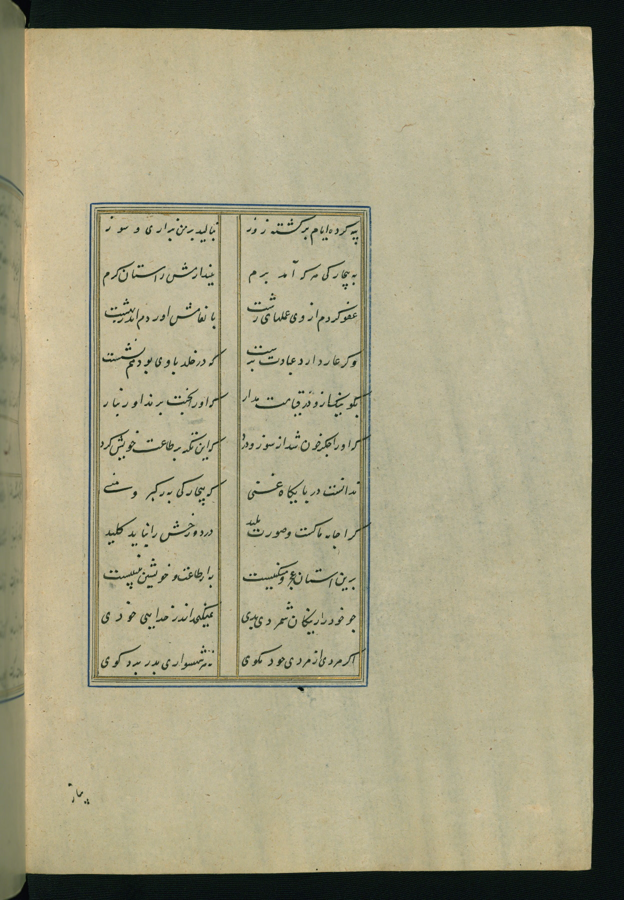 This is an illuminated and illustrated Safavid copy of the Būstān (The garden or The orchard), composed by Sa’dī (d. 691 AH / 1292 CE). It was written in black nasta’līq script in the ninth century AH / sixteenth CE in Iran. The codex opens with a frontispiece with the title Kitāb-i būstān inscribed in an illuminated medallion (fol. 1a), followed by a double-page illustration of a banquet scene in a landscape (fols. 1b-2a). Additionally, there are five paintings illustrating the text (fols. 25a, 55b, 58a, 93b, and 119b). The brown leather, blind-stamped binding decorated with a central oval and pendants is not contemporary with the manuscript.