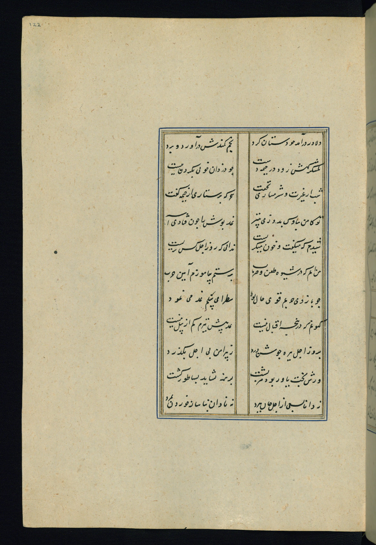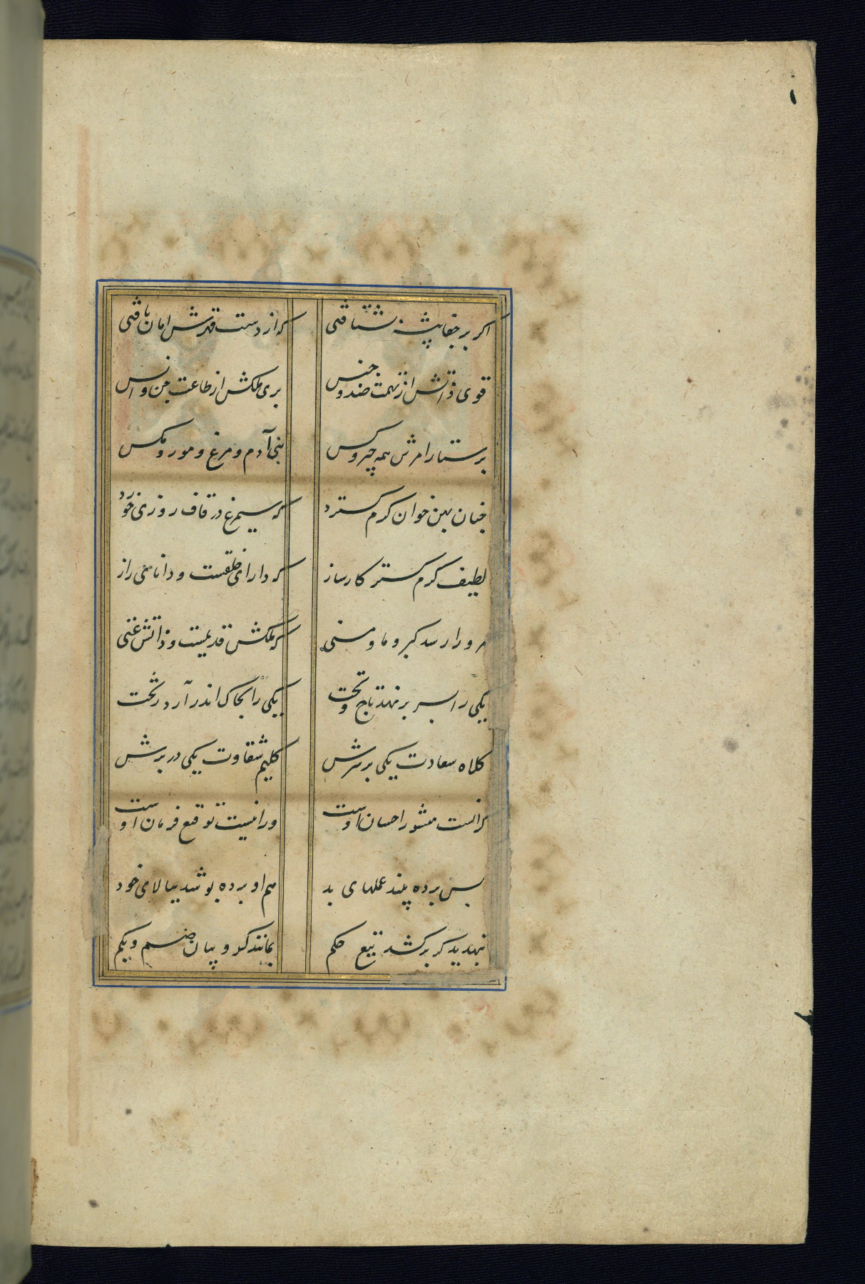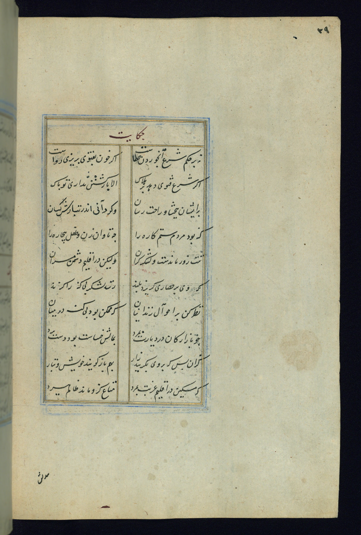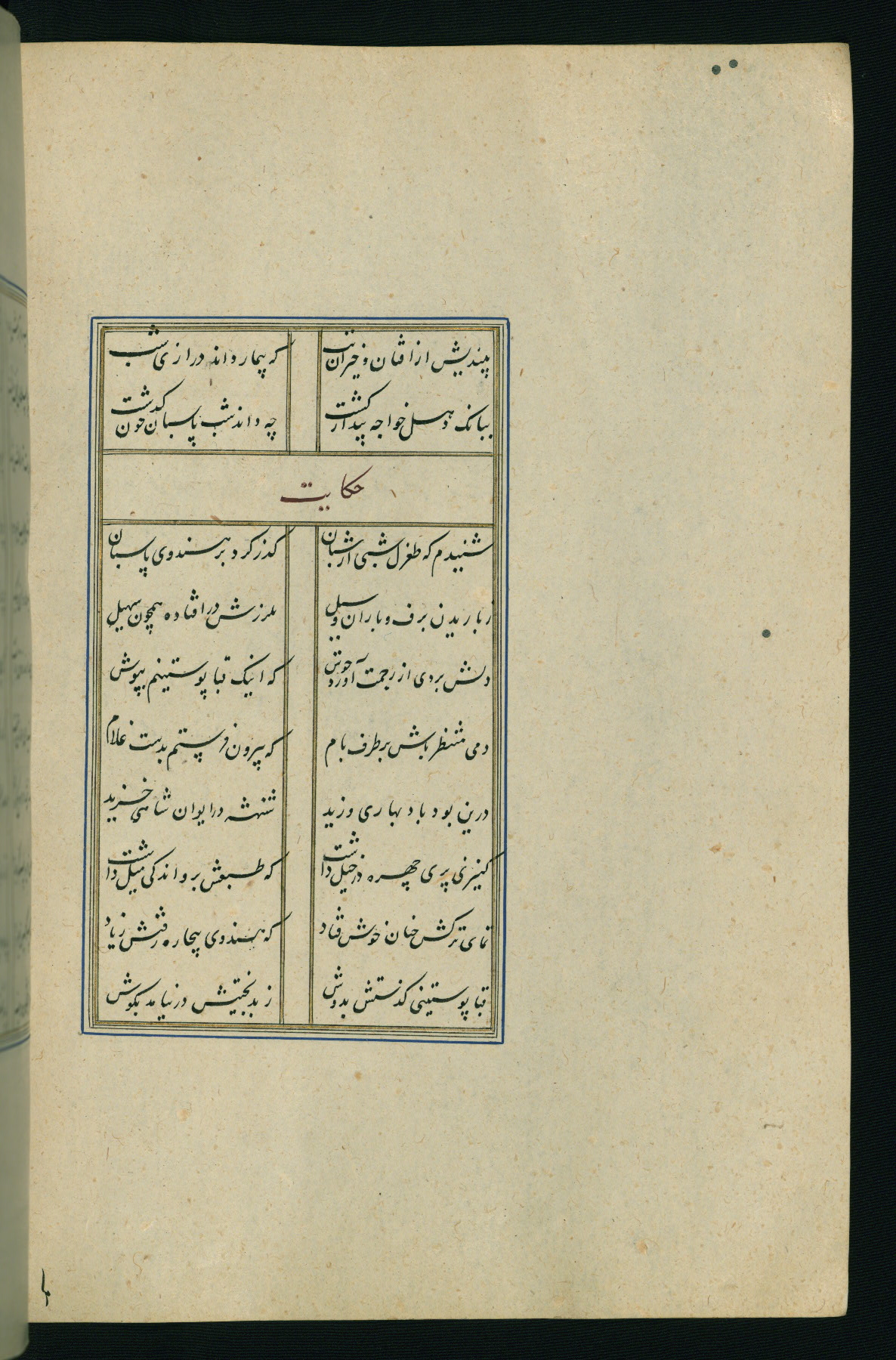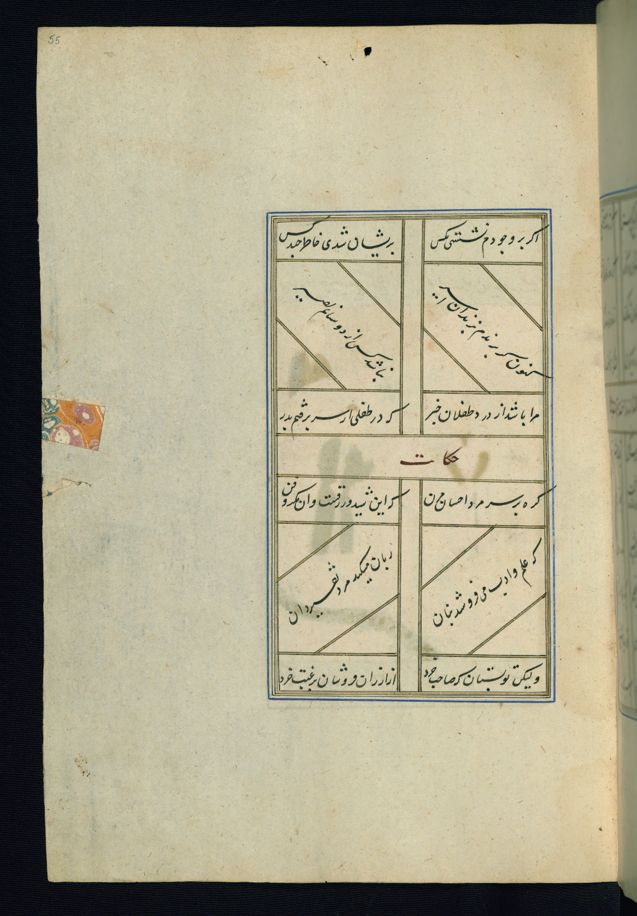 This is an illuminated and illustrated Safavid copy of the Būstān (The garden or The orchard), composed by Sa’dī (d. 691 AH / 1292 CE). It was written in black nasta’līq script in the ninth century AH / sixteenth CE in Iran. The codex opens with a frontispiece with the title Kitāb-i būstān inscribed in an illuminated medallion (fol. 1a), followed by a double-page illustration of a banquet scene in a landscape (fols. 1b-2a). Additionally, there are five paintings illustrating the text (fols. 25a, 55b, 58a, 93b, and 119b). The brown leather, blind-stamped binding decorated with a central oval and pendants is not contemporary with the manuscript.