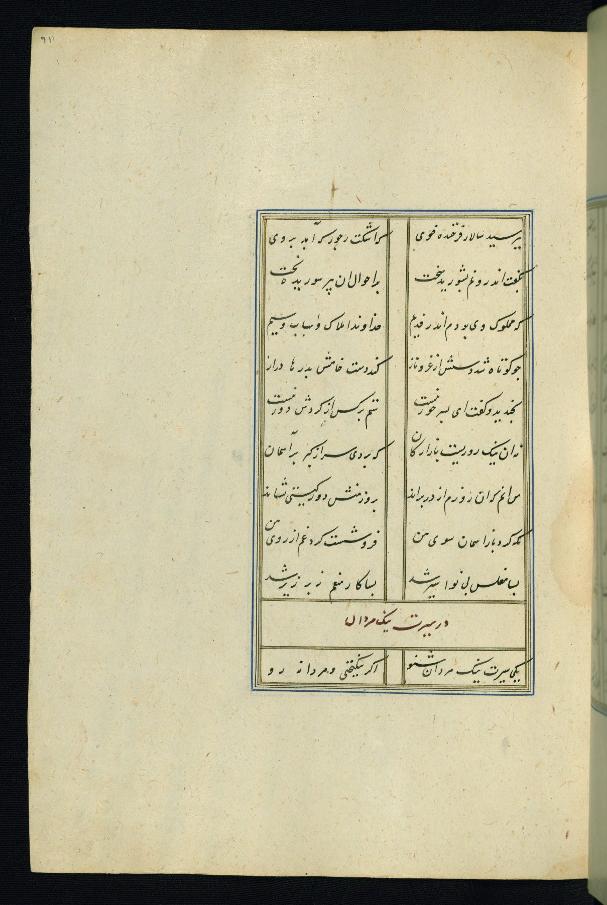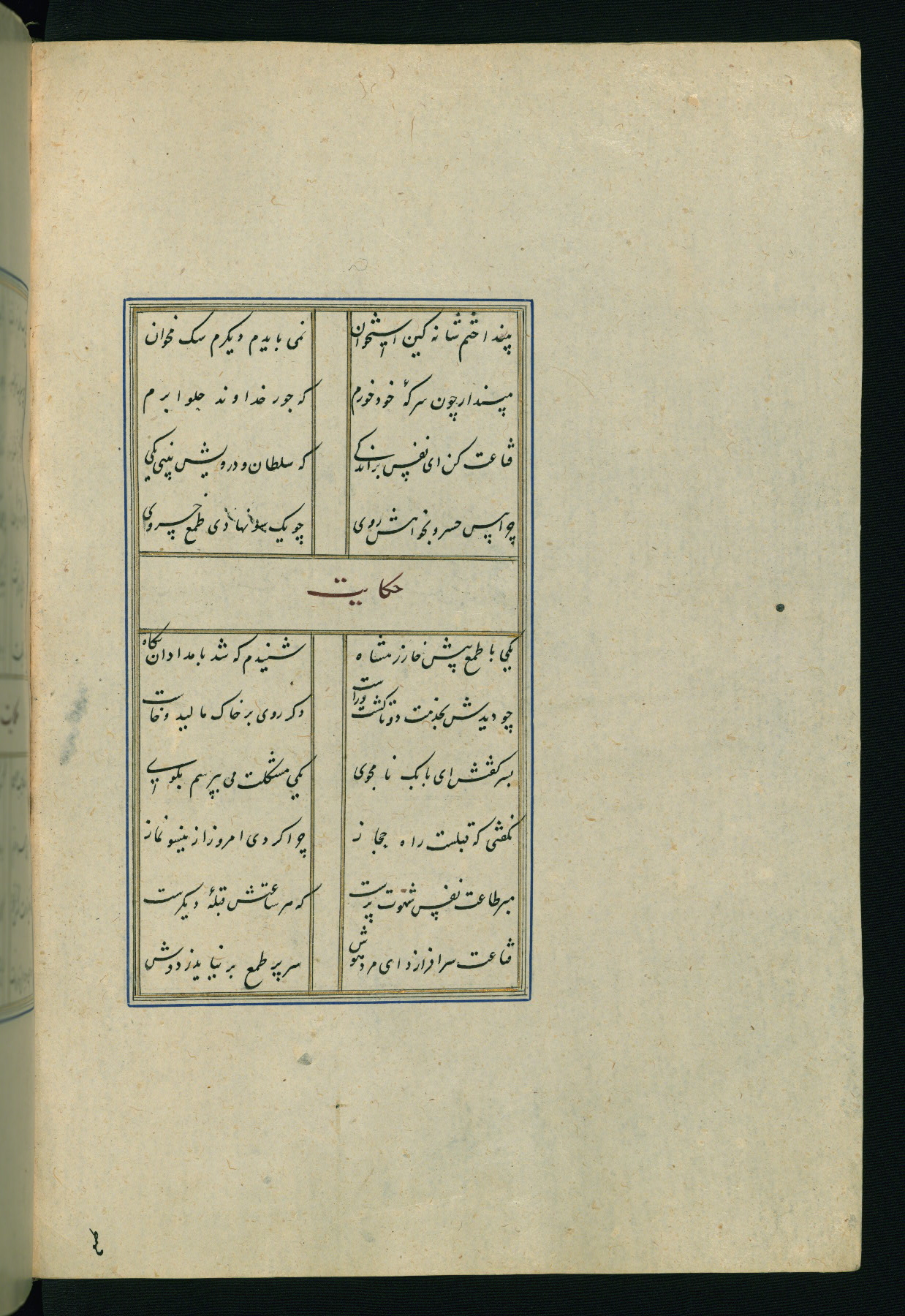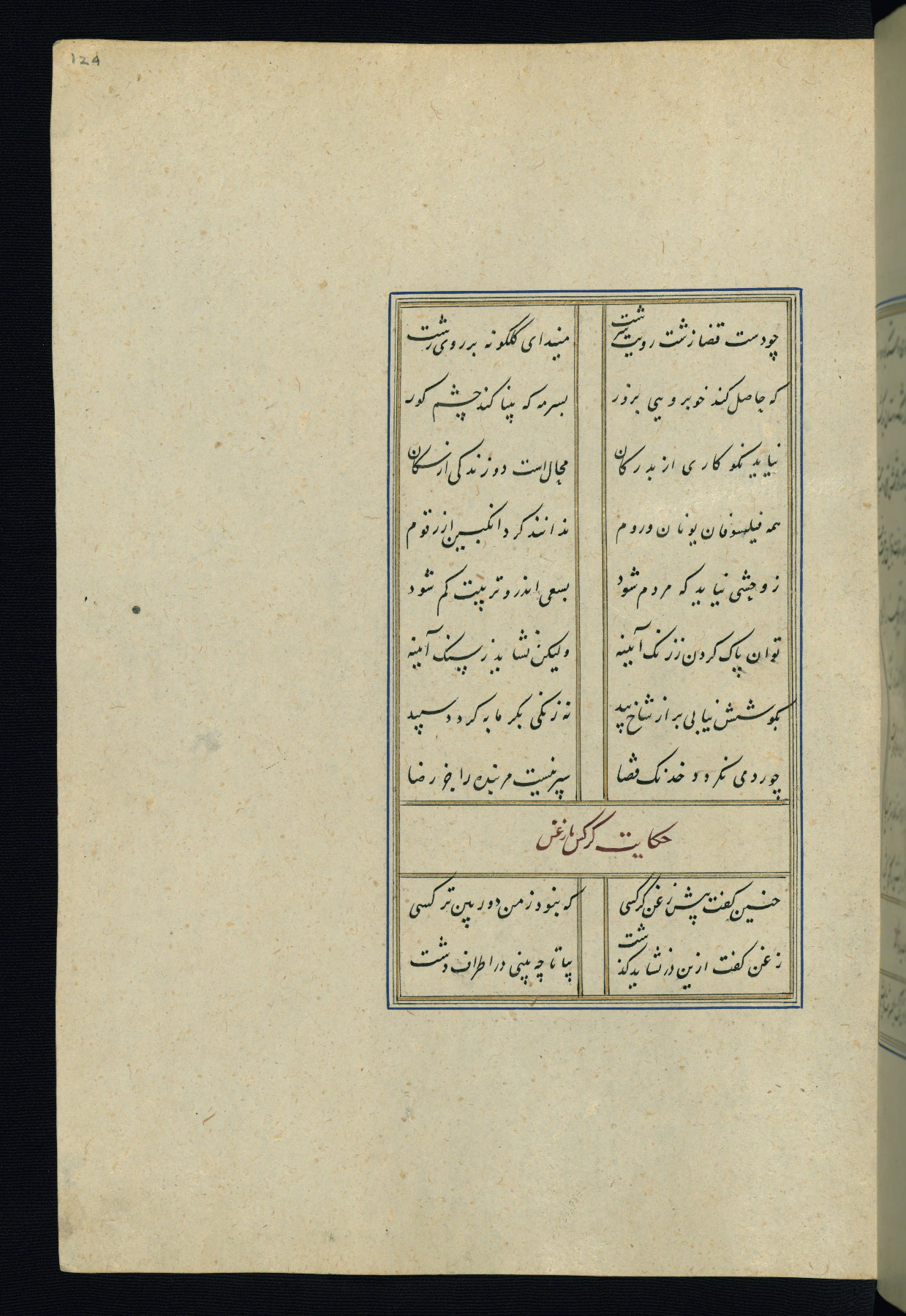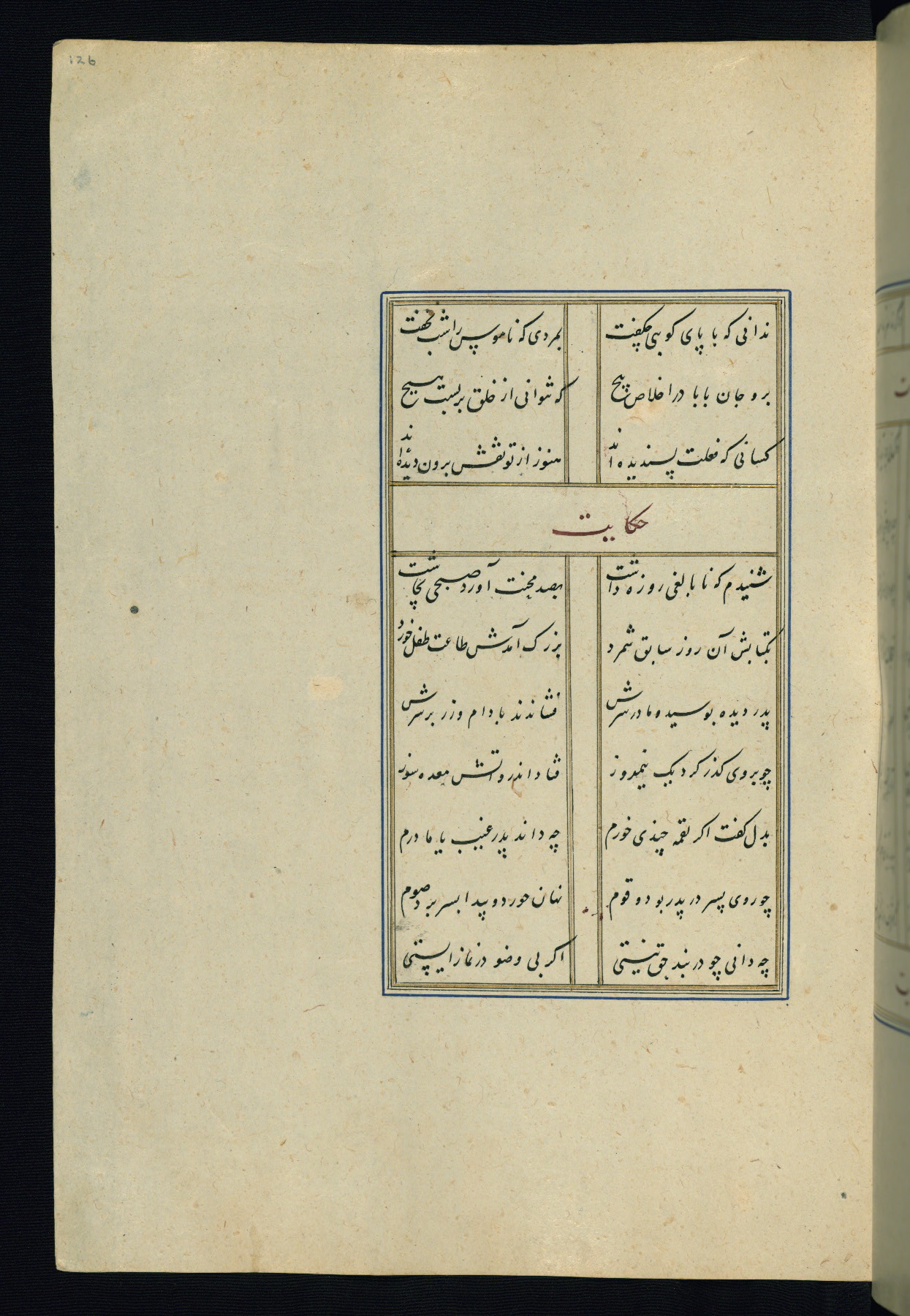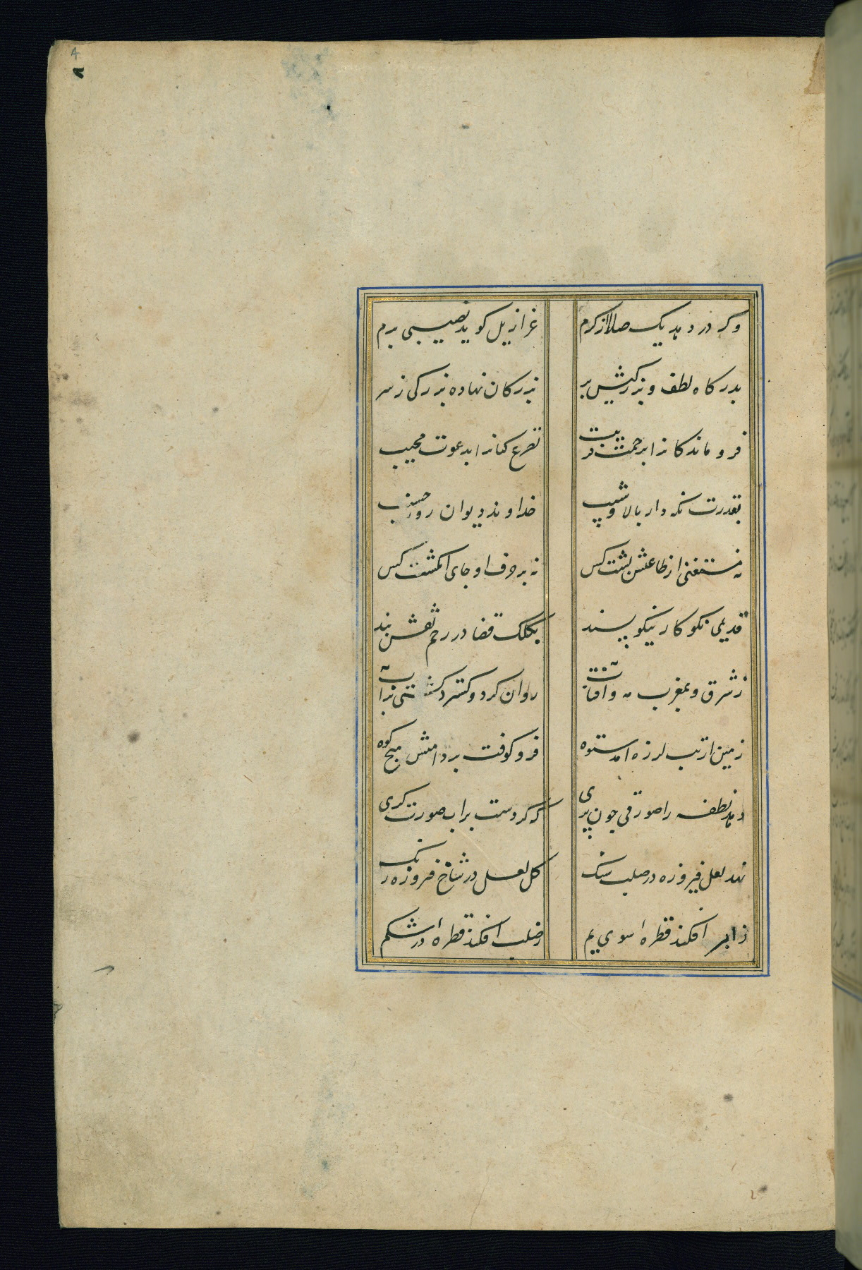 This is an illuminated and illustrated Safavid copy of the Būstān (The garden or The orchard), composed by Sa’dī (d. 691 AH / 1292 CE). It was written in black nasta’līq script in the ninth century AH / sixteenth CE in Iran. The codex opens with a frontispiece with the title Kitāb-i būstān inscribed in an illuminated medallion (fol. 1a), followed by a double-page illustration of a banquet scene in a landscape (fols. 1b-2a). Additionally, there are five paintings illustrating the text (fols. 25a, 55b, 58a, 93b, and 119b). The brown leather, blind-stamped binding decorated with a central oval and pendants is not contemporary with the manuscript.
