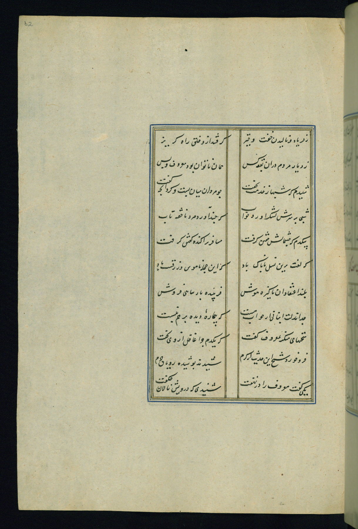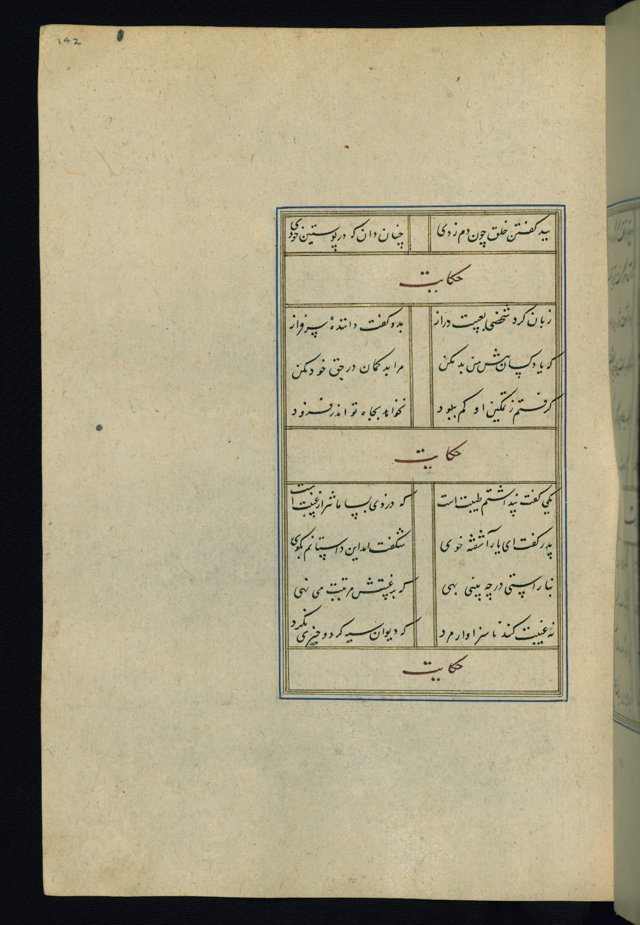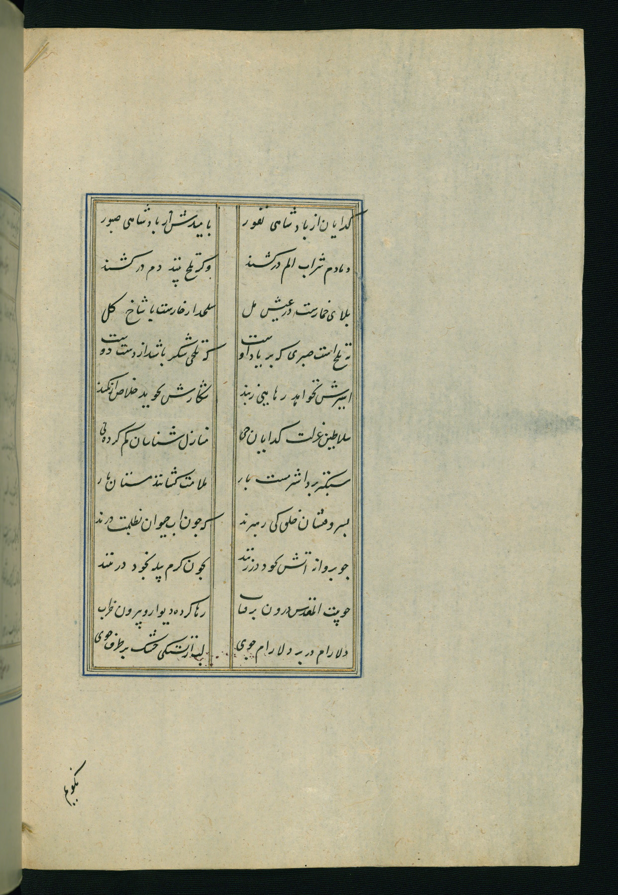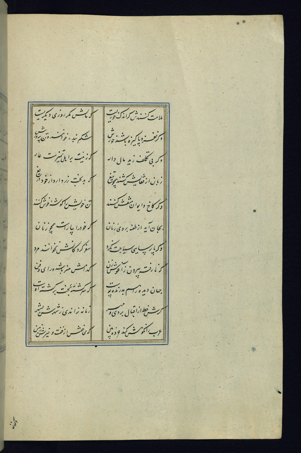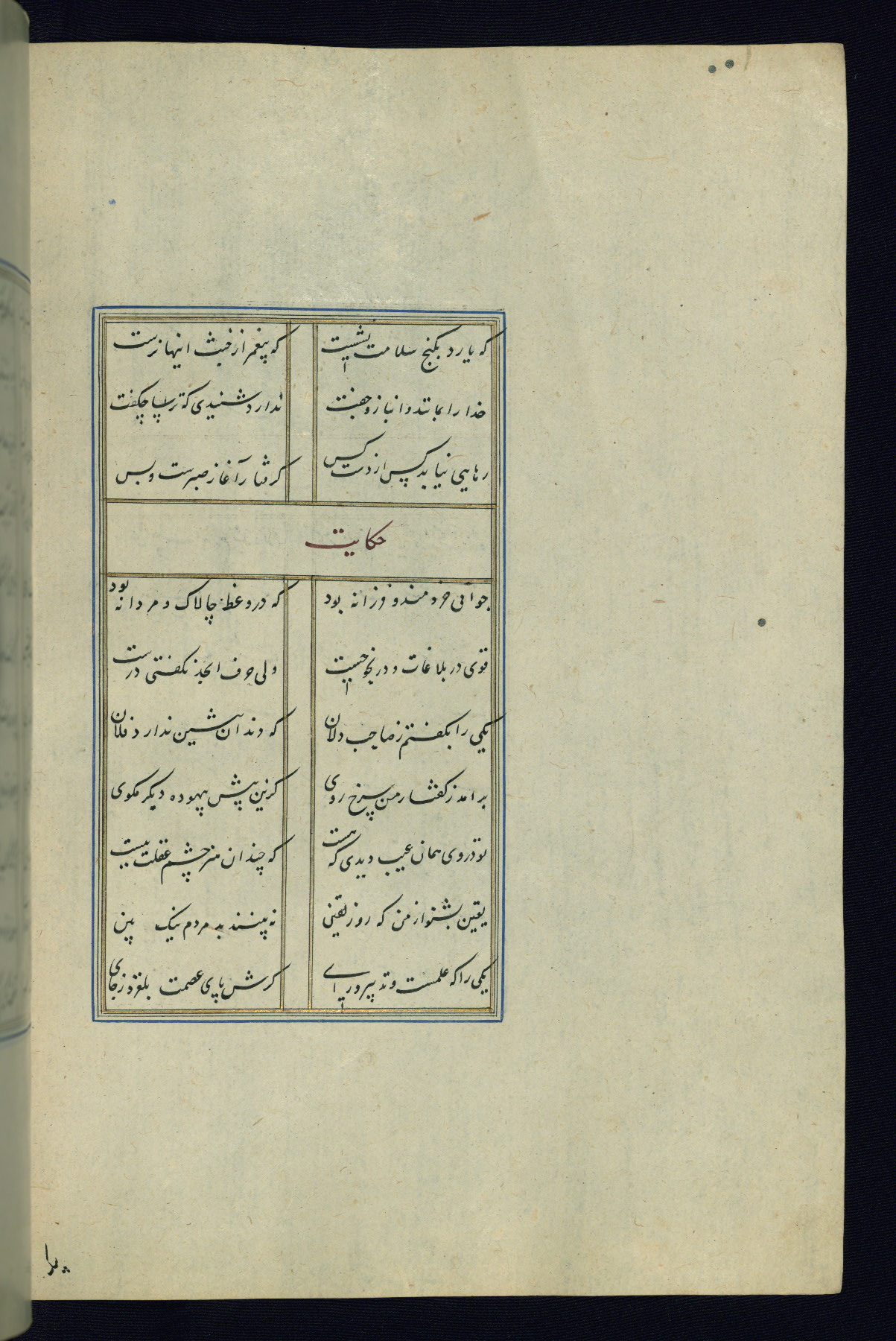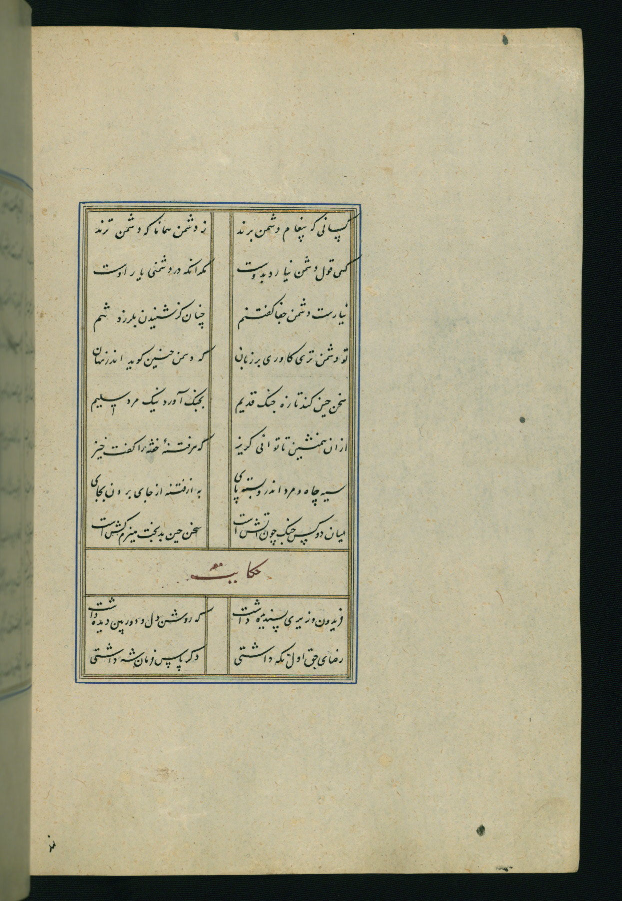 This is an illuminated and illustrated Safavid copy of the Būstān (The garden or The orchard), composed by Sa’dī (d. 691 AH / 1292 CE). It was written in black nasta’līq script in the ninth century AH / sixteenth CE in Iran. The codex opens with a frontispiece with the title Kitāb-i būstān inscribed in an illuminated medallion (fol. 1a), followed by a double-page illustration of a banquet scene in a landscape (fols. 1b-2a). Additionally, there are five paintings illustrating the text (fols. 25a, 55b, 58a, 93b, and 119b). The brown leather, blind-stamped binding decorated with a central oval and pendants is not contemporary with the manuscript.