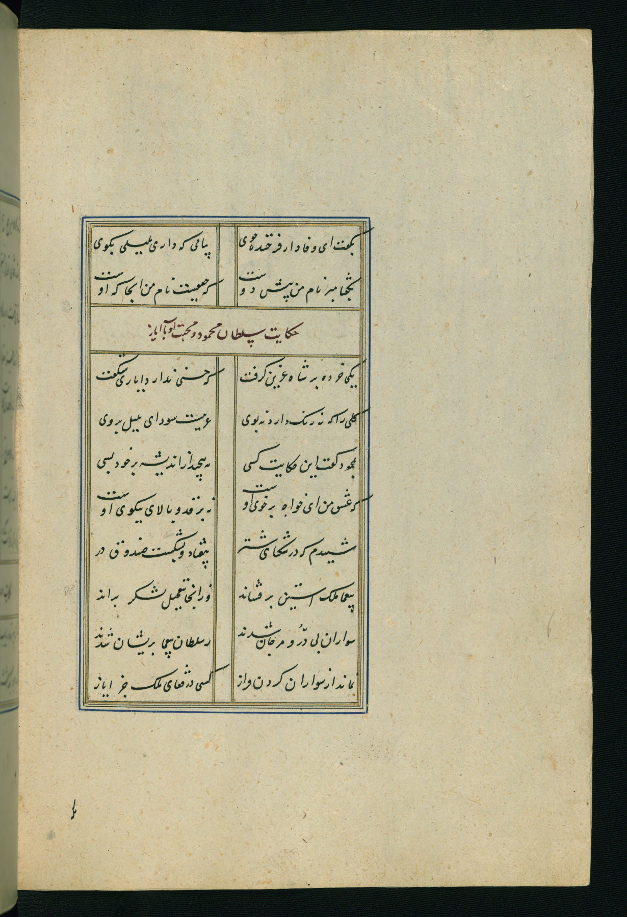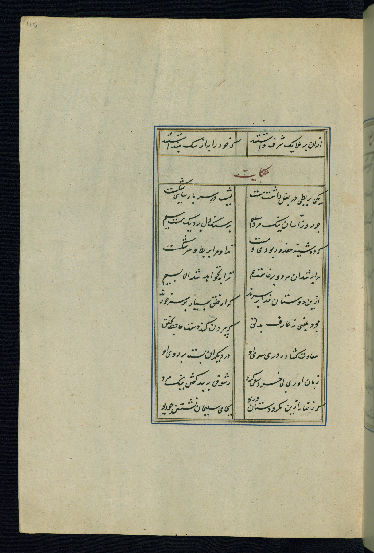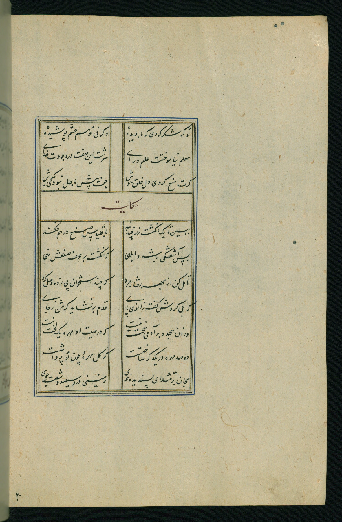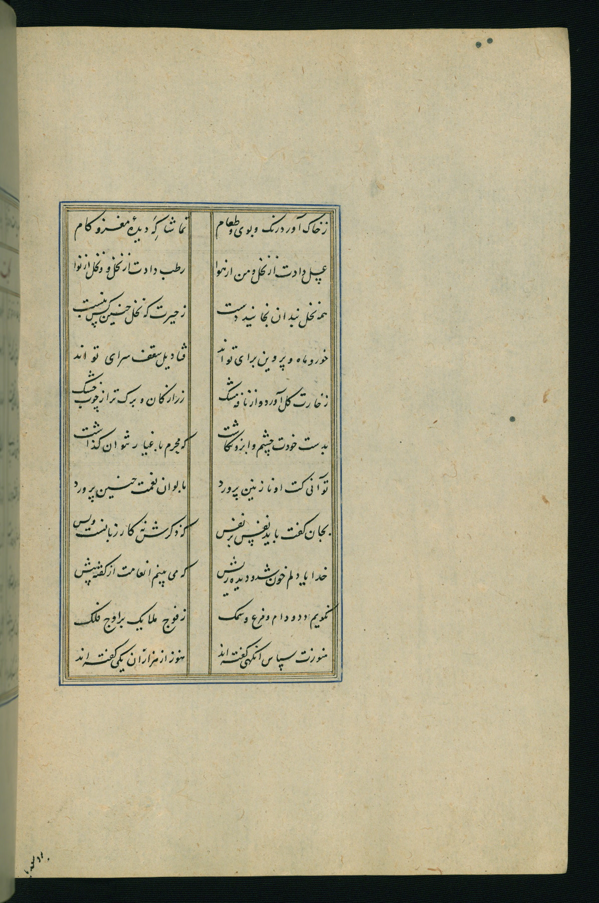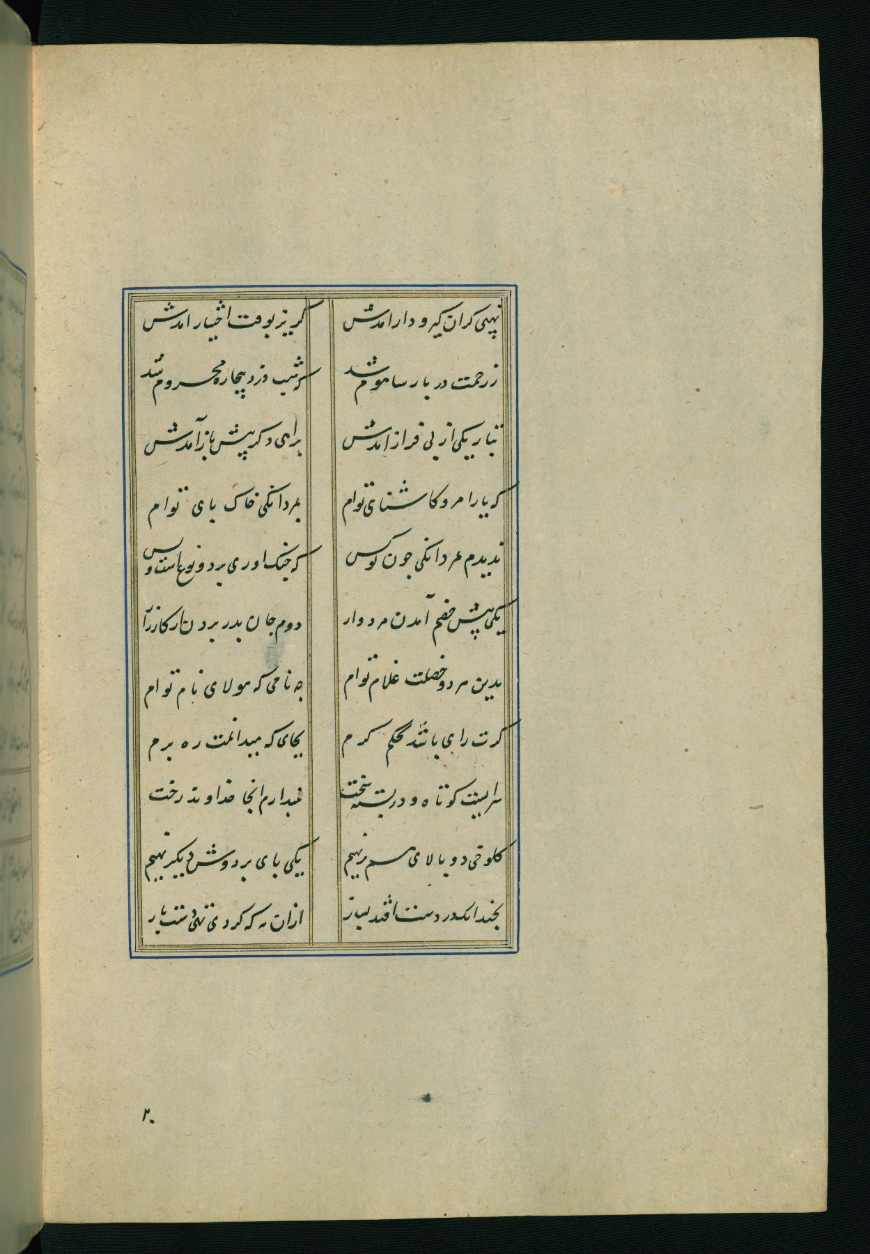 This is an illuminated and illustrated Safavid copy of the Būstān (The garden or The orchard), composed by Sa’dī (d. 691 AH / 1292 CE). It was written in black nasta’līq script in the ninth century AH / sixteenth CE in Iran. The codex opens with a frontispiece with the title Kitāb-i būstān inscribed in an illuminated medallion (fol. 1a), followed by a double-page illustration of a banquet scene in a landscape (fols. 1b-2a). Additionally, there are five paintings illustrating the text (fols. 25a, 55b, 58a, 93b, and 119b). The brown leather, blind-stamped binding decorated with a central oval and pendants is not contemporary with the manuscript.