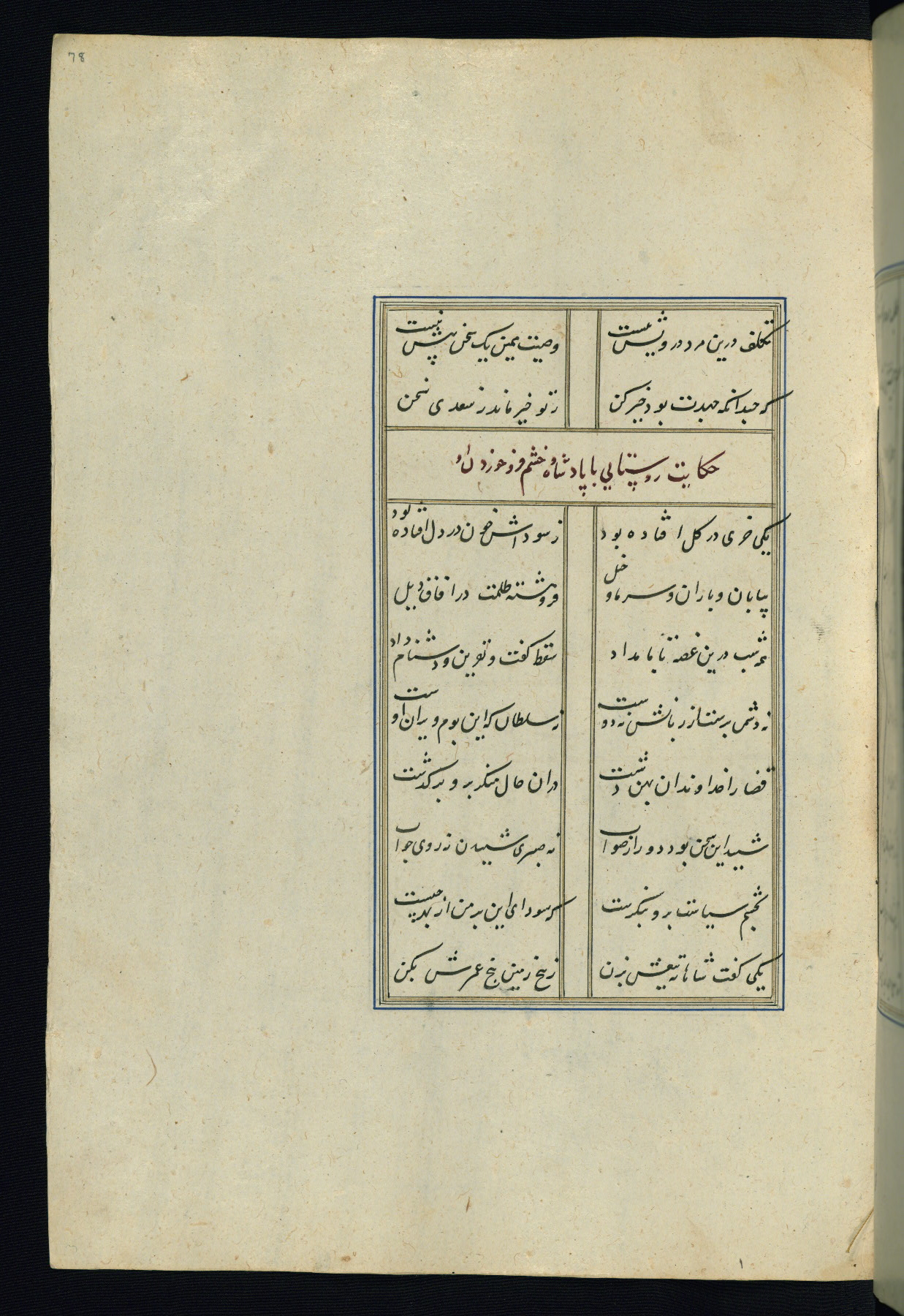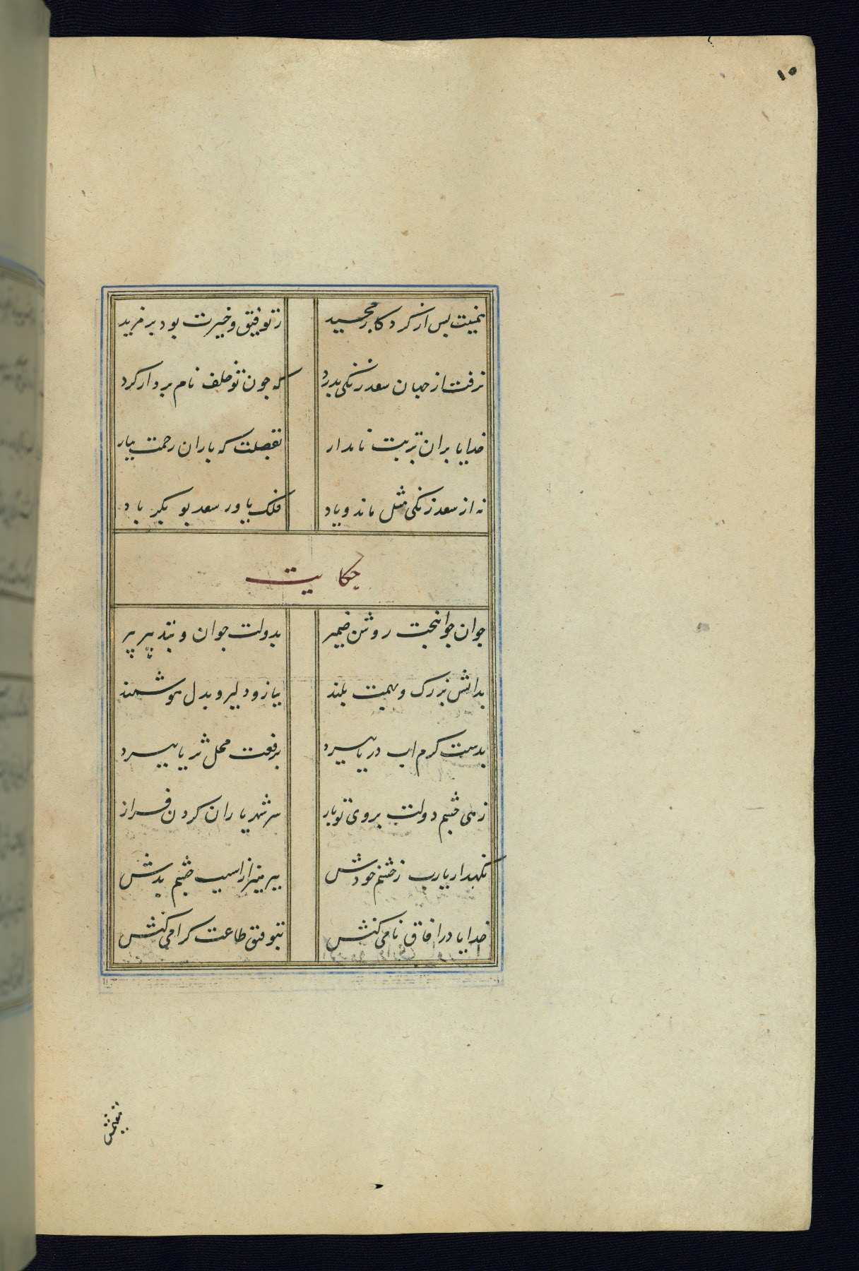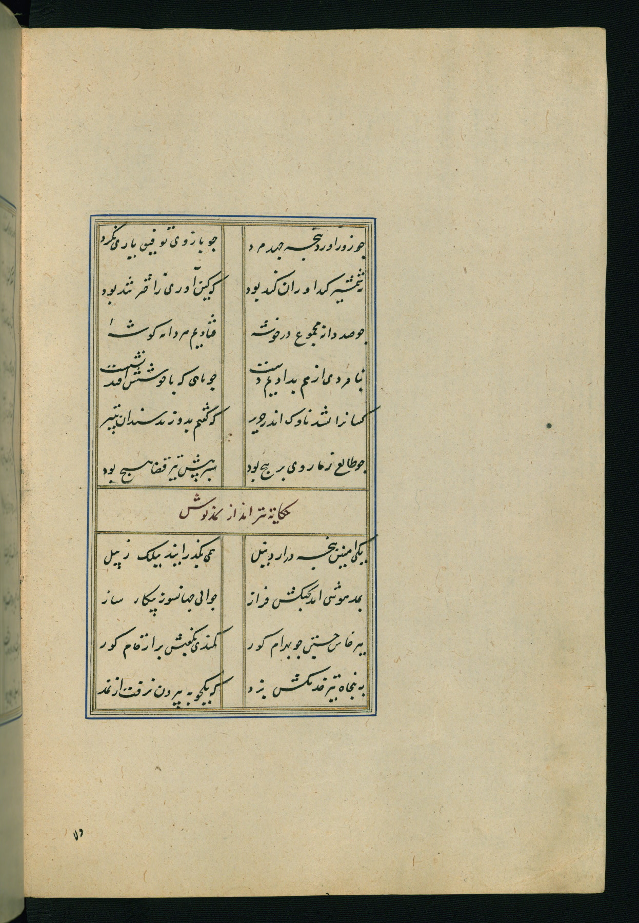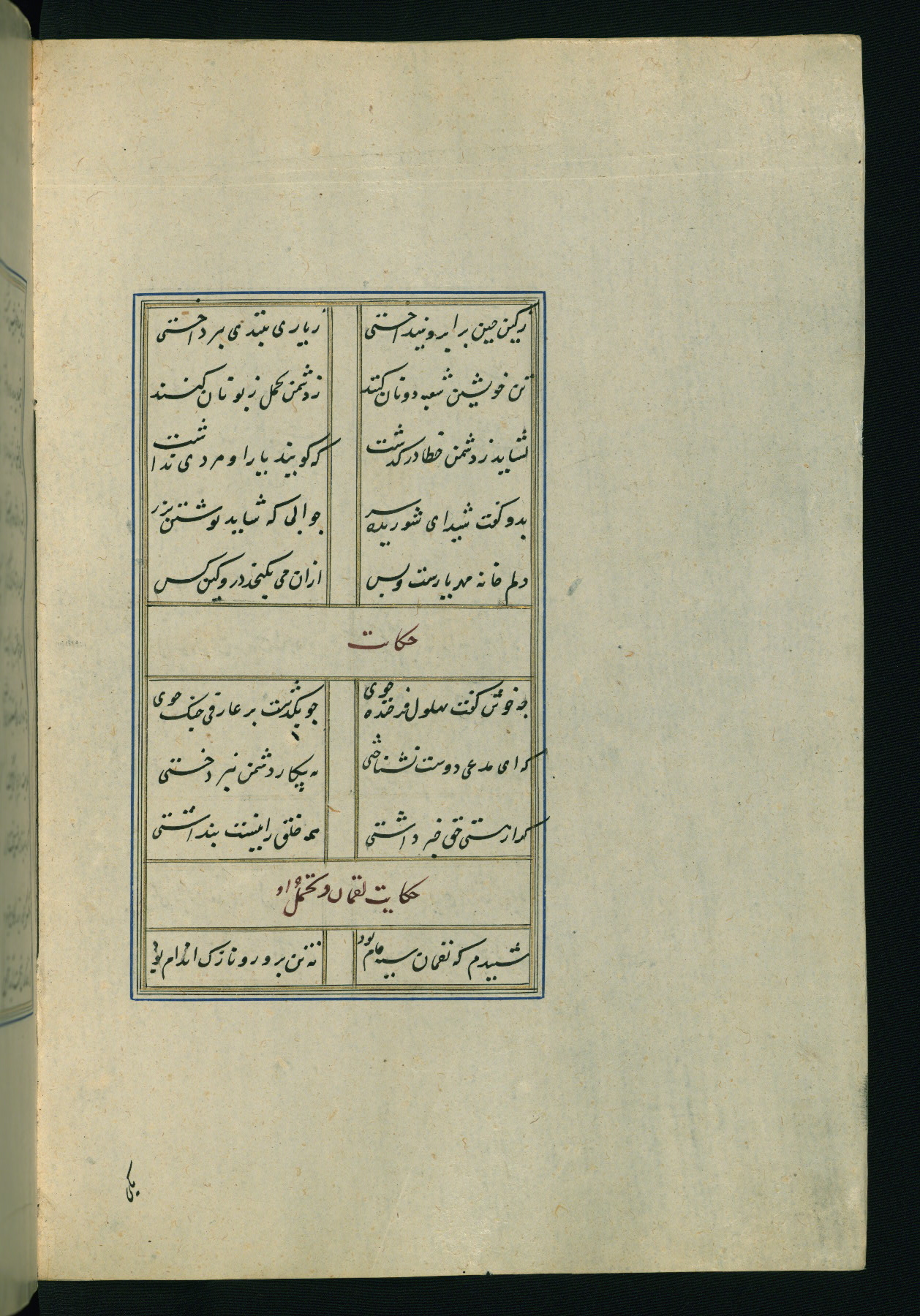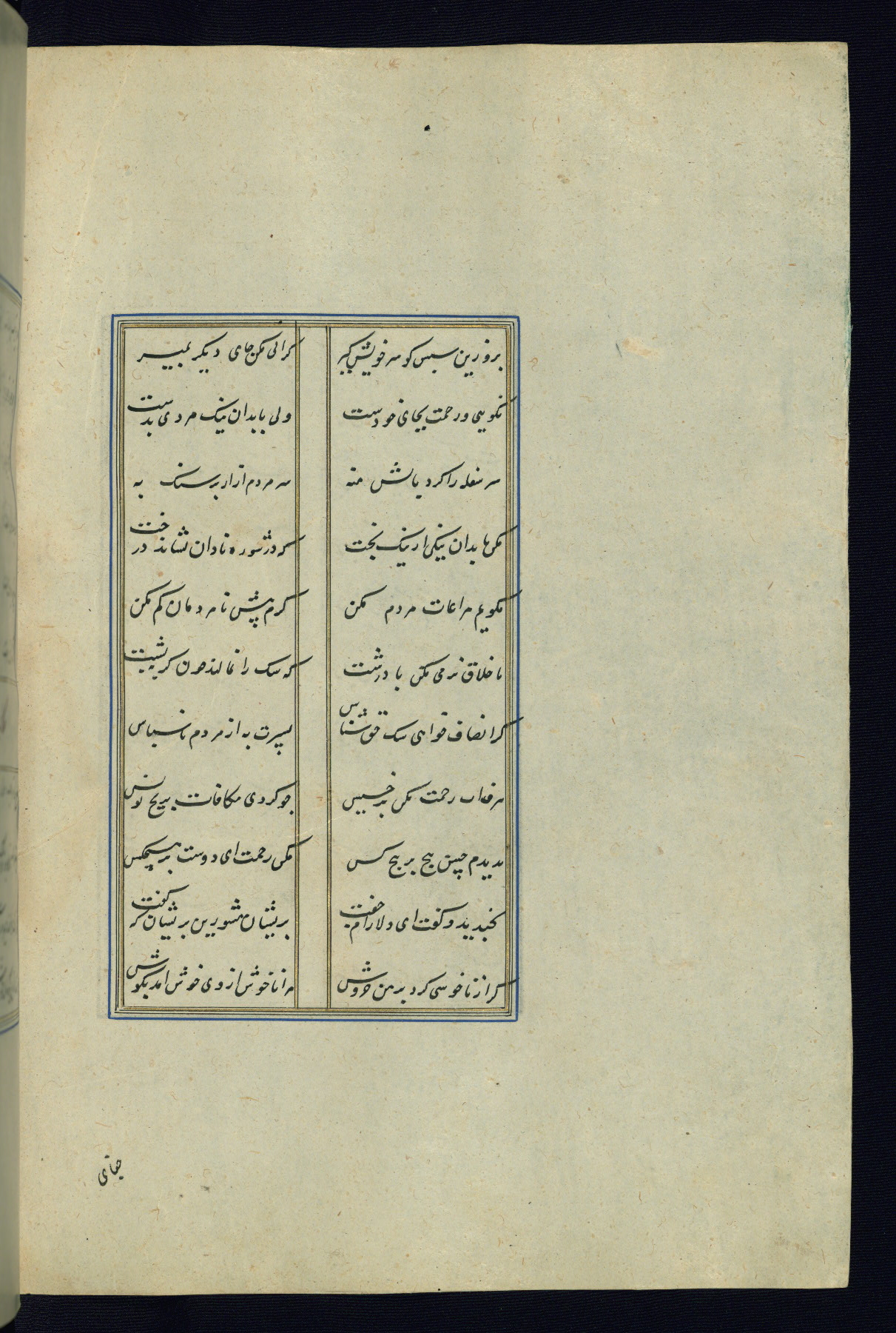 This is an illuminated and illustrated Safavid copy of the Būstān (The garden or The orchard), composed by Sa’dī (d. 691 AH / 1292 CE). It was written in black nasta’līq script in the ninth century AH / sixteenth CE in Iran. The codex opens with a frontispiece with the title Kitāb-i būstān inscribed in an illuminated medallion (fol. 1a), followed by a double-page illustration of a banquet scene in a landscape (fols. 1b-2a). Additionally, there are five paintings illustrating the text (fols. 25a, 55b, 58a, 93b, and 119b). The brown leather, blind-stamped binding decorated with a central oval and pendants is not contemporary with the manuscript.