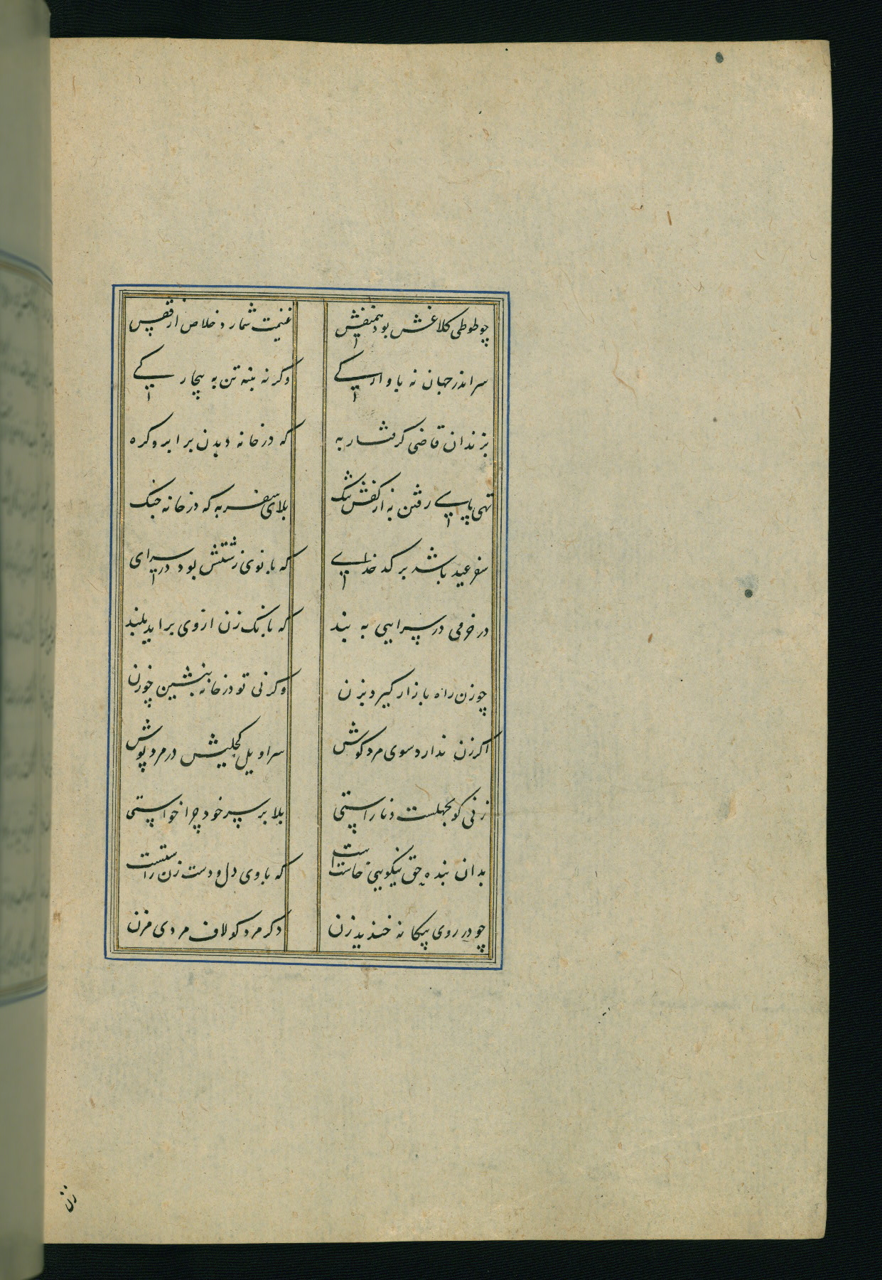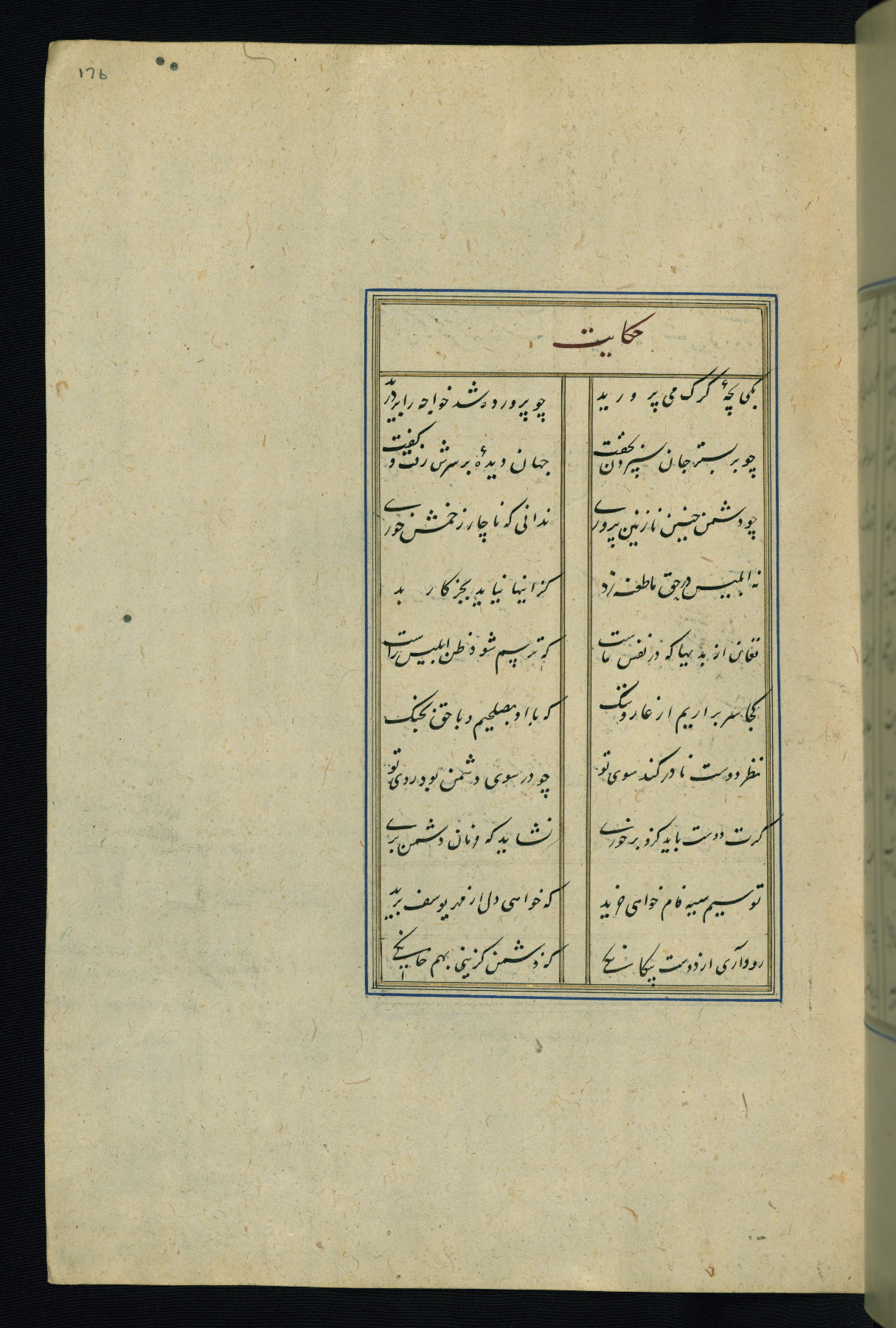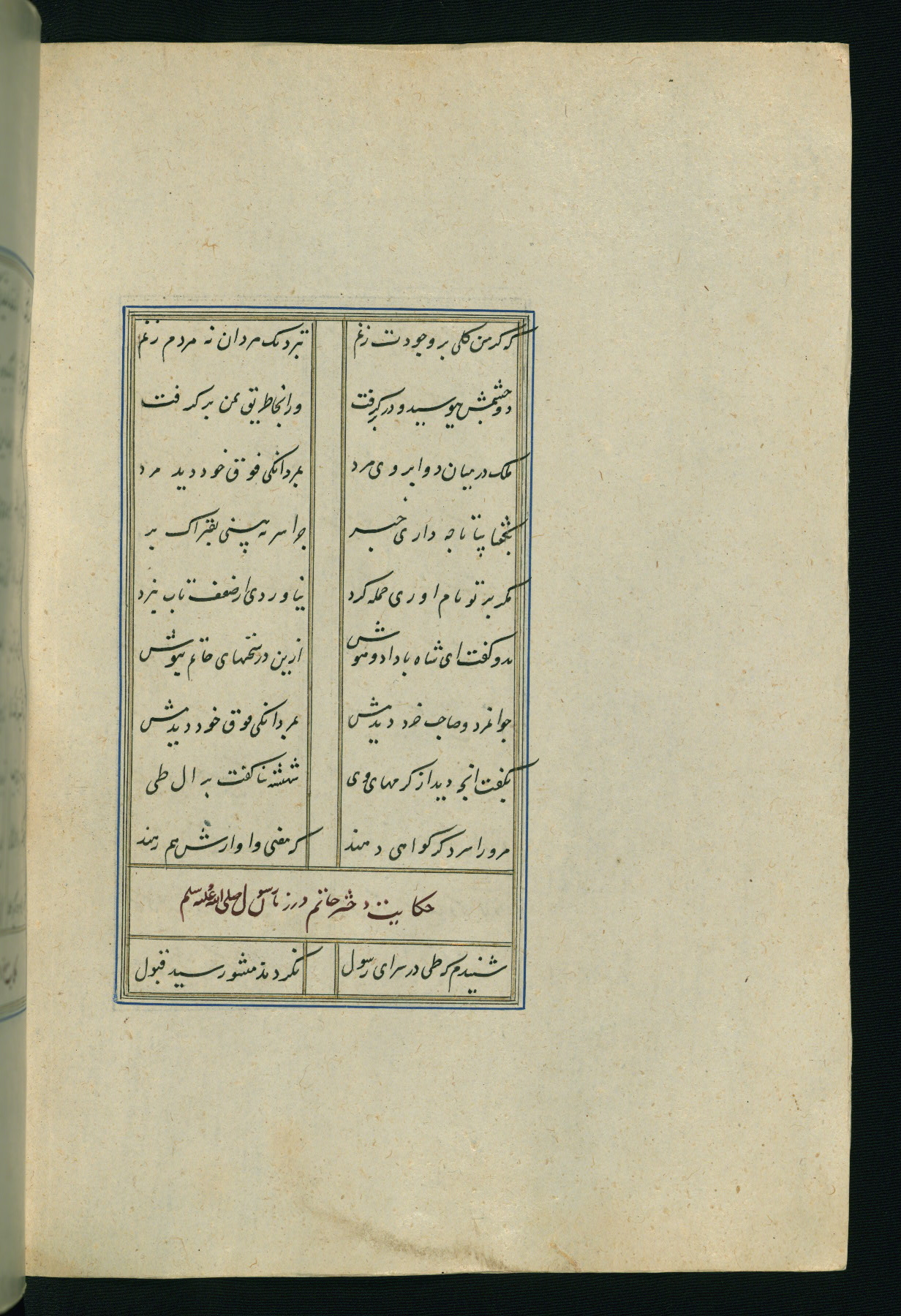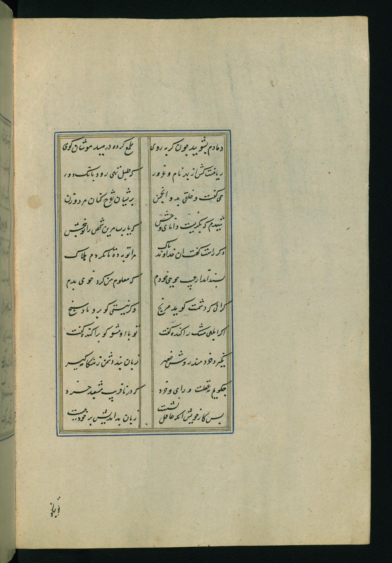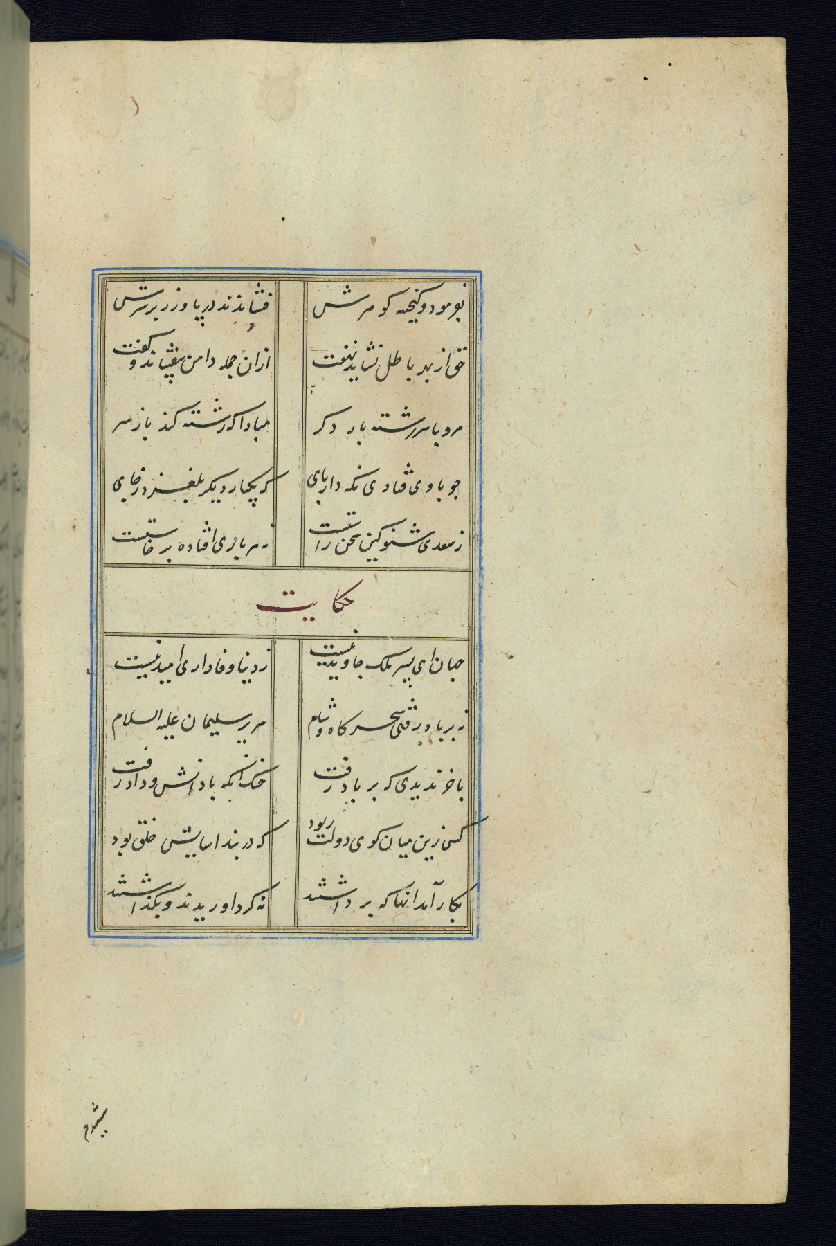 This is an illuminated and illustrated Safavid copy of the Būstān (The garden or The orchard), composed by Sa’dī (d. 691 AH / 1292 CE). It was written in black nasta’līq script in the ninth century AH / sixteenth CE in Iran. The codex opens with a frontispiece with the title Kitāb-i būstān inscribed in an illuminated medallion (fol. 1a), followed by a double-page illustration of a banquet scene in a landscape (fols. 1b-2a). Additionally, there are five paintings illustrating the text (fols. 25a, 55b, 58a, 93b, and 119b). The brown leather, blind-stamped binding decorated with a central oval and pendants is not contemporary with the manuscript.