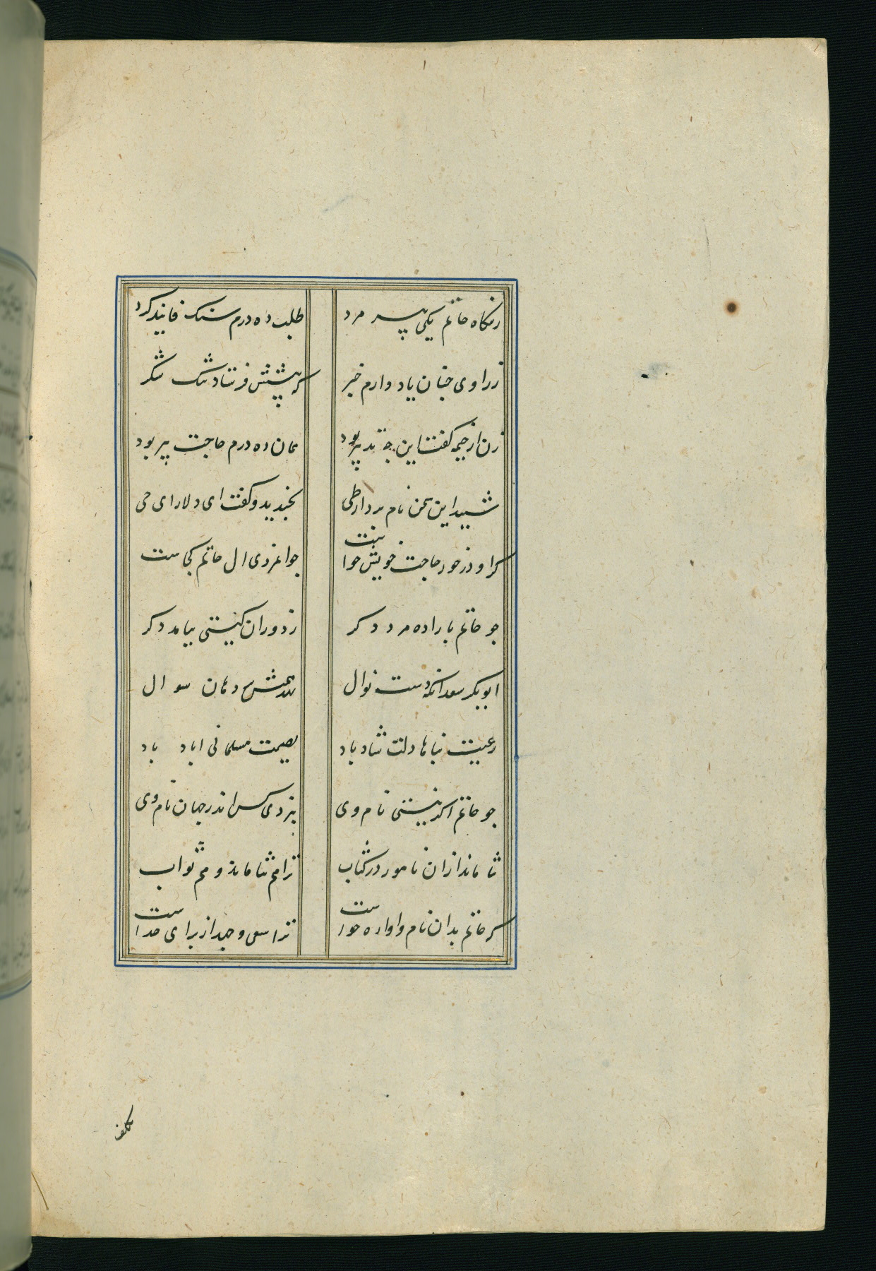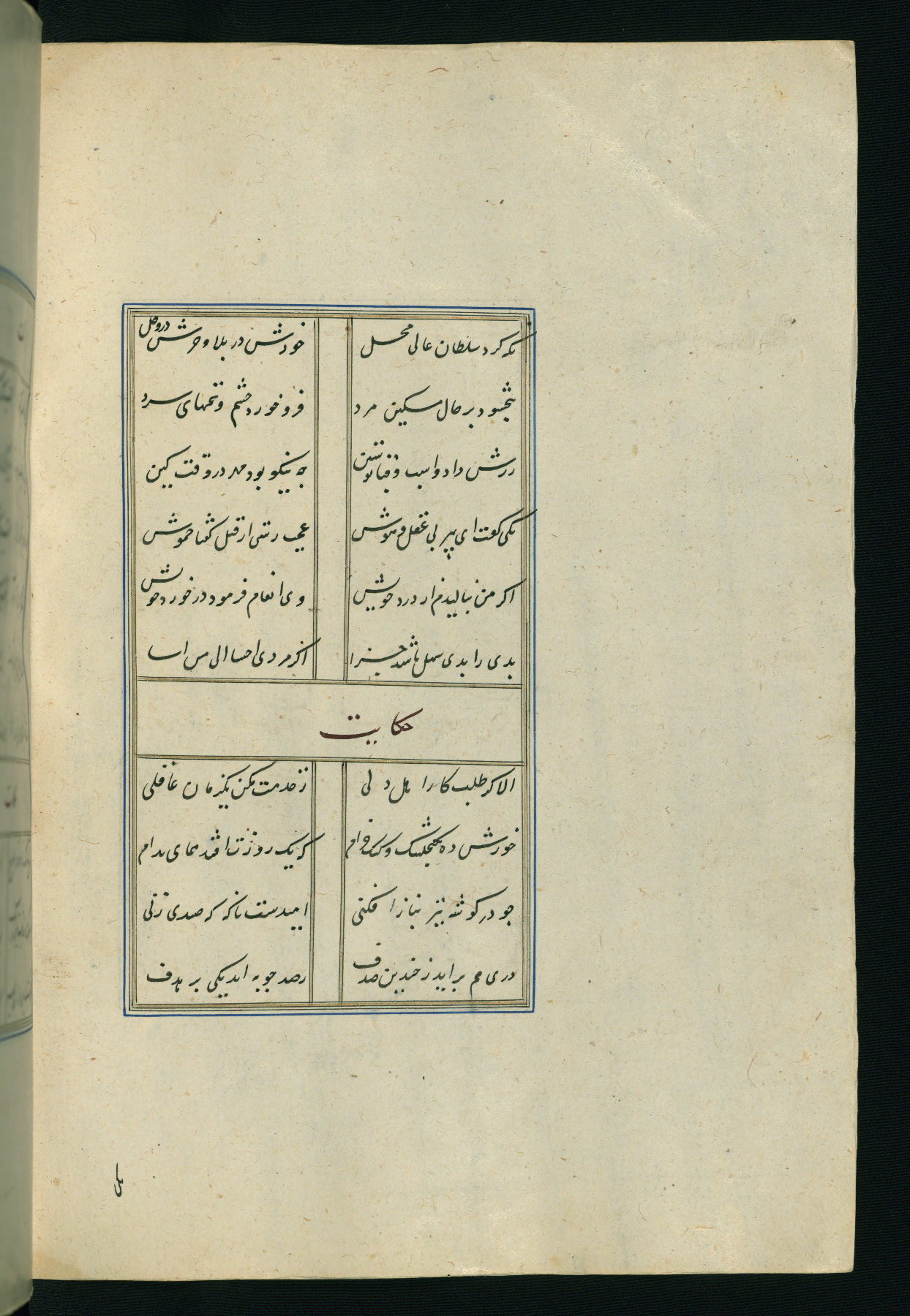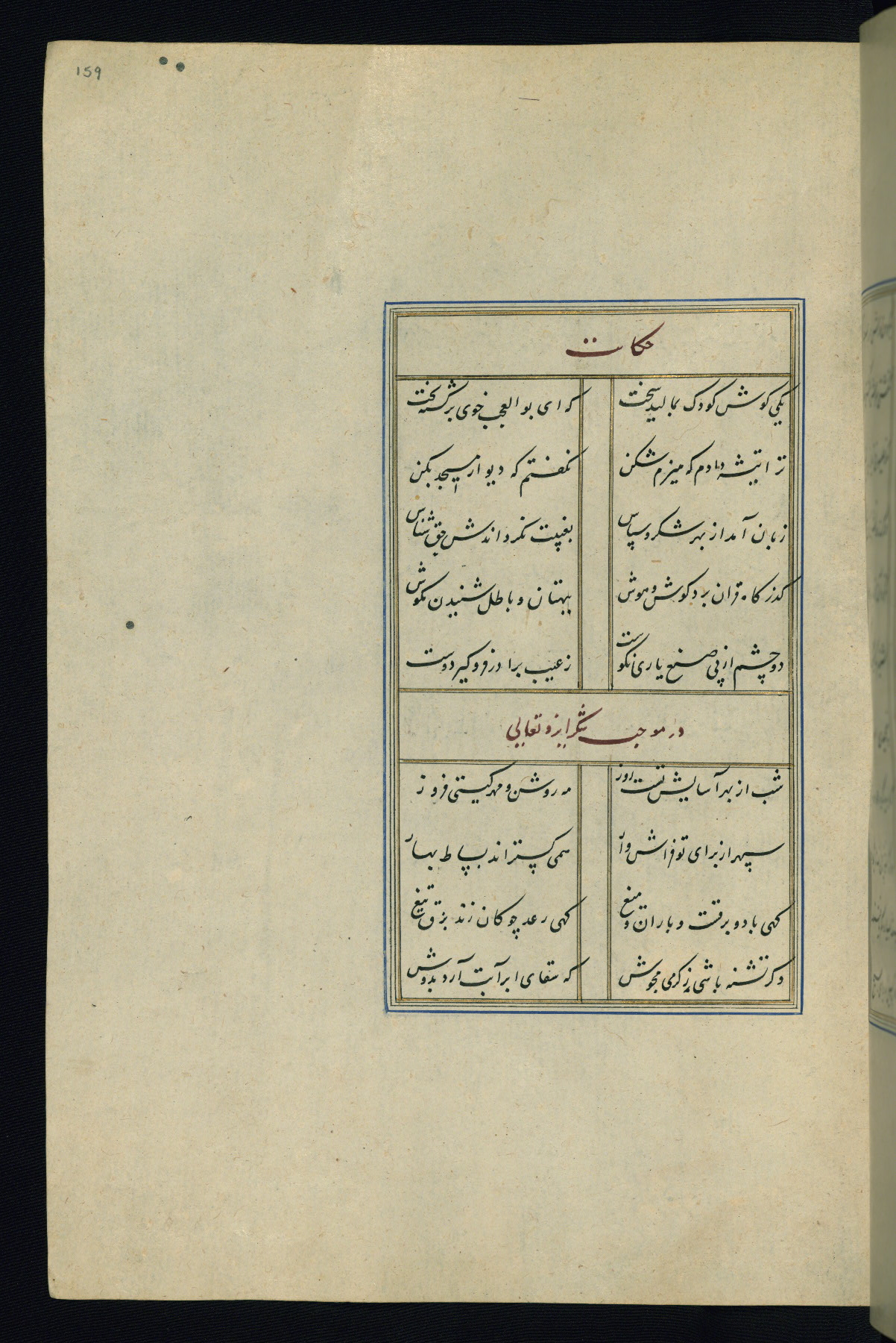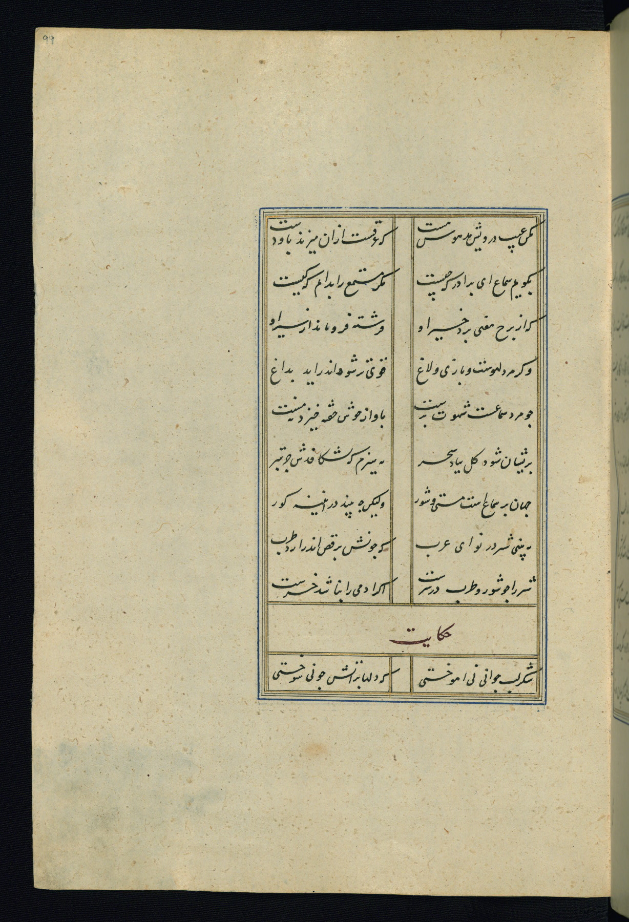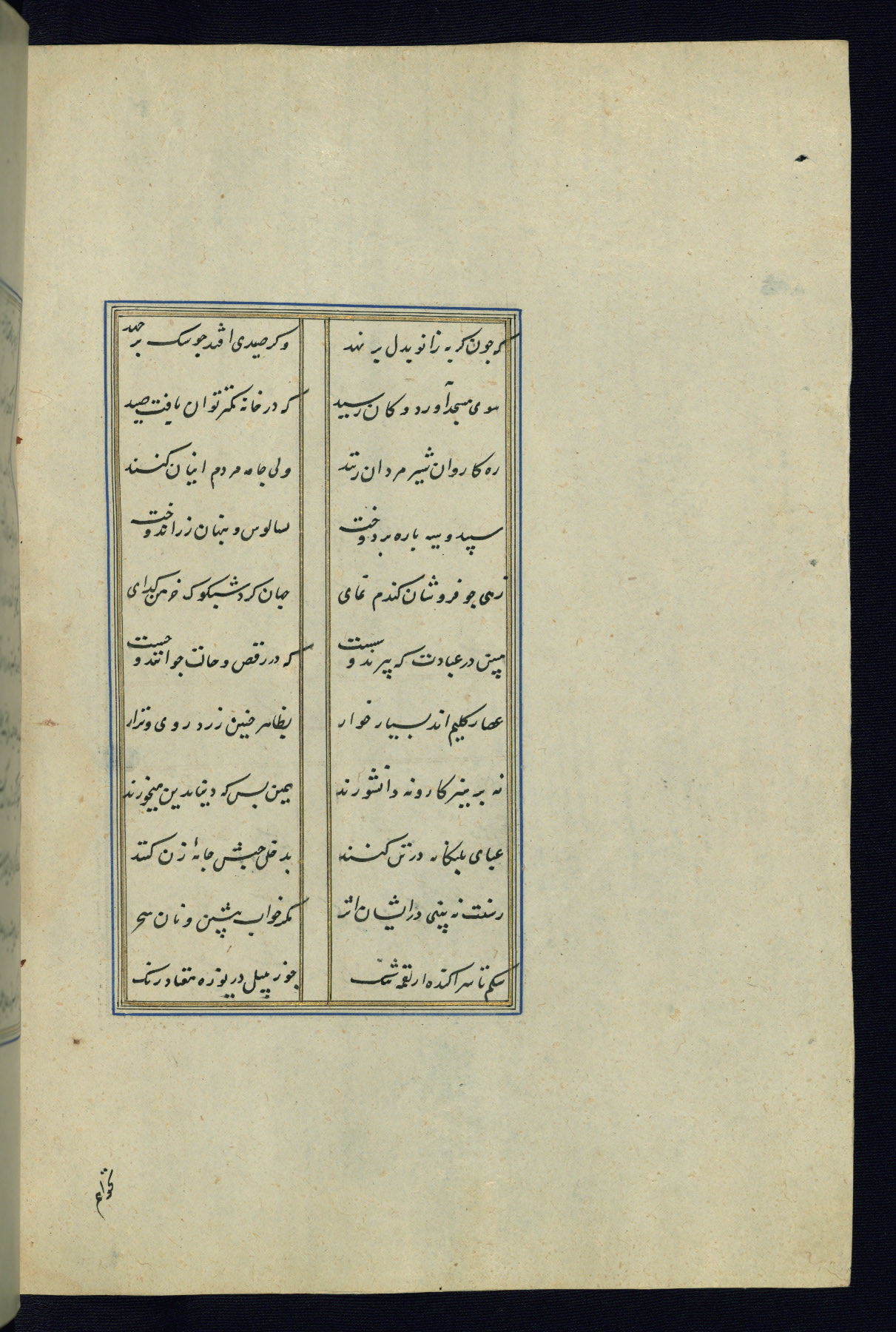 This is an illuminated and illustrated Safavid copy of the Būstān (The garden or The orchard), composed by Sa’dī (d. 691 AH / 1292 CE). It was written in black nasta’līq script in the ninth century AH / sixteenth CE in Iran. The codex opens with a frontispiece with the title Kitāb-i būstān inscribed in an illuminated medallion (fol. 1a), followed by a double-page illustration of a banquet scene in a landscape (fols. 1b-2a). Additionally, there are five paintings illustrating the text (fols. 25a, 55b, 58a, 93b, and 119b). The brown leather, blind-stamped binding decorated with a central oval and pendants is not contemporary with the manuscript.