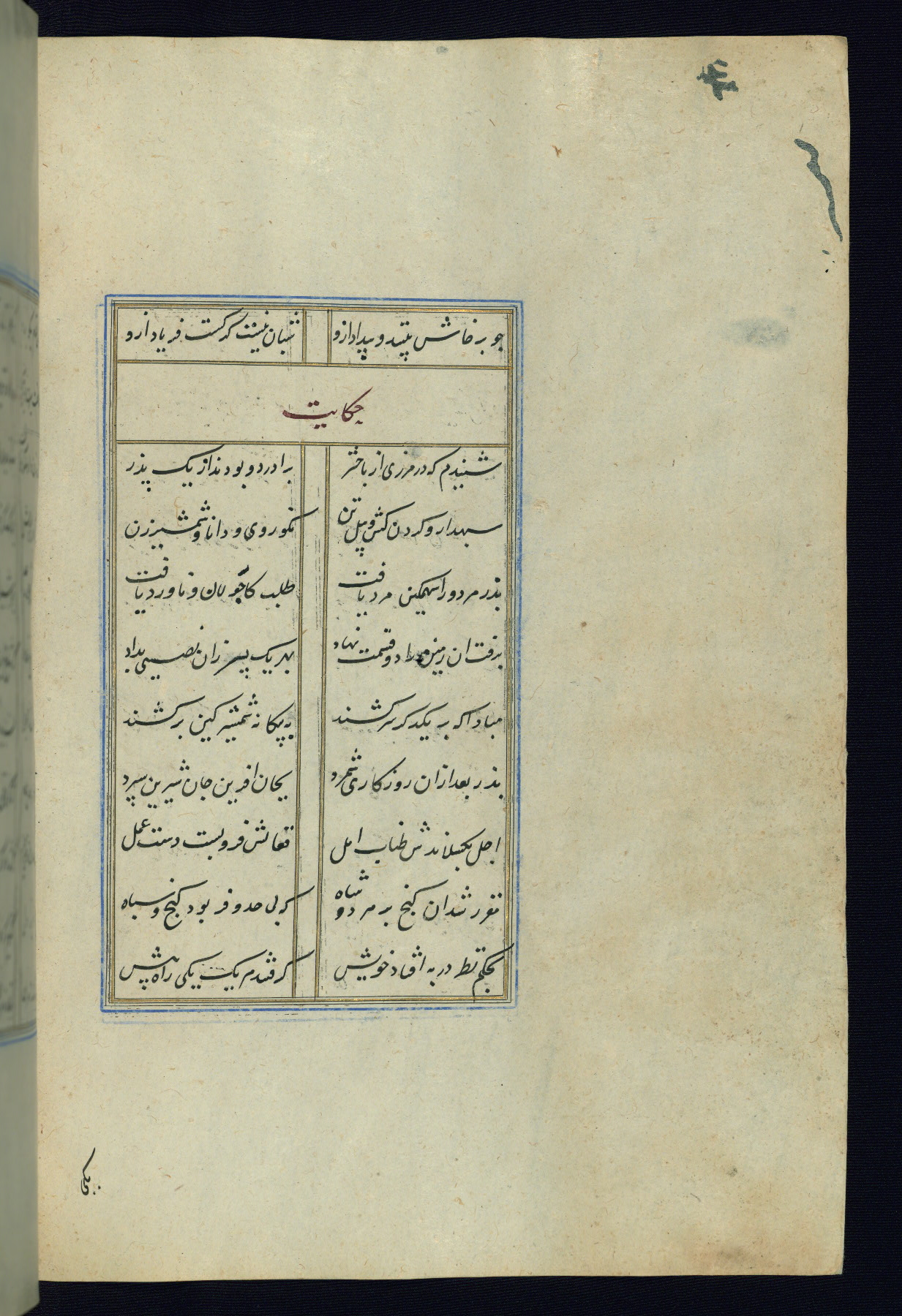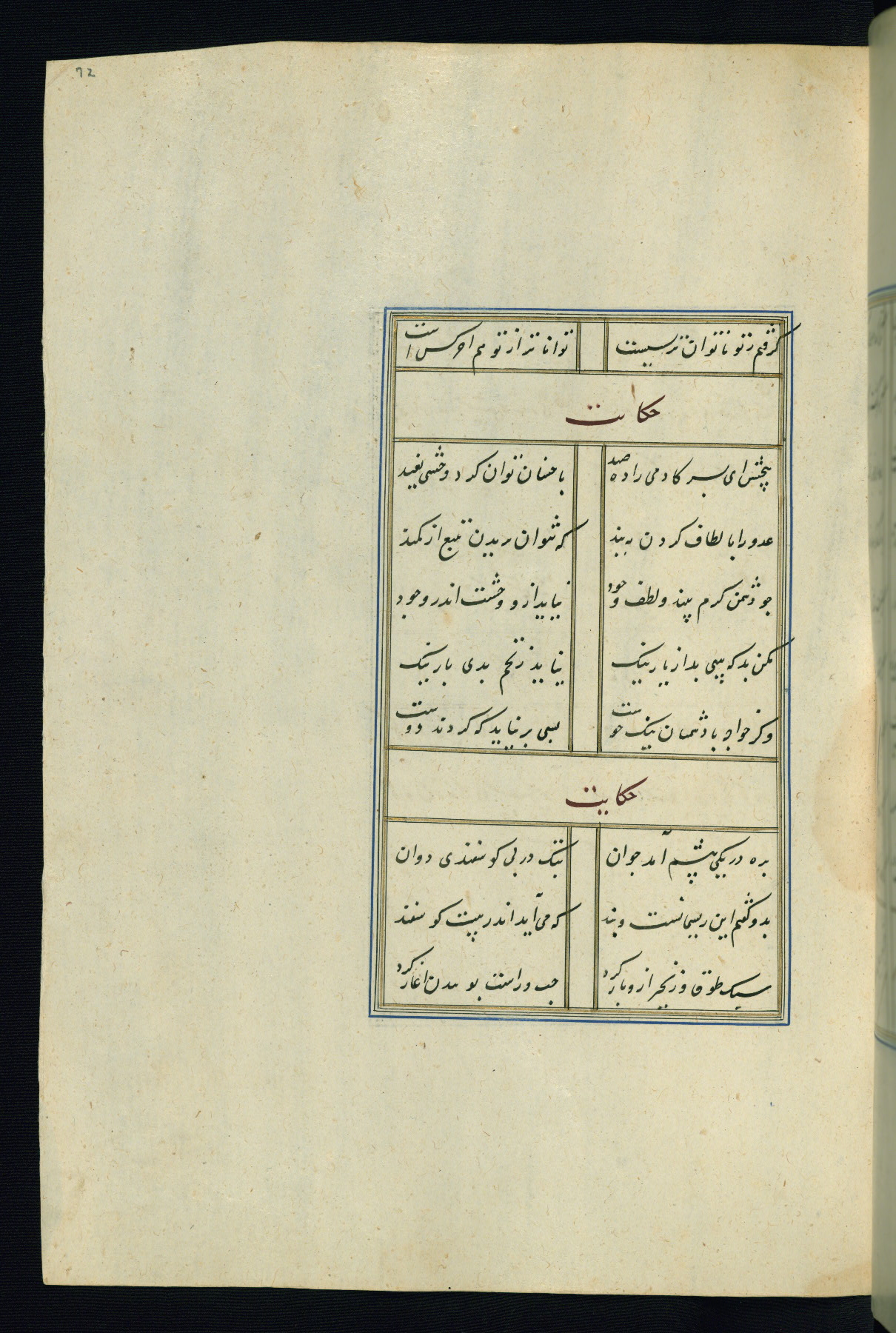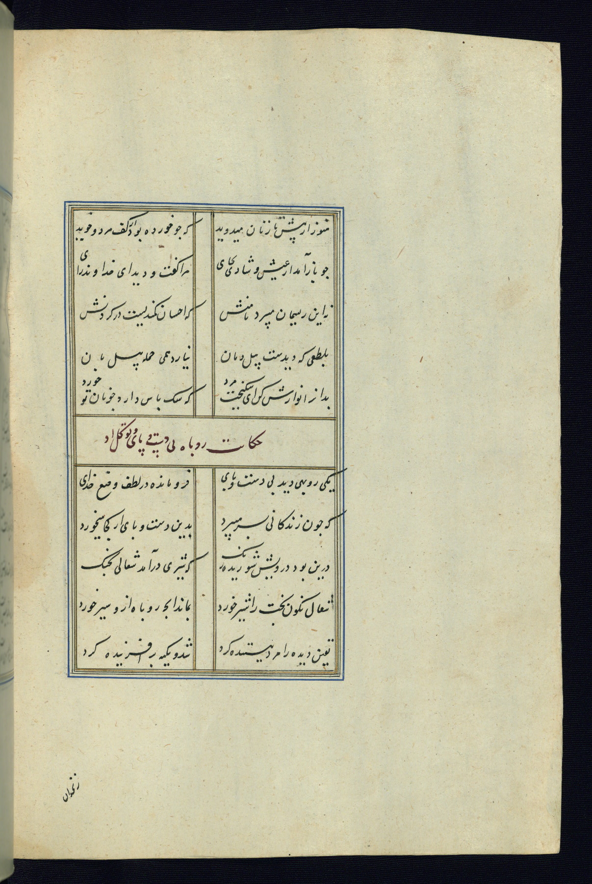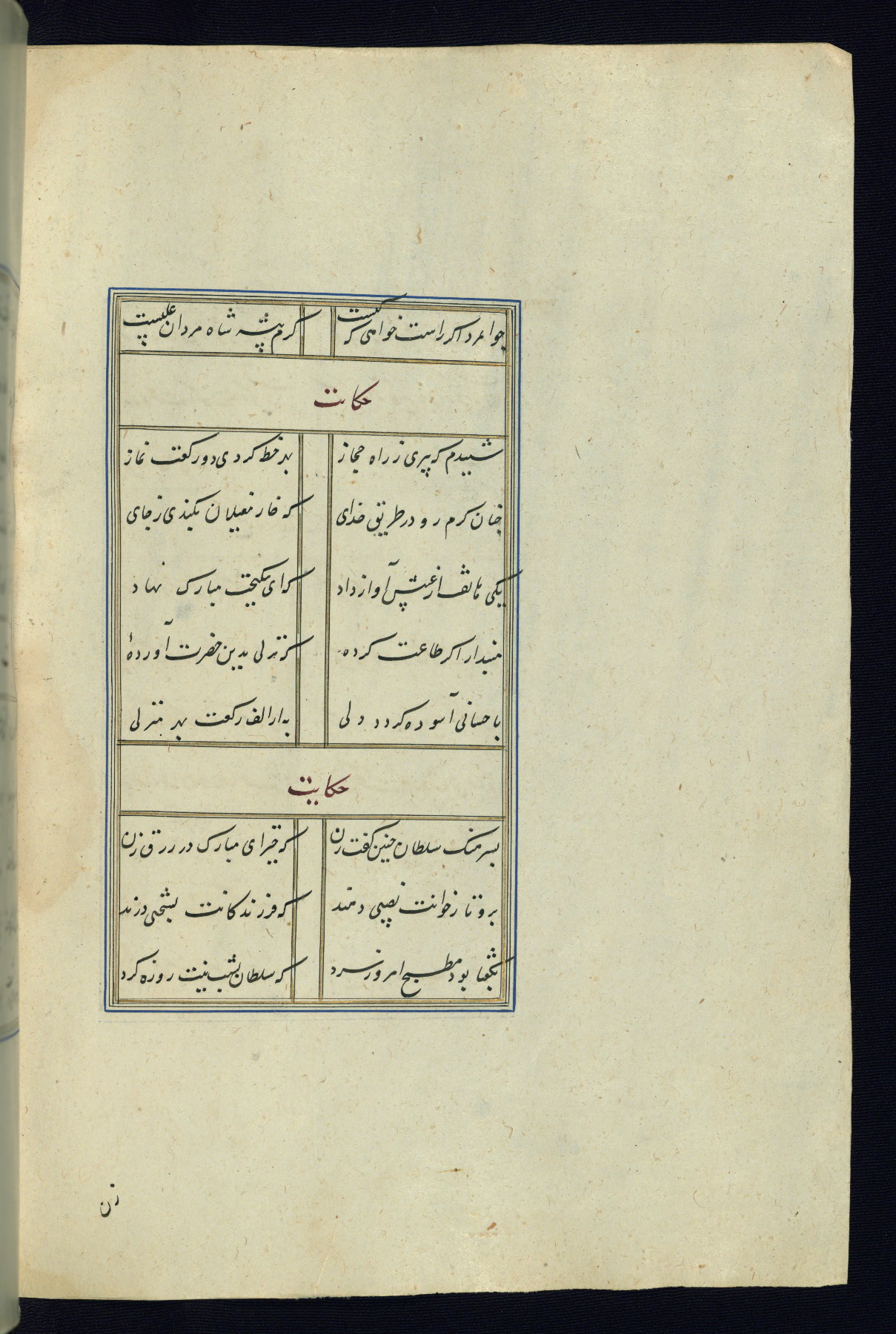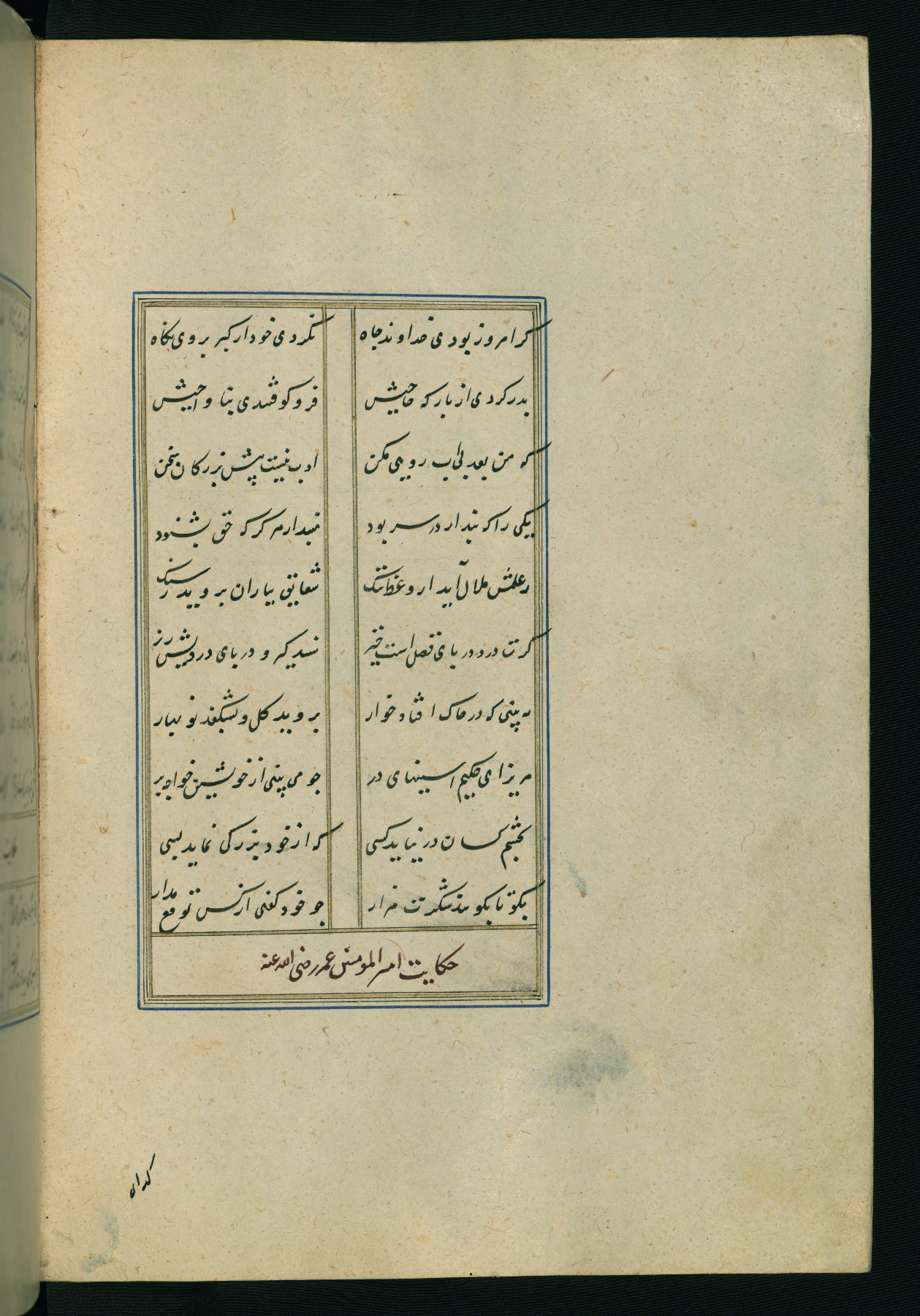 This is an illuminated and illustrated Safavid copy of the Būstān (The garden or The orchard), composed by Sa’dī (d. 691 AH / 1292 CE). It was written in black nasta’līq script in the ninth century AH / sixteenth CE in Iran. The codex opens with a frontispiece with the title Kitāb-i būstān inscribed in an illuminated medallion (fol. 1a), followed by a double-page illustration of a banquet scene in a landscape (fols. 1b-2a). Additionally, there are five paintings illustrating the text (fols. 25a, 55b, 58a, 93b, and 119b). The brown leather, blind-stamped binding decorated with a central oval and pendants is not contemporary with the manuscript.