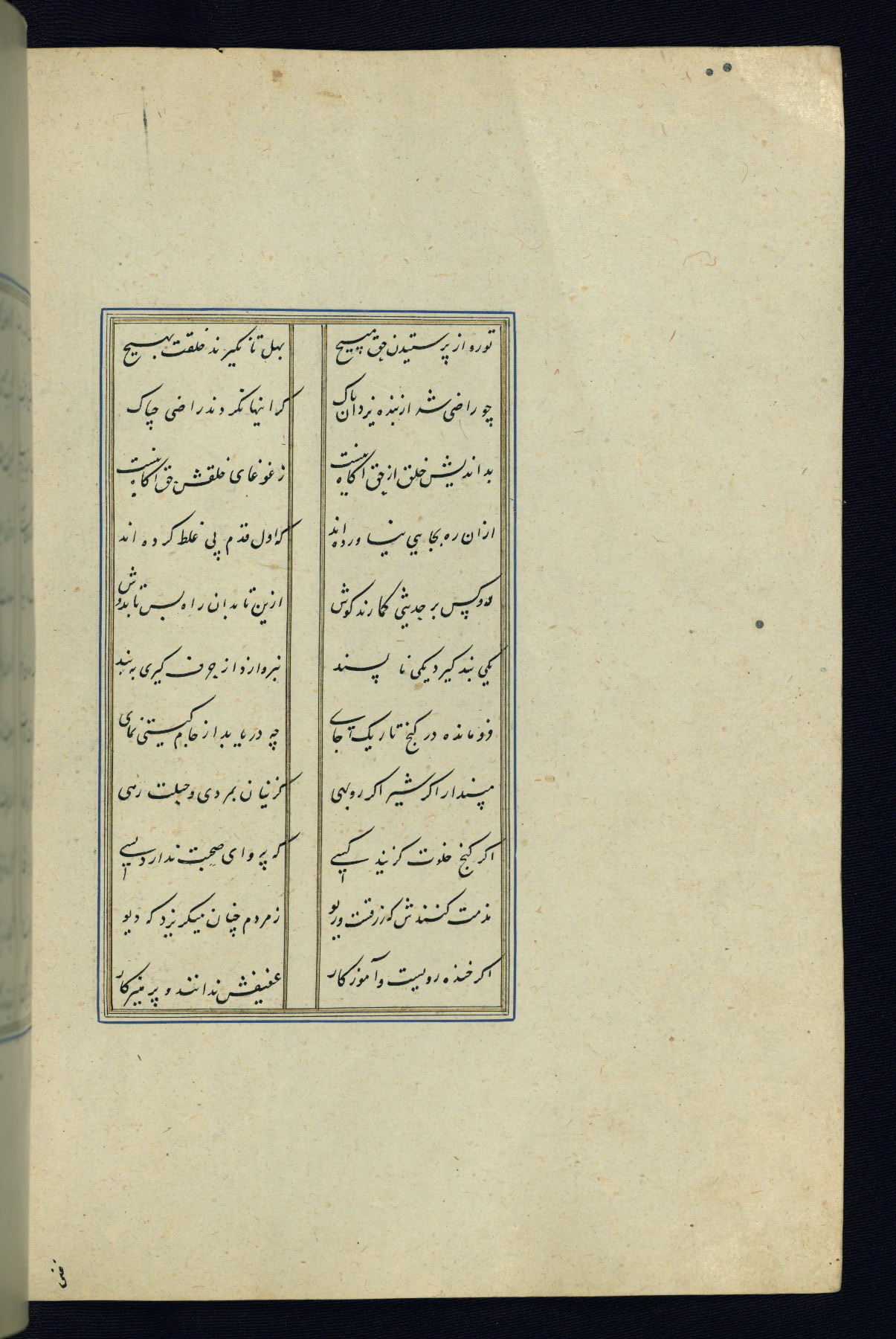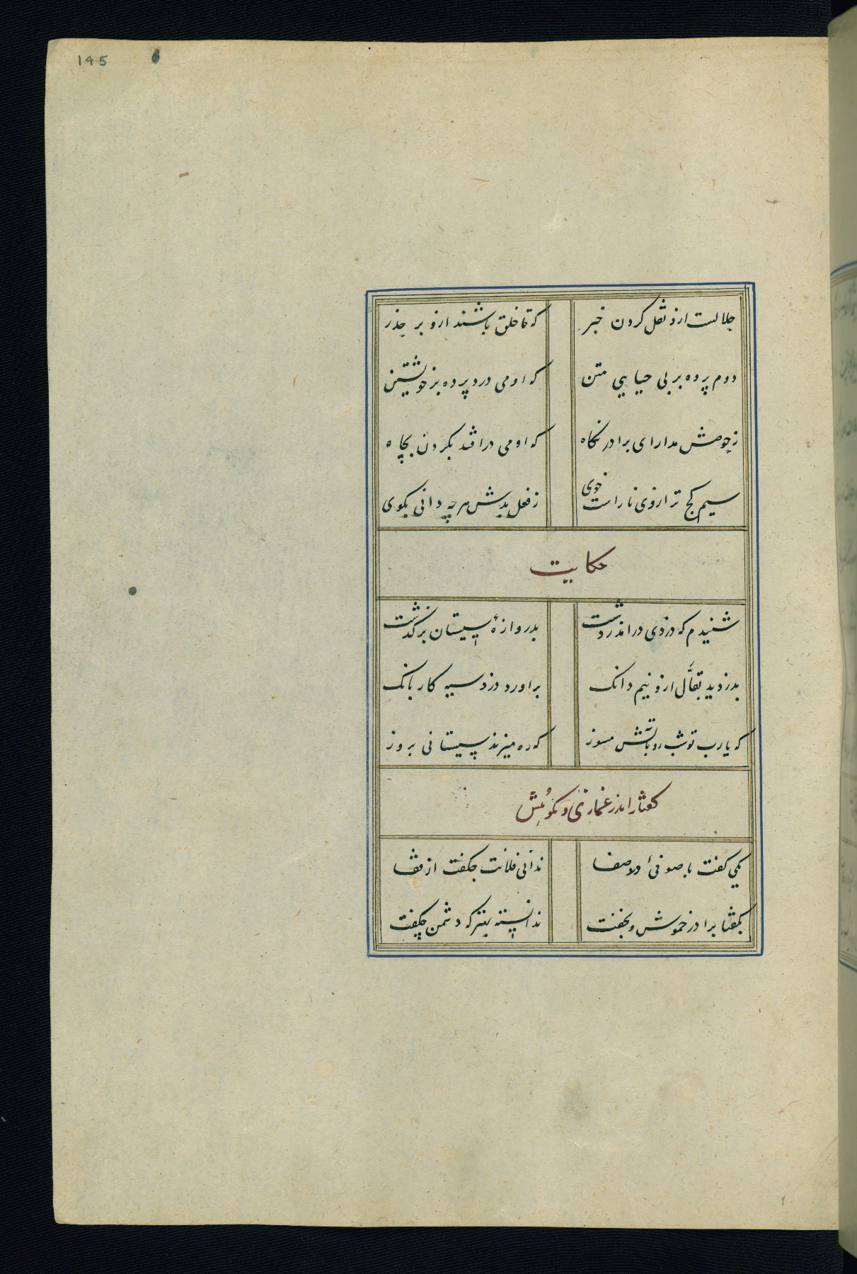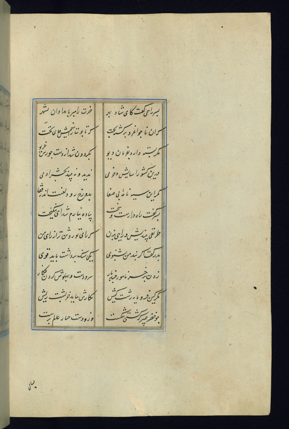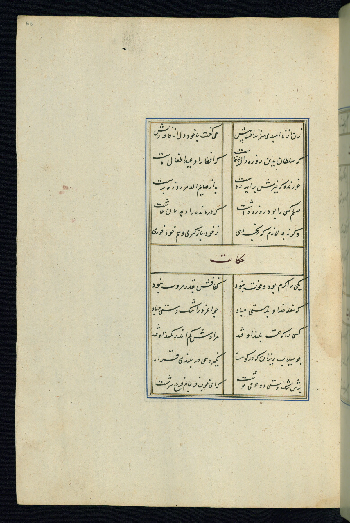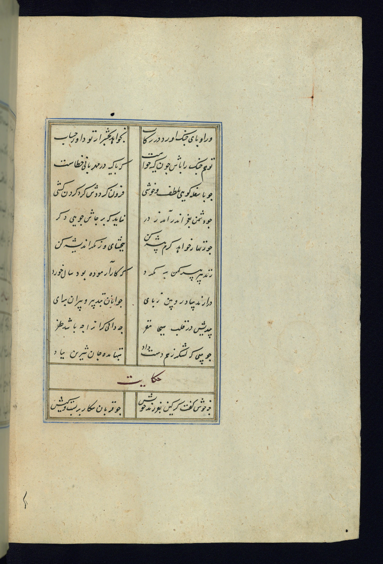This is an illuminated and illustrated Safavid copy of the Būstān (The garden or The orchard), composed by Sa’dī (d. 691 AH / 1292 CE). It was written in black nasta’līq script in the ninth century AH / sixteenth CE in Iran. The codex opens with a frontispiece with the title Kitāb-i būstān inscribed in an illuminated medallion (fol. 1a), followed by a double-page illustration of a banquet scene in a landscape (fols. 1b-2a). Additionally, there are five paintings illustrating the text (fols. 25a, 55b, 58a, 93b, and 119b). The brown leather, blind-stamped binding decorated with a central oval and pendants is not contemporary with the manuscript.