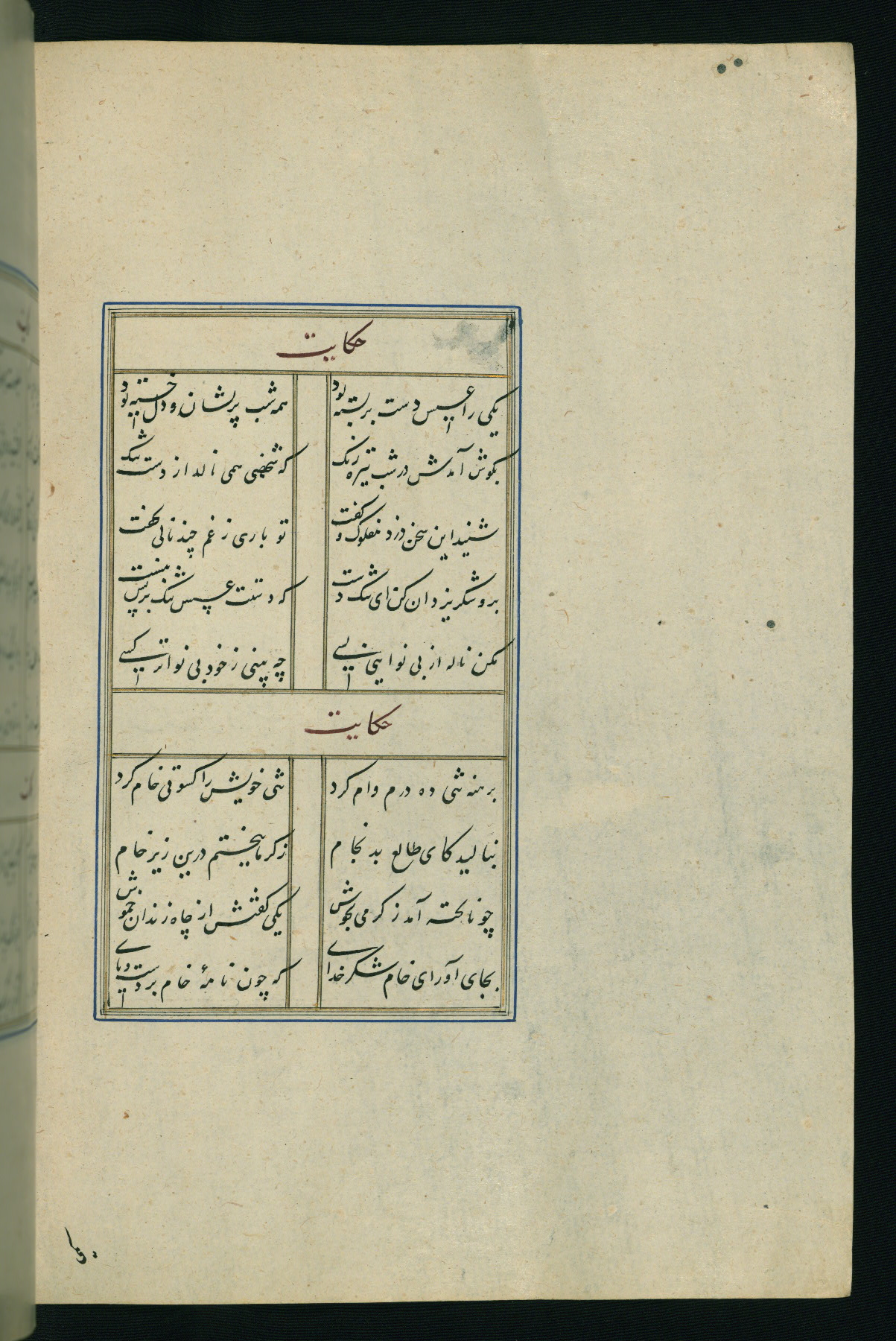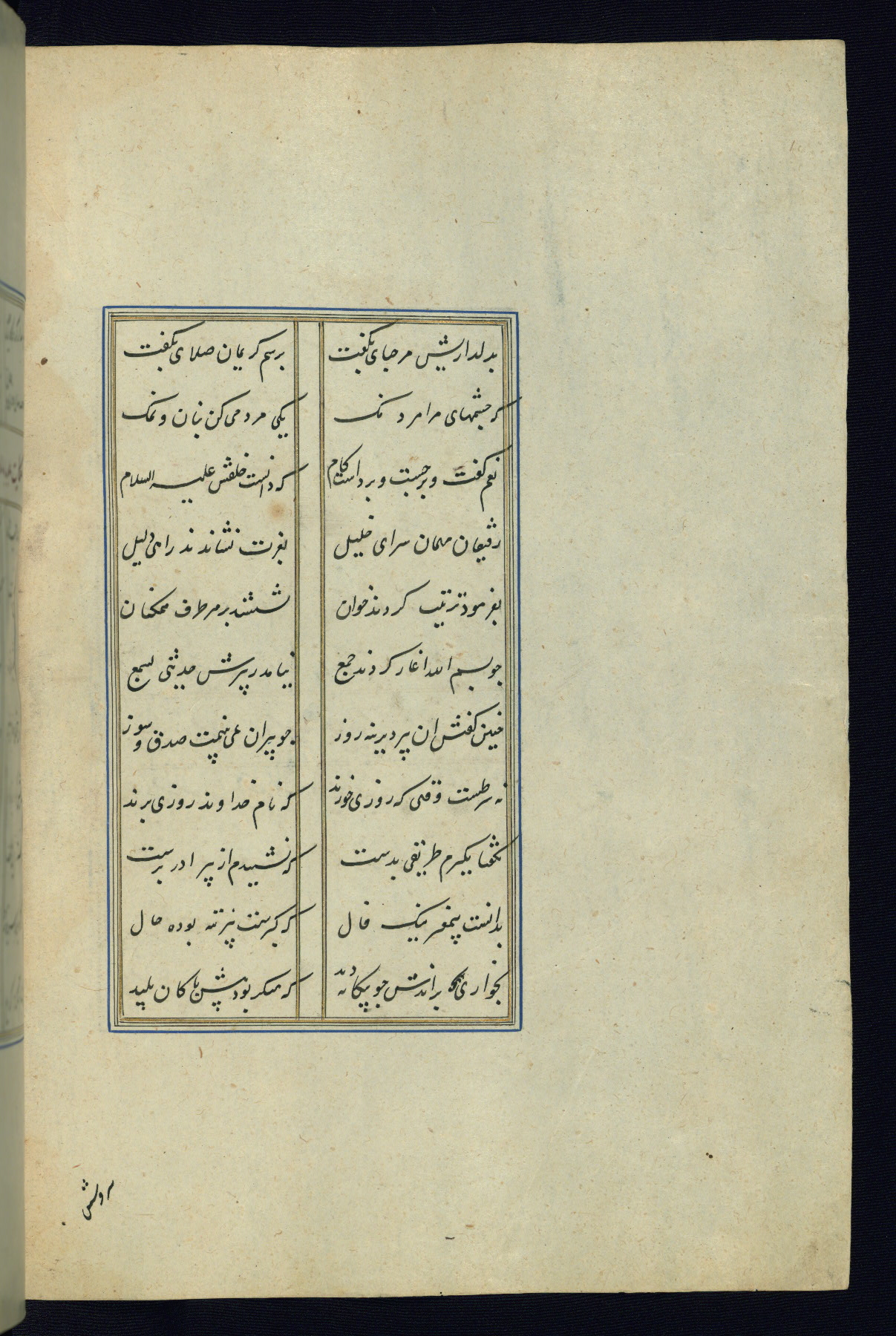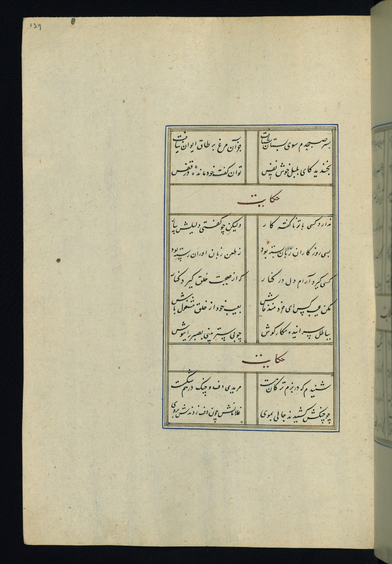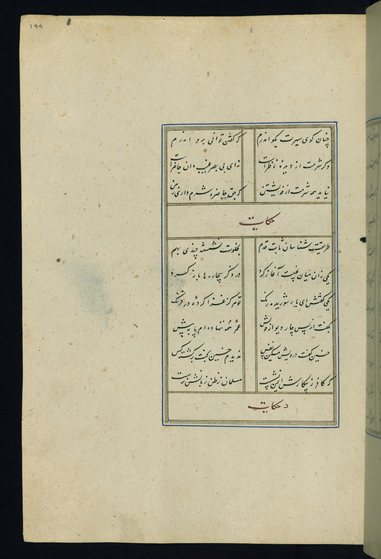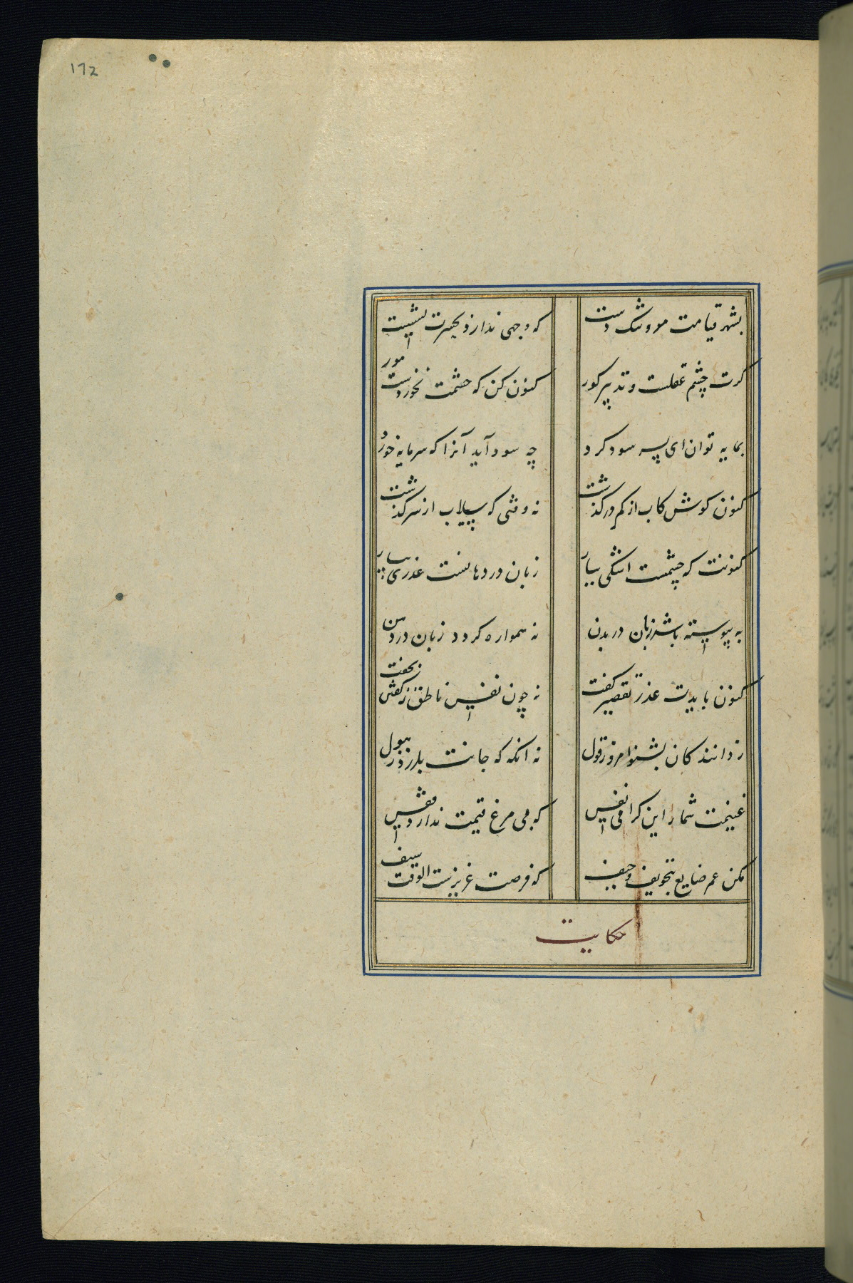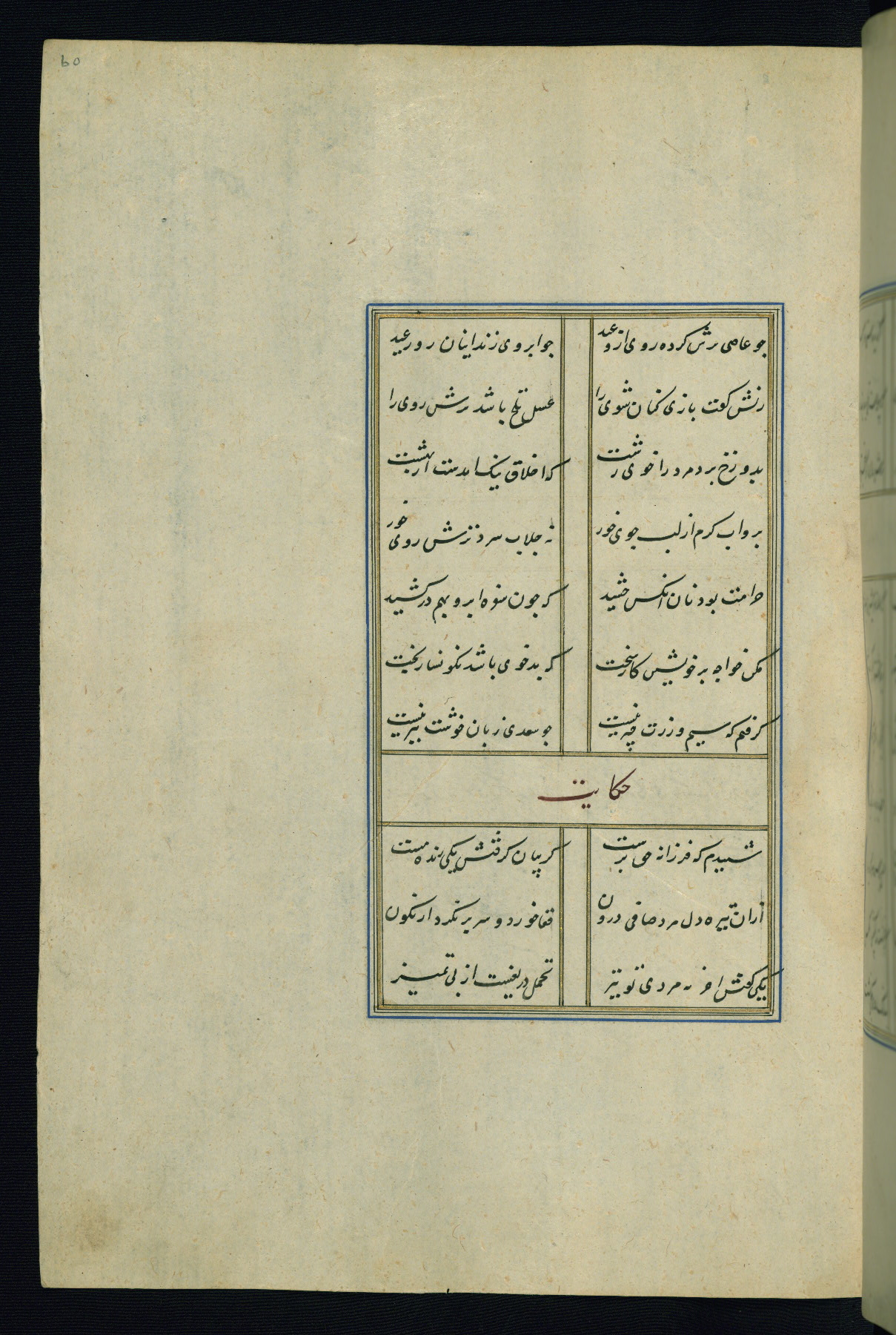 This is an illuminated and illustrated Safavid copy of the Būstān (The garden or The orchard), composed by Sa’dī (d. 691 AH / 1292 CE). It was written in black nasta’līq script in the ninth century AH / sixteenth CE in Iran. The codex opens with a frontispiece with the title Kitāb-i būstān inscribed in an illuminated medallion (fol. 1a), followed by a double-page illustration of a banquet scene in a landscape (fols. 1b-2a). Additionally, there are five paintings illustrating the text (fols. 25a, 55b, 58a, 93b, and 119b). The brown leather, blind-stamped binding decorated with a central oval and pendants is not contemporary with the manuscript.