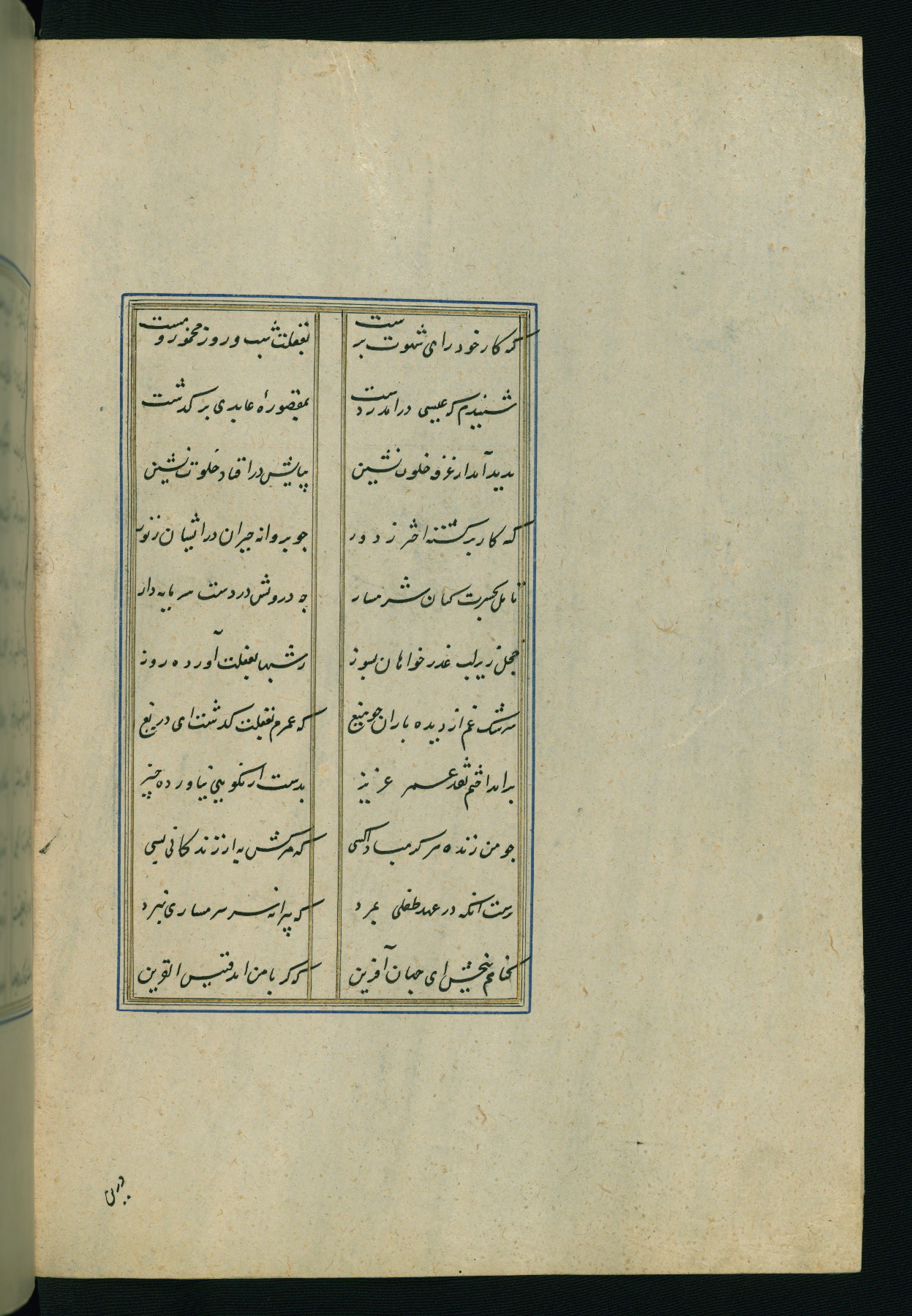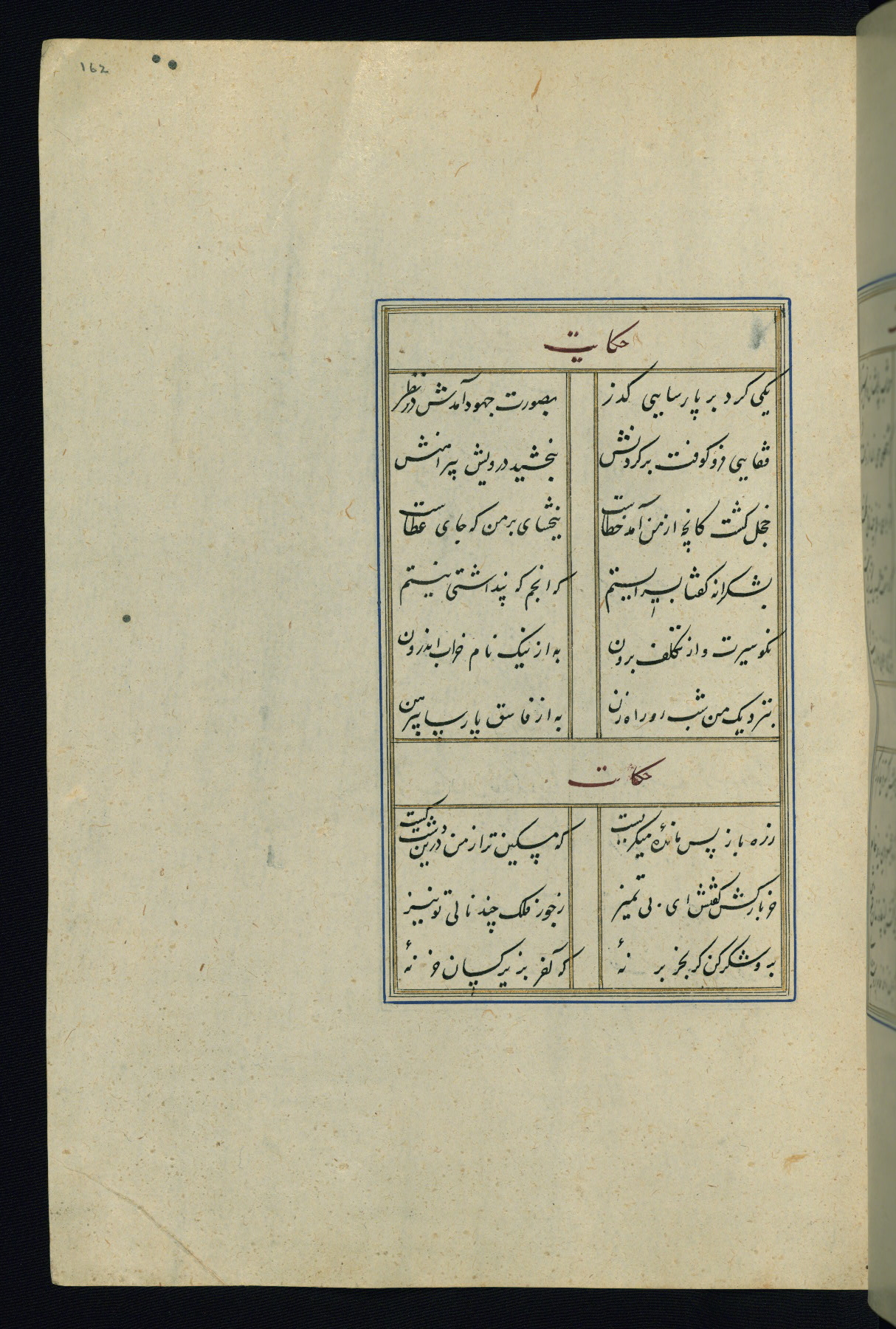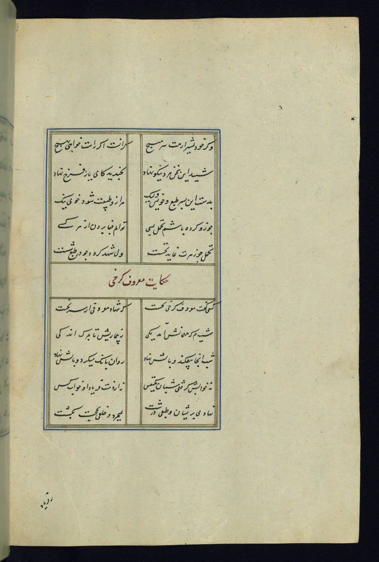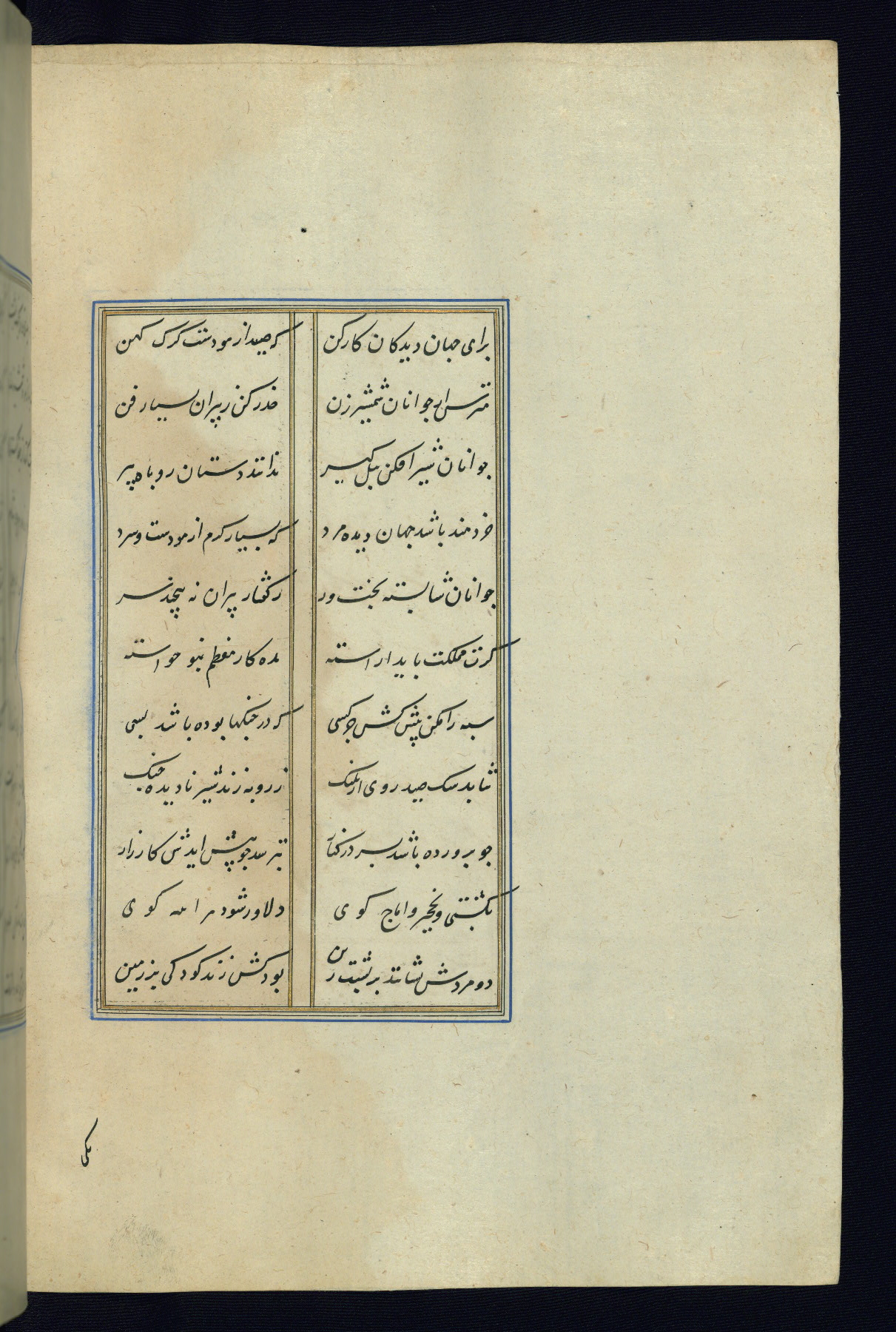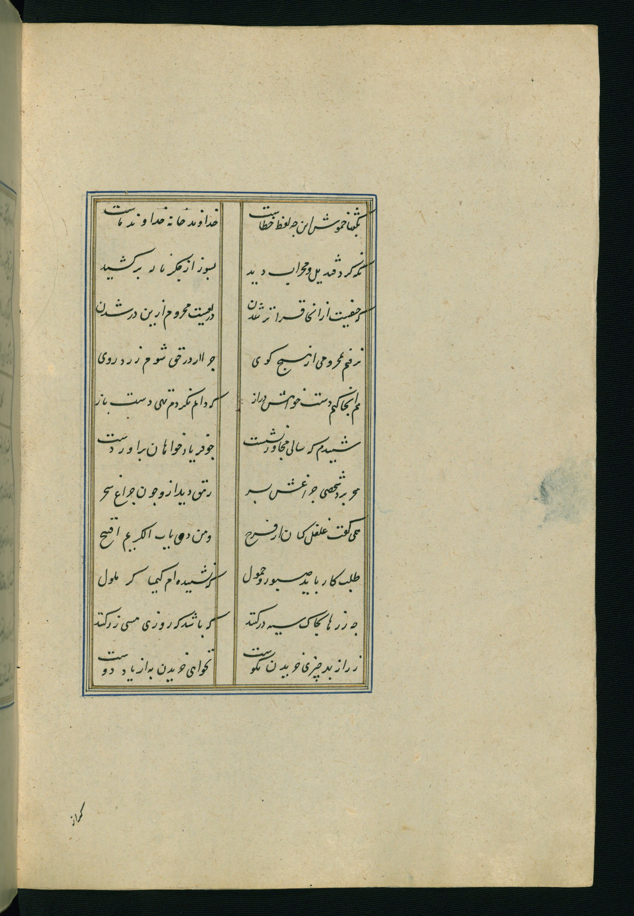 This is an illuminated and illustrated Safavid copy of the Būstān (The garden or The orchard), composed by Sa’dī (d. 691 AH / 1292 CE). It was written in black nasta’līq script in the ninth century AH / sixteenth CE in Iran. The codex opens with a frontispiece with the title Kitāb-i būstān inscribed in an illuminated medallion (fol. 1a), followed by a double-page illustration of a banquet scene in a landscape (fols. 1b-2a). Additionally, there are five paintings illustrating the text (fols. 25a, 55b, 58a, 93b, and 119b). The brown leather, blind-stamped binding decorated with a central oval and pendants is not contemporary with the manuscript.