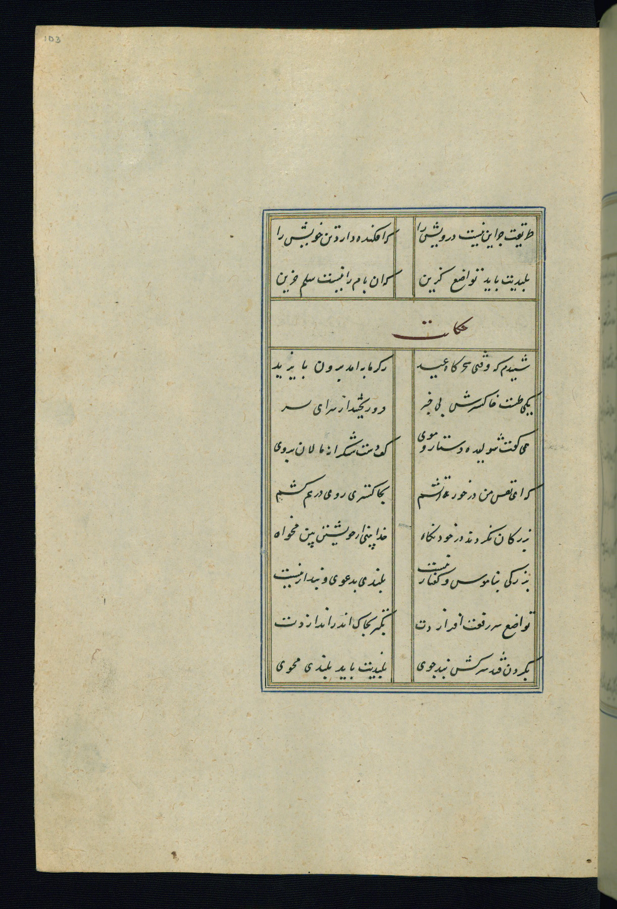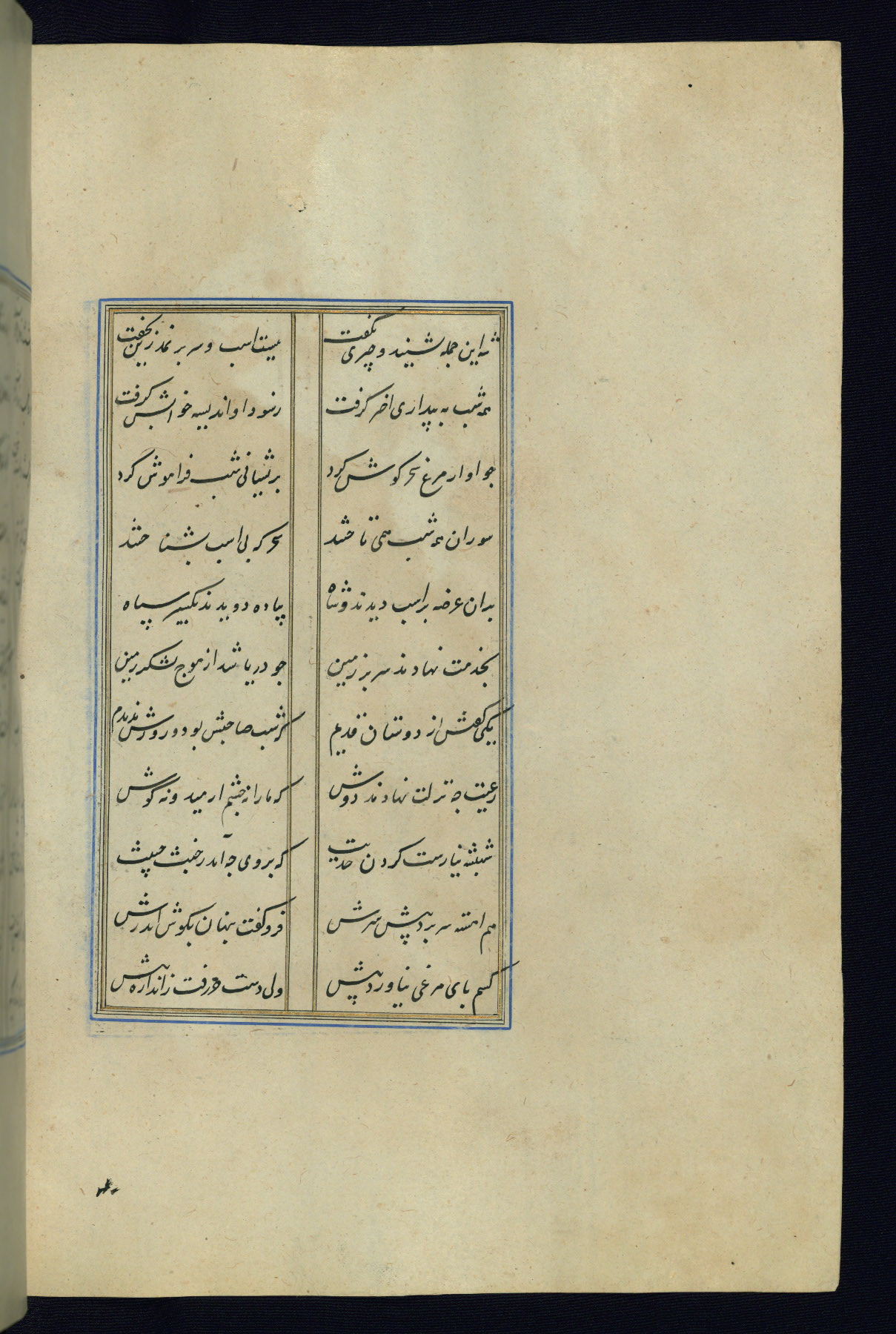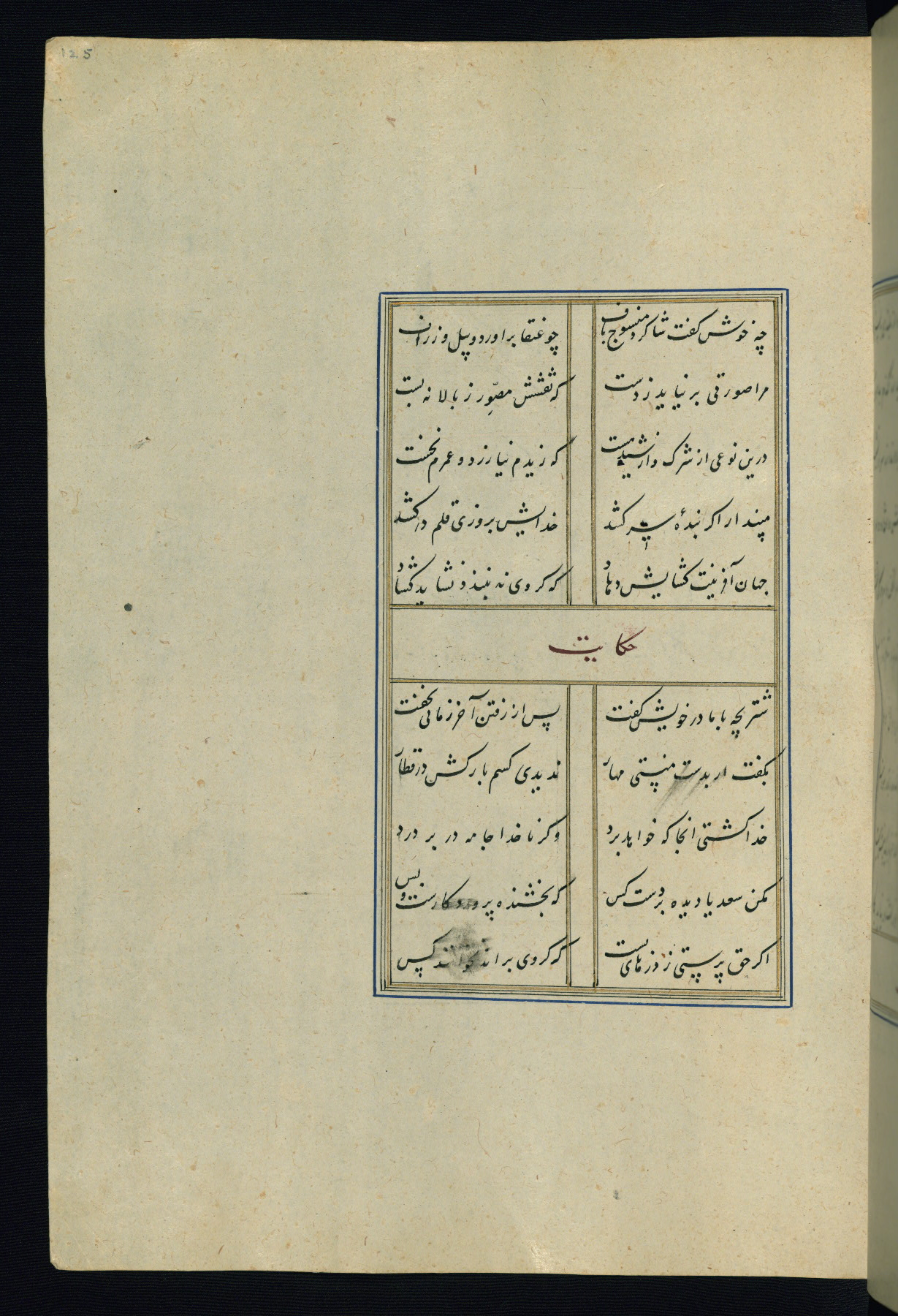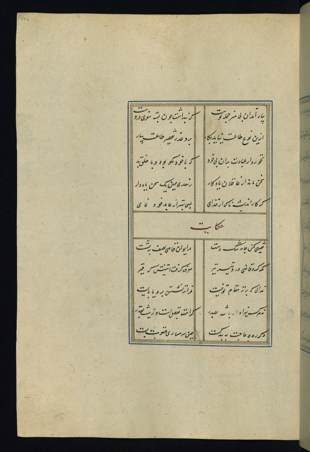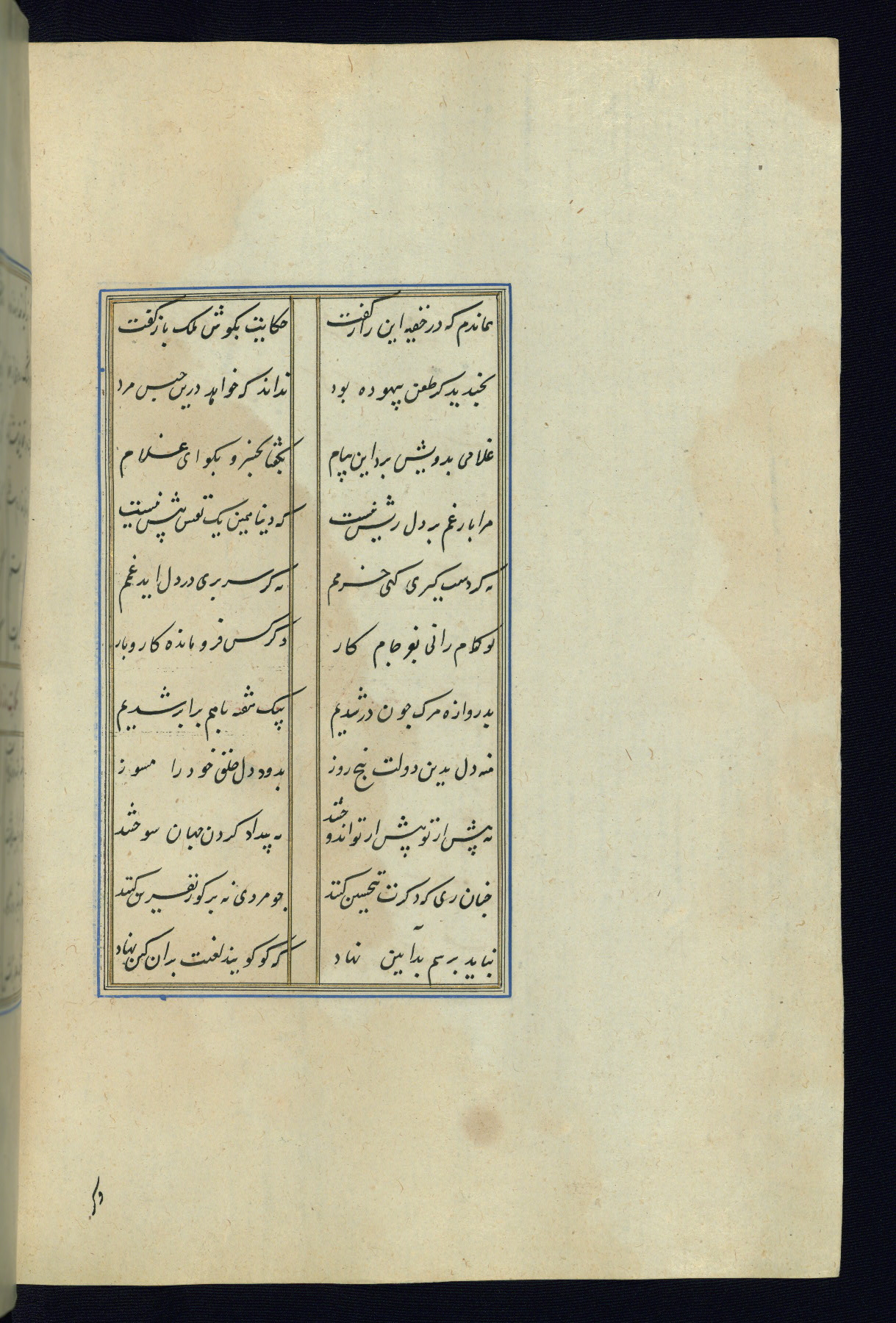 This is an illuminated and illustrated Safavid copy of the Būstān (The garden or The orchard), composed by Sa’dī (d. 691 AH / 1292 CE). It was written in black nasta’līq script in the ninth century AH / sixteenth CE in Iran. The codex opens with a frontispiece with the title Kitāb-i būstān inscribed in an illuminated medallion (fol. 1a), followed by a double-page illustration of a banquet scene in a landscape (fols. 1b-2a). Additionally, there are five paintings illustrating the text (fols. 25a, 55b, 58a, 93b, and 119b). The brown leather, blind-stamped binding decorated with a central oval and pendants is not contemporary with the manuscript.