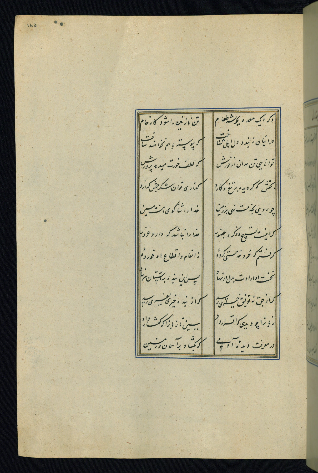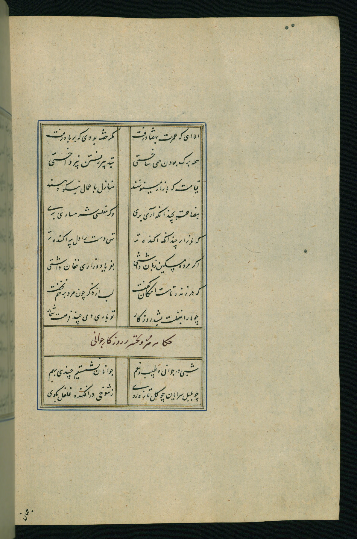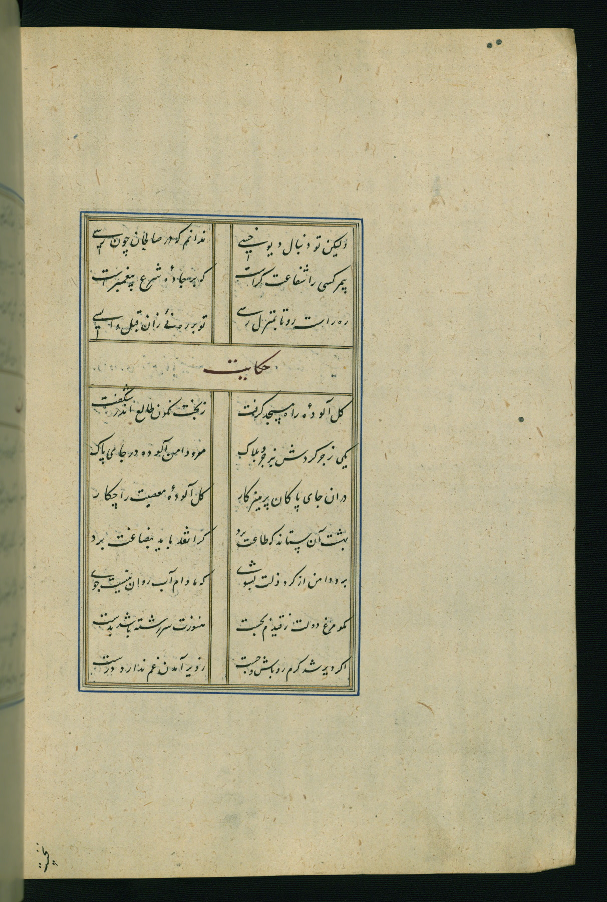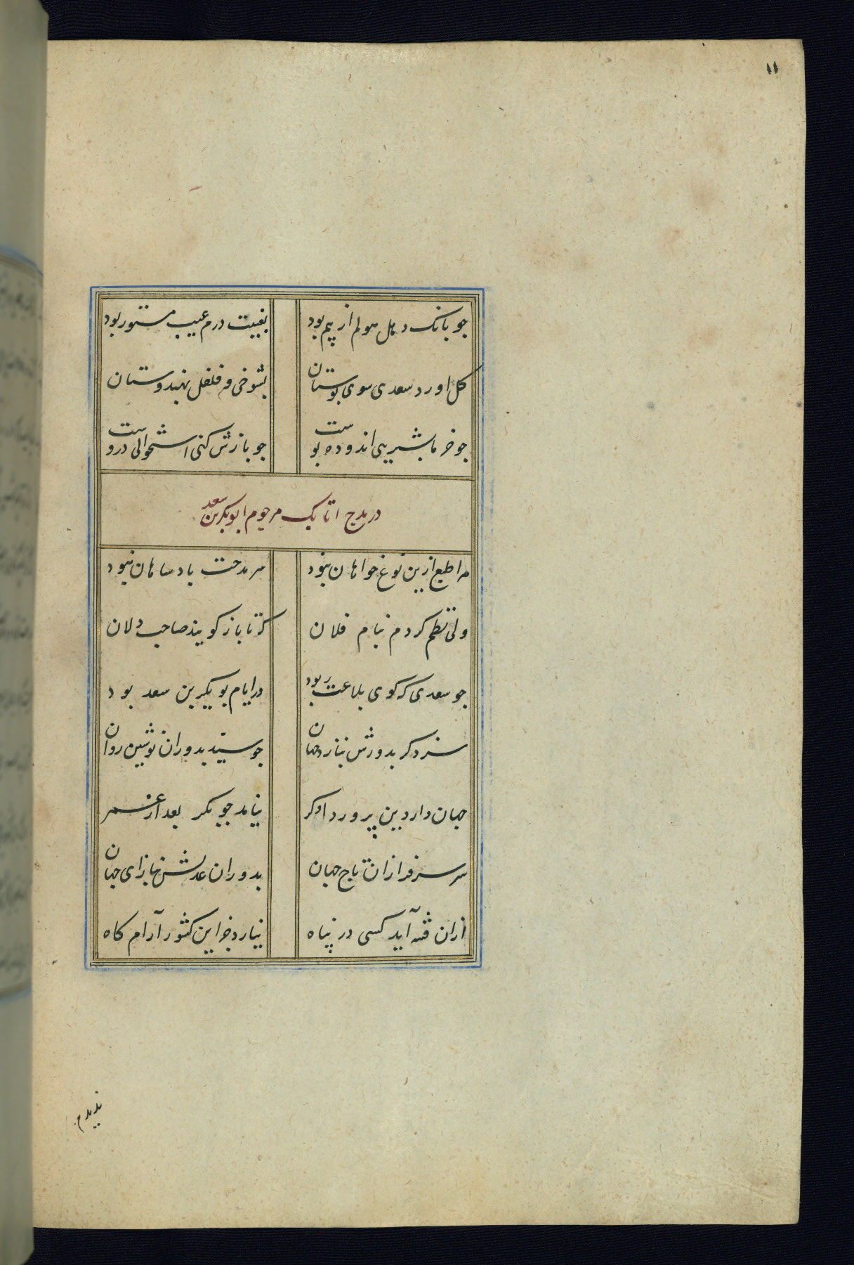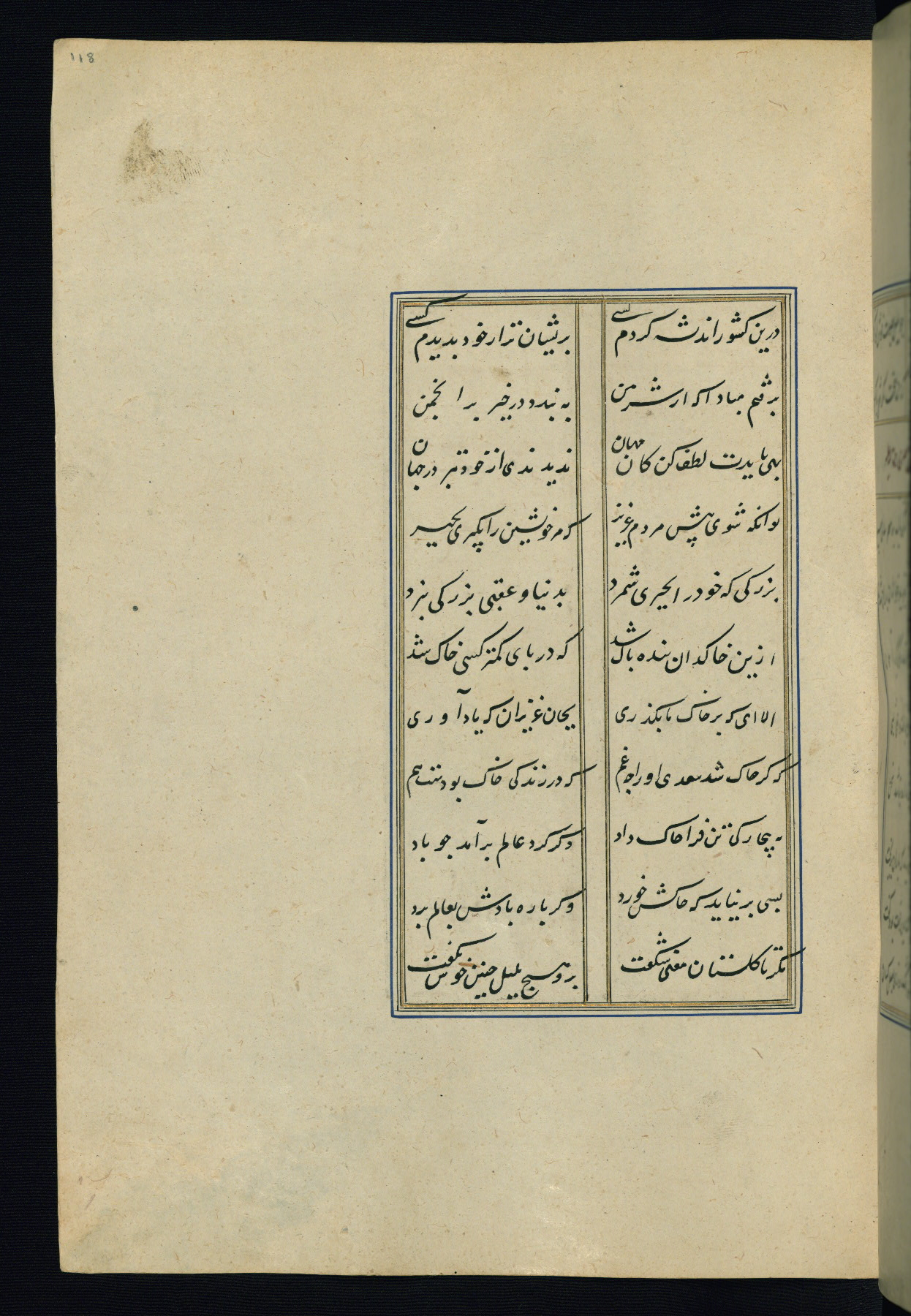 This is an illuminated and illustrated Safavid copy of the Būstān (The garden or The orchard), composed by Sa’dī (d. 691 AH / 1292 CE). It was written in black nasta’līq script in the ninth century AH / sixteenth CE in Iran. The codex opens with a frontispiece with the title Kitāb-i būstān inscribed in an illuminated medallion (fol. 1a), followed by a double-page illustration of a banquet scene in a landscape (fols. 1b-2a). Additionally, there are five paintings illustrating the text (fols. 25a, 55b, 58a, 93b, and 119b). The brown leather, blind-stamped binding decorated with a central oval and pendants is not contemporary with the manuscript.