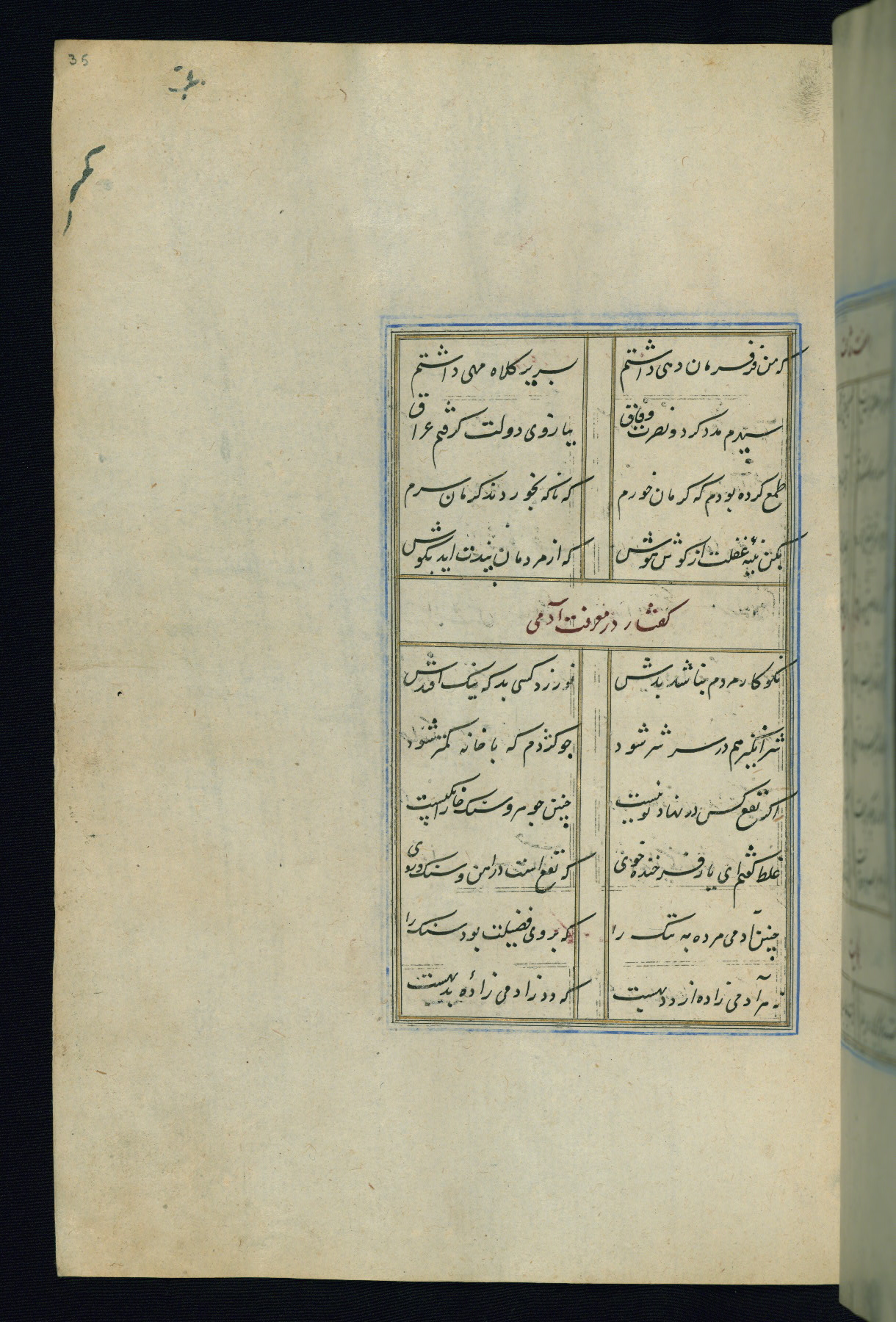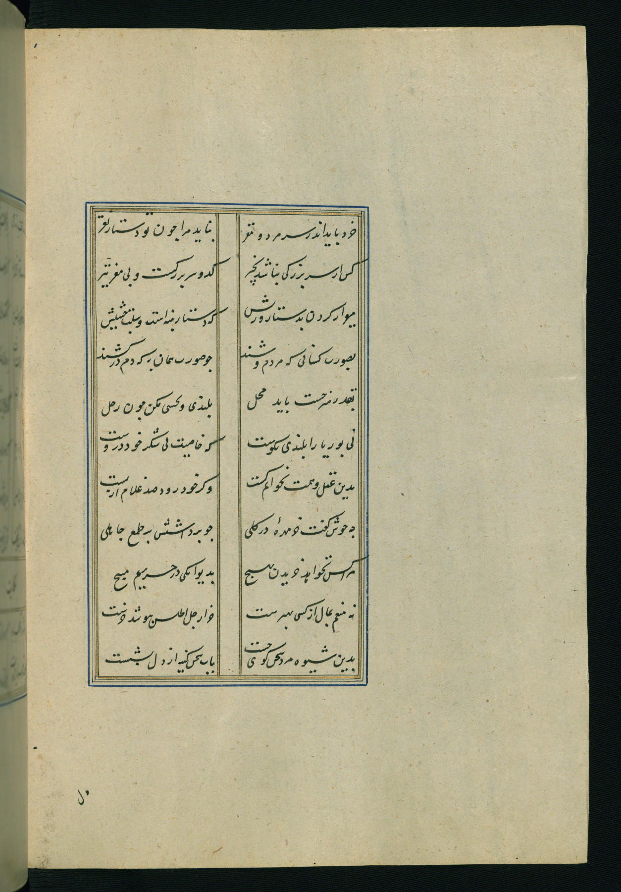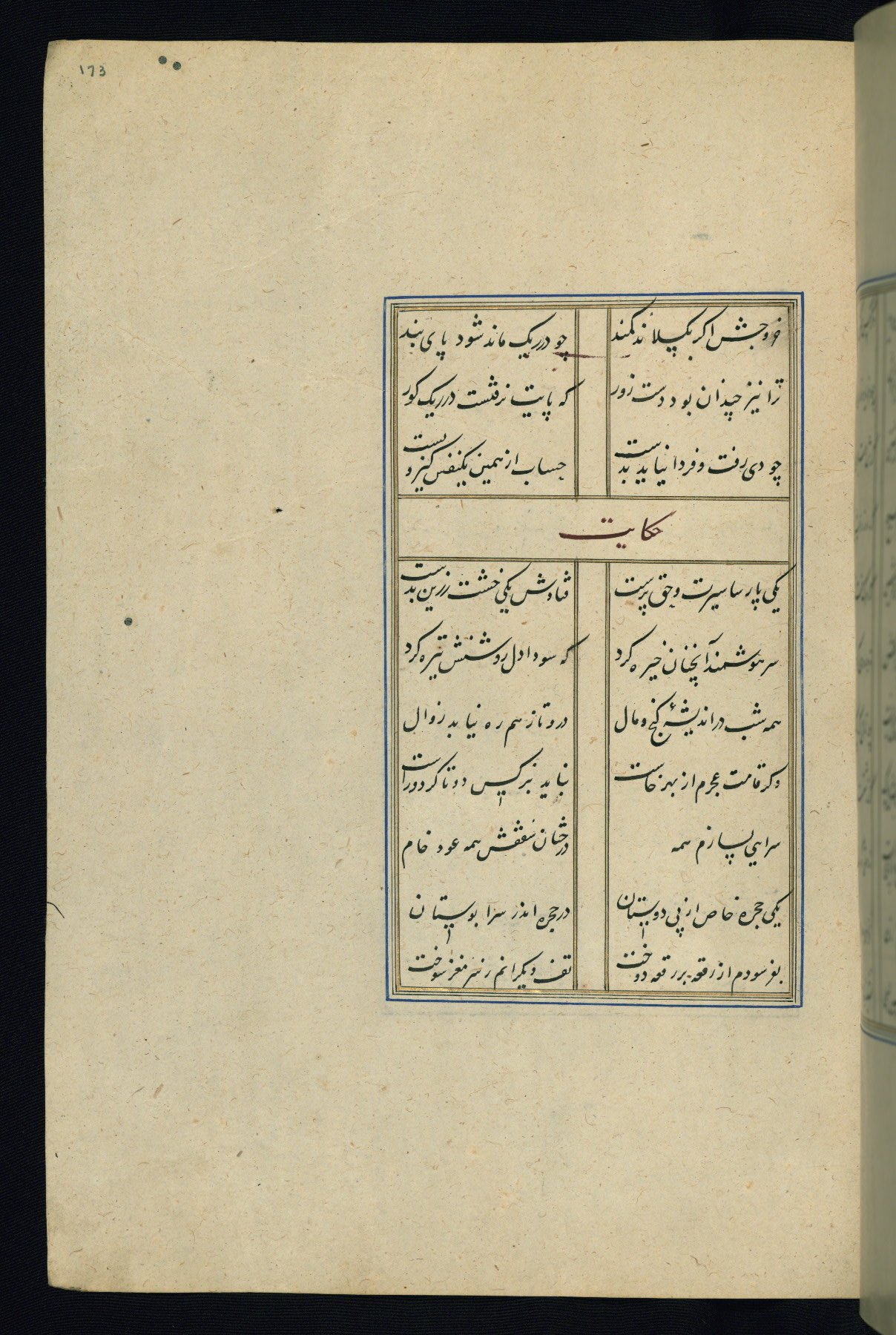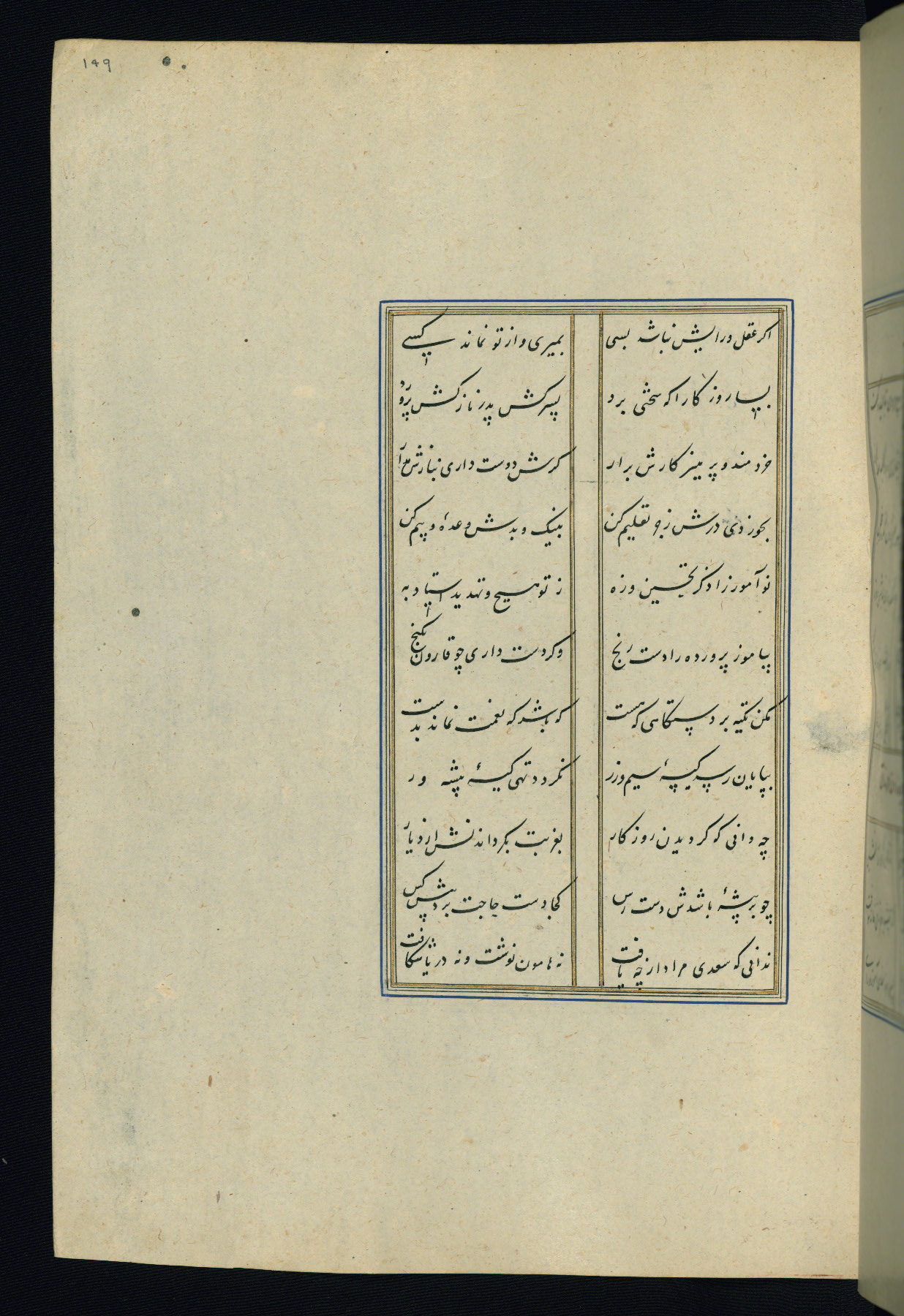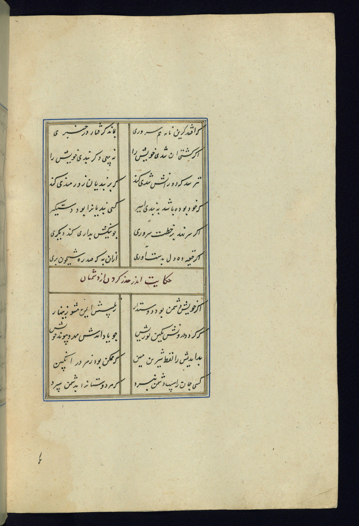 This is an illuminated and illustrated Safavid copy of the Būstān (The garden or The orchard), composed by Sa’dī (d. 691 AH / 1292 CE). It was written in black nasta’līq script in the ninth century AH / sixteenth CE in Iran. The codex opens with a frontispiece with the title Kitāb-i būstān inscribed in an illuminated medallion (fol. 1a), followed by a double-page illustration of a banquet scene in a landscape (fols. 1b-2a). Additionally, there are five paintings illustrating the text (fols. 25a, 55b, 58a, 93b, and 119b). The brown leather, blind-stamped binding decorated with a central oval and pendants is not contemporary with the manuscript.