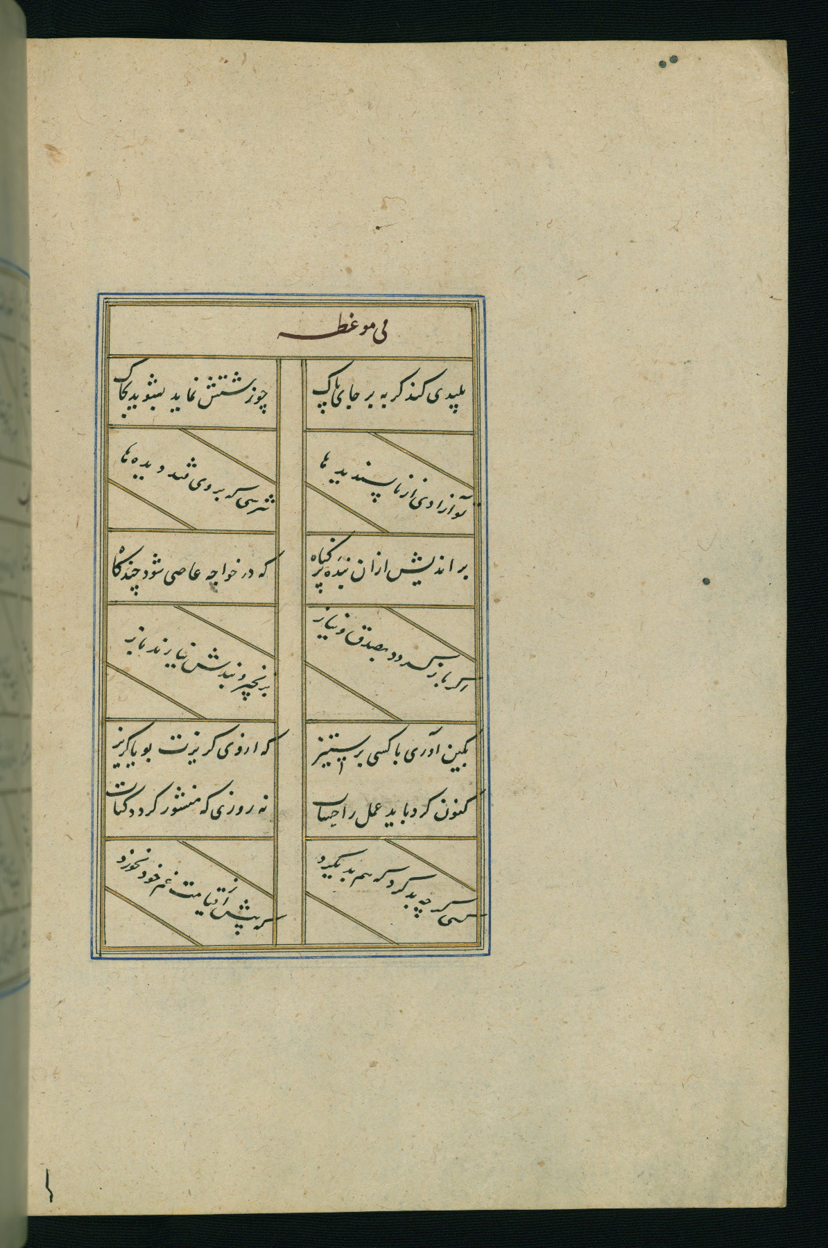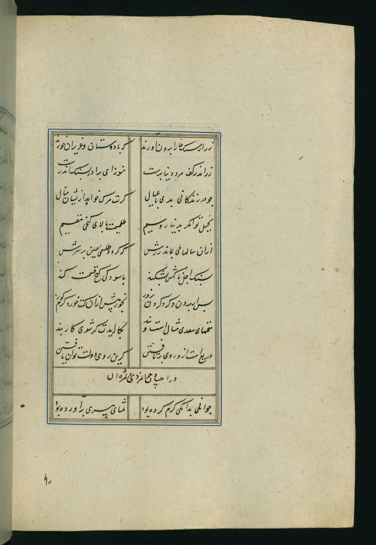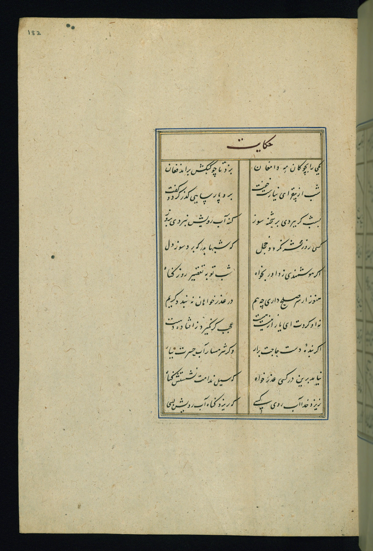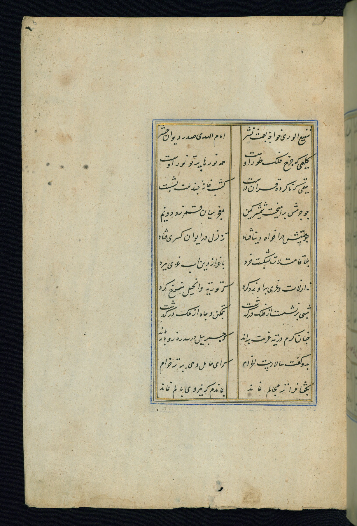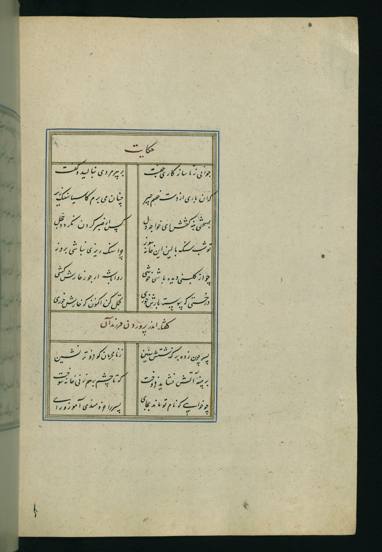 This is an illuminated and illustrated Safavid copy of the Būstān (The garden or The orchard), composed by Sa’dī (d. 691 AH / 1292 CE). It was written in black nasta’līq script in the ninth century AH / sixteenth CE in Iran. The codex opens with a frontispiece with the title Kitāb-i būstān inscribed in an illuminated medallion (fol. 1a), followed by a double-page illustration of a banquet scene in a landscape (fols. 1b-2a). Additionally, there are five paintings illustrating the text (fols. 25a, 55b, 58a, 93b, and 119b). The brown leather, blind-stamped binding decorated with a central oval and pendants is not contemporary with the manuscript.