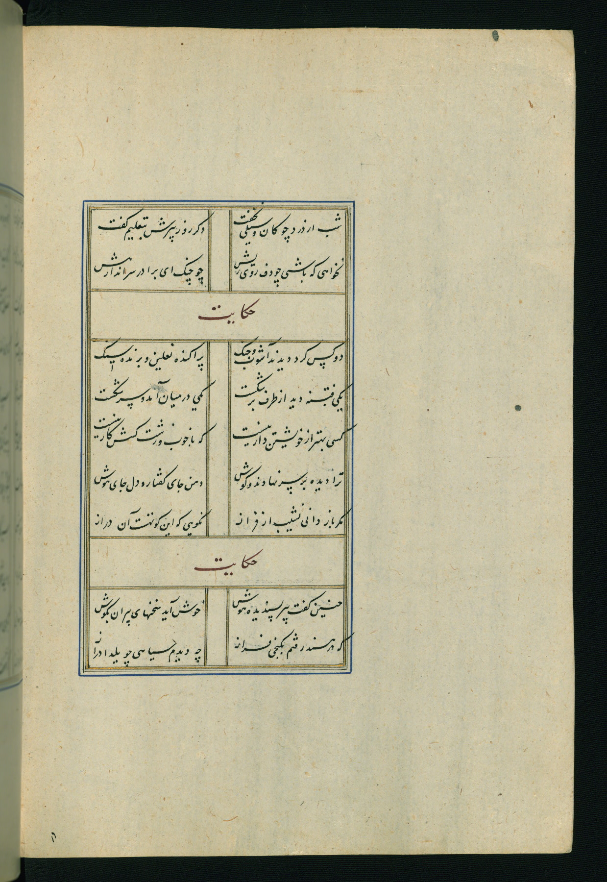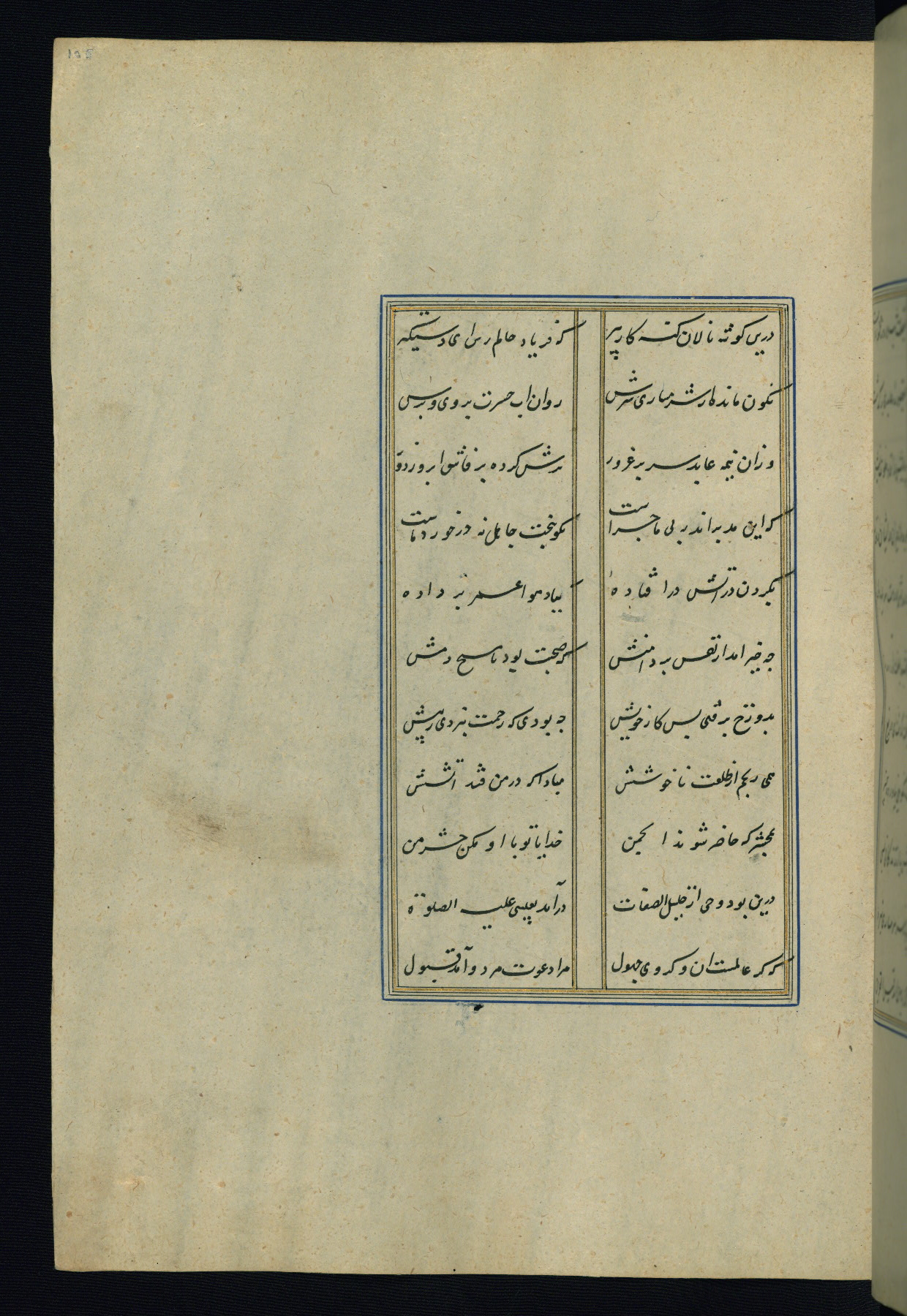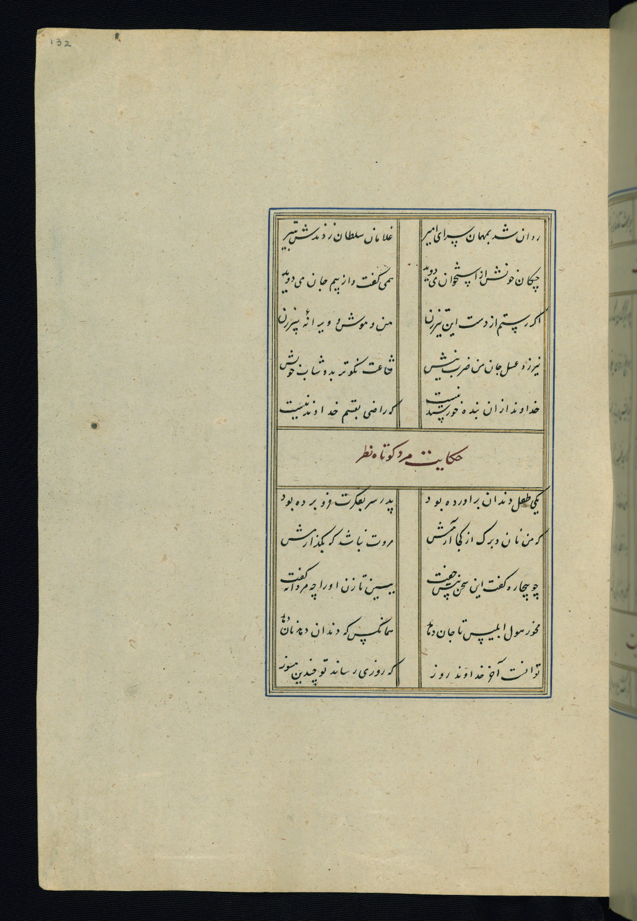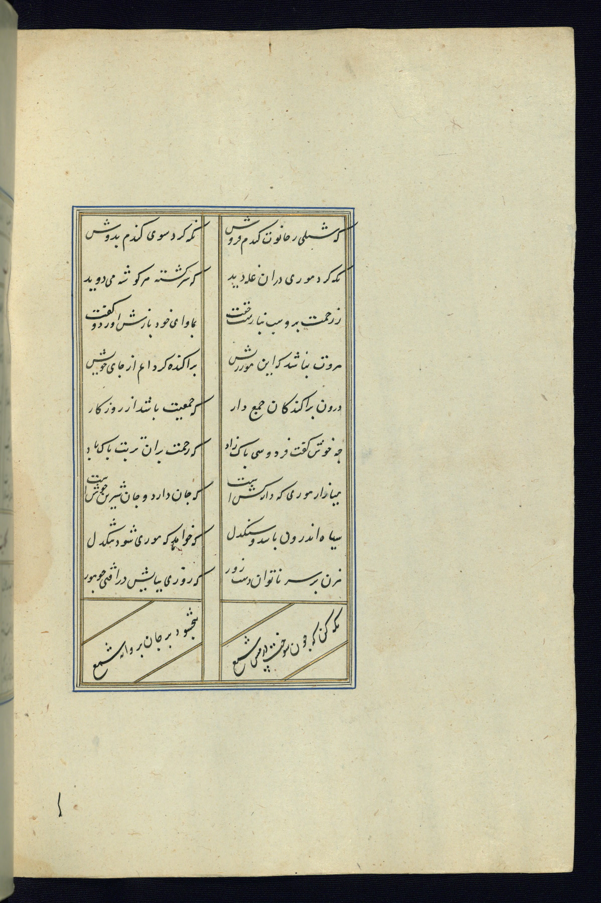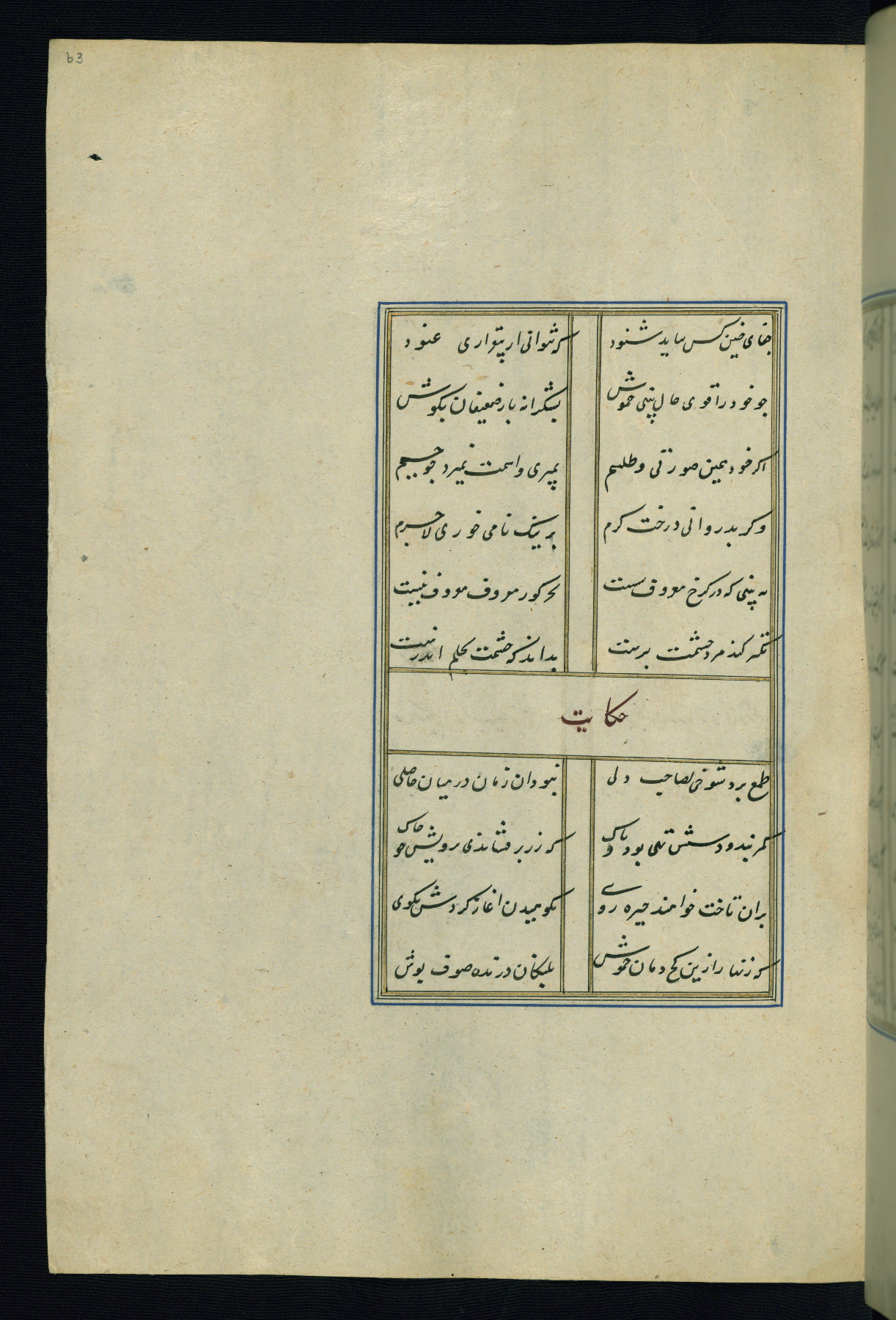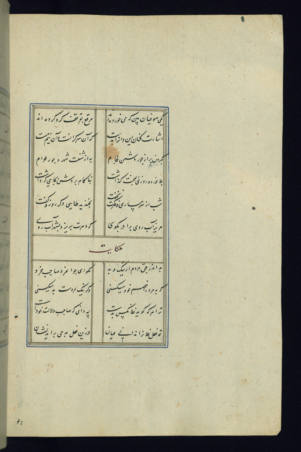 This is an illuminated and illustrated Safavid copy of the Būstān (The garden or The orchard), composed by Sa’dī (d. 691 AH / 1292 CE). It was written in black nasta’līq script in the ninth century AH / sixteenth CE in Iran. The codex opens with a frontispiece with the title Kitāb-i būstān inscribed in an illuminated medallion (fol. 1a), followed by a double-page illustration of a banquet scene in a landscape (fols. 1b-2a). Additionally, there are five paintings illustrating the text (fols. 25a, 55b, 58a, 93b, and 119b). The brown leather, blind-stamped binding decorated with a central oval and pendants is not contemporary with the manuscript.