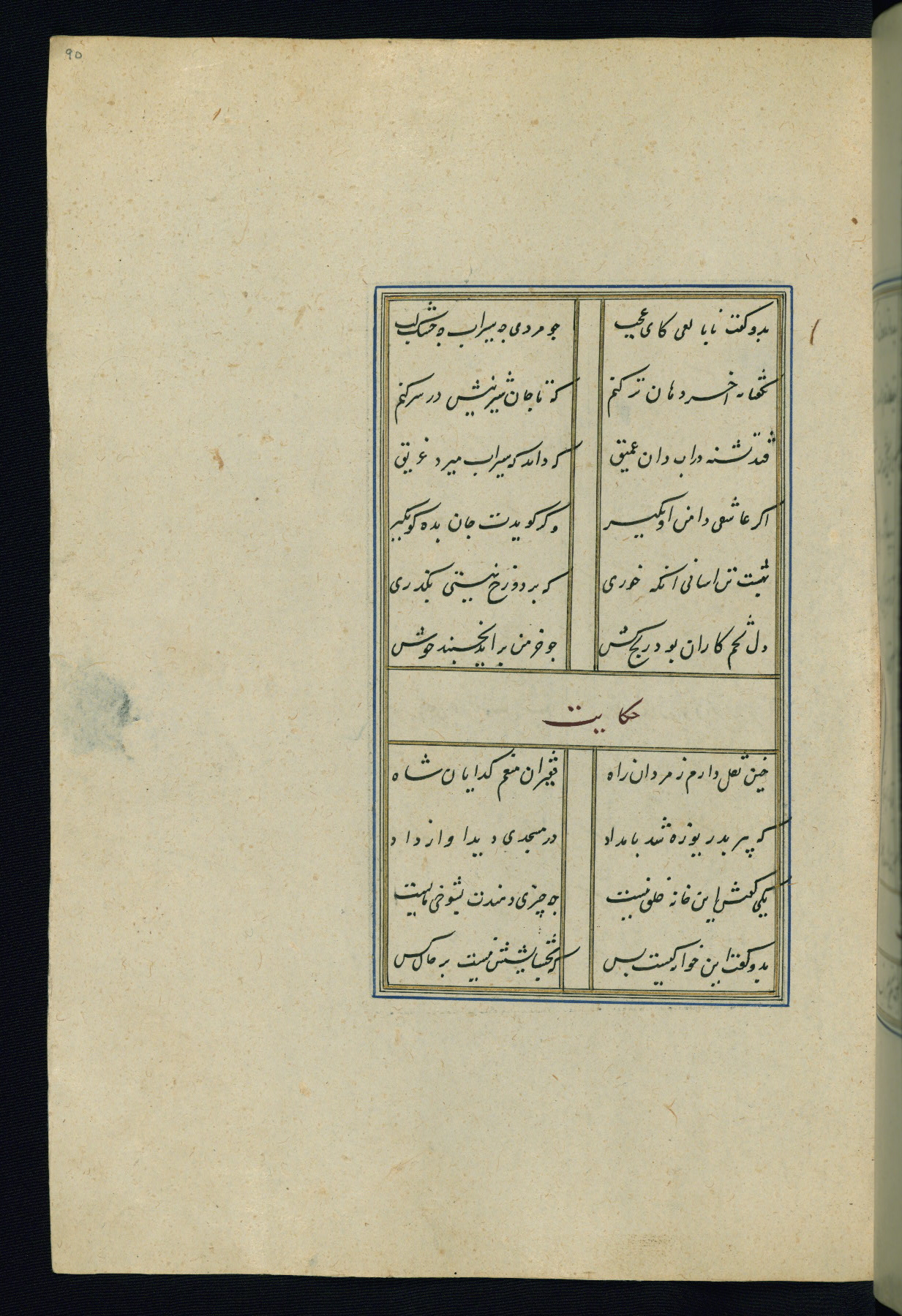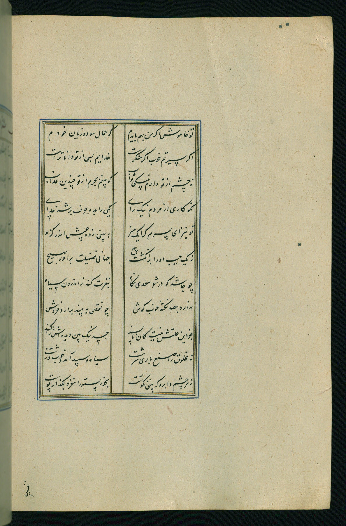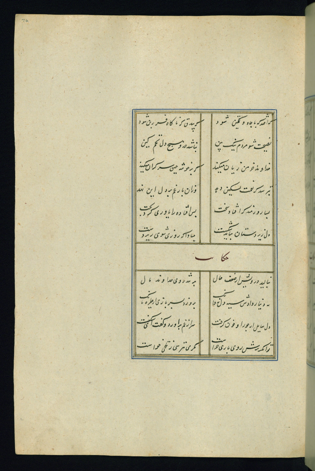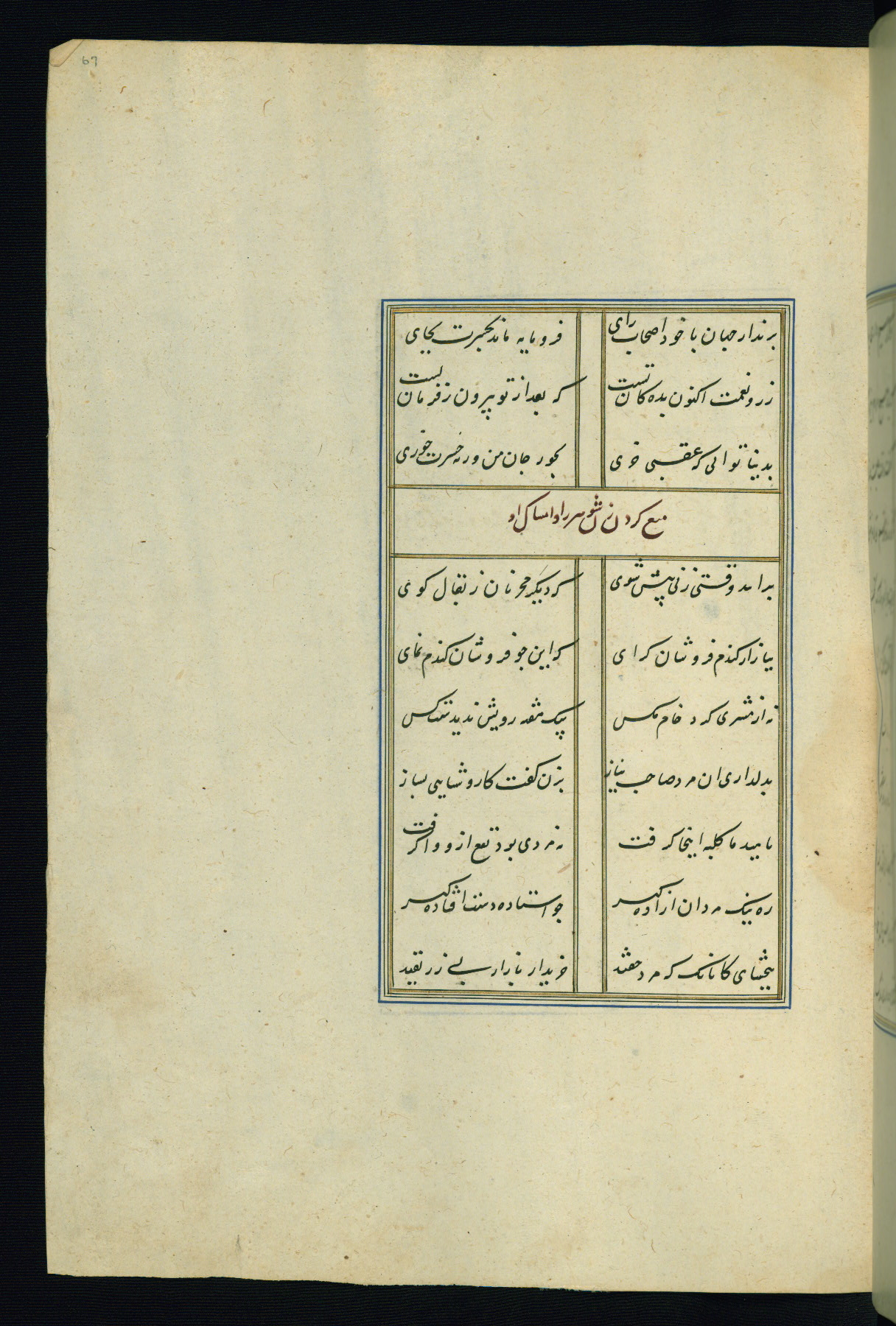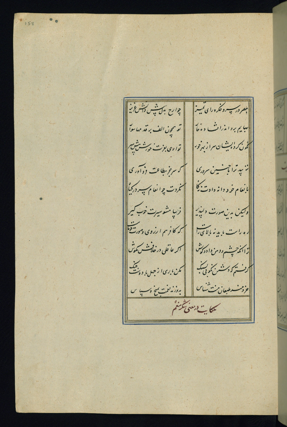 This is an illuminated and illustrated Safavid copy of the Būstān (The garden or The orchard), composed by Sa’dī (d. 691 AH / 1292 CE). It was written in black nasta’līq script in the ninth century AH / sixteenth CE in Iran. The codex opens with a frontispiece with the title Kitāb-i būstān inscribed in an illuminated medallion (fol. 1a), followed by a double-page illustration of a banquet scene in a landscape (fols. 1b-2a). Additionally, there are five paintings illustrating the text (fols. 25a, 55b, 58a, 93b, and 119b). The brown leather, blind-stamped binding decorated with a central oval and pendants is not contemporary with the manuscript.