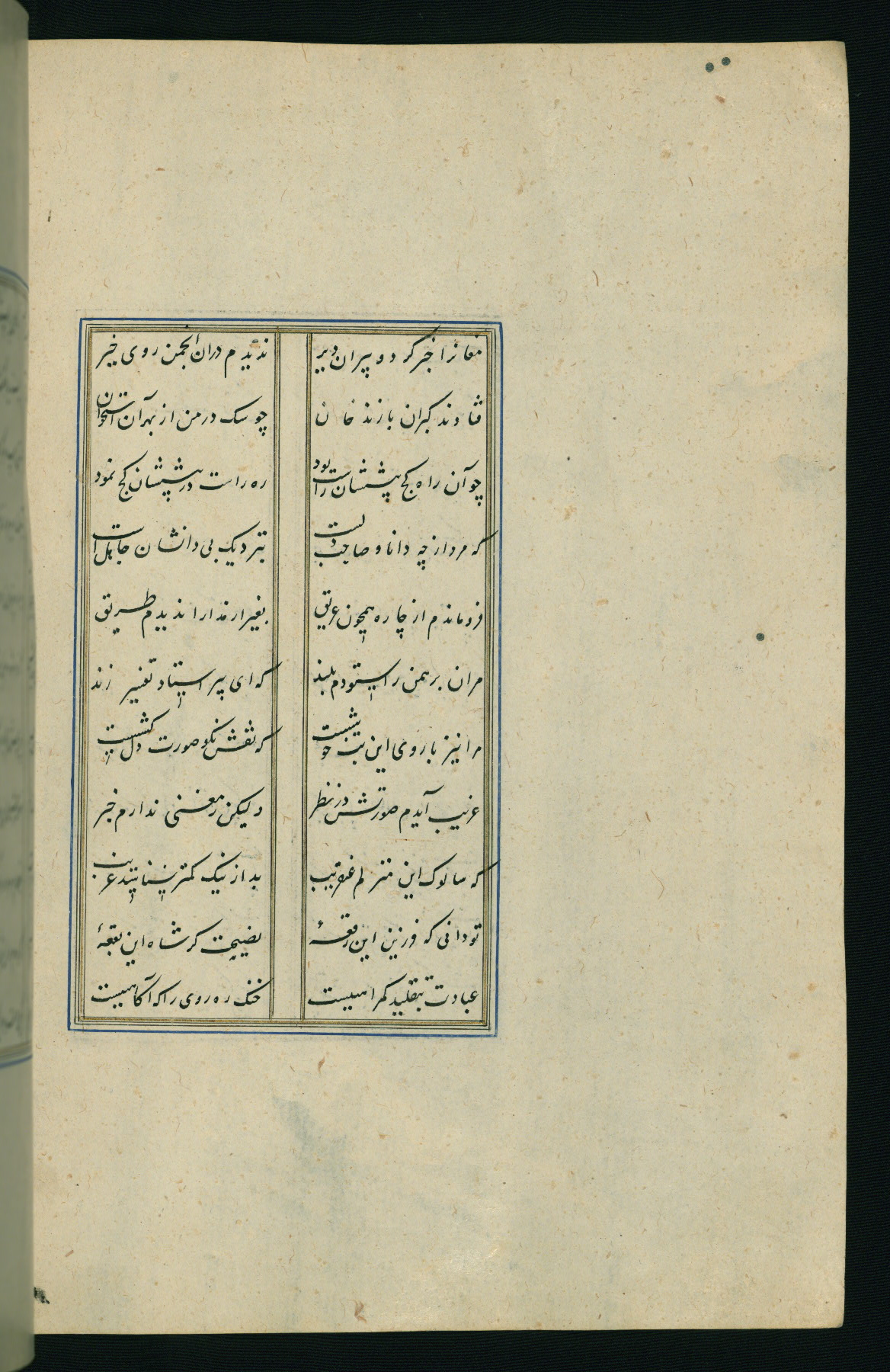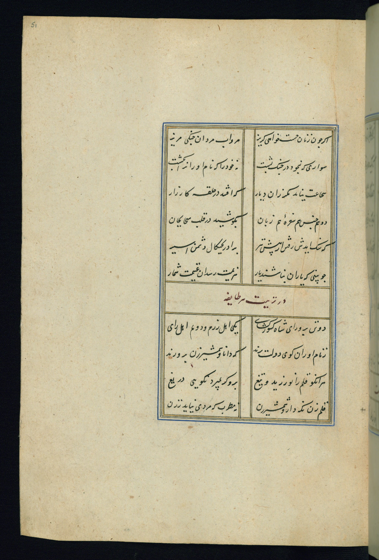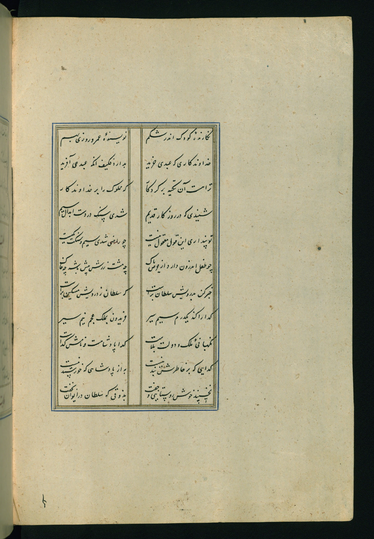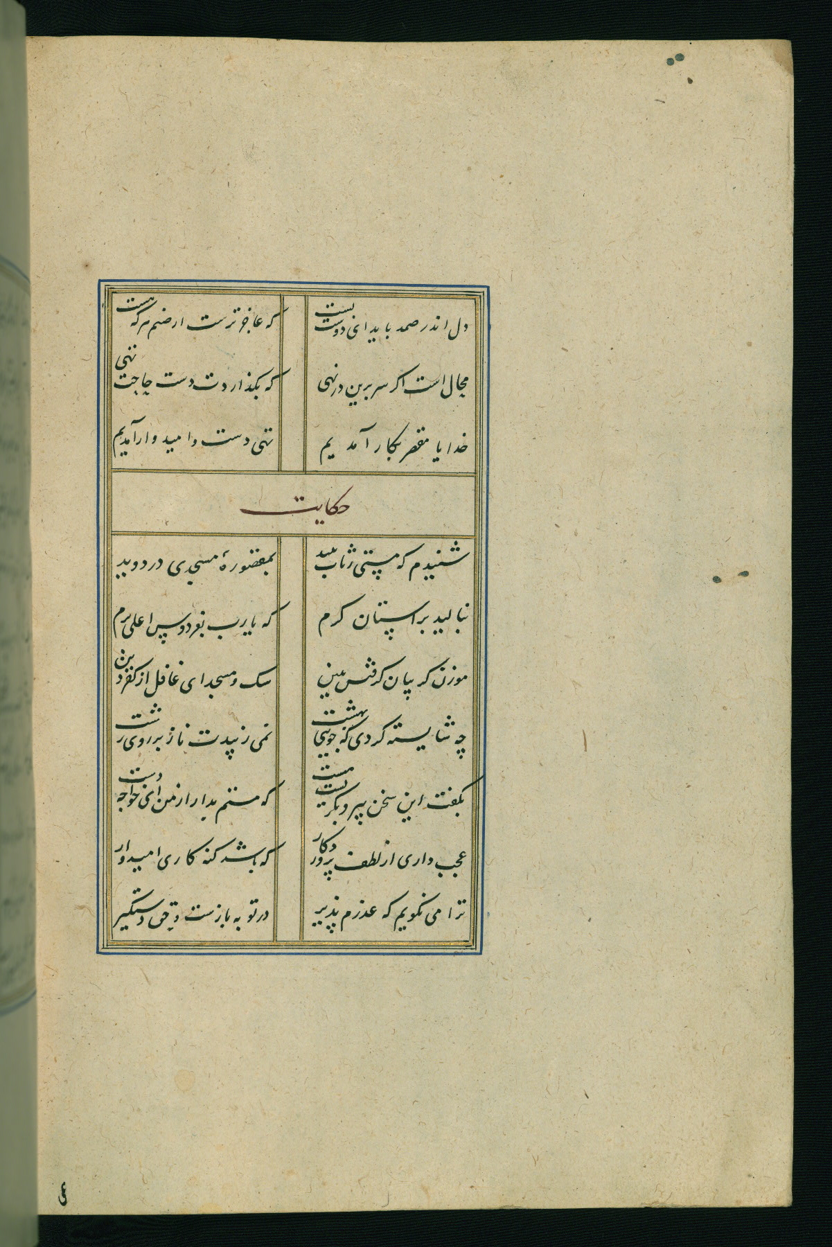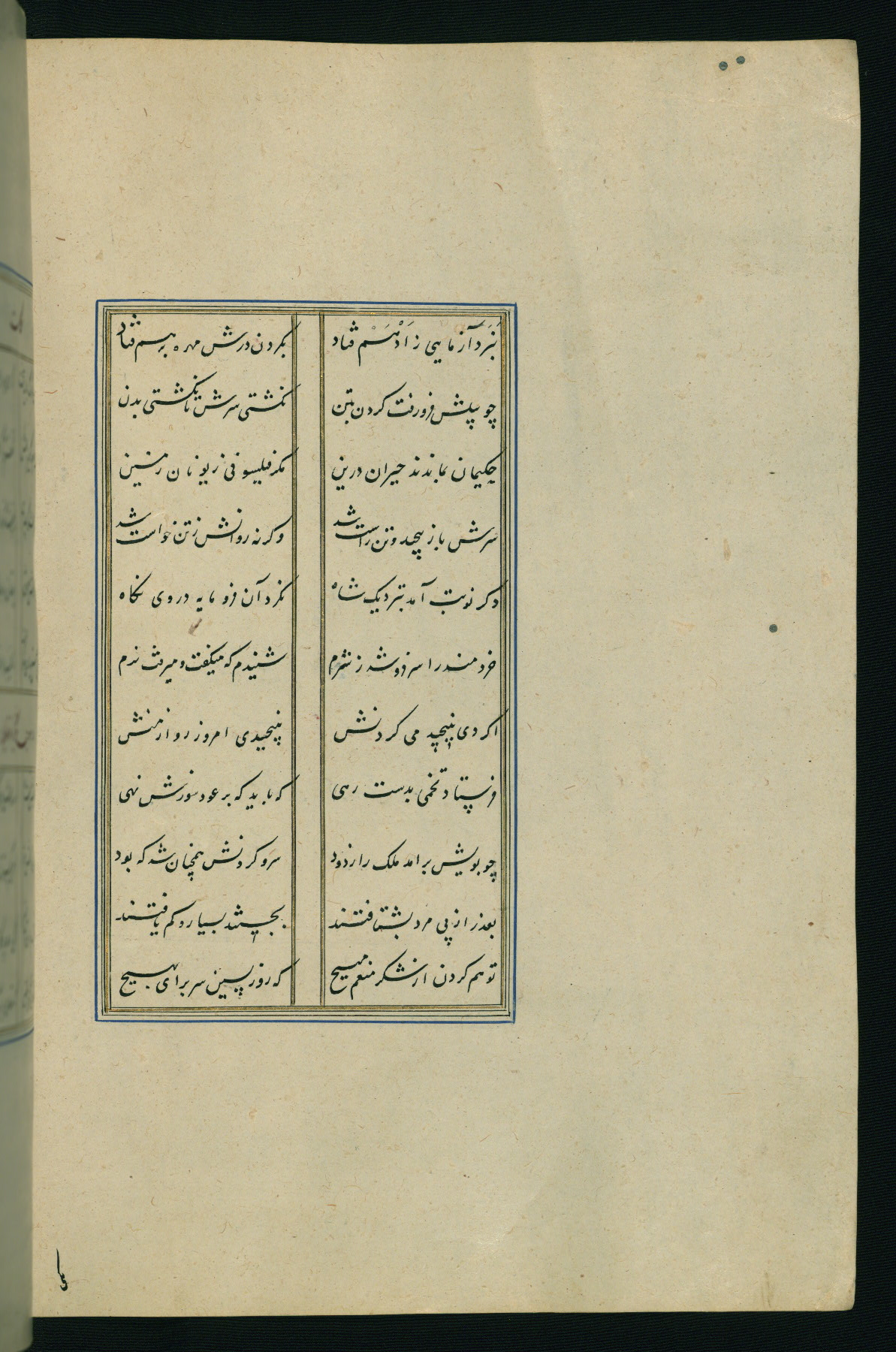 This is an illuminated and illustrated Safavid copy of the Būstān (The garden or The orchard), composed by Sa’dī (d. 691 AH / 1292 CE). It was written in black nasta’līq script in the ninth century AH / sixteenth CE in Iran. The codex opens with a frontispiece with the title Kitāb-i būstān inscribed in an illuminated medallion (fol. 1a), followed by a double-page illustration of a banquet scene in a landscape (fols. 1b-2a). Additionally, there are five paintings illustrating the text (fols. 25a, 55b, 58a, 93b, and 119b). The brown leather, blind-stamped binding decorated with a central oval and pendants is not contemporary with the manuscript.