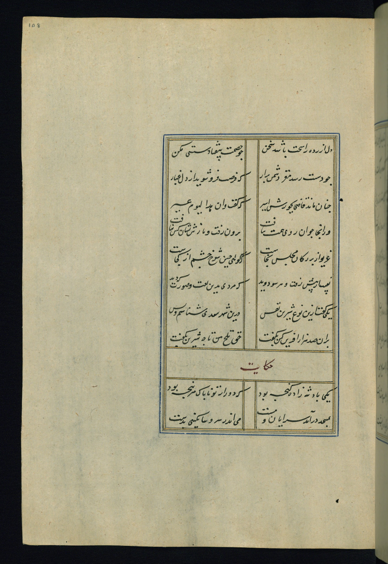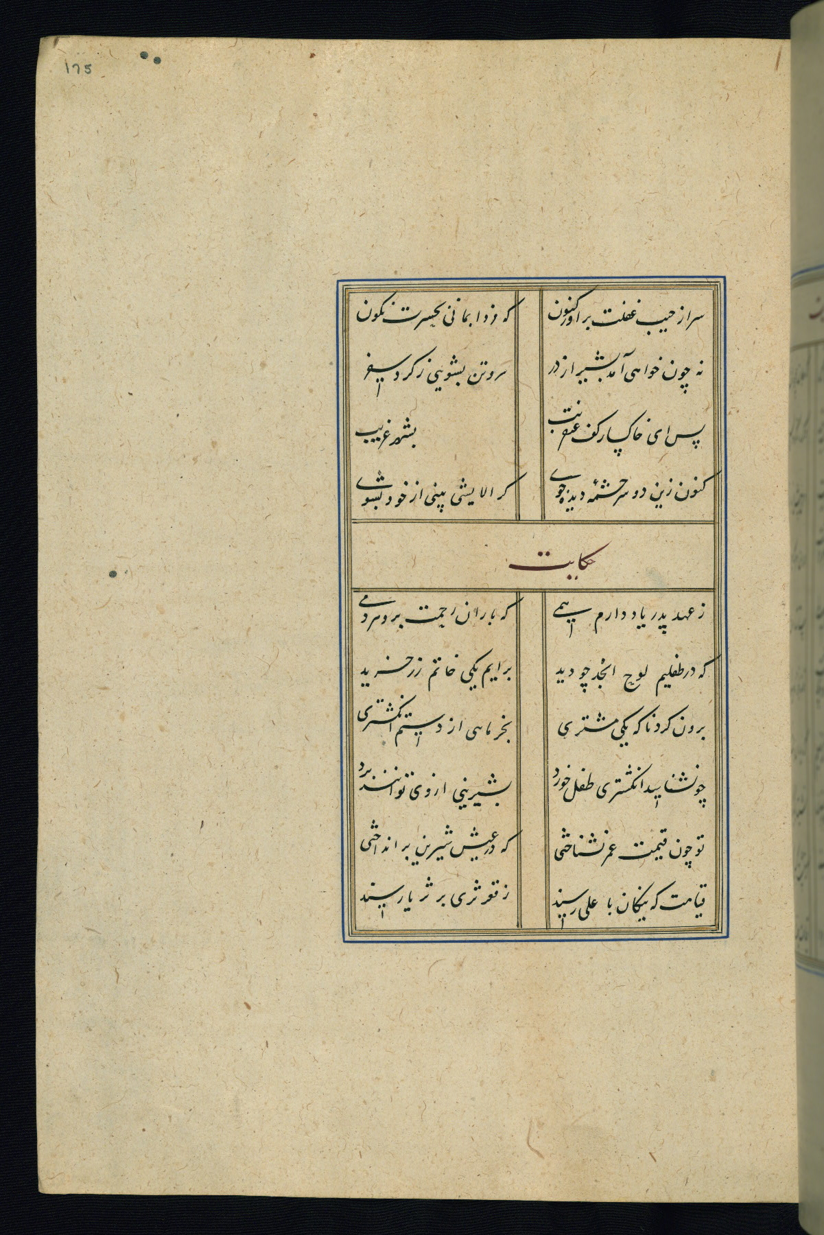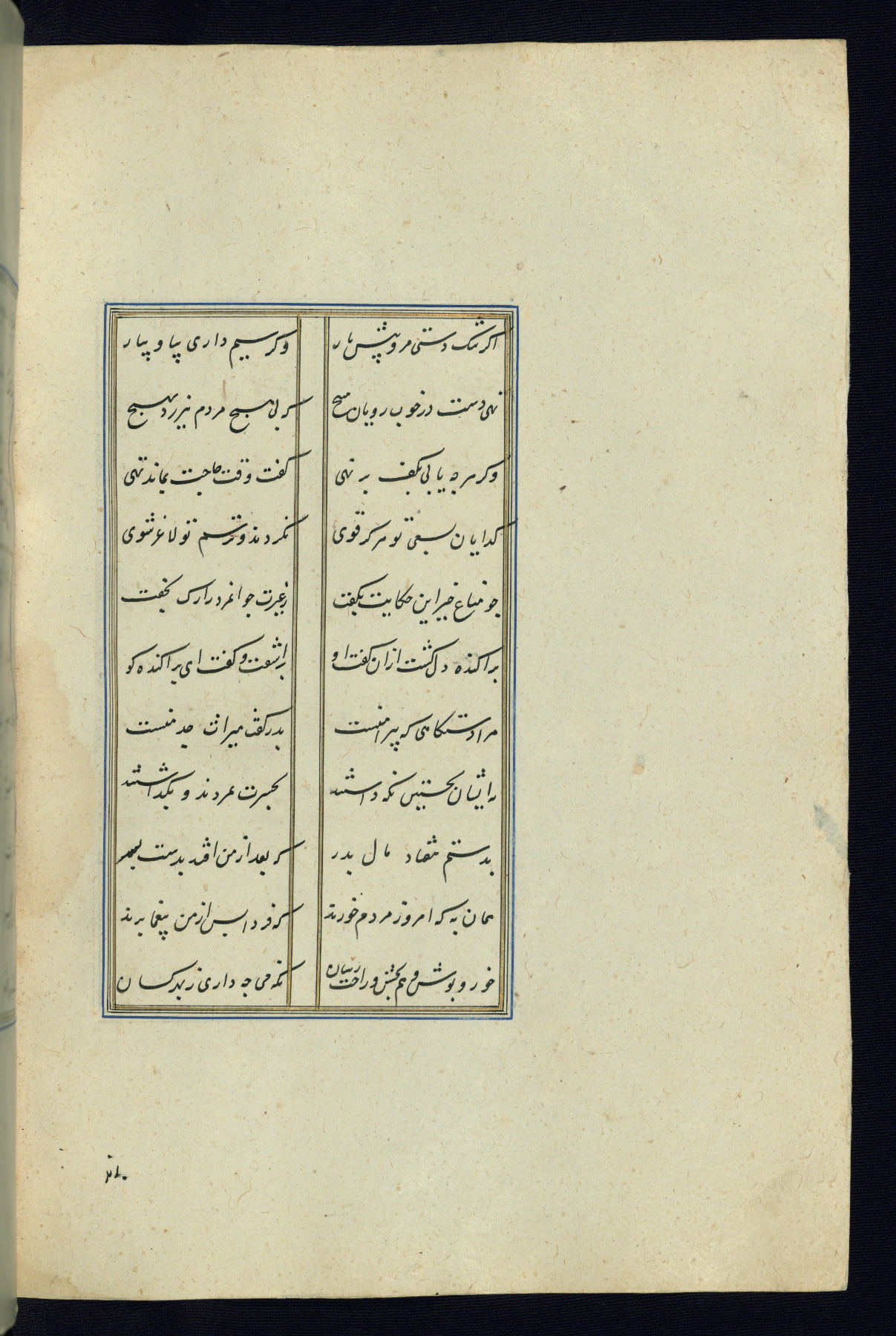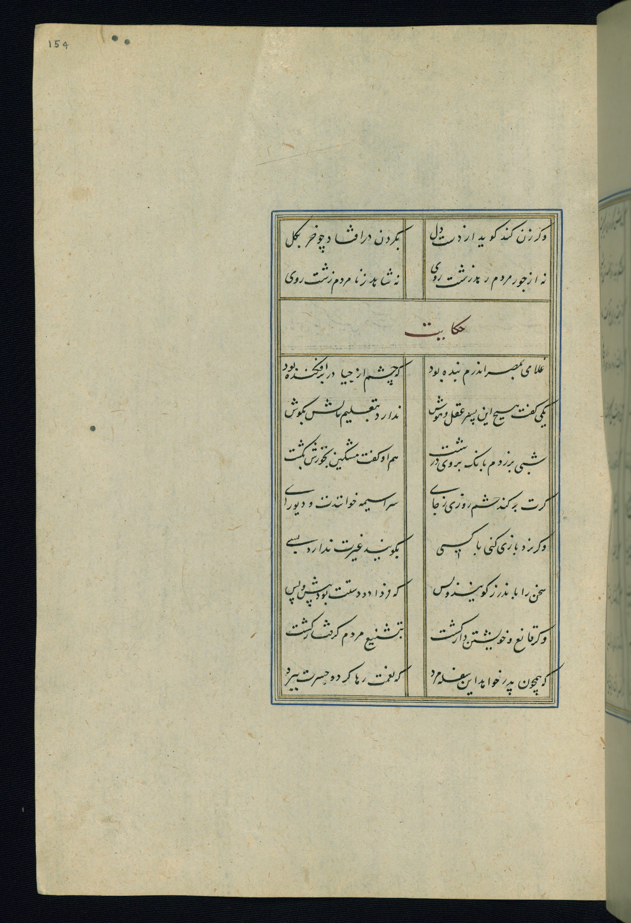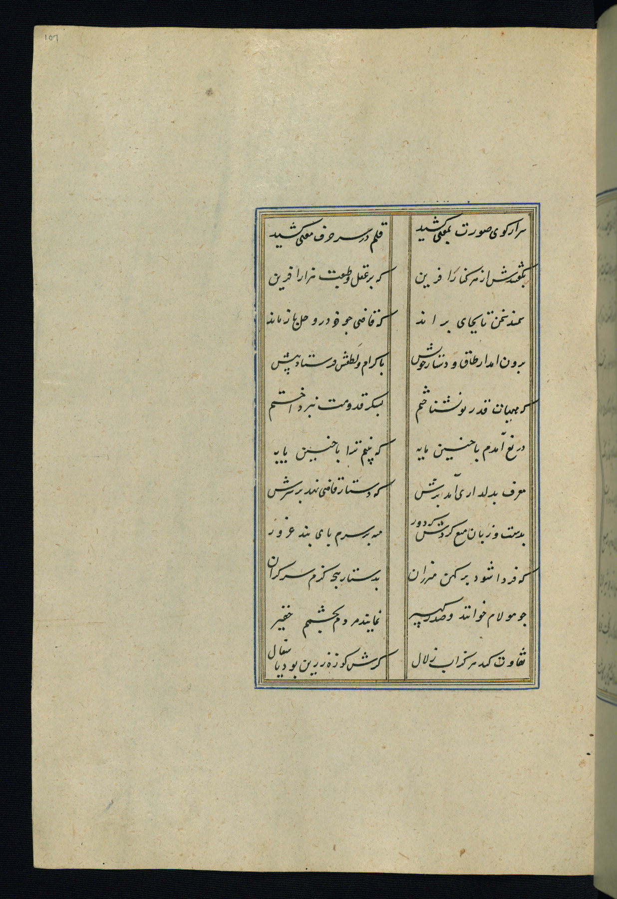 This is an illuminated and illustrated Safavid copy of the Būstān (The garden or The orchard), composed by Sa’dī (d. 691 AH / 1292 CE). It was written in black nasta’līq script in the ninth century AH / sixteenth CE in Iran. The codex opens with a frontispiece with the title Kitāb-i būstān inscribed in an illuminated medallion (fol. 1a), followed by a double-page illustration of a banquet scene in a landscape (fols. 1b-2a). Additionally, there are five paintings illustrating the text (fols. 25a, 55b, 58a, 93b, and 119b). The brown leather, blind-stamped binding decorated with a central oval and pendants is not contemporary with the manuscript.