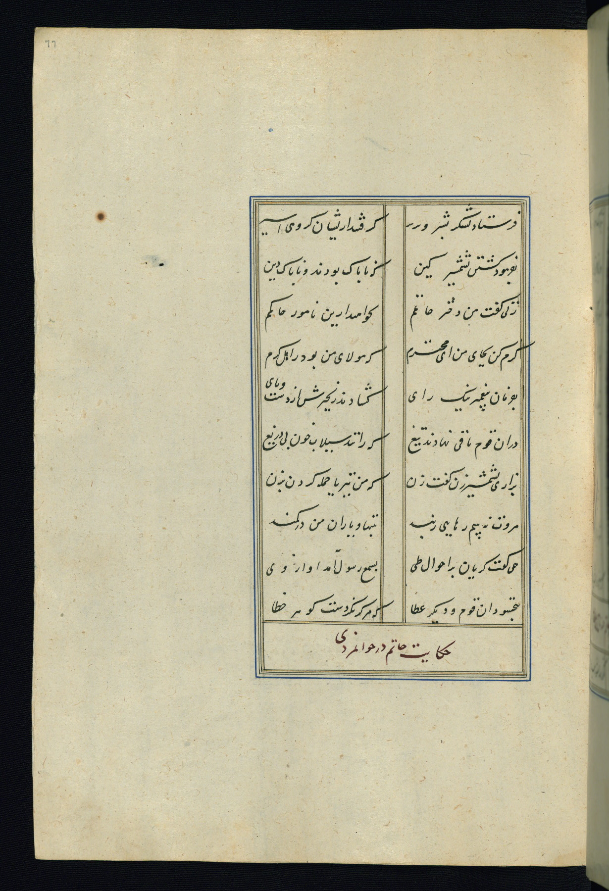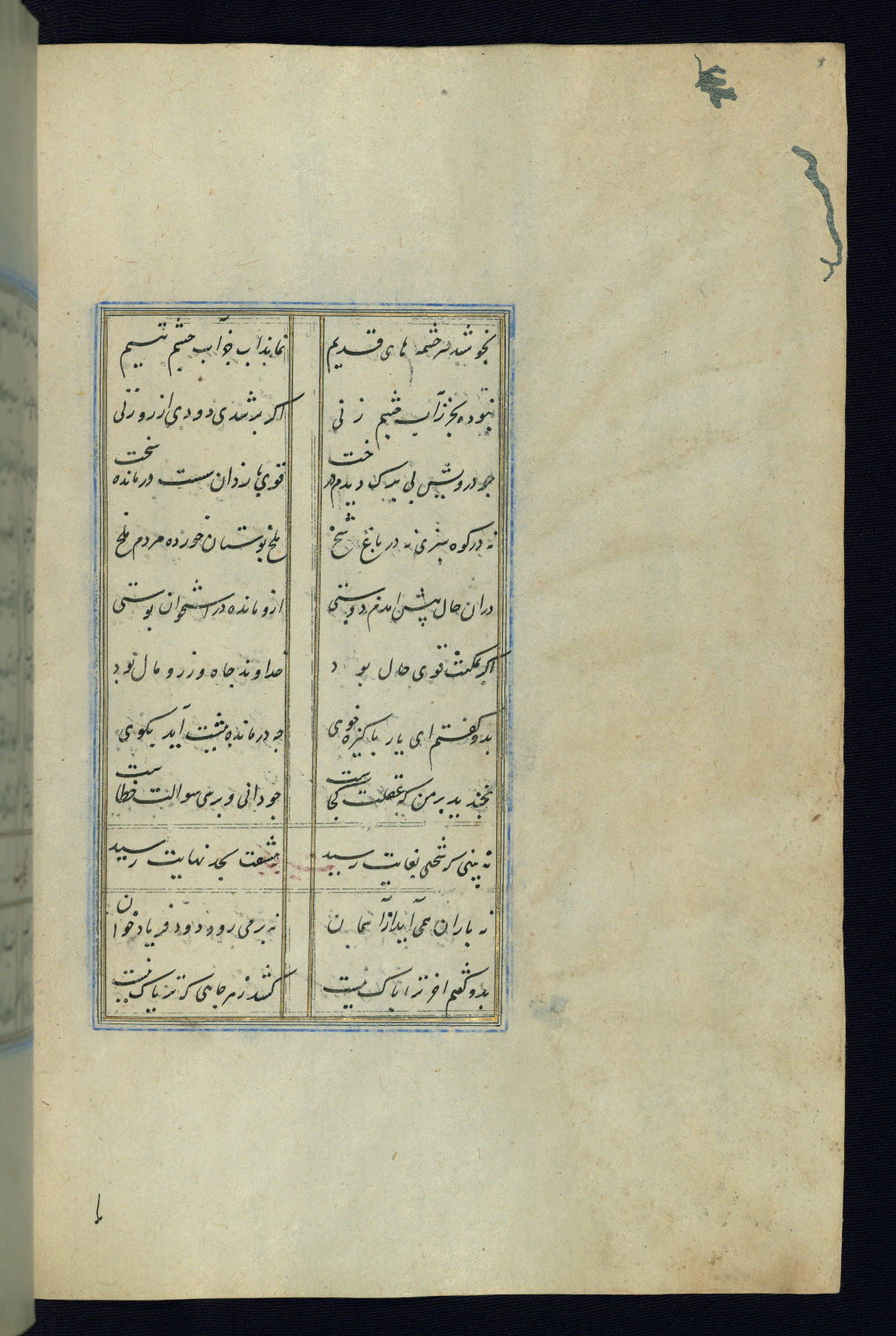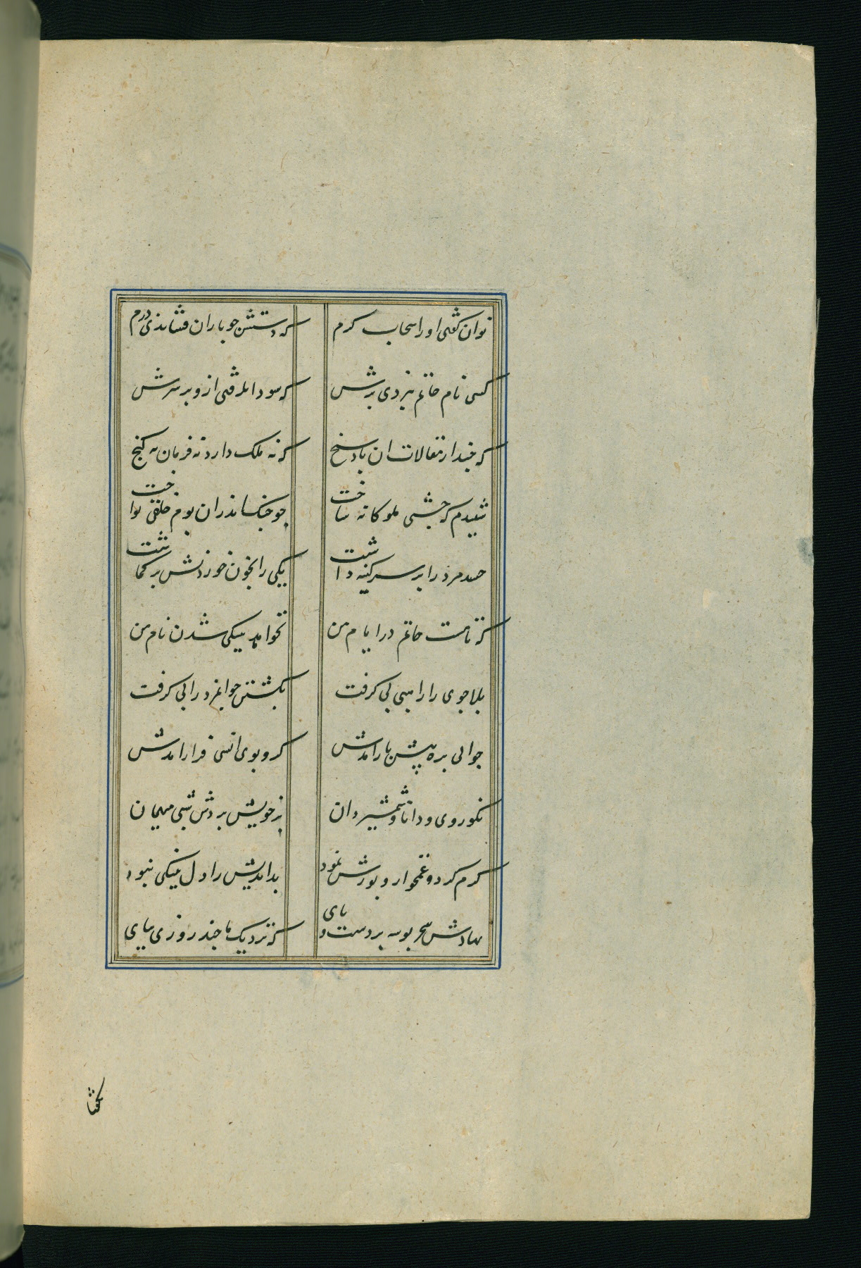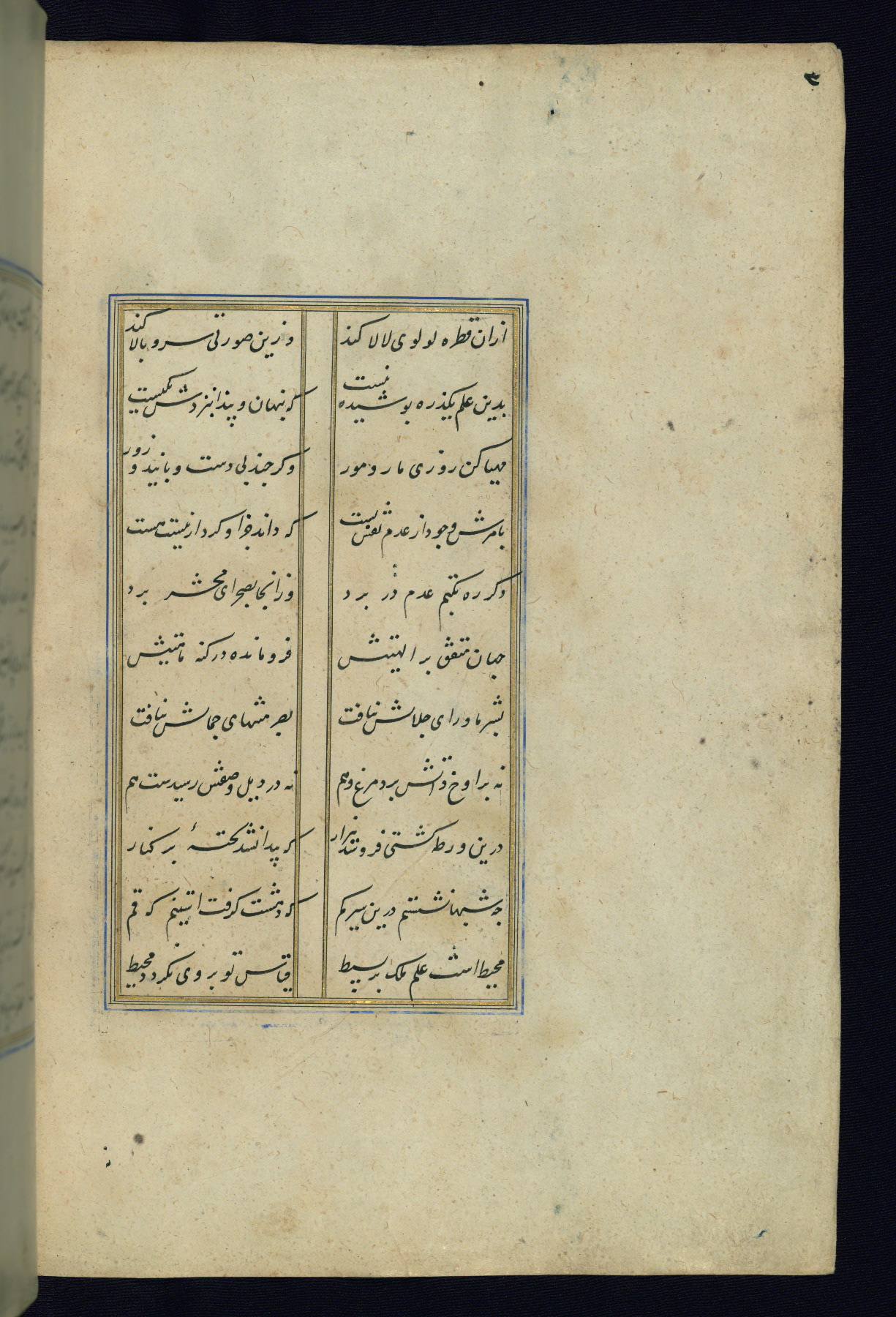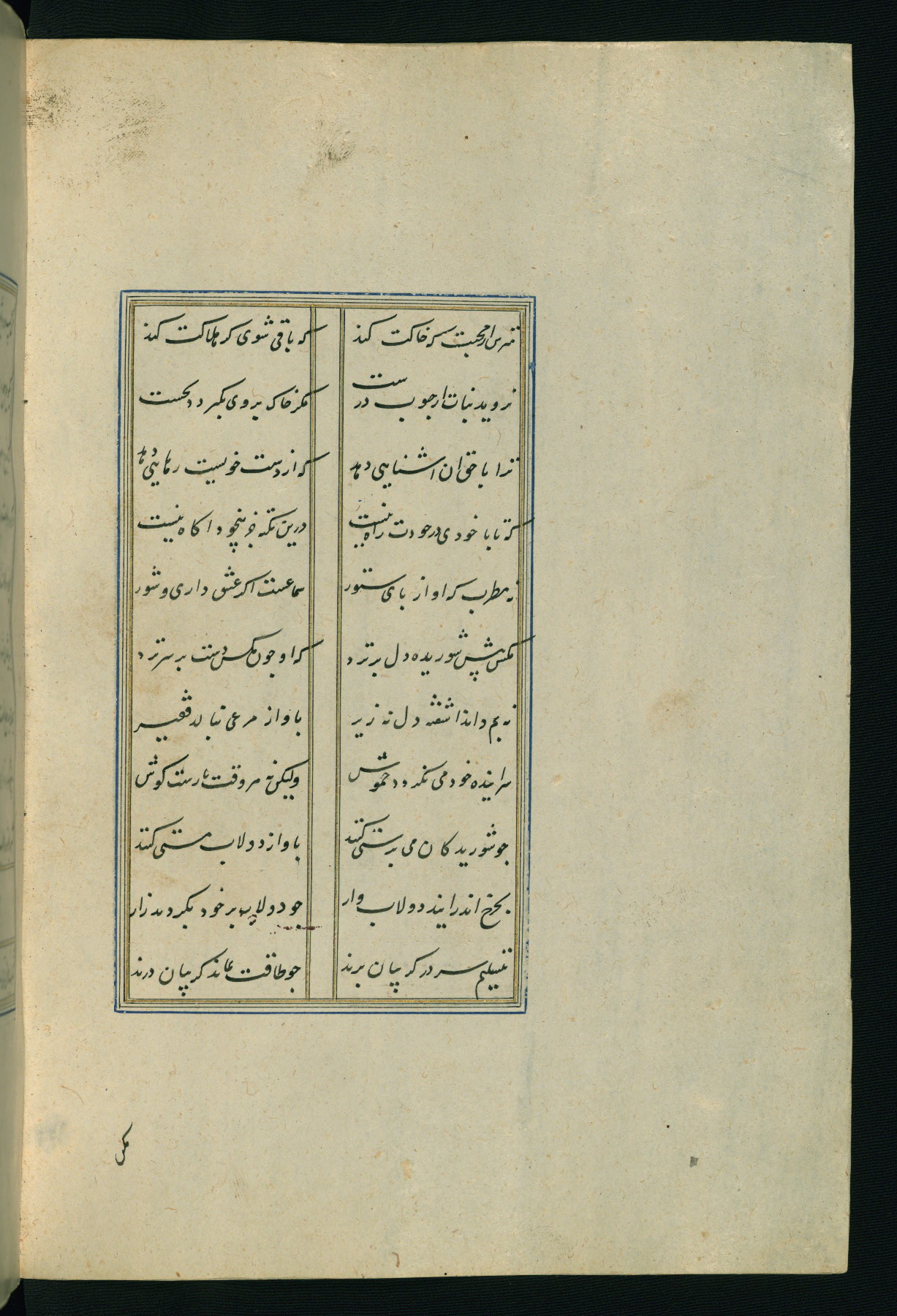This is an illuminated and illustrated Safavid copy of the Būstān (The garden or The orchard), composed by Sa’dī (d. 691 AH / 1292 CE). It was written in black nasta’līq script in the ninth century AH / sixteenth CE in Iran. The codex opens with a frontispiece with the title Kitāb-i būstān inscribed in an illuminated medallion (fol. 1a), followed by a double-page illustration of a banquet scene in a landscape (fols. 1b-2a). Additionally, there are five paintings illustrating the text (fols. 25a, 55b, 58a, 93b, and 119b). The brown leather, blind-stamped binding decorated with a central oval and pendants is not contemporary with the manuscript.