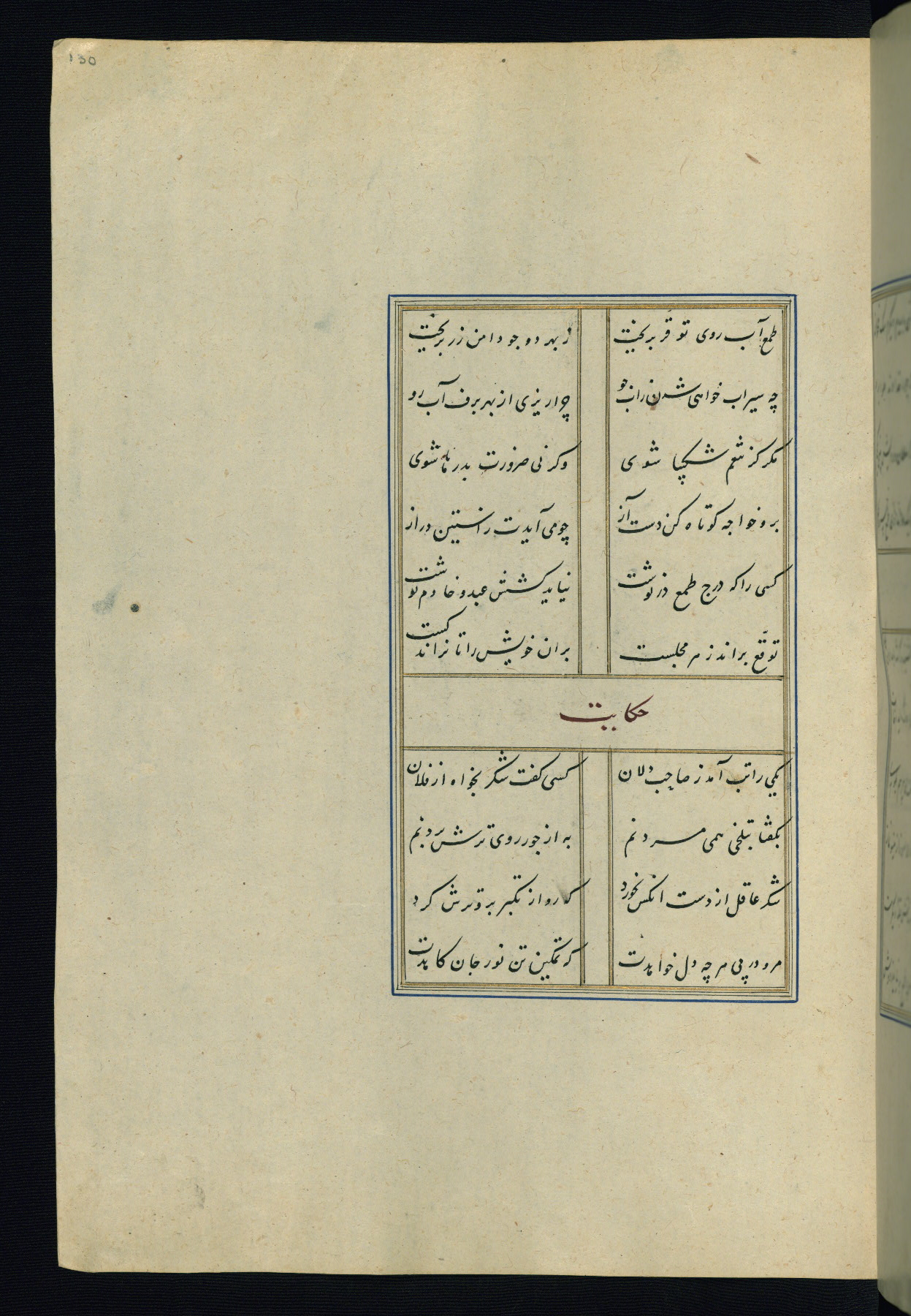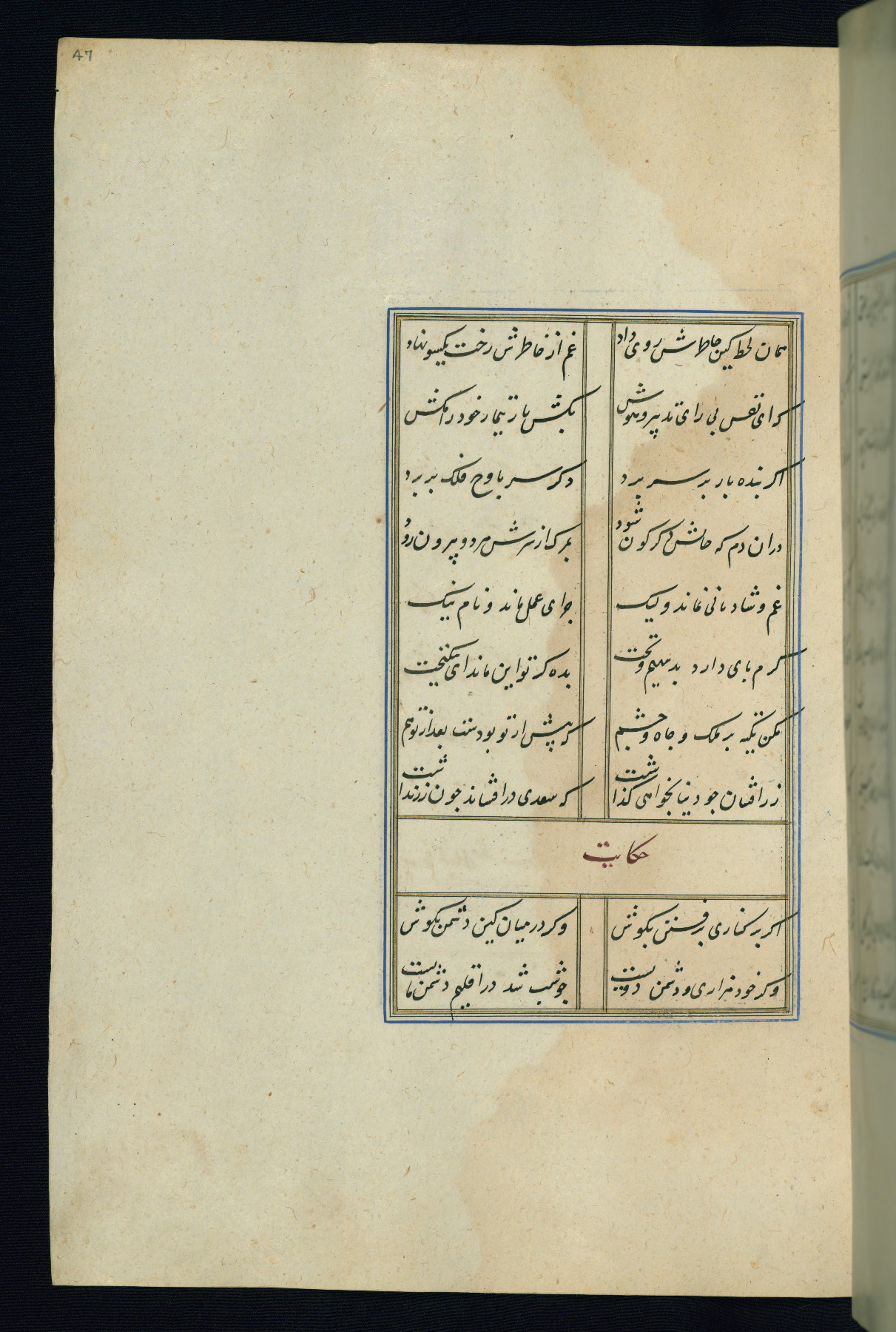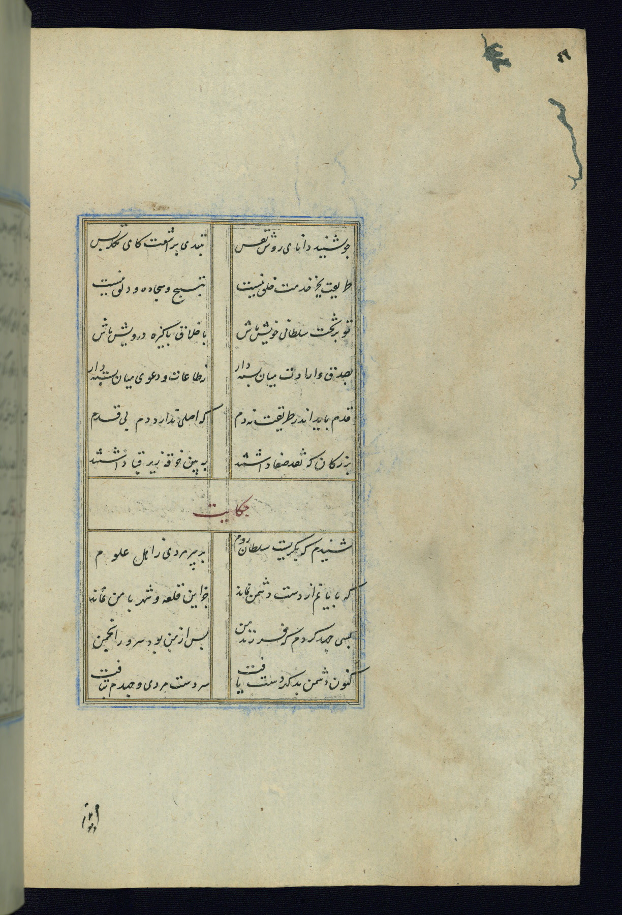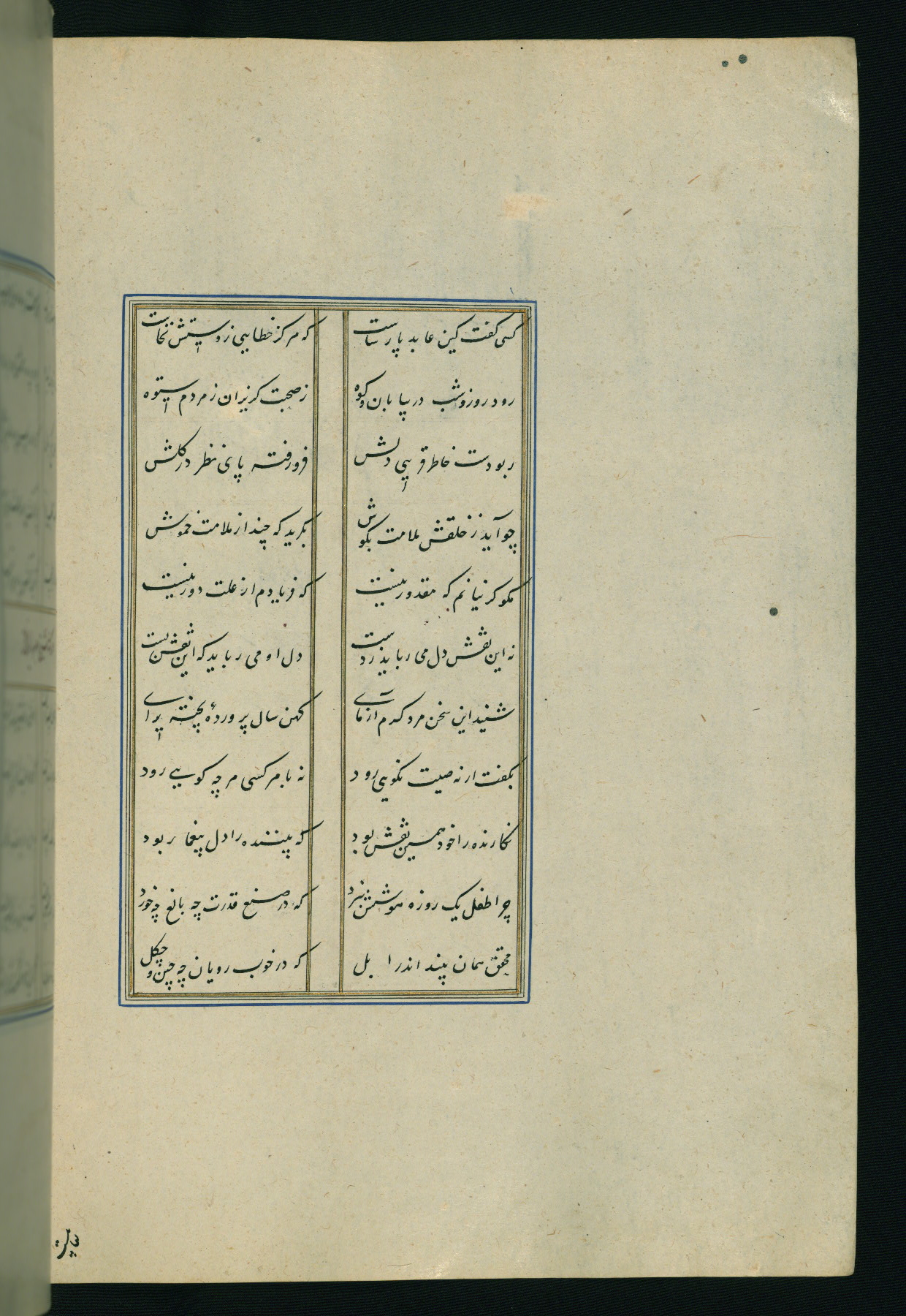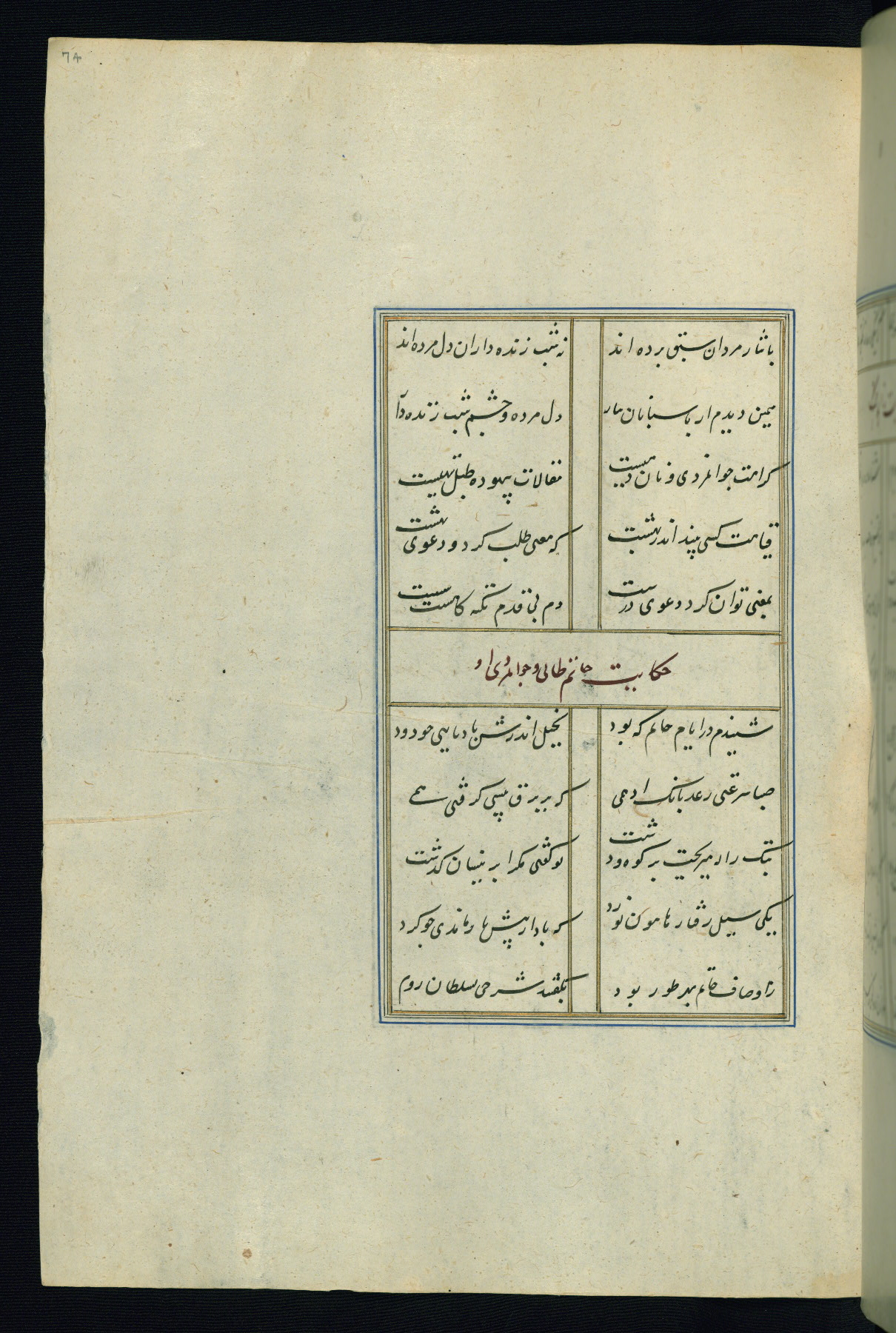 This is an illuminated and illustrated Safavid copy of the Būstān (The garden or The orchard), composed by Sa’dī (d. 691 AH / 1292 CE). It was written in black nasta’līq script in the ninth century AH / sixteenth CE in Iran. The codex opens with a frontispiece with the title Kitāb-i būstān inscribed in an illuminated medallion (fol. 1a), followed by a double-page illustration of a banquet scene in a landscape (fols. 1b-2a). Additionally, there are five paintings illustrating the text (fols. 25a, 55b, 58a, 93b, and 119b). The brown leather, blind-stamped binding decorated with a central oval and pendants is not contemporary with the manuscript.