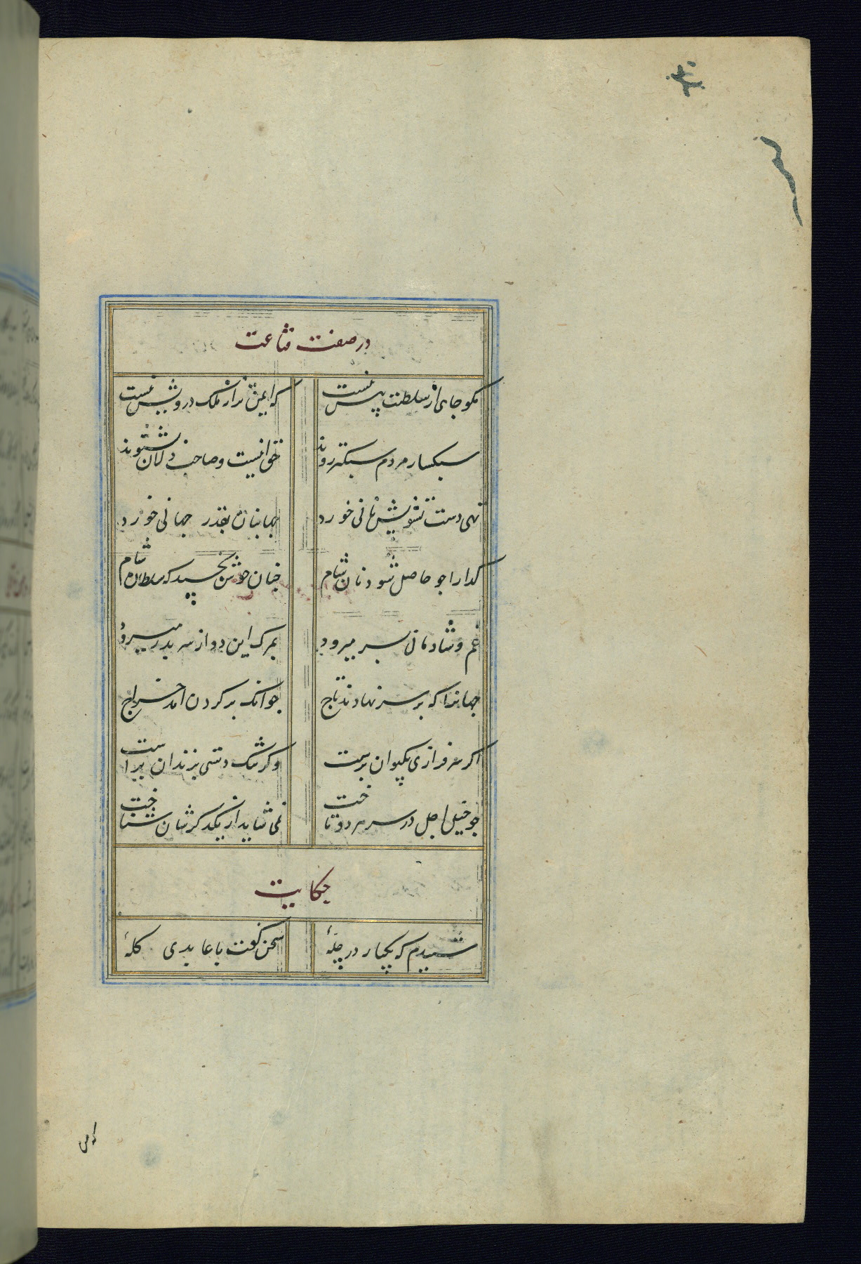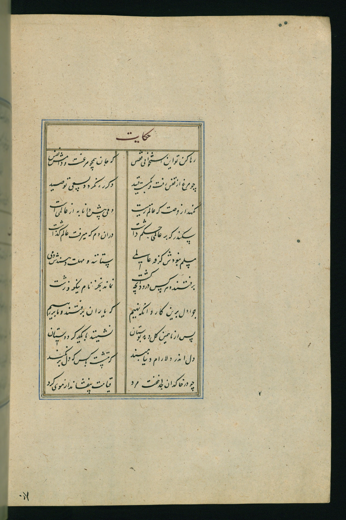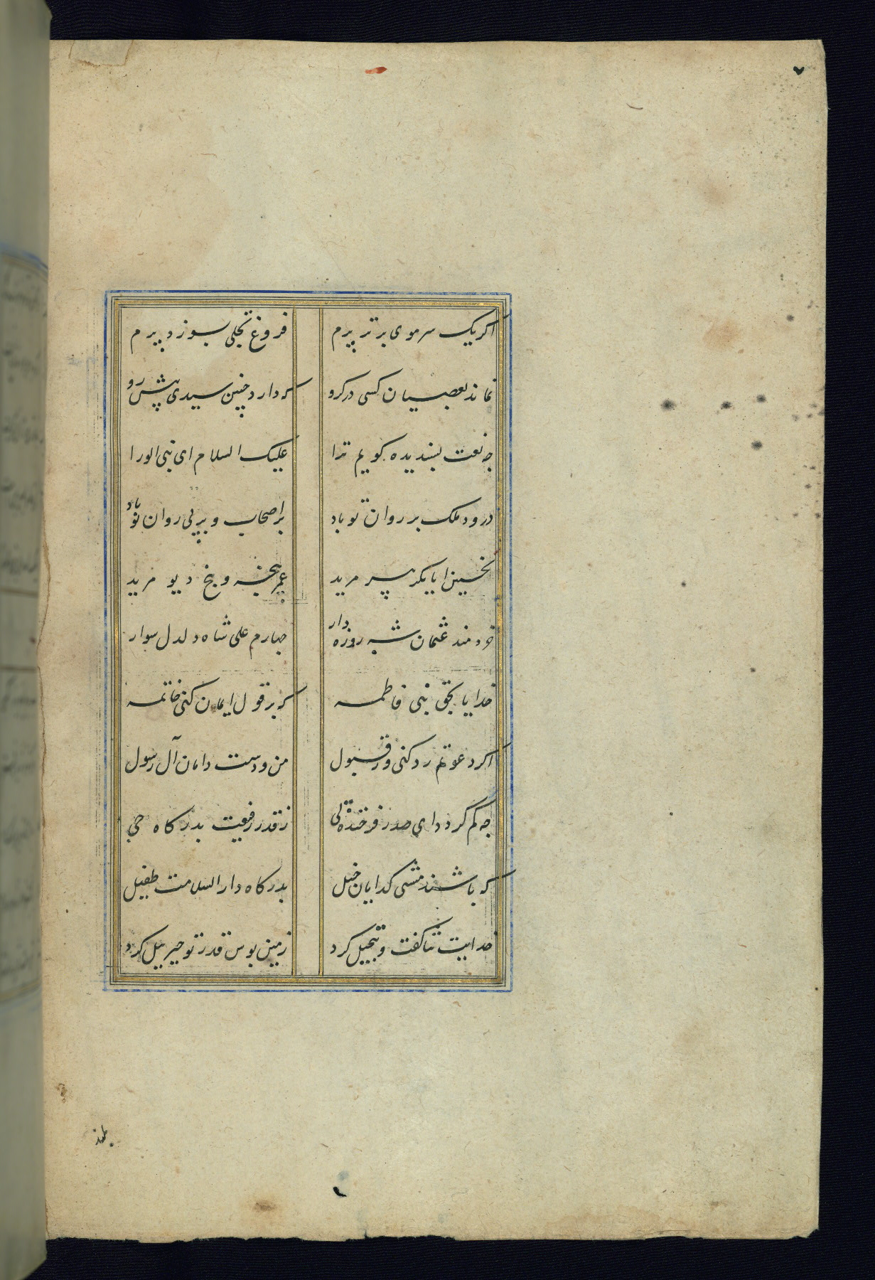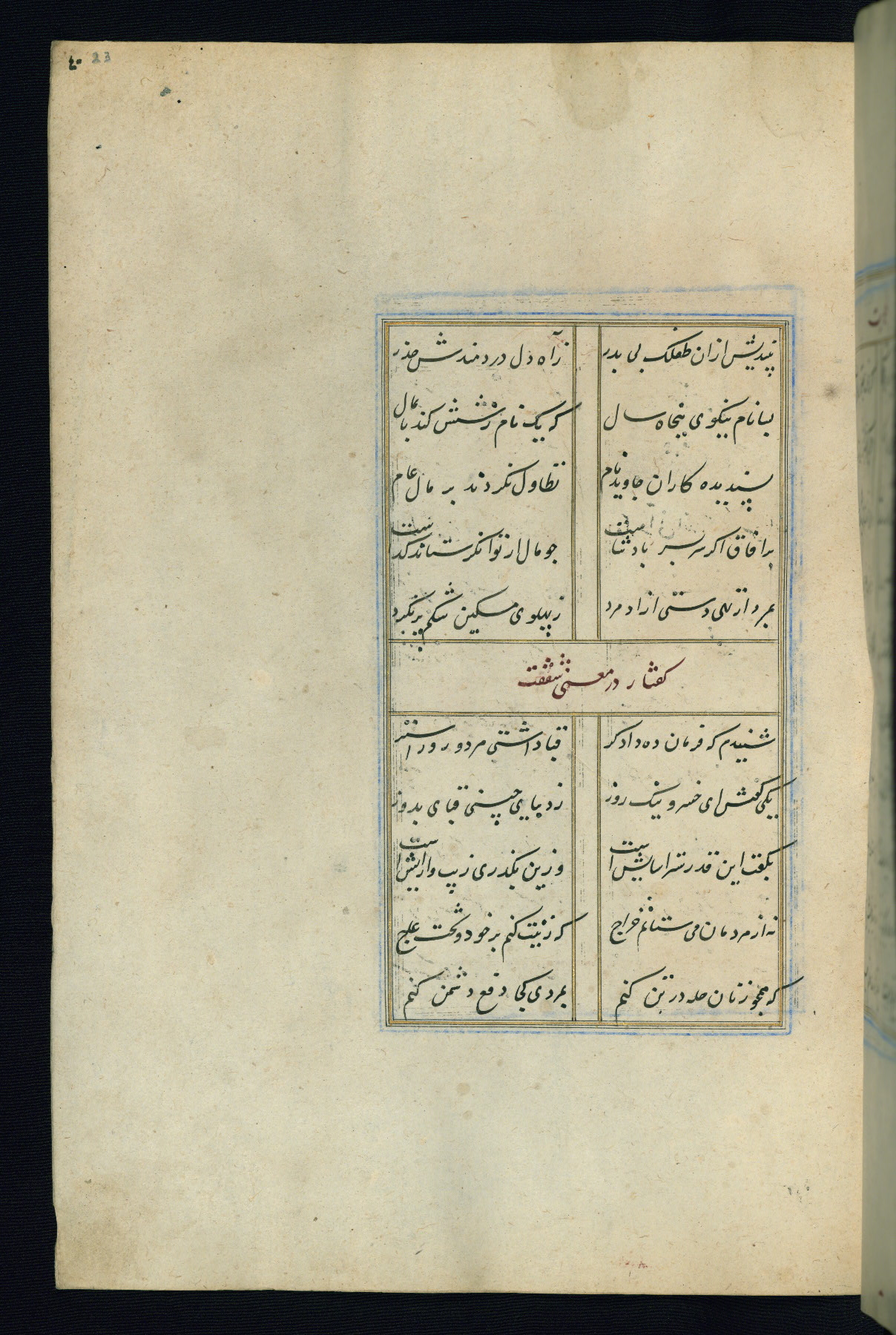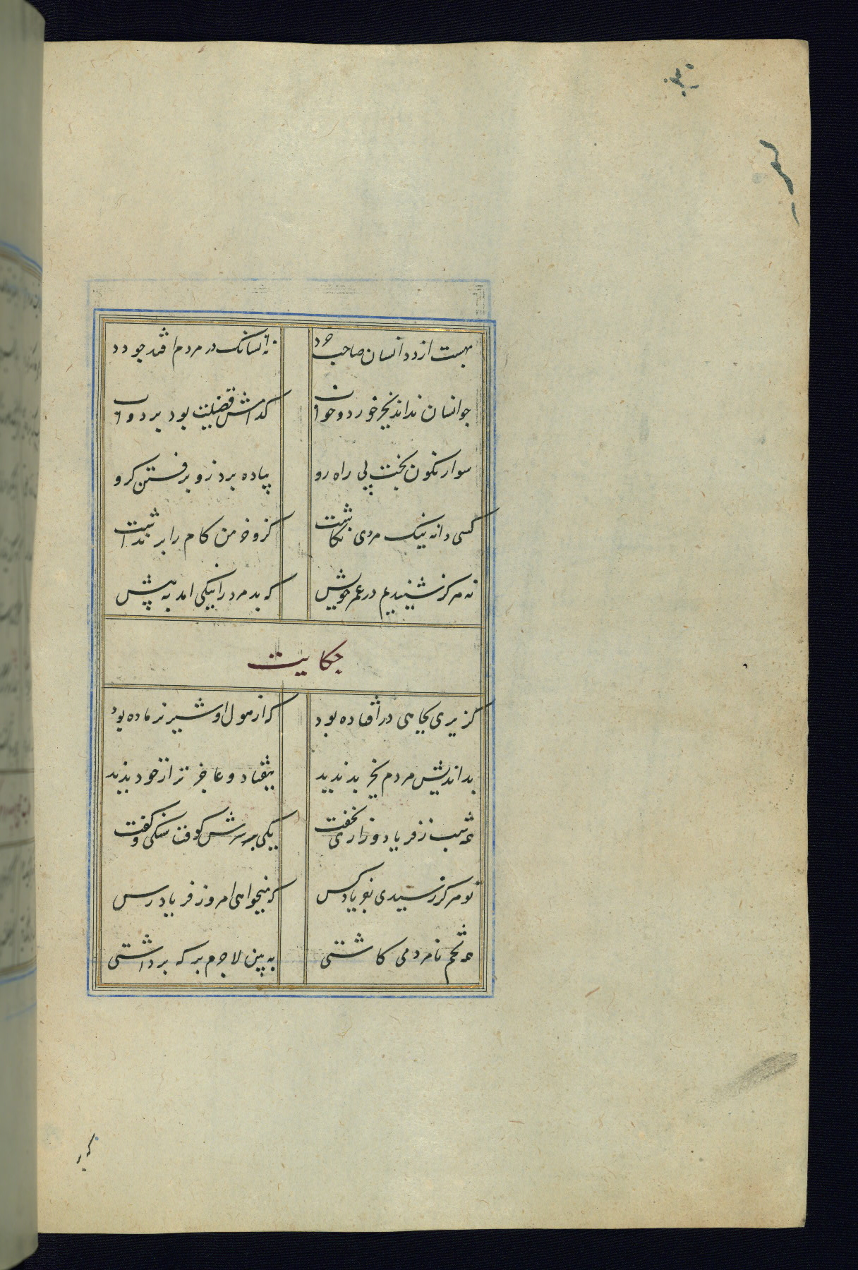 This is an illuminated and illustrated Safavid copy of the Būstān (The garden or The orchard), composed by Sa’dī (d. 691 AH / 1292 CE). It was written in black nasta’līq script in the ninth century AH / sixteenth CE in Iran. The codex opens with a frontispiece with the title Kitāb-i būstān inscribed in an illuminated medallion (fol. 1a), followed by a double-page illustration of a banquet scene in a landscape (fols. 1b-2a). Additionally, there are five paintings illustrating the text (fols. 25a, 55b, 58a, 93b, and 119b). The brown leather, blind-stamped binding decorated with a central oval and pendants is not contemporary with the manuscript.