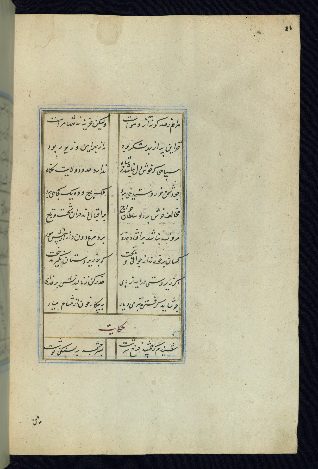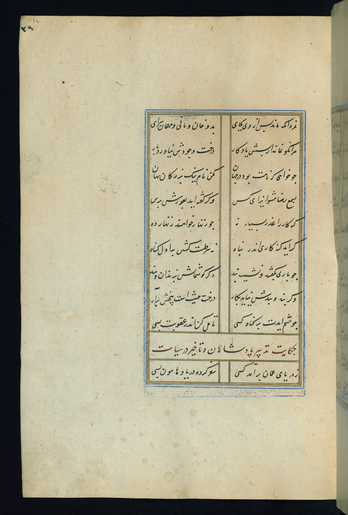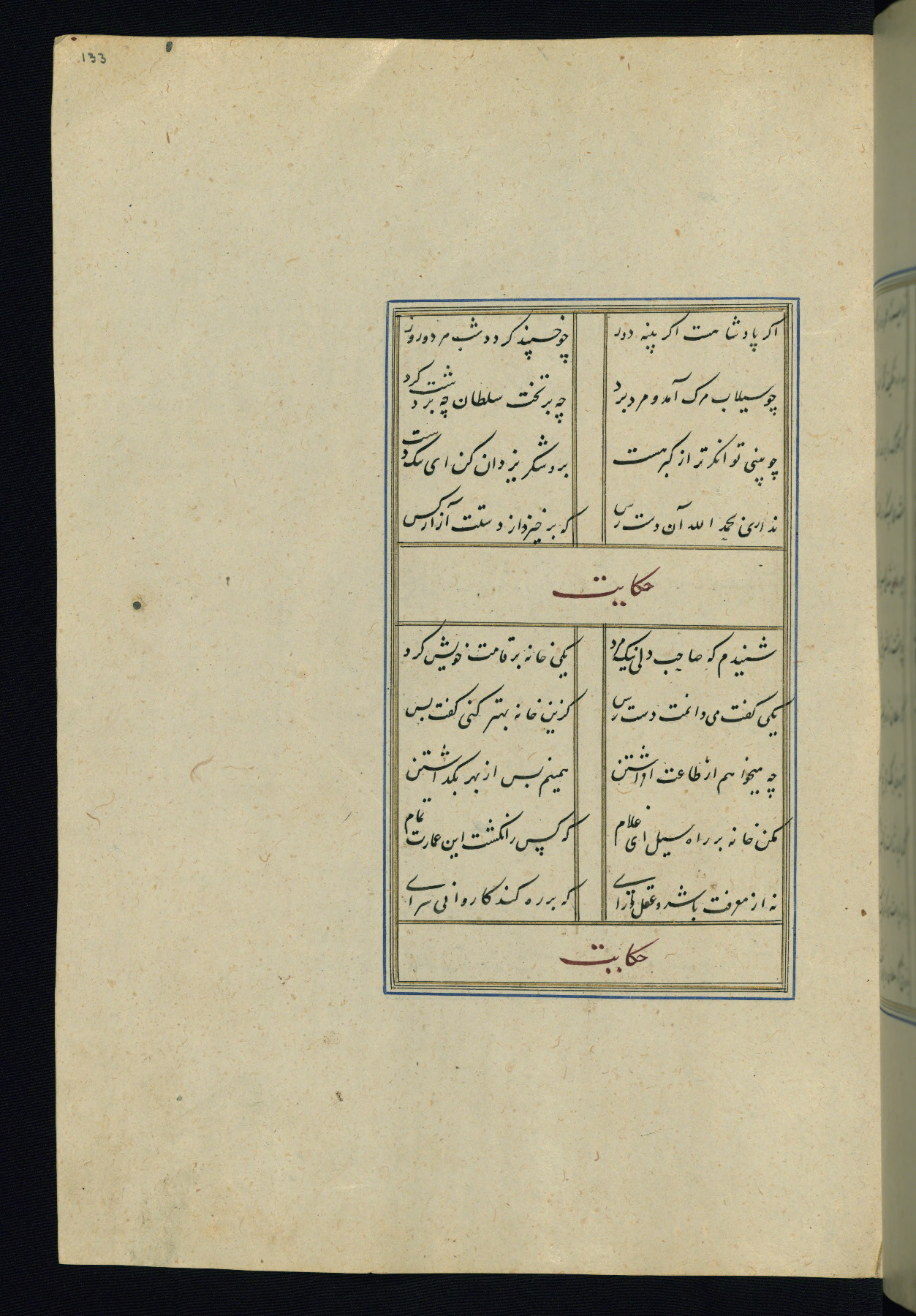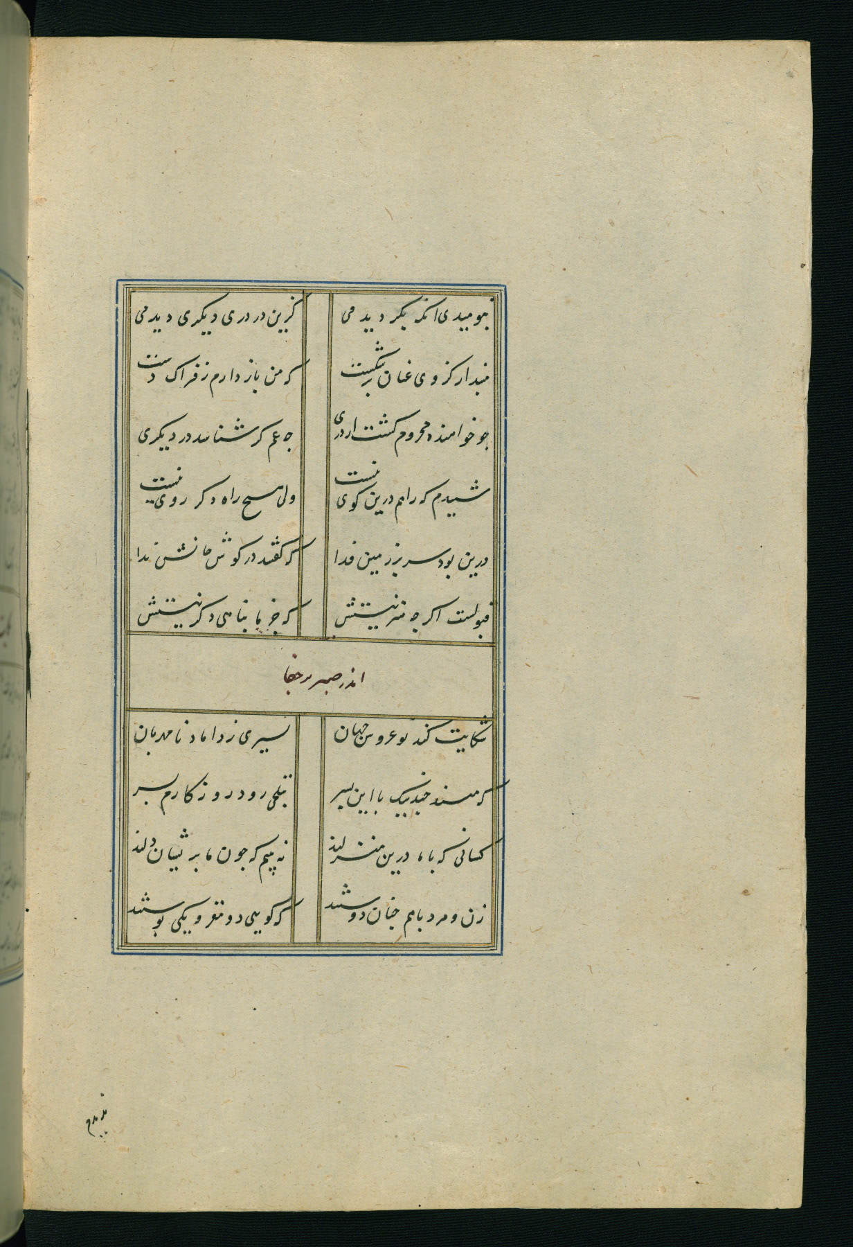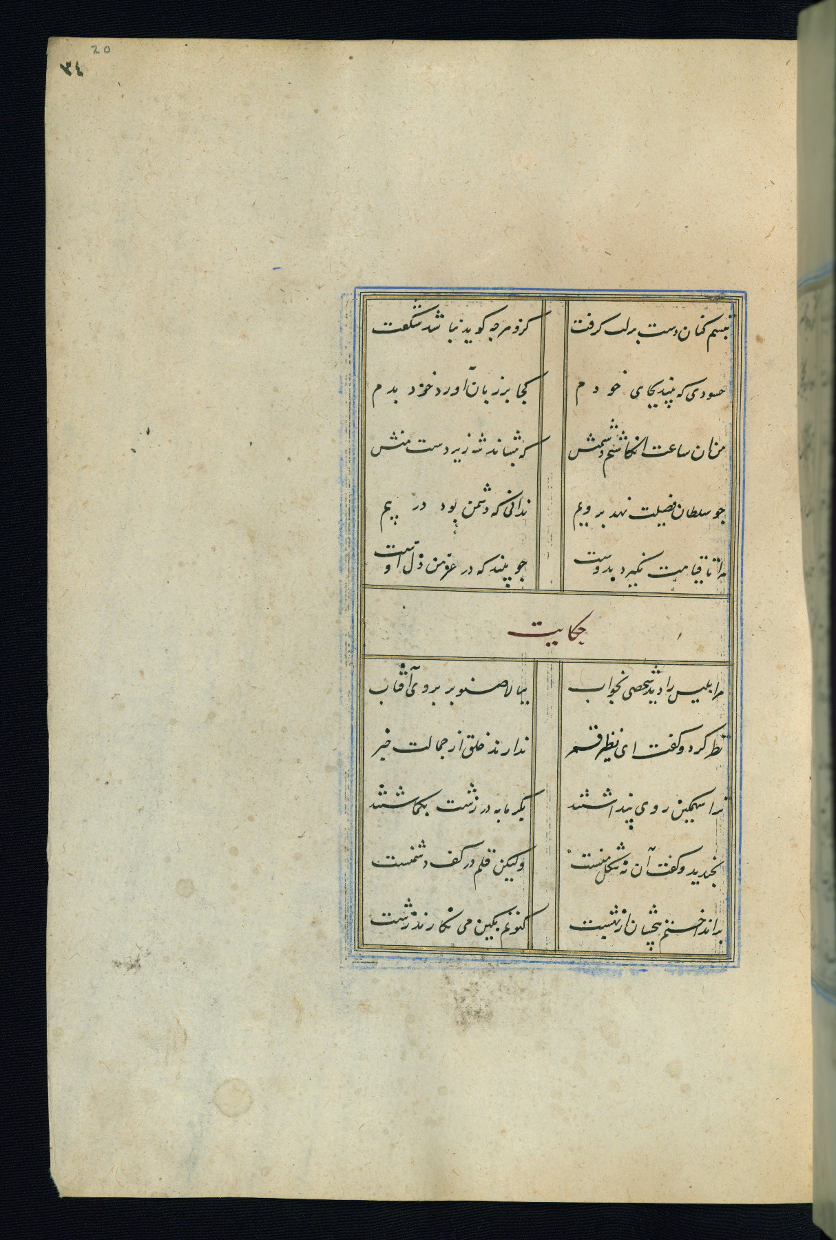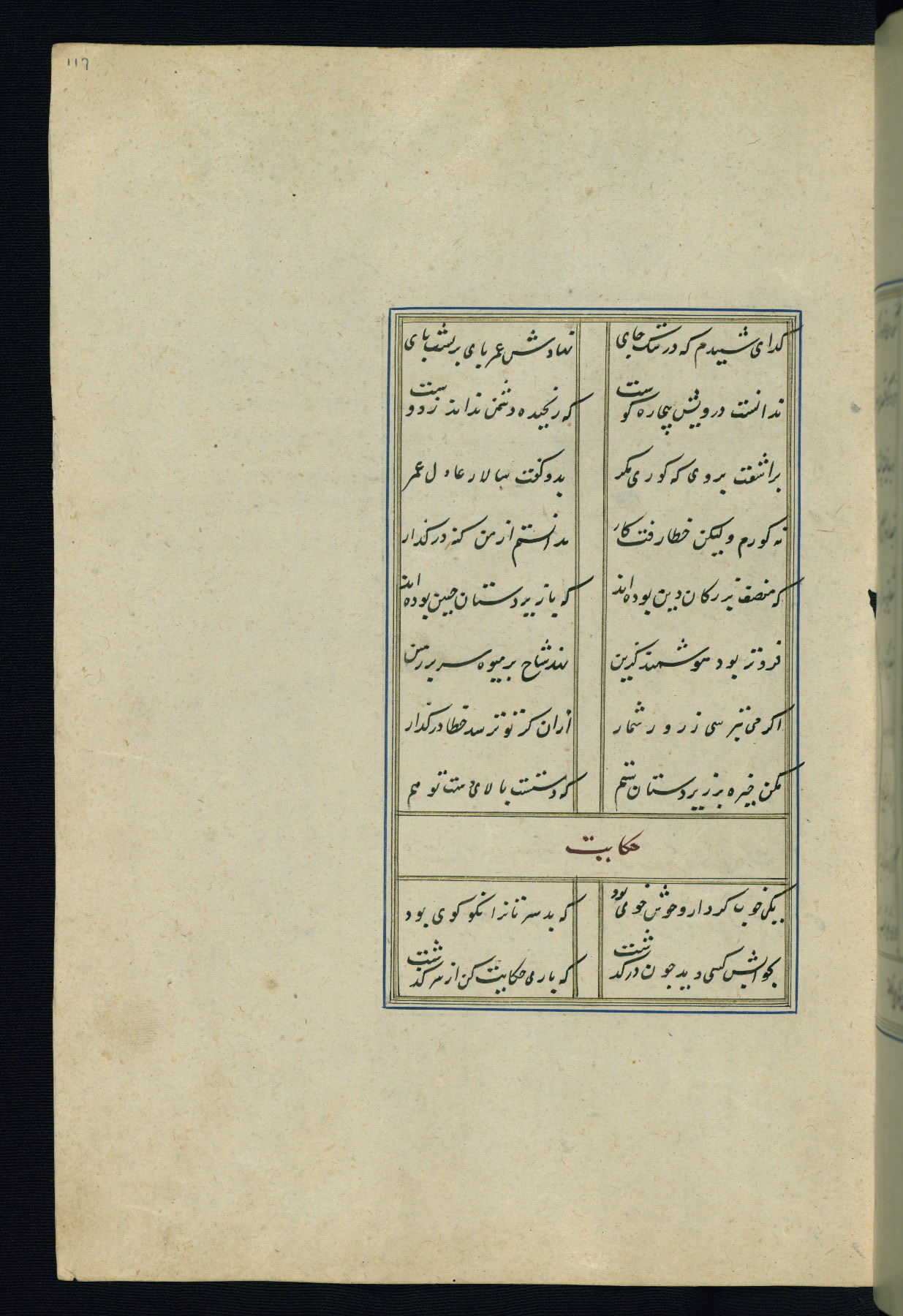 This is an illuminated and illustrated Safavid copy of the Būstān (The garden or The orchard), composed by Sa’dī (d. 691 AH / 1292 CE). It was written in black nasta’līq script in the ninth century AH / sixteenth CE in Iran. The codex opens with a frontispiece with the title Kitāb-i būstān inscribed in an illuminated medallion (fol. 1a), followed by a double-page illustration of a banquet scene in a landscape (fols. 1b-2a). Additionally, there are five paintings illustrating the text (fols. 25a, 55b, 58a, 93b, and 119b). The brown leather, blind-stamped binding decorated with a central oval and pendants is not contemporary with the manuscript.