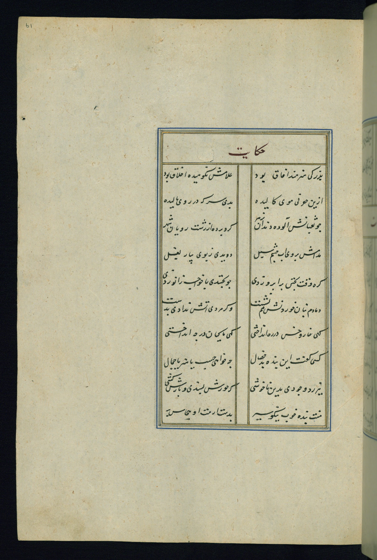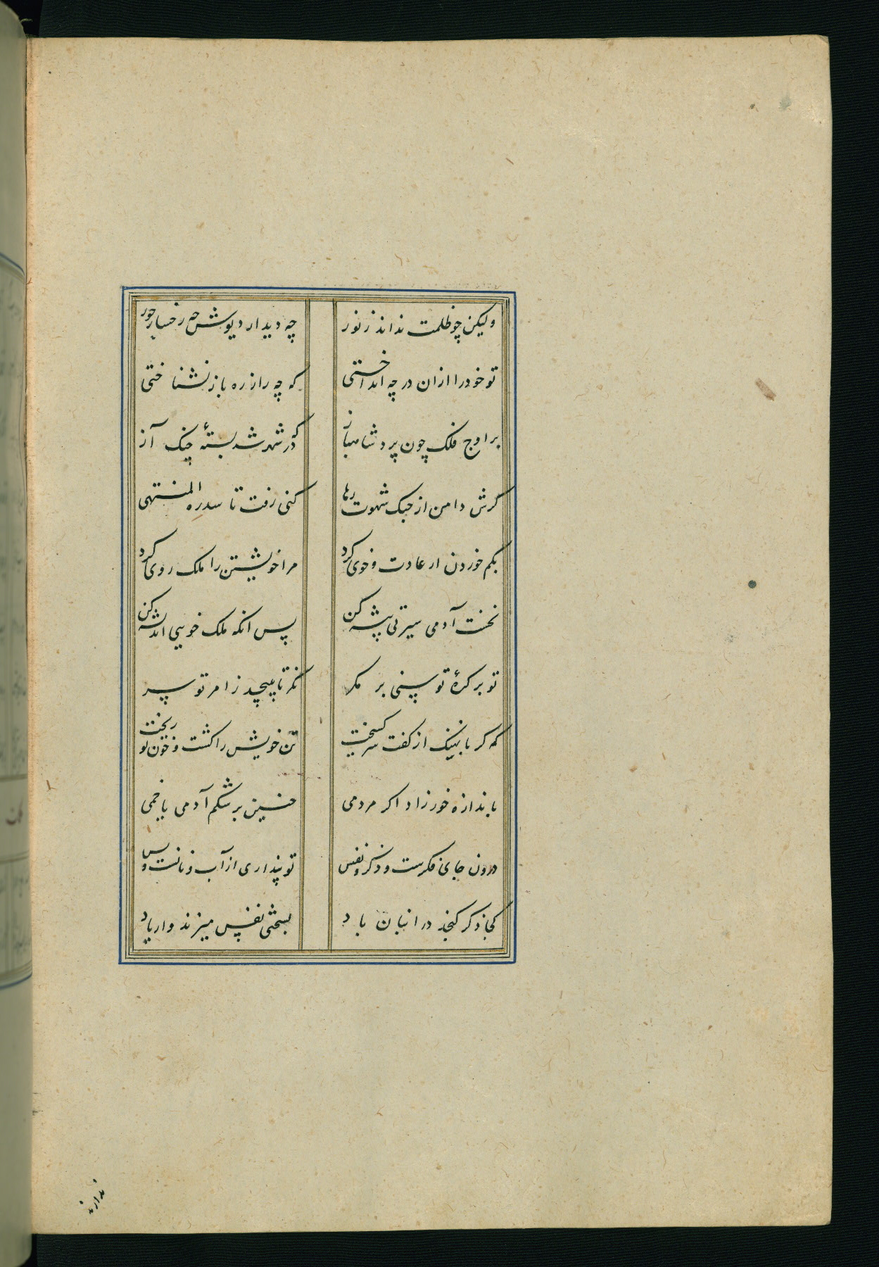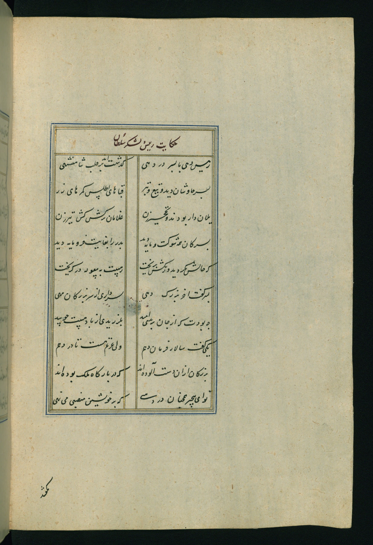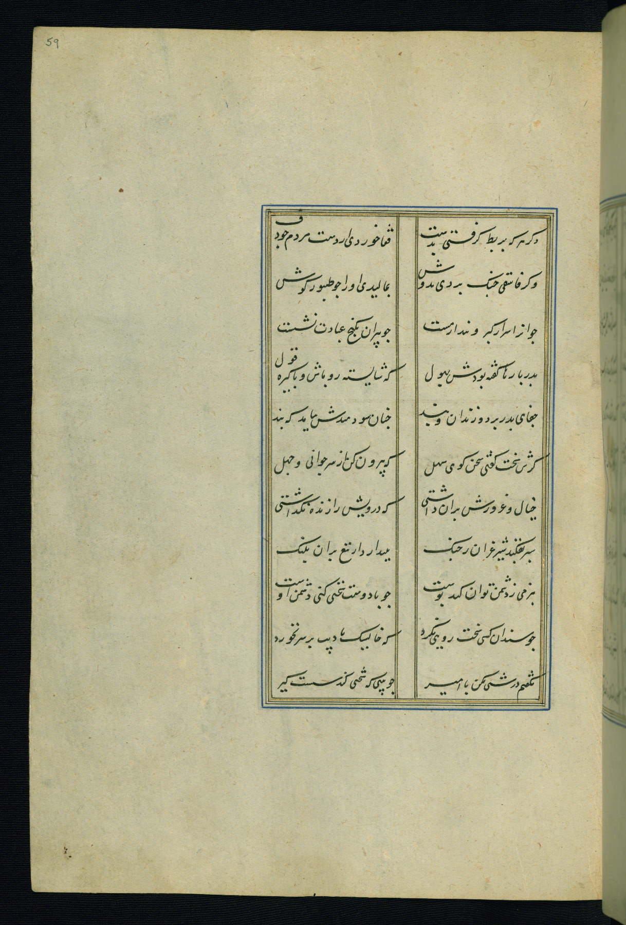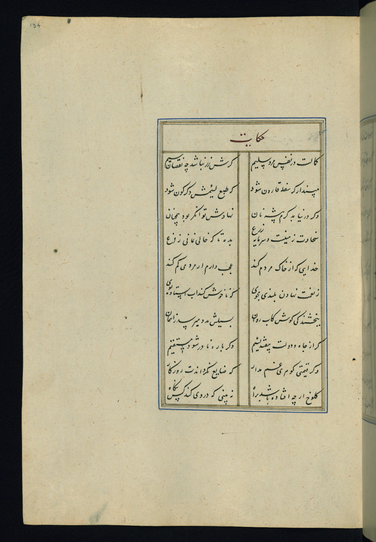This is an illuminated and illustrated Safavid copy of the Būstān (The garden or The orchard), composed by Sa’dī (d. 691 AH / 1292 CE). It was written in black nasta’līq script in the ninth century AH / sixteenth CE in Iran. The codex opens with a frontispiece with the title Kitāb-i būstān inscribed in an illuminated medallion (fol. 1a), followed by a double-page illustration of a banquet scene in a landscape (fols. 1b-2a). Additionally, there are five paintings illustrating the text (fols. 25a, 55b, 58a, 93b, and 119b). The brown leather, blind-stamped binding decorated with a central oval and pendants is not contemporary with the manuscript.