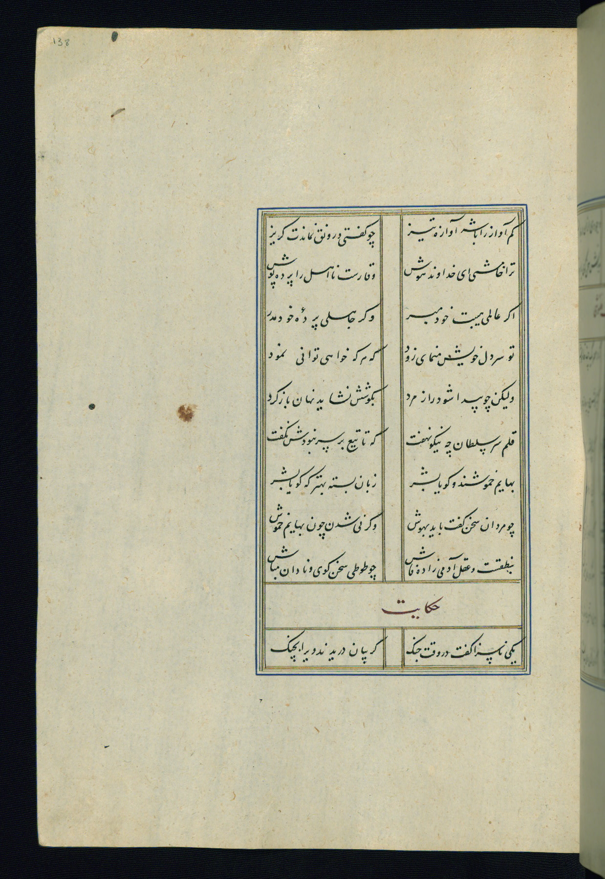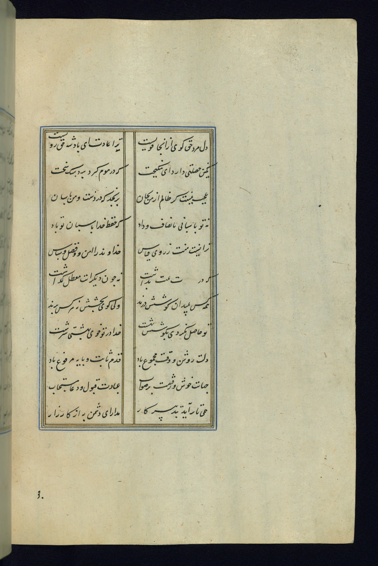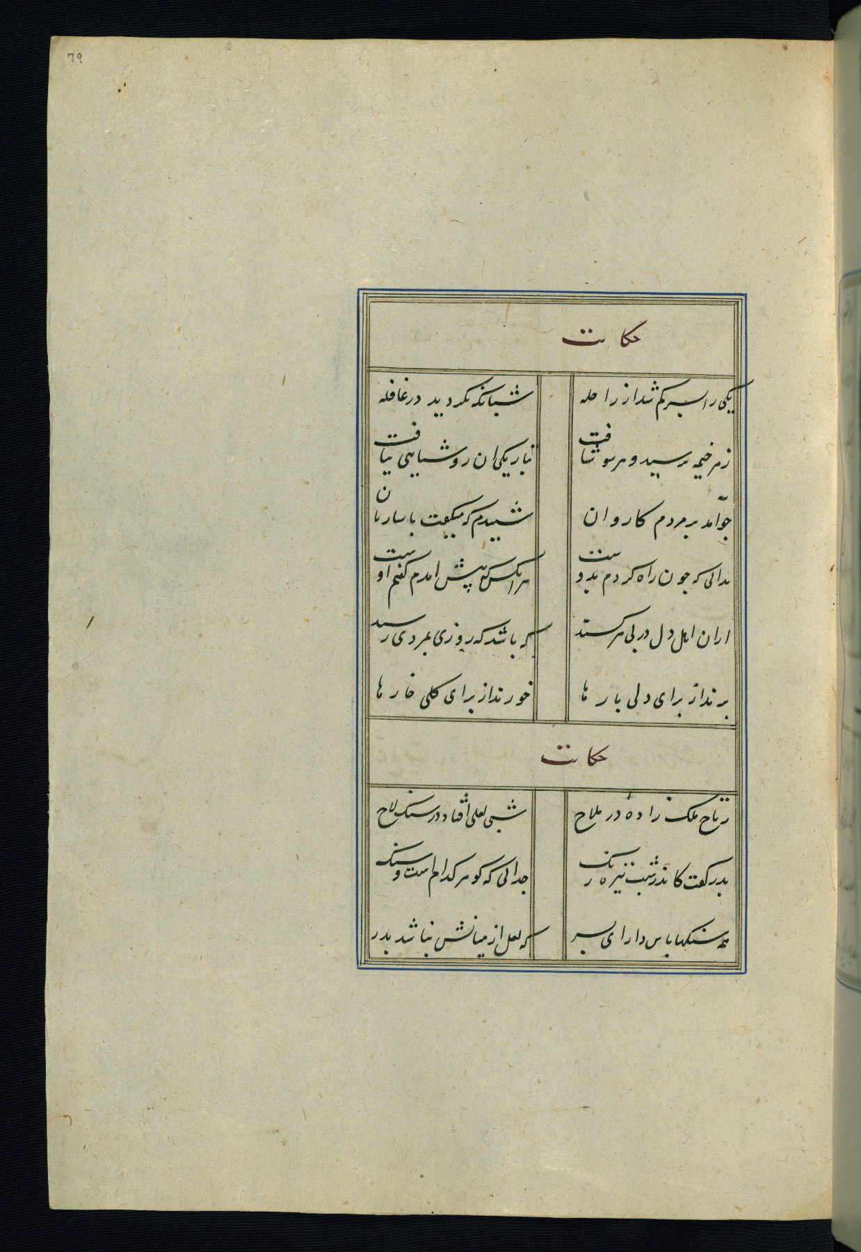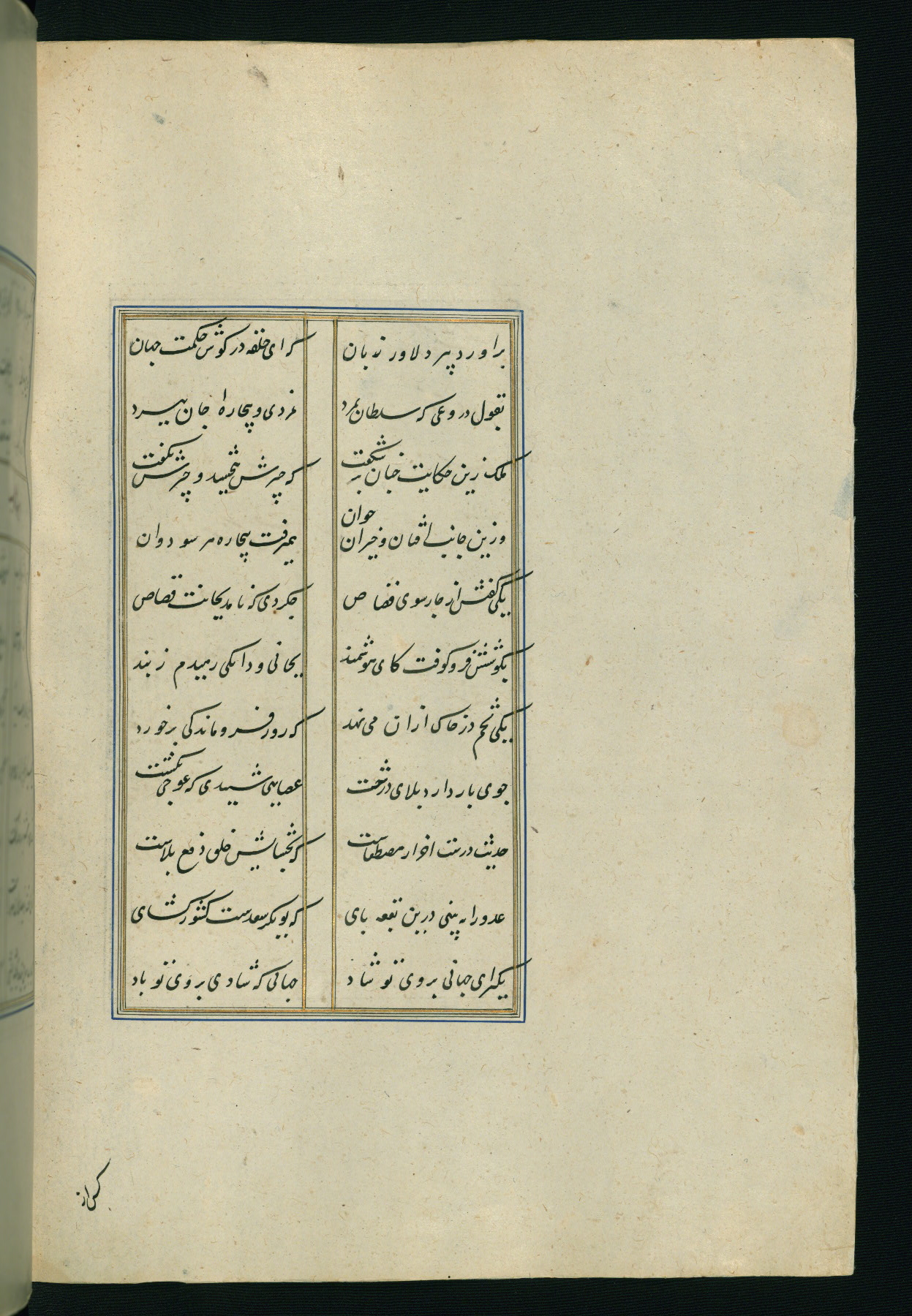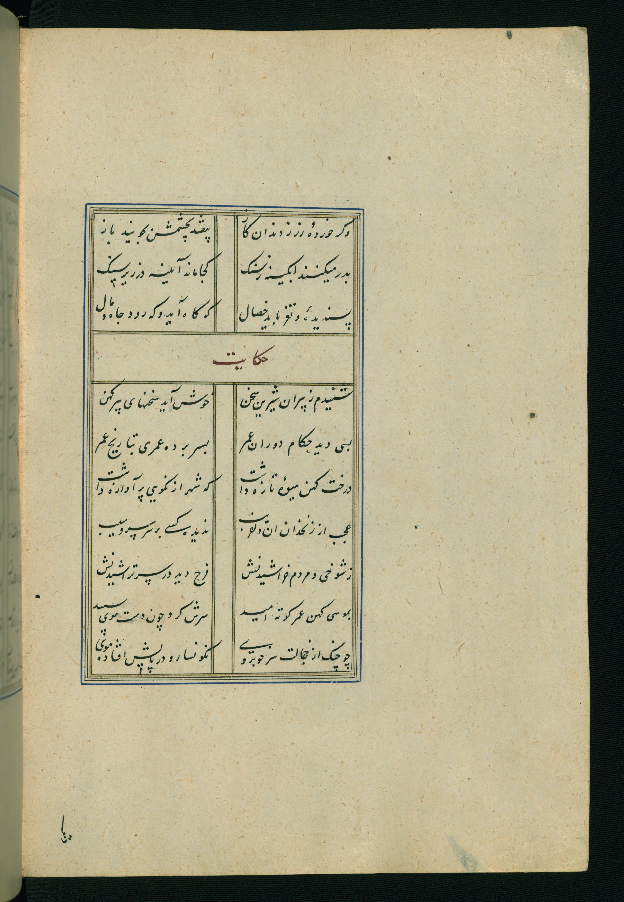 This is an illuminated and illustrated Safavid copy of the Būstān (The garden or The orchard), composed by Sa’dī (d. 691 AH / 1292 CE). It was written in black nasta’līq script in the ninth century AH / sixteenth CE in Iran. The codex opens with a frontispiece with the title Kitāb-i būstān inscribed in an illuminated medallion (fol. 1a), followed by a double-page illustration of a banquet scene in a landscape (fols. 1b-2a). Additionally, there are five paintings illustrating the text (fols. 25a, 55b, 58a, 93b, and 119b). The brown leather, blind-stamped binding decorated with a central oval and pendants is not contemporary with the manuscript.