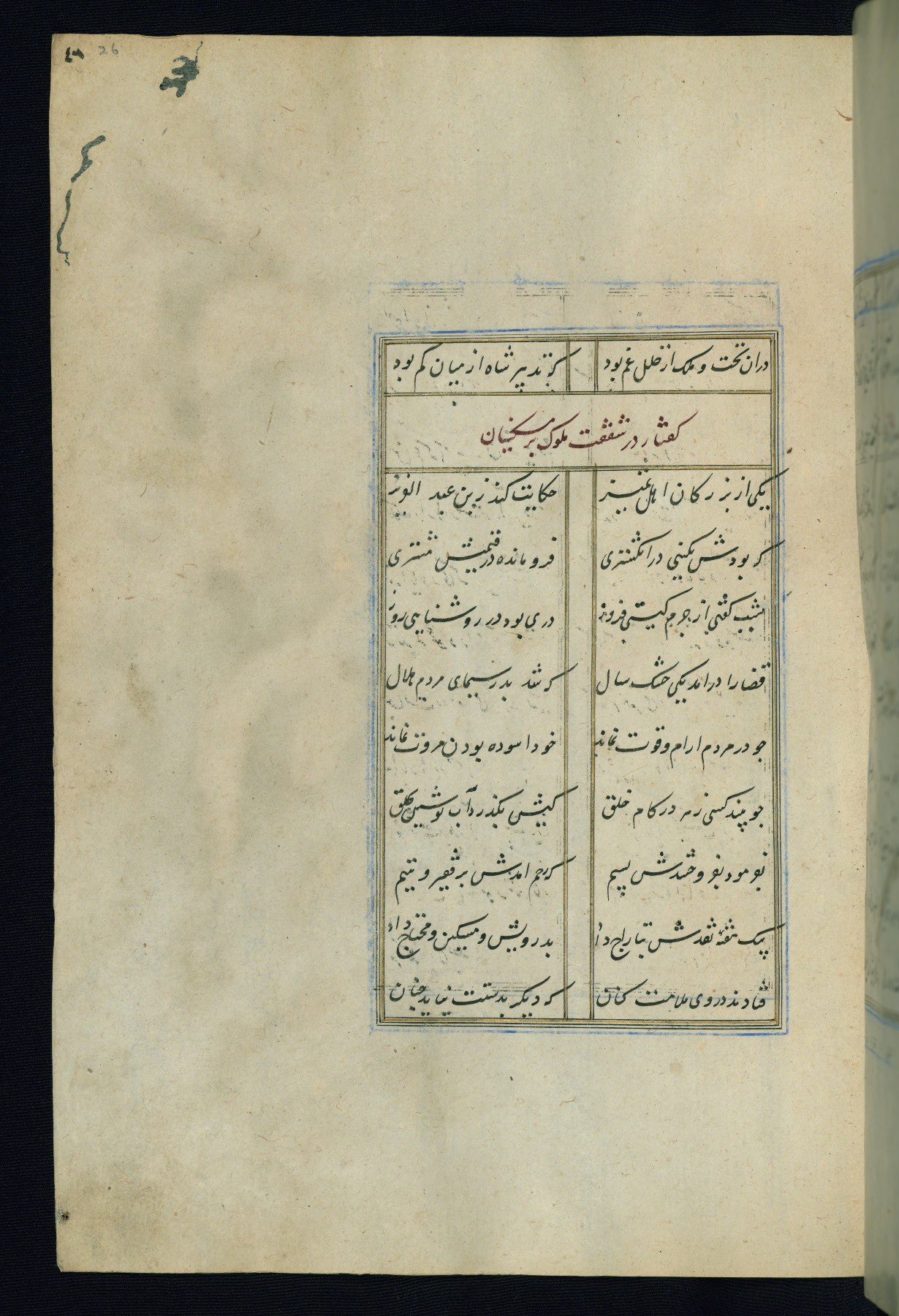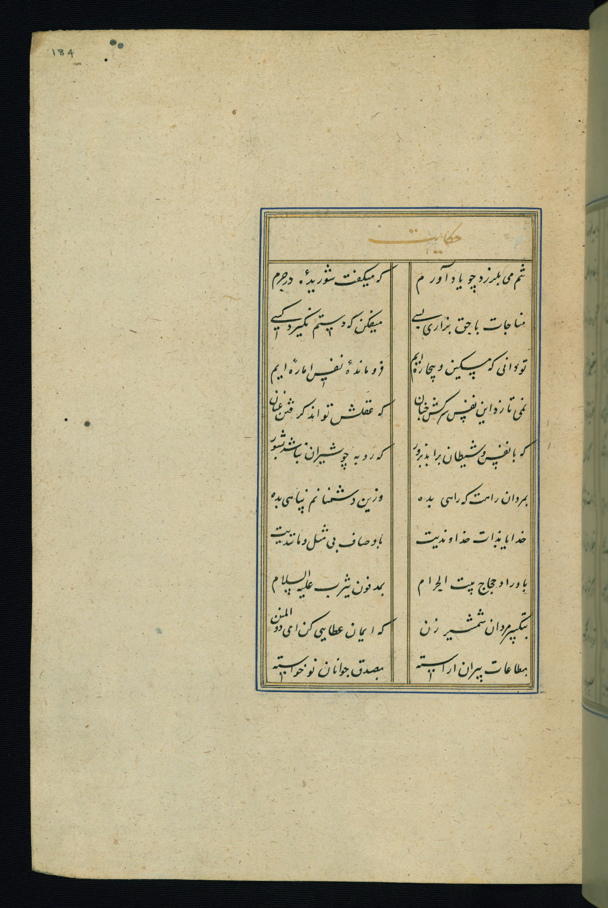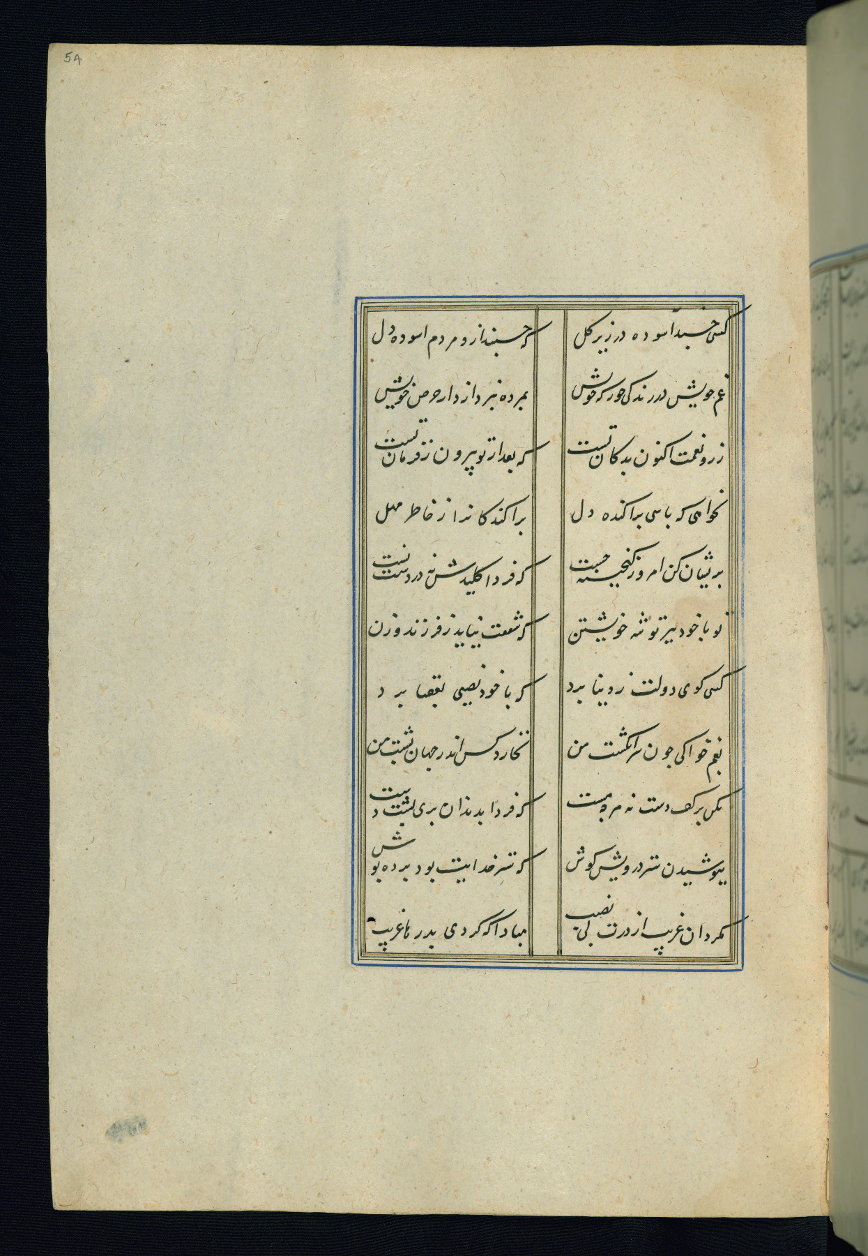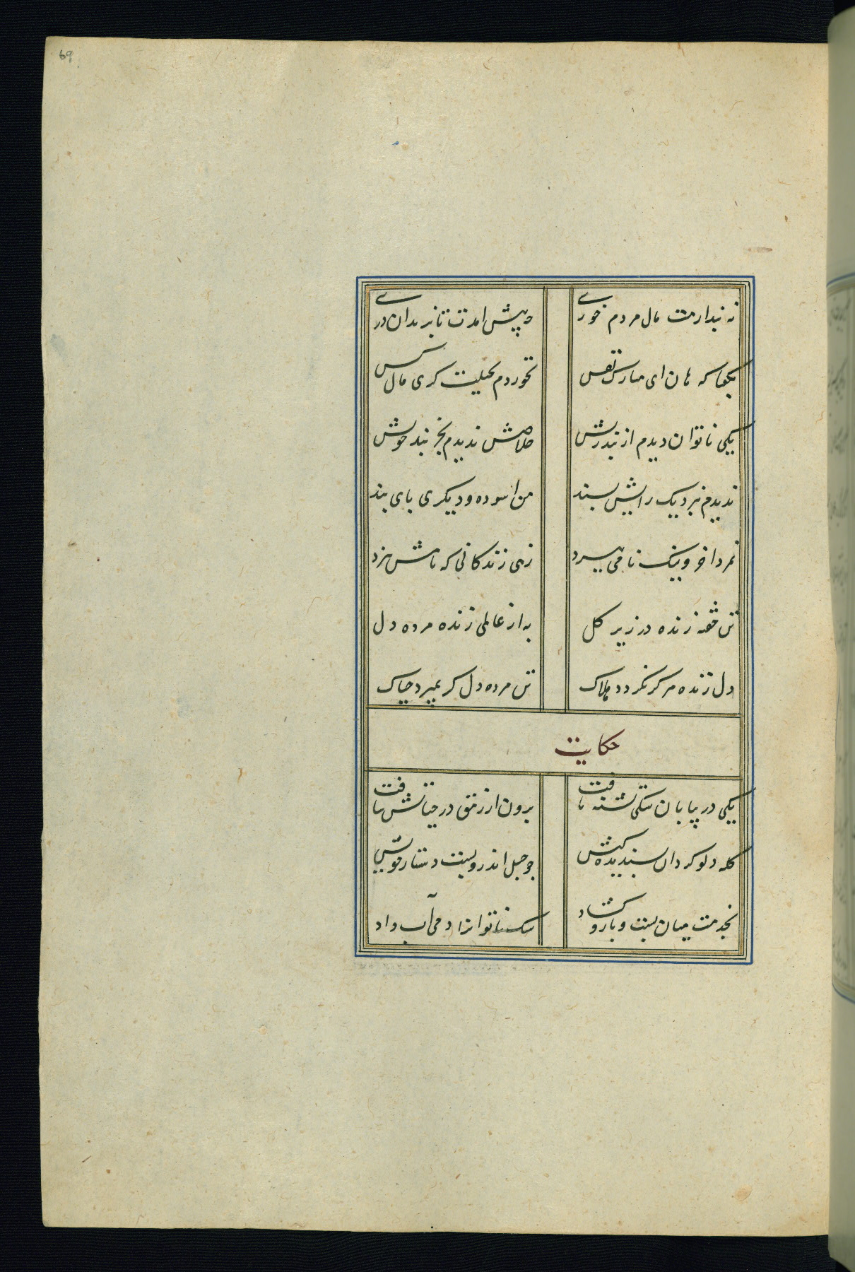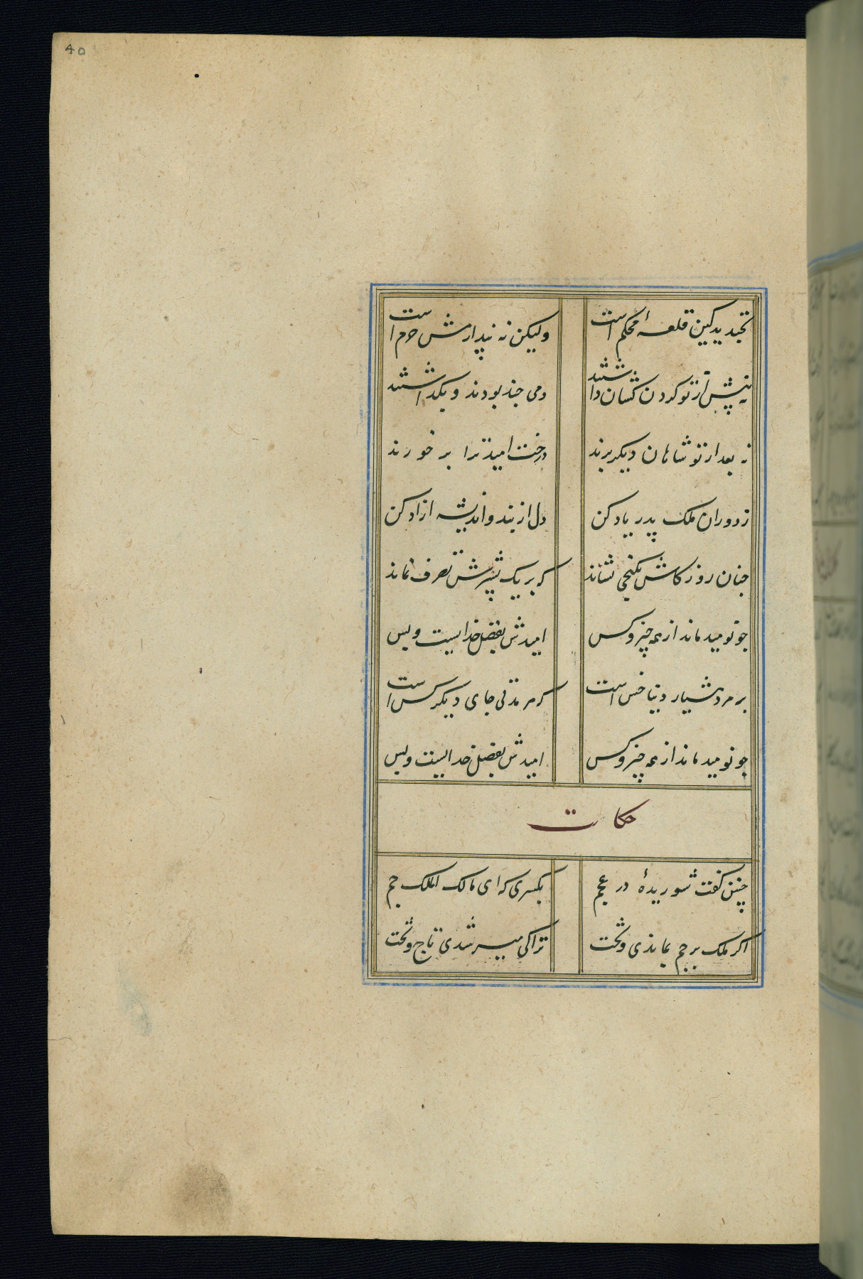 This is an illuminated and illustrated Safavid copy of the Būstān (The garden or The orchard), composed by Sa’dī (d. 691 AH / 1292 CE). It was written in black nasta’līq script in the ninth century AH / sixteenth CE in Iran. The codex opens with a frontispiece with the title Kitāb-i būstān inscribed in an illuminated medallion (fol. 1a), followed by a double-page illustration of a banquet scene in a landscape (fols. 1b-2a). Additionally, there are five paintings illustrating the text (fols. 25a, 55b, 58a, 93b, and 119b). The brown leather, blind-stamped binding decorated with a central oval and pendants is not contemporary with the manuscript.