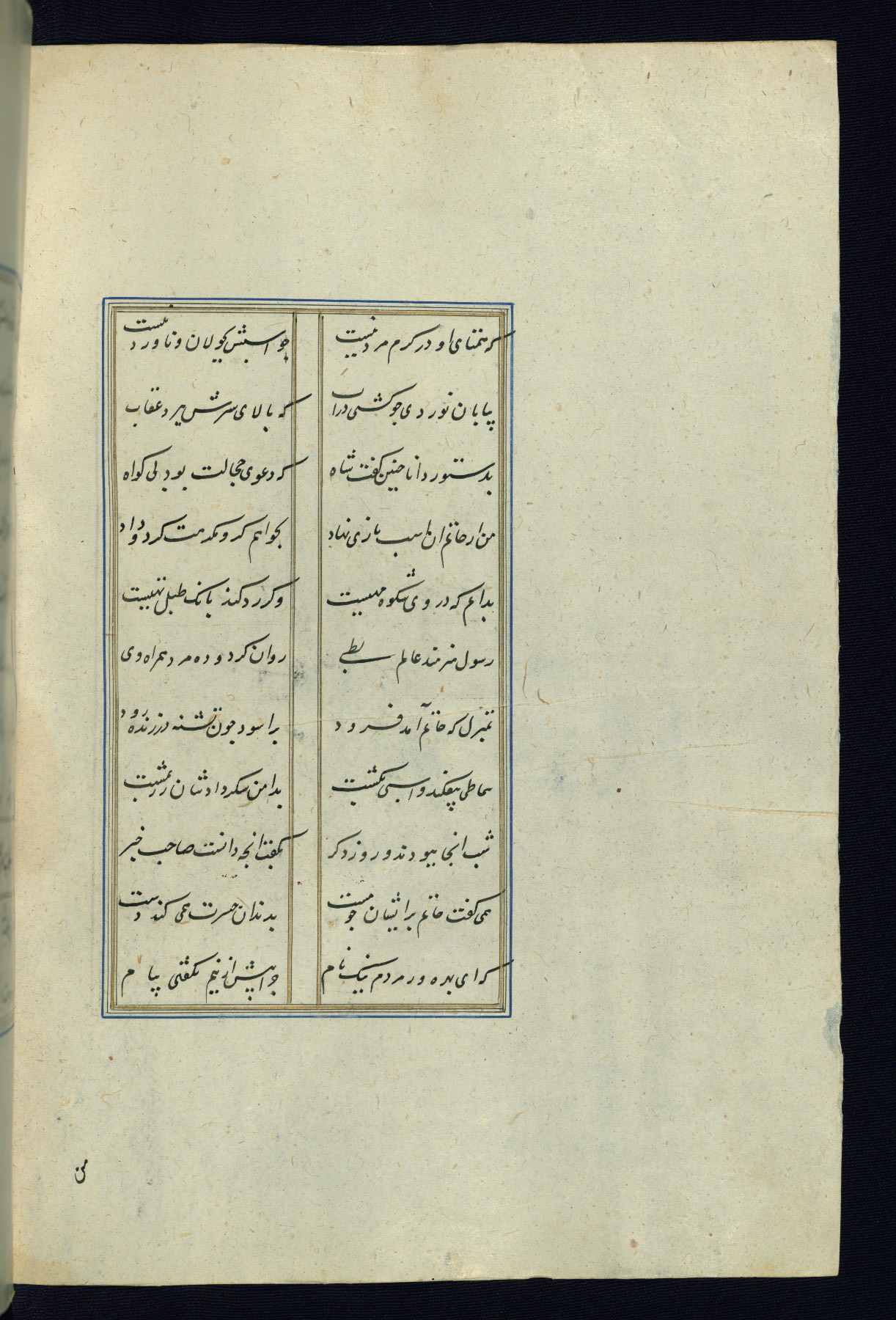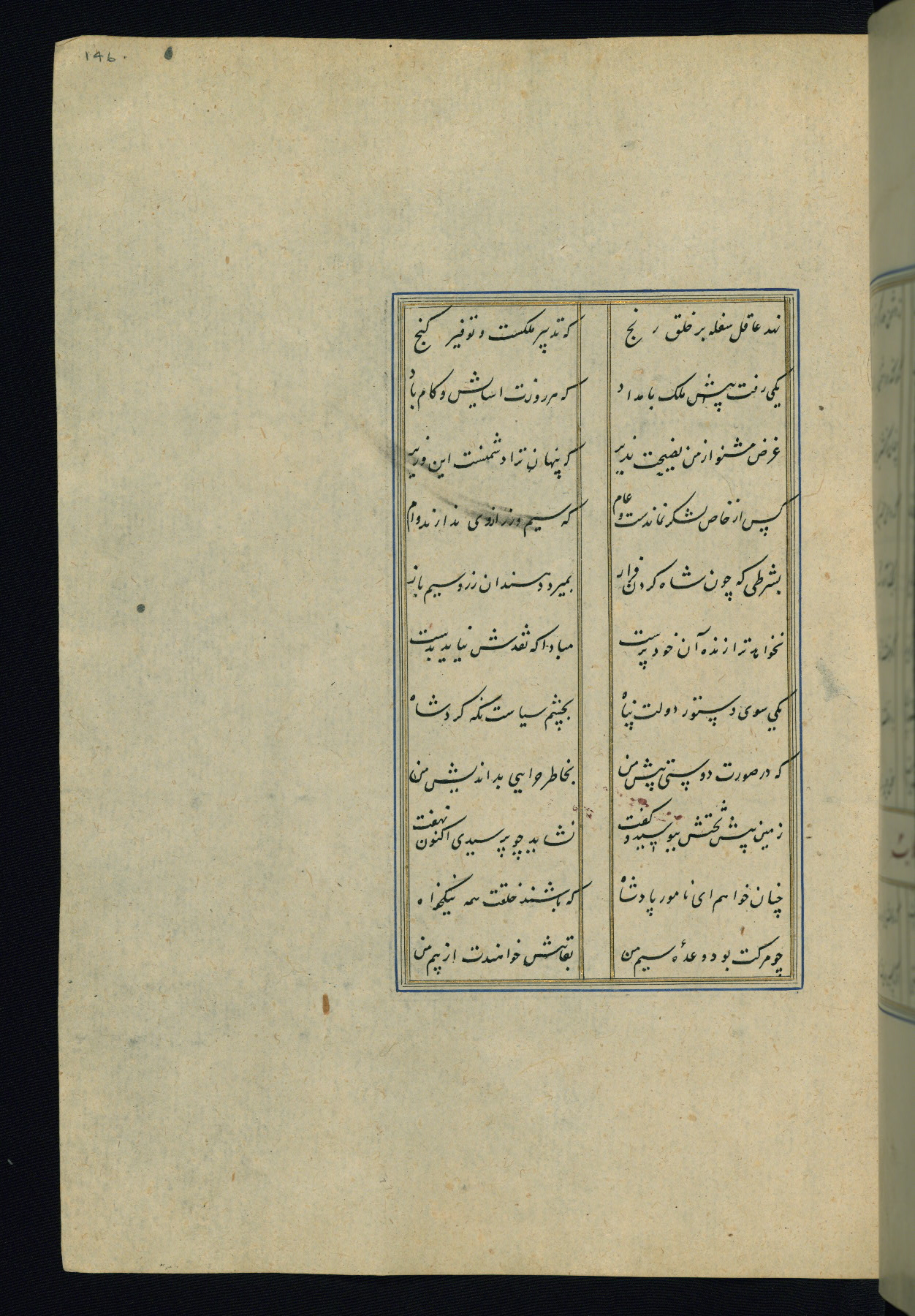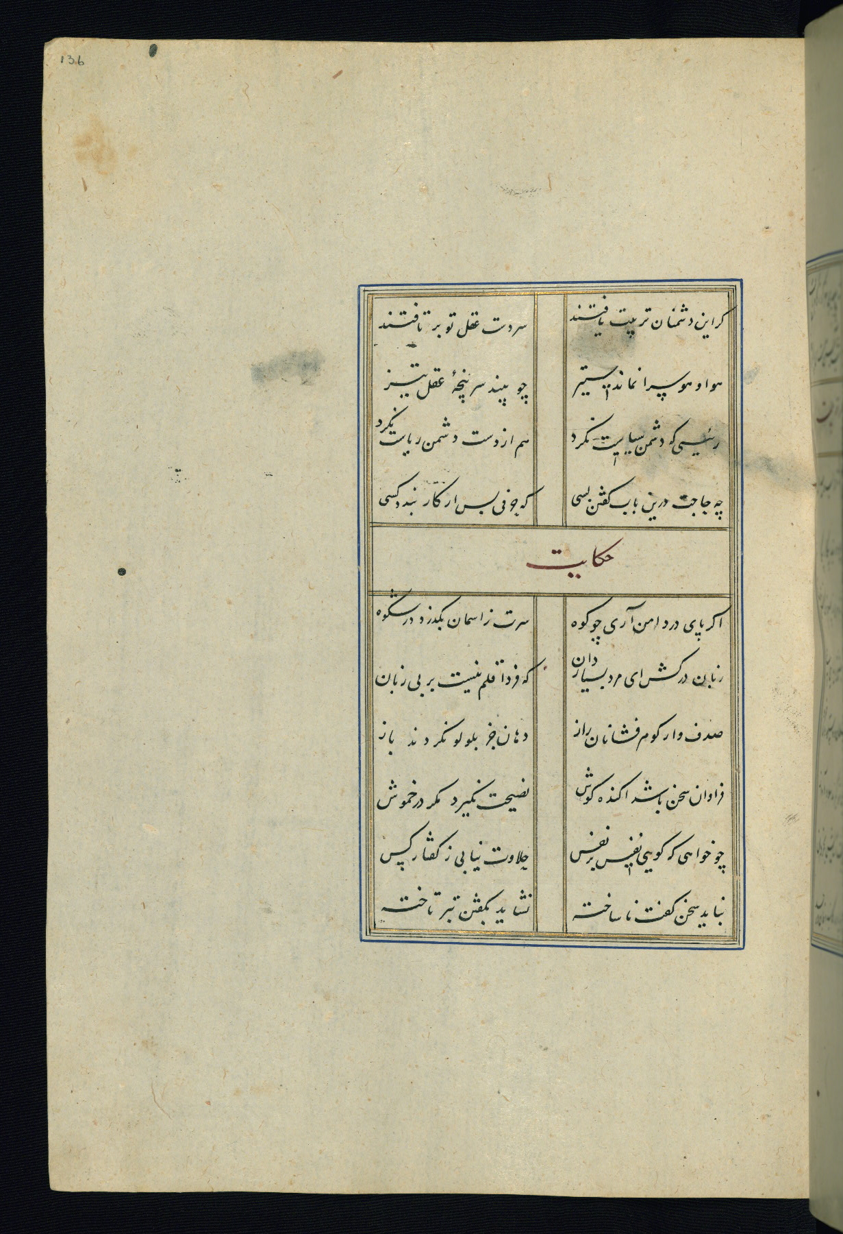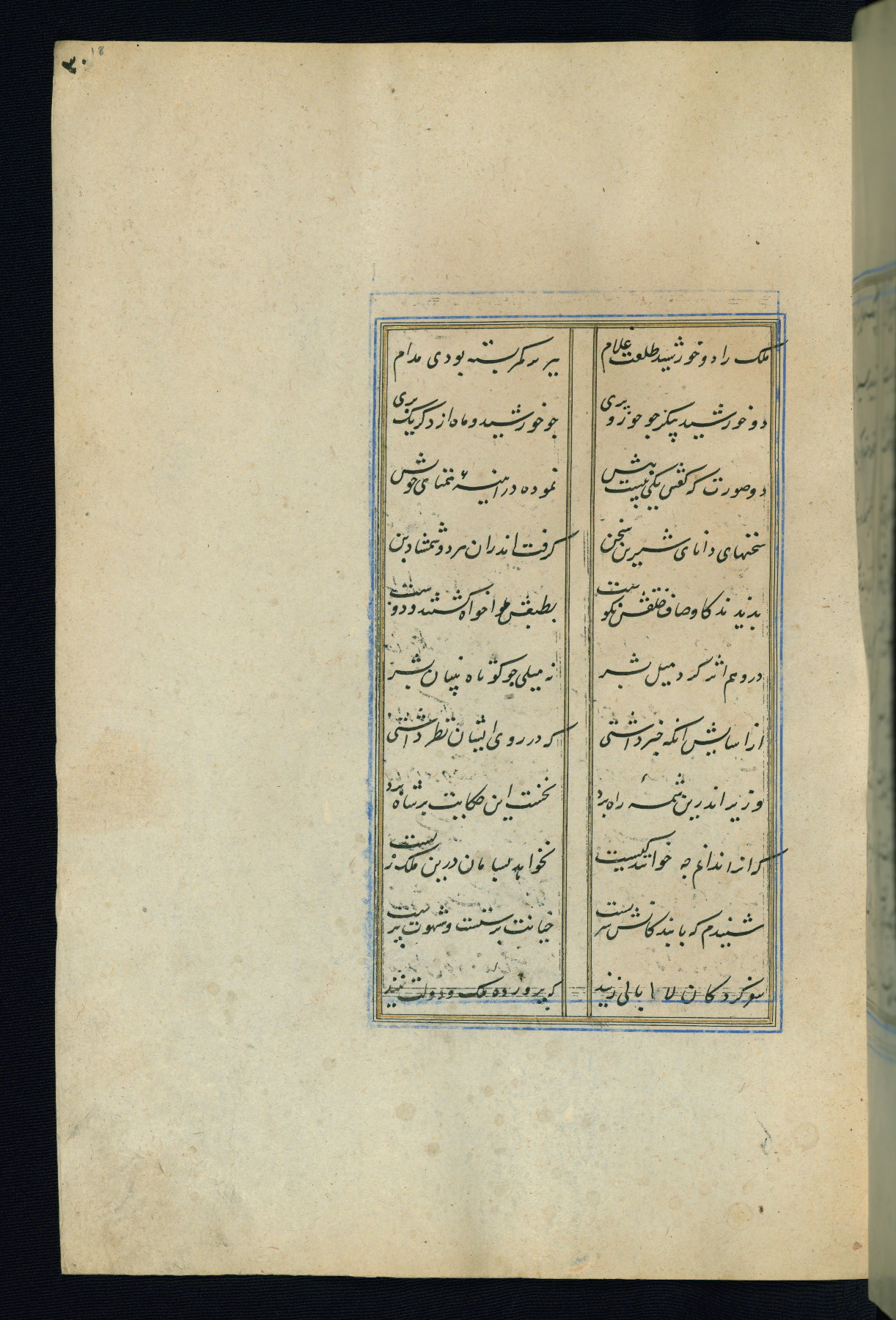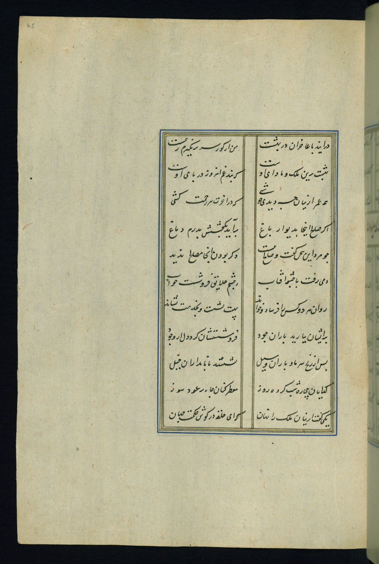 This is an illuminated and illustrated Safavid copy of the Būstān (The garden or The orchard), composed by Sa’dī (d. 691 AH / 1292 CE). It was written in black nasta’līq script in the ninth century AH / sixteenth CE in Iran. The codex opens with a frontispiece with the title Kitāb-i būstān inscribed in an illuminated medallion (fol. 1a), followed by a double-page illustration of a banquet scene in a landscape (fols. 1b-2a). Additionally, there are five paintings illustrating the text (fols. 25a, 55b, 58a, 93b, and 119b). The brown leather, blind-stamped binding decorated with a central oval and pendants is not contemporary with the manuscript.