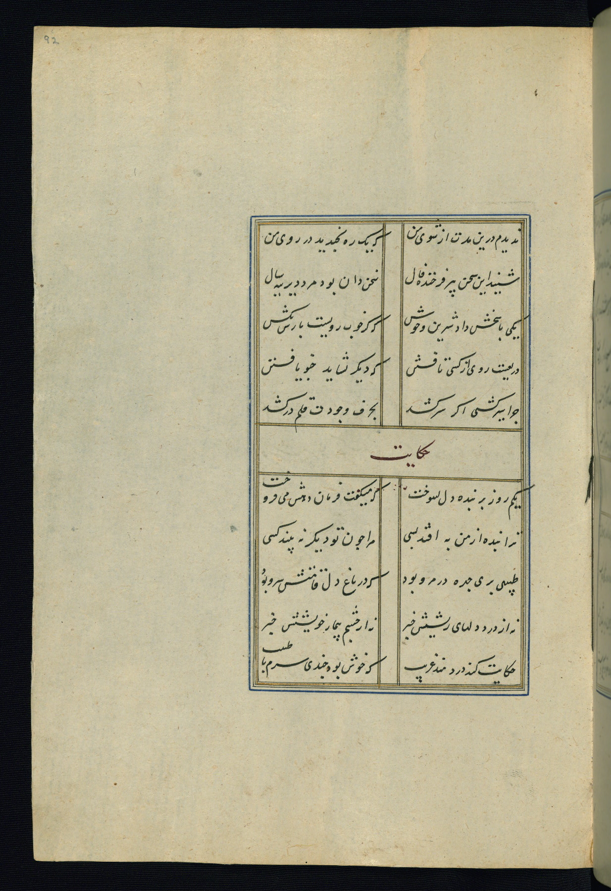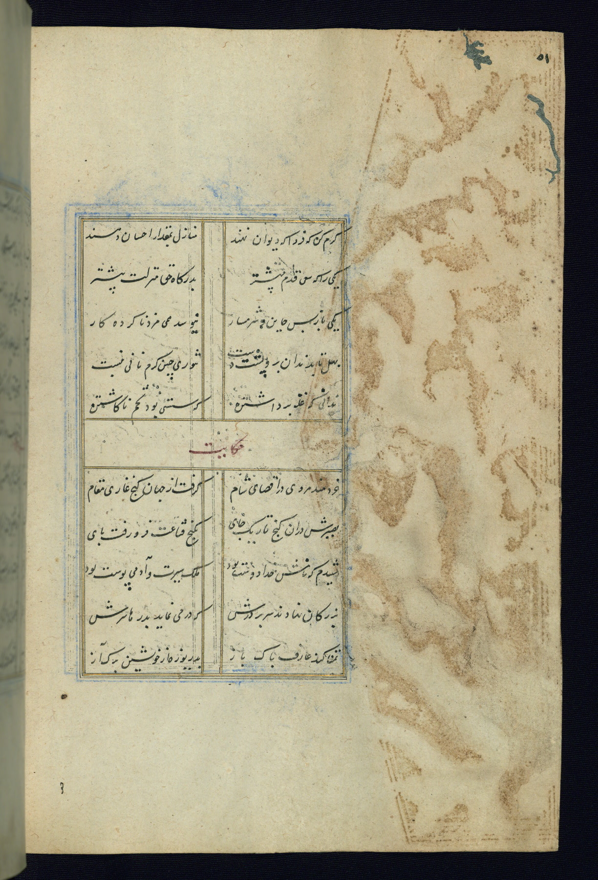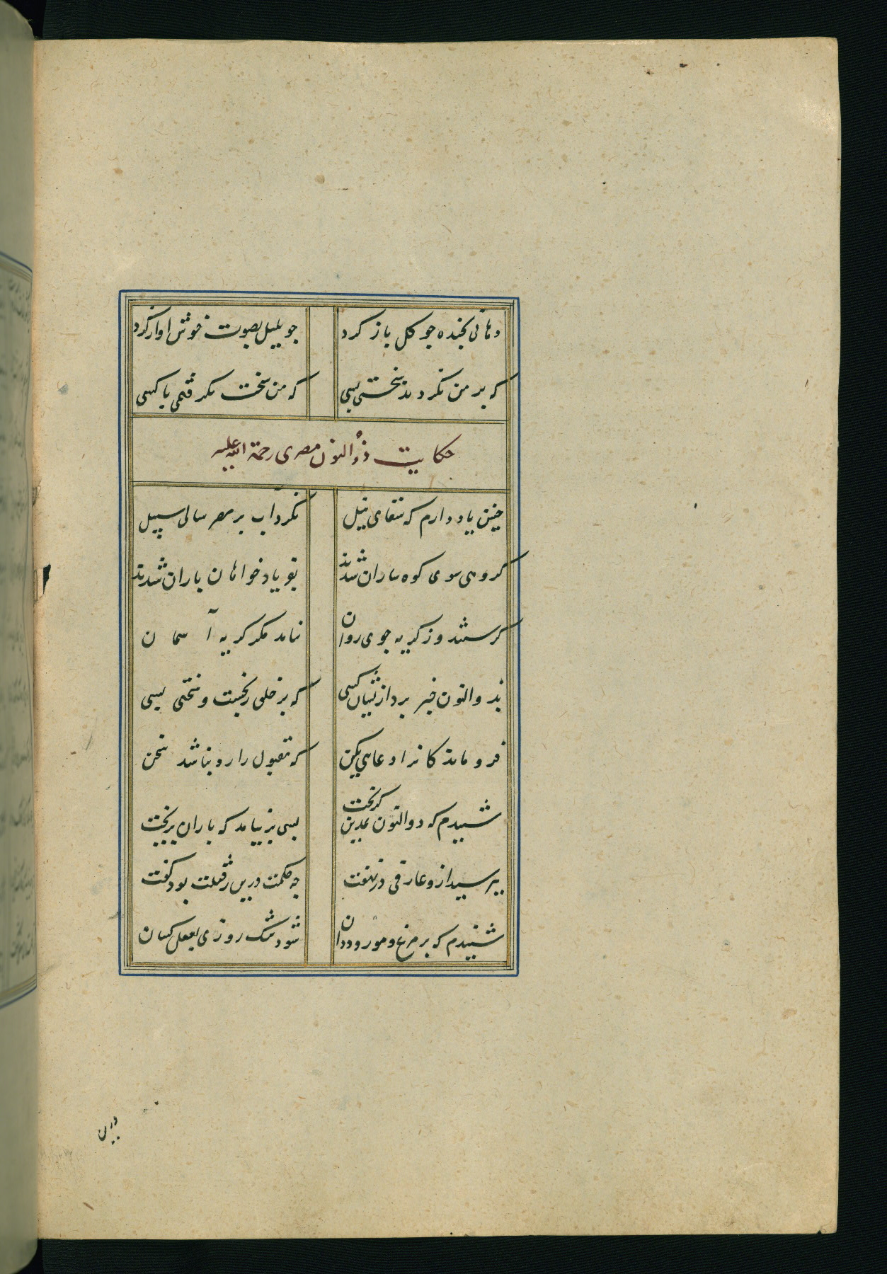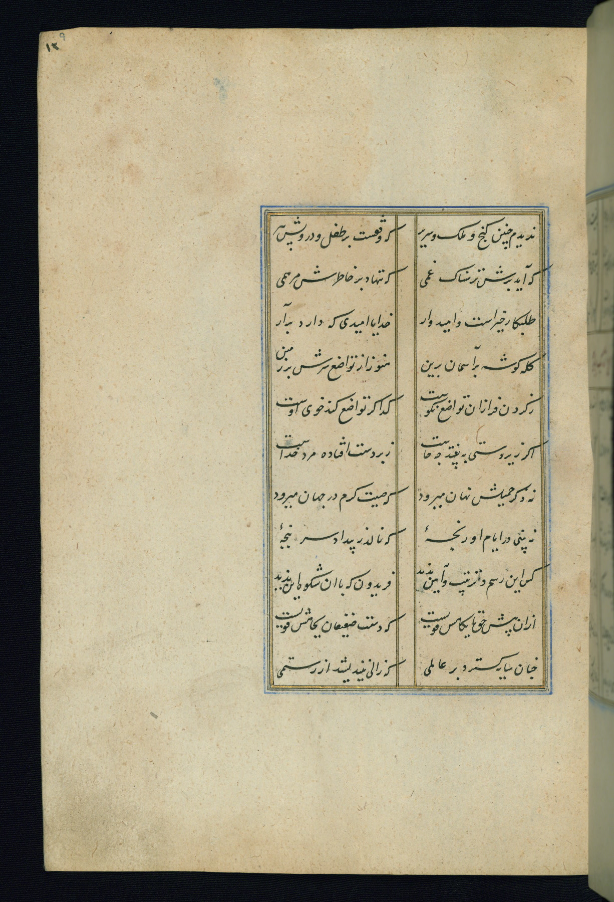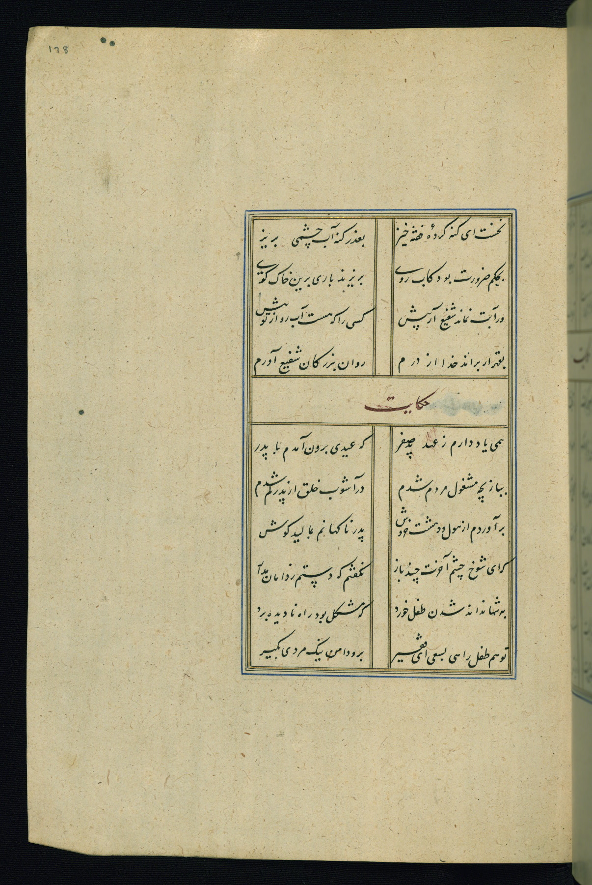 This is an illuminated and illustrated Safavid copy of the Būstān (The garden or The orchard), composed by Sa’dī (d. 691 AH / 1292 CE). It was written in black nasta’līq script in the ninth century AH / sixteenth CE in Iran. The codex opens with a frontispiece with the title Kitāb-i būstān inscribed in an illuminated medallion (fol. 1a), followed by a double-page illustration of a banquet scene in a landscape (fols. 1b-2a). Additionally, there are five paintings illustrating the text (fols. 25a, 55b, 58a, 93b, and 119b). The brown leather, blind-stamped binding decorated with a central oval and pendants is not contemporary with the manuscript.