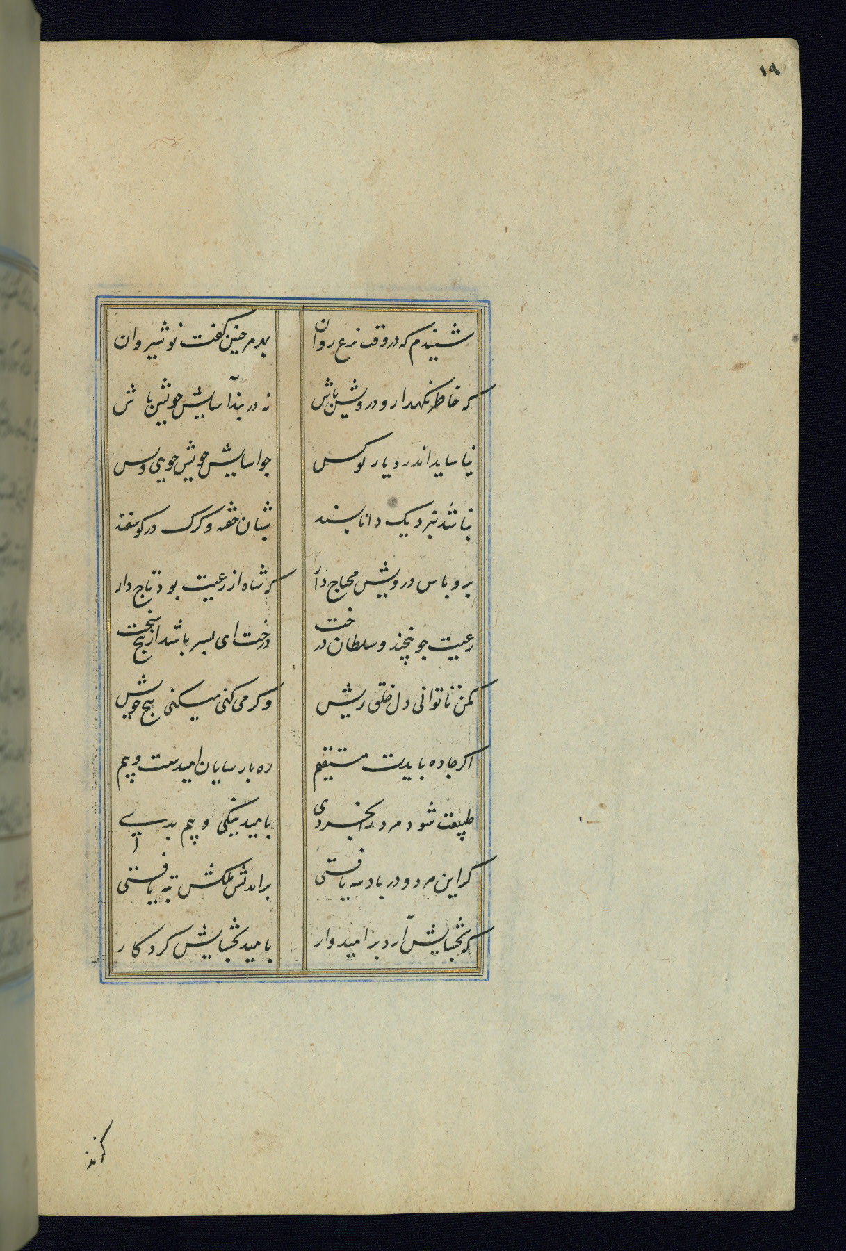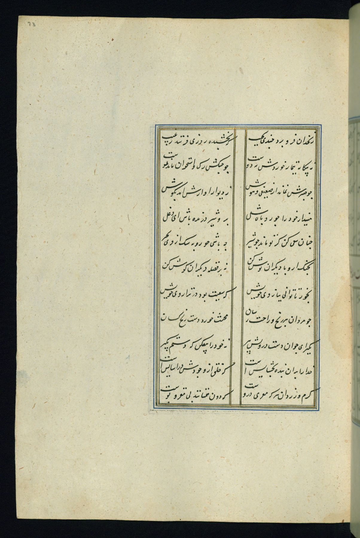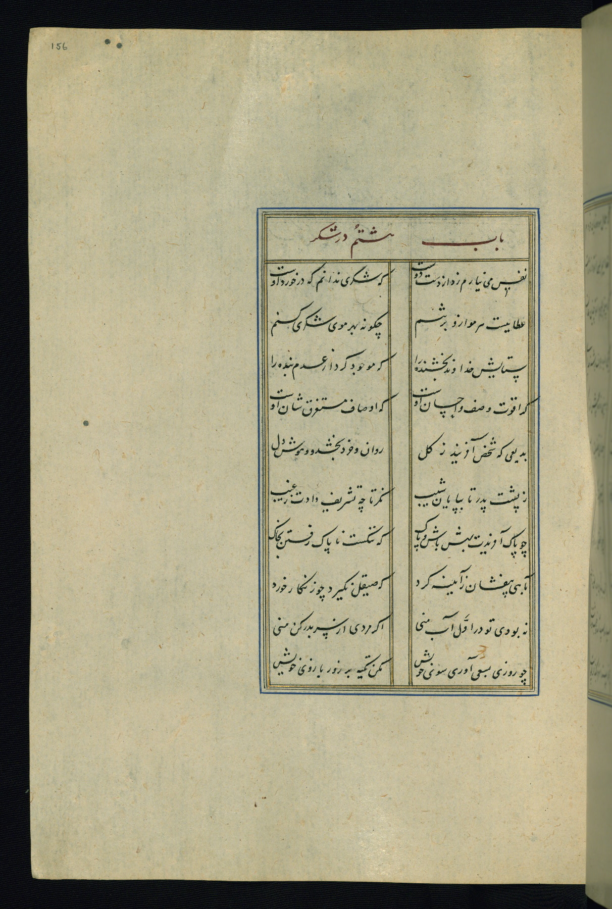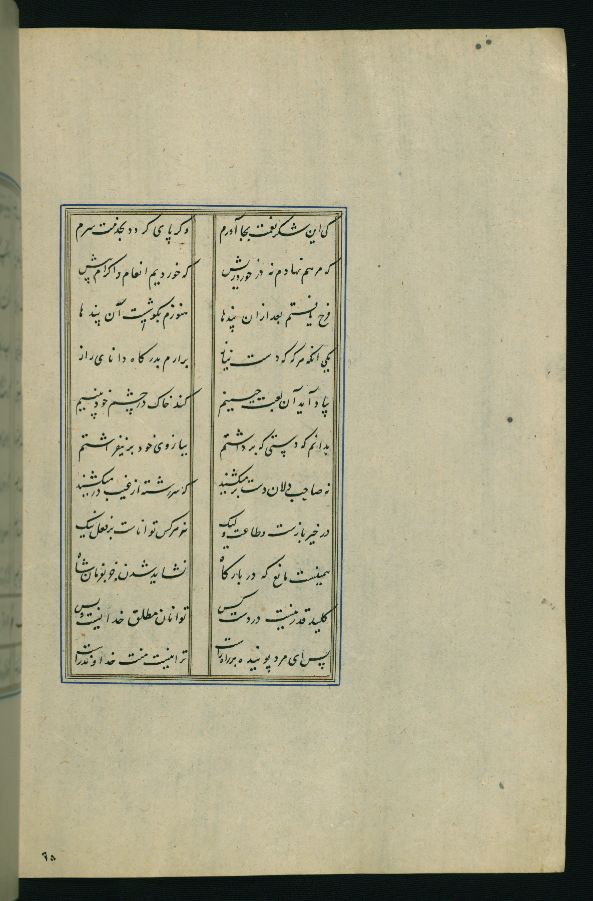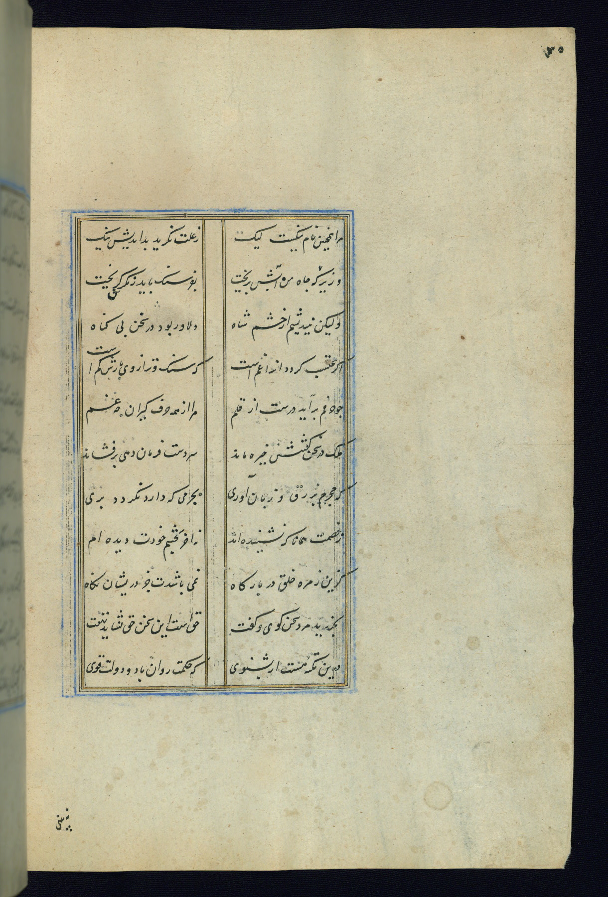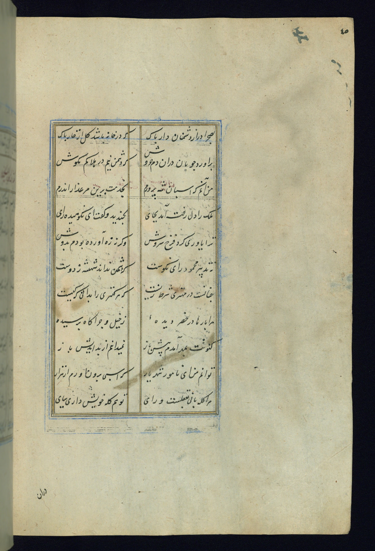 This is an illuminated and illustrated Safavid copy of the Būstān (The garden or The orchard), composed by Sa’dī (d. 691 AH / 1292 CE). It was written in black nasta’līq script in the ninth century AH / sixteenth CE in Iran. The codex opens with a frontispiece with the title Kitāb-i būstān inscribed in an illuminated medallion (fol. 1a), followed by a double-page illustration of a banquet scene in a landscape (fols. 1b-2a). Additionally, there are five paintings illustrating the text (fols. 25a, 55b, 58a, 93b, and 119b). The brown leather, blind-stamped binding decorated with a central oval and pendants is not contemporary with the manuscript.