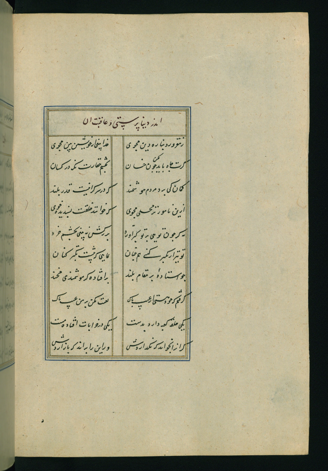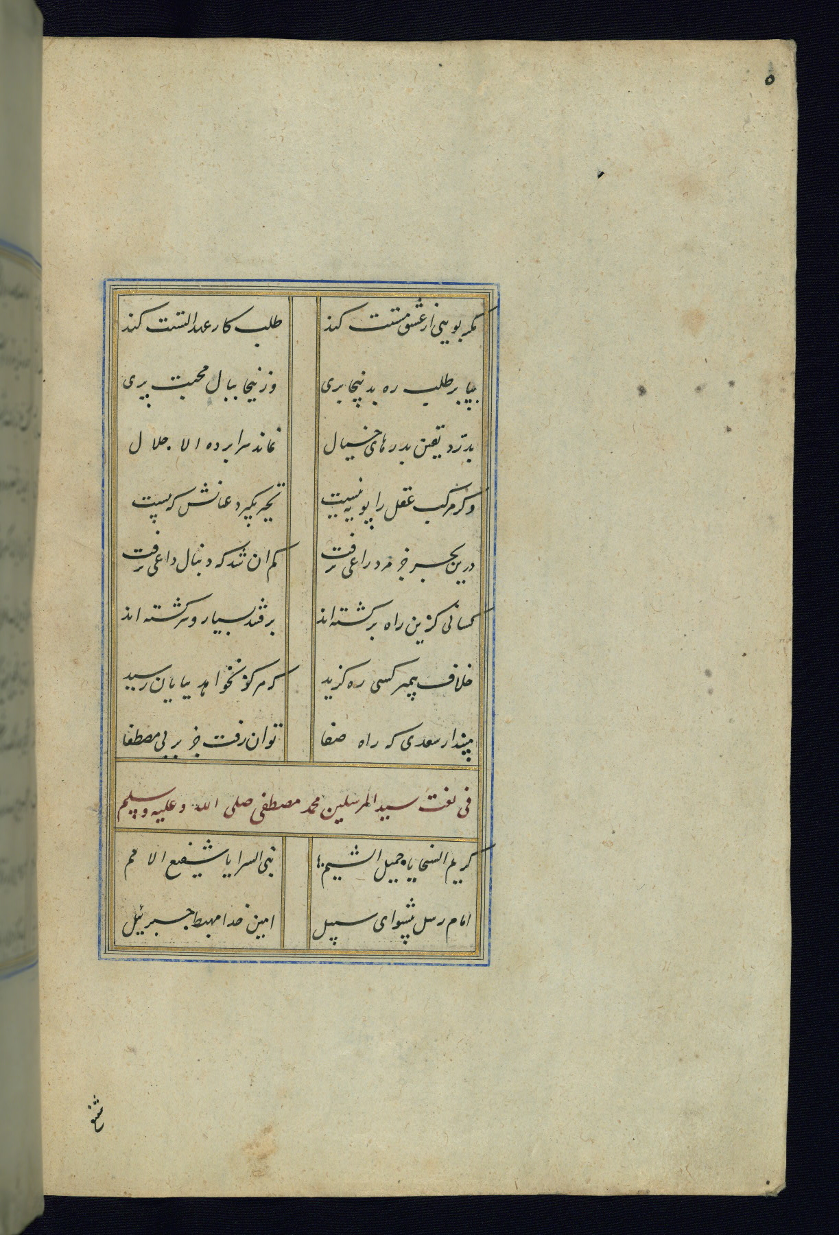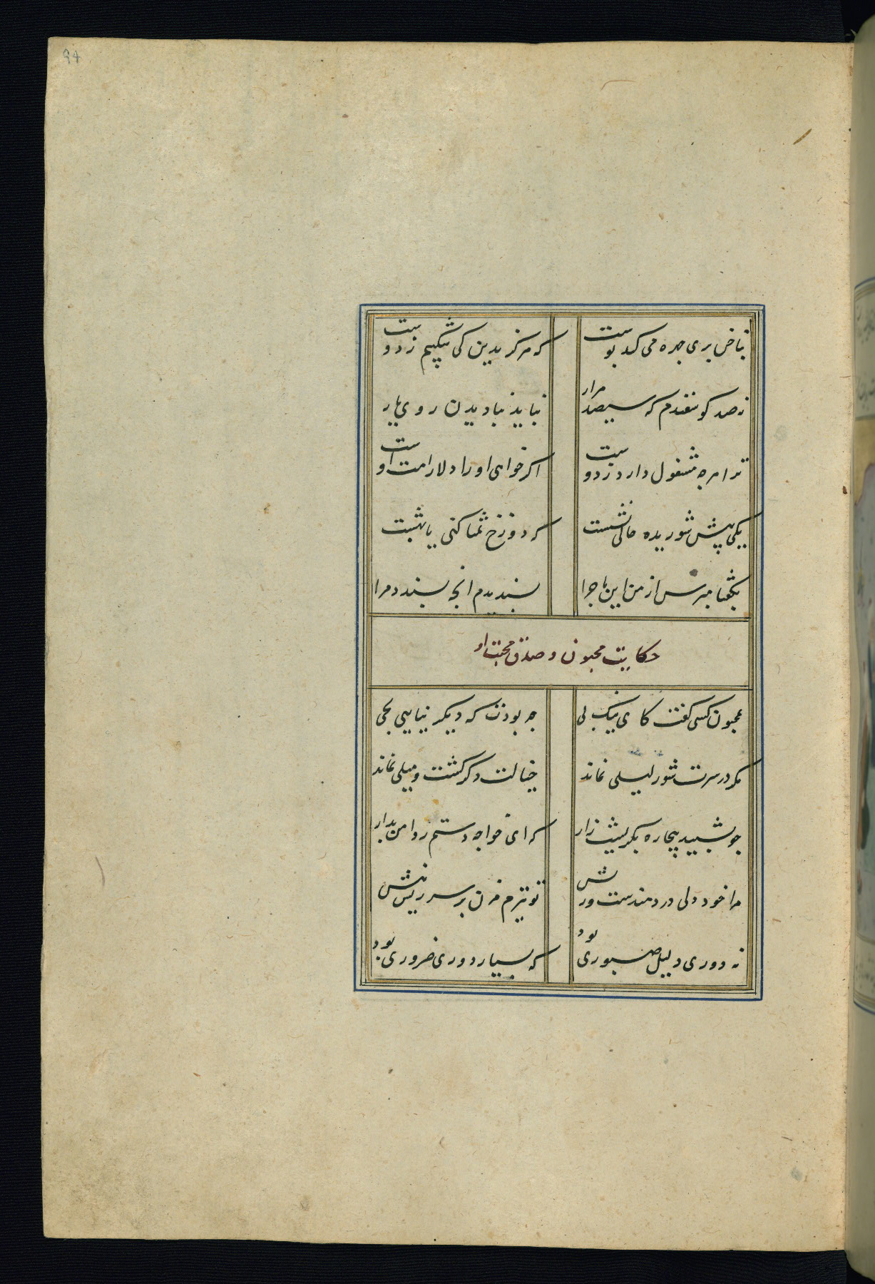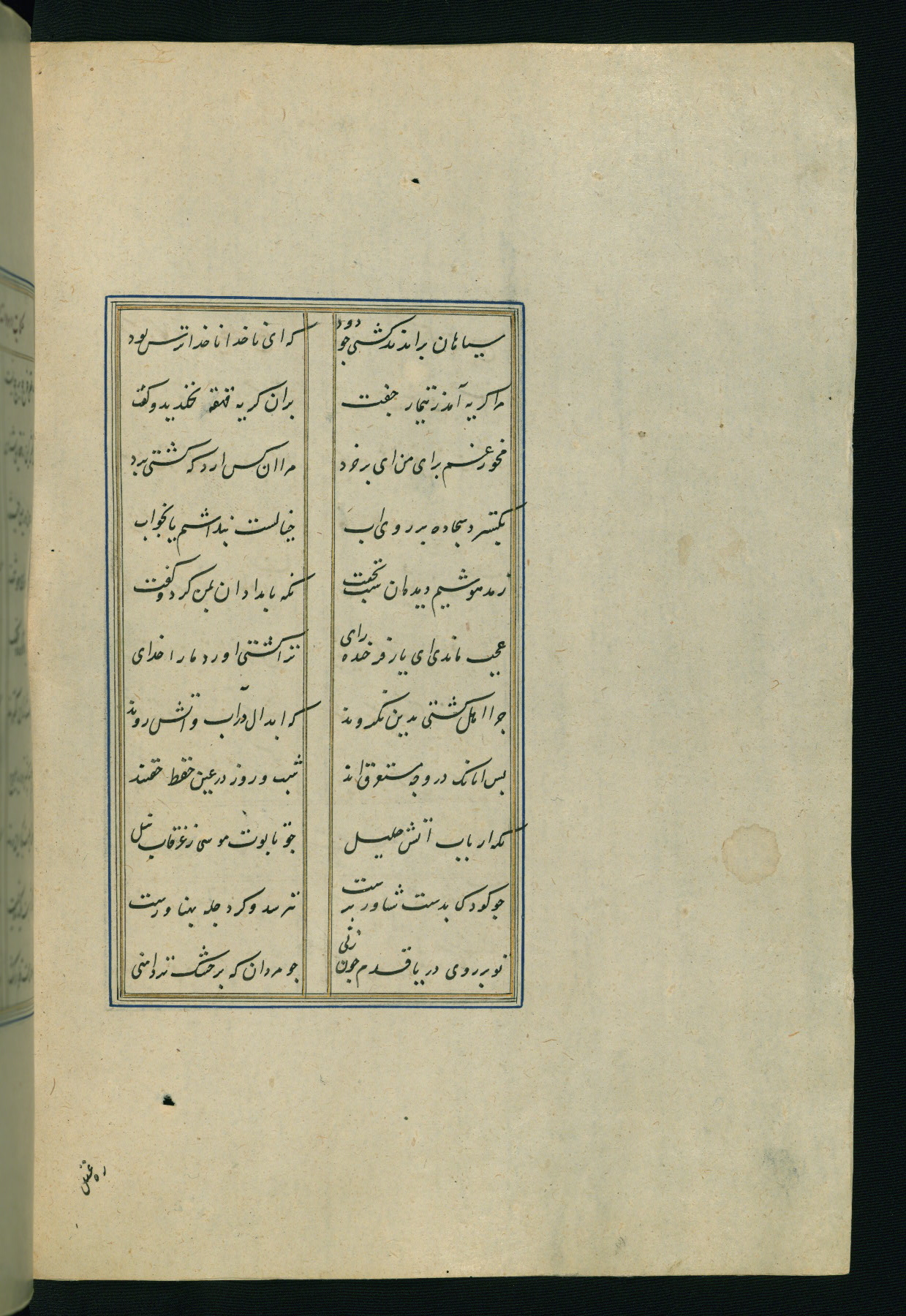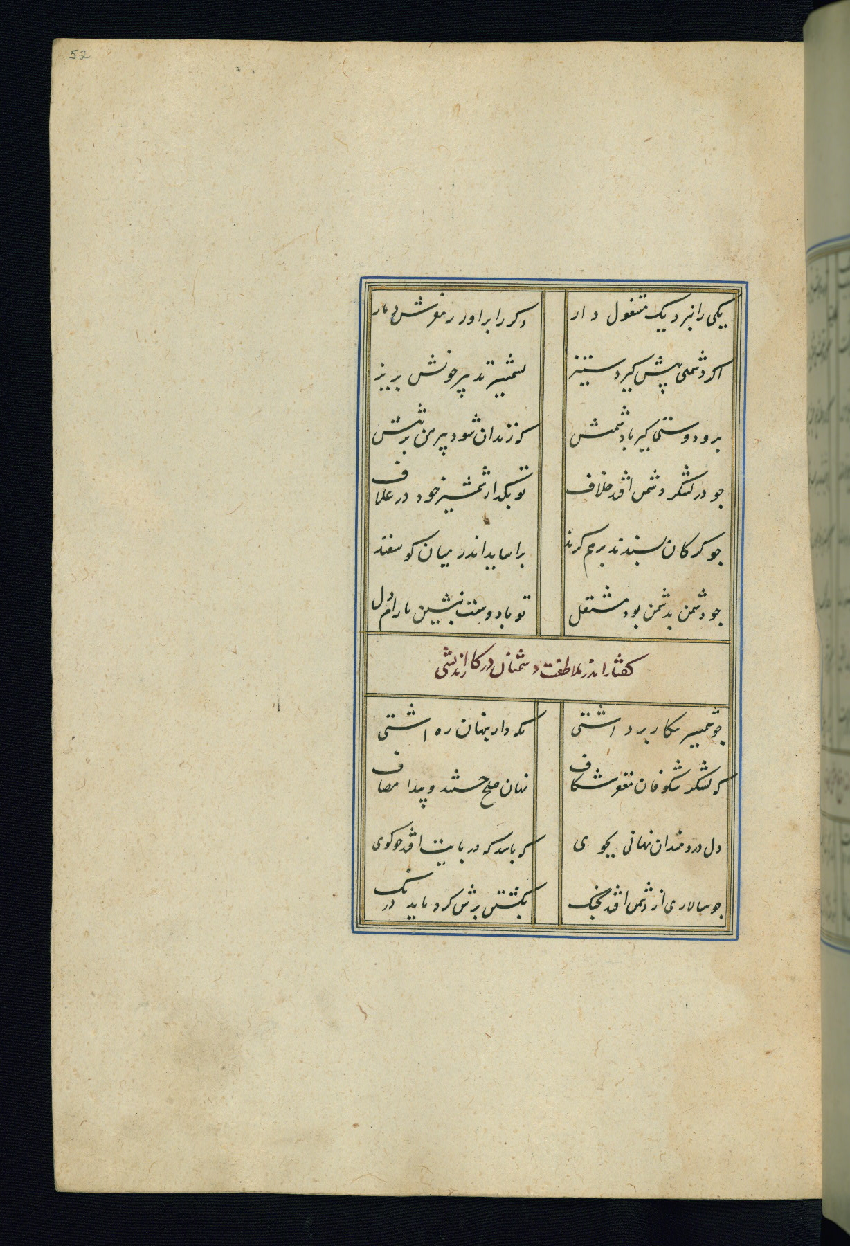 This is an illuminated and illustrated Safavid copy of the Būstān (The garden or The orchard), composed by Sa’dī (d. 691 AH / 1292 CE). It was written in black nasta’līq script in the ninth century AH / sixteenth CE in Iran. The codex opens with a frontispiece with the title Kitāb-i būstān inscribed in an illuminated medallion (fol. 1a), followed by a double-page illustration of a banquet scene in a landscape (fols. 1b-2a). Additionally, there are five paintings illustrating the text (fols. 25a, 55b, 58a, 93b, and 119b). The brown leather, blind-stamped binding decorated with a central oval and pendants is not contemporary with the manuscript.