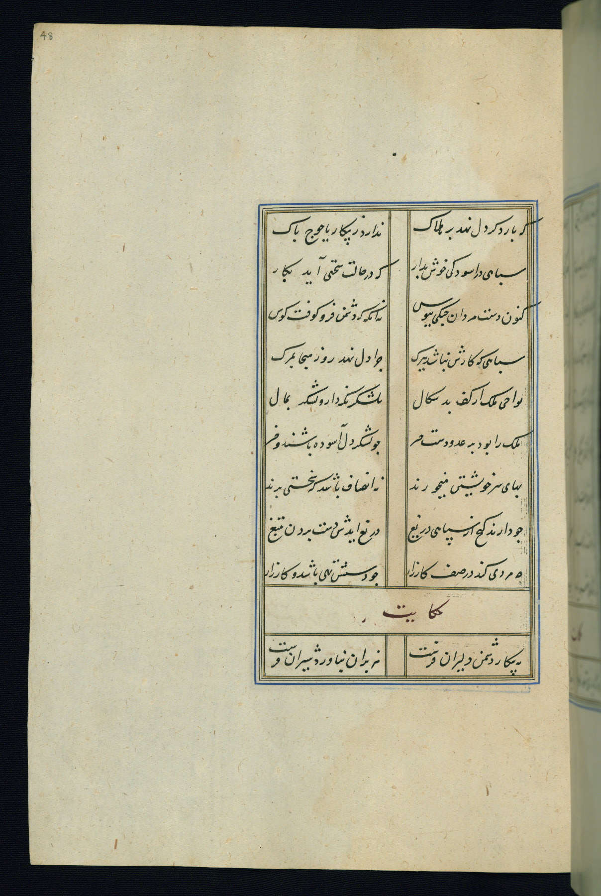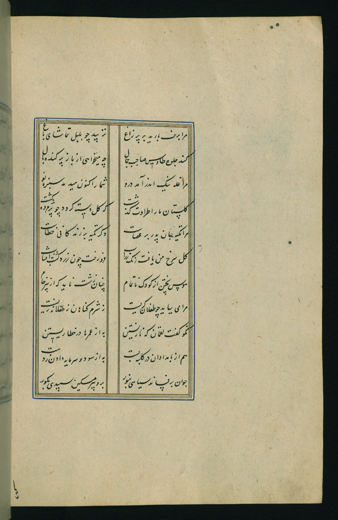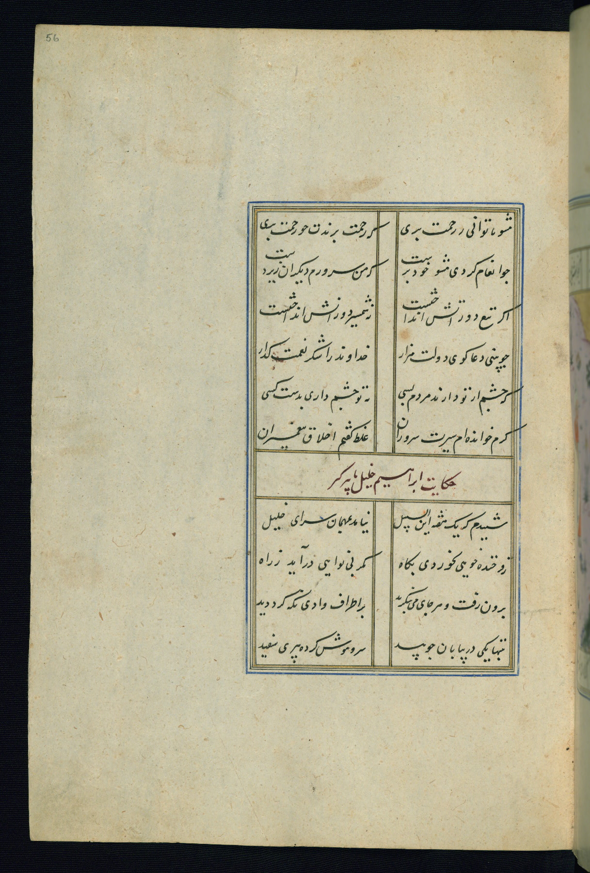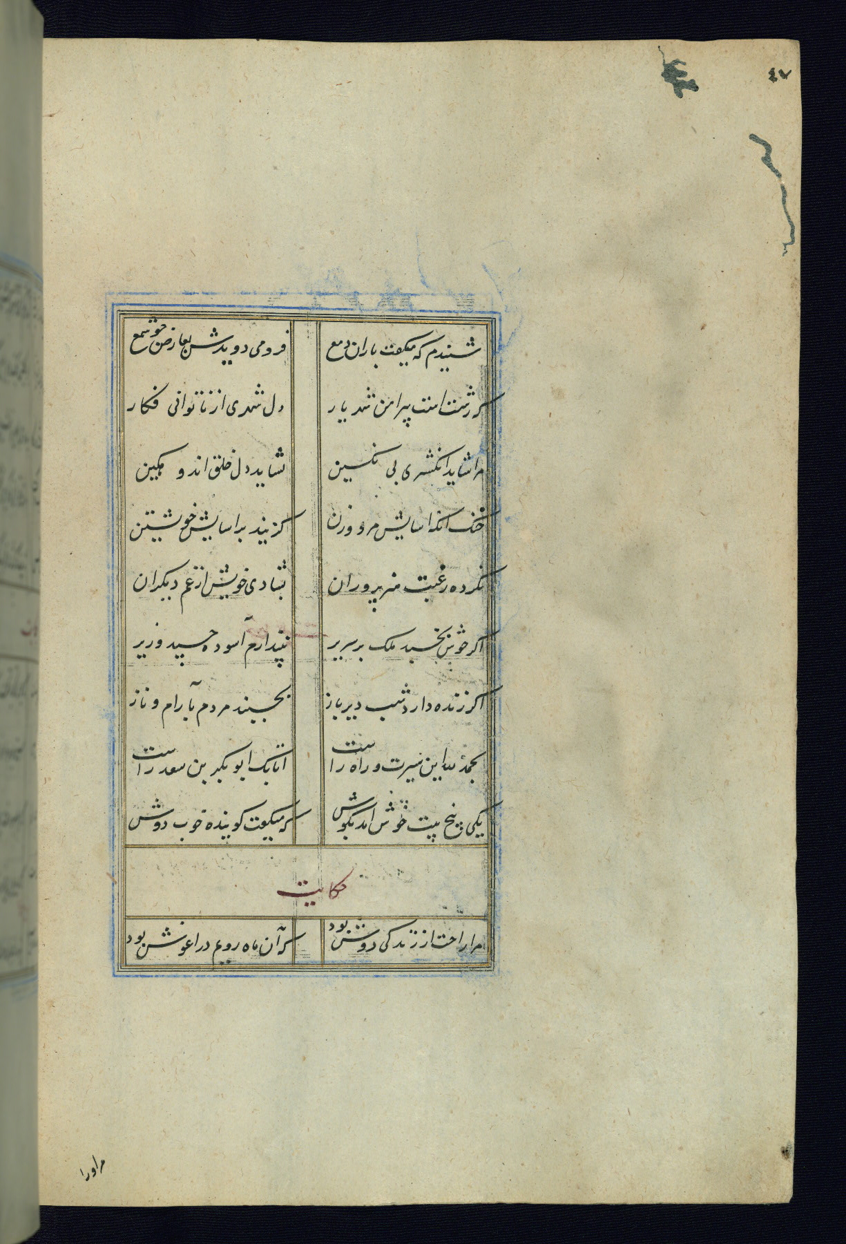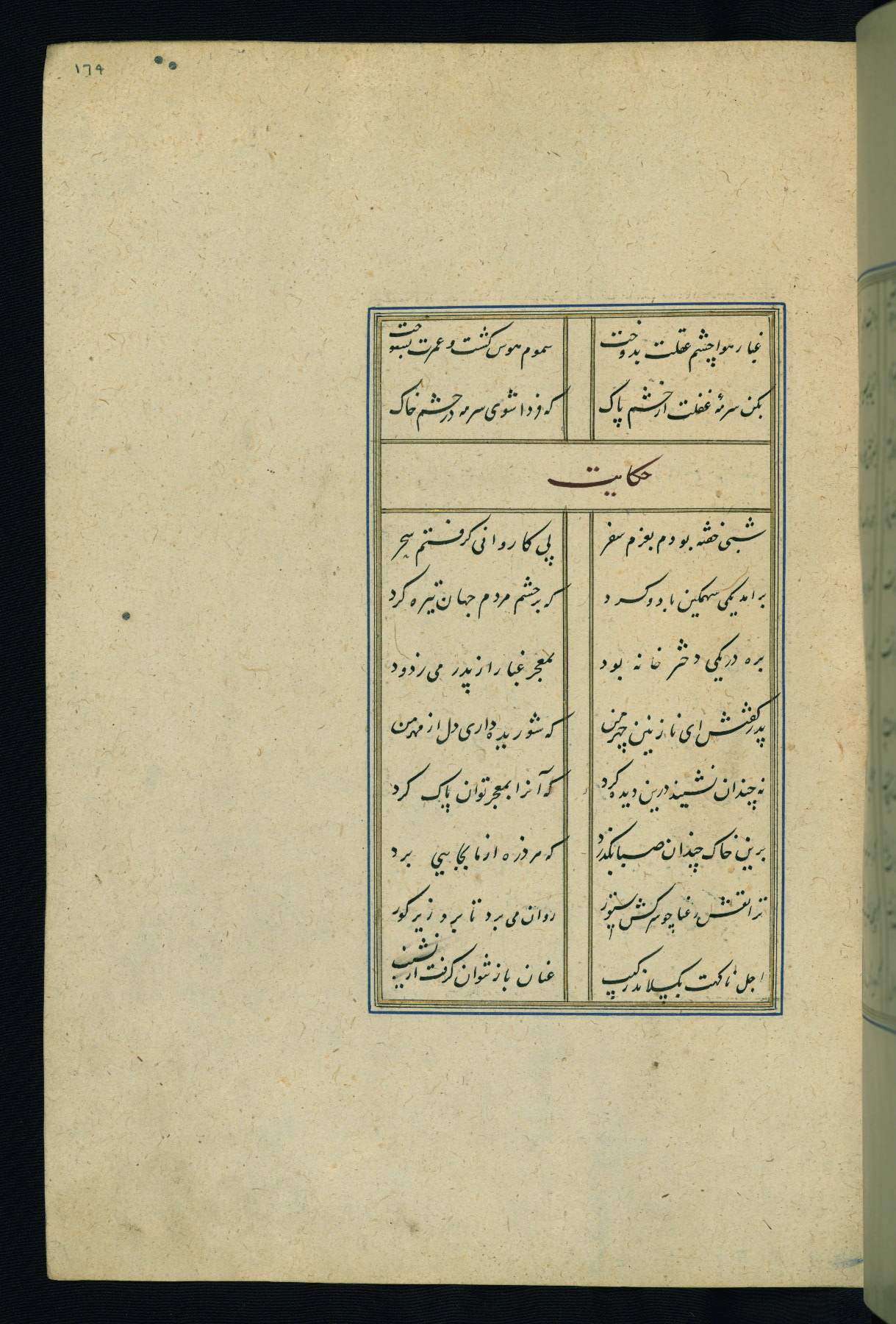 This is an illuminated and illustrated Safavid copy of the Būstān (The garden or The orchard), composed by Sa’dī (d. 691 AH / 1292 CE). It was written in black nasta’līq script in the ninth century AH / sixteenth CE in Iran. The codex opens with a frontispiece with the title Kitāb-i būstān inscribed in an illuminated medallion (fol. 1a), followed by a double-page illustration of a banquet scene in a landscape (fols. 1b-2a). Additionally, there are five paintings illustrating the text (fols. 25a, 55b, 58a, 93b, and 119b). The brown leather, blind-stamped binding decorated with a central oval and pendants is not contemporary with the manuscript.