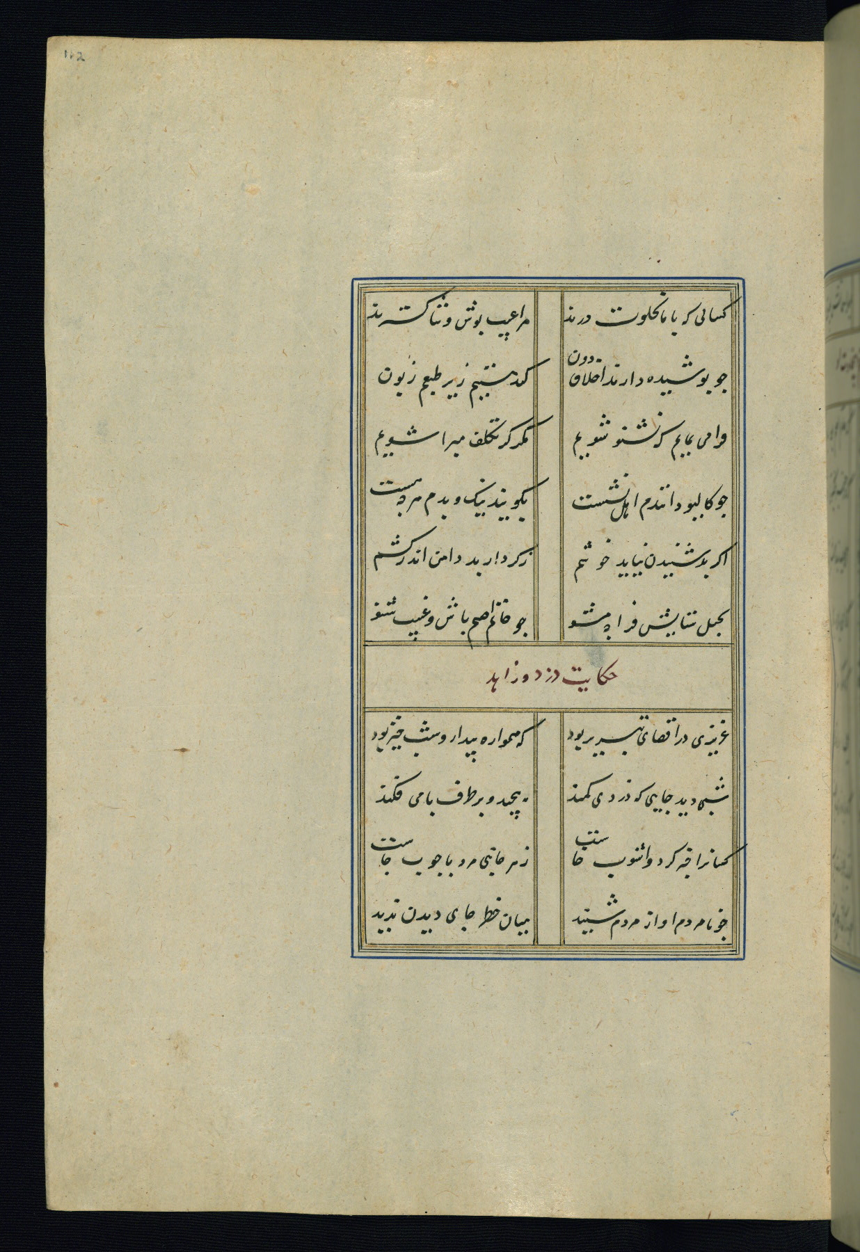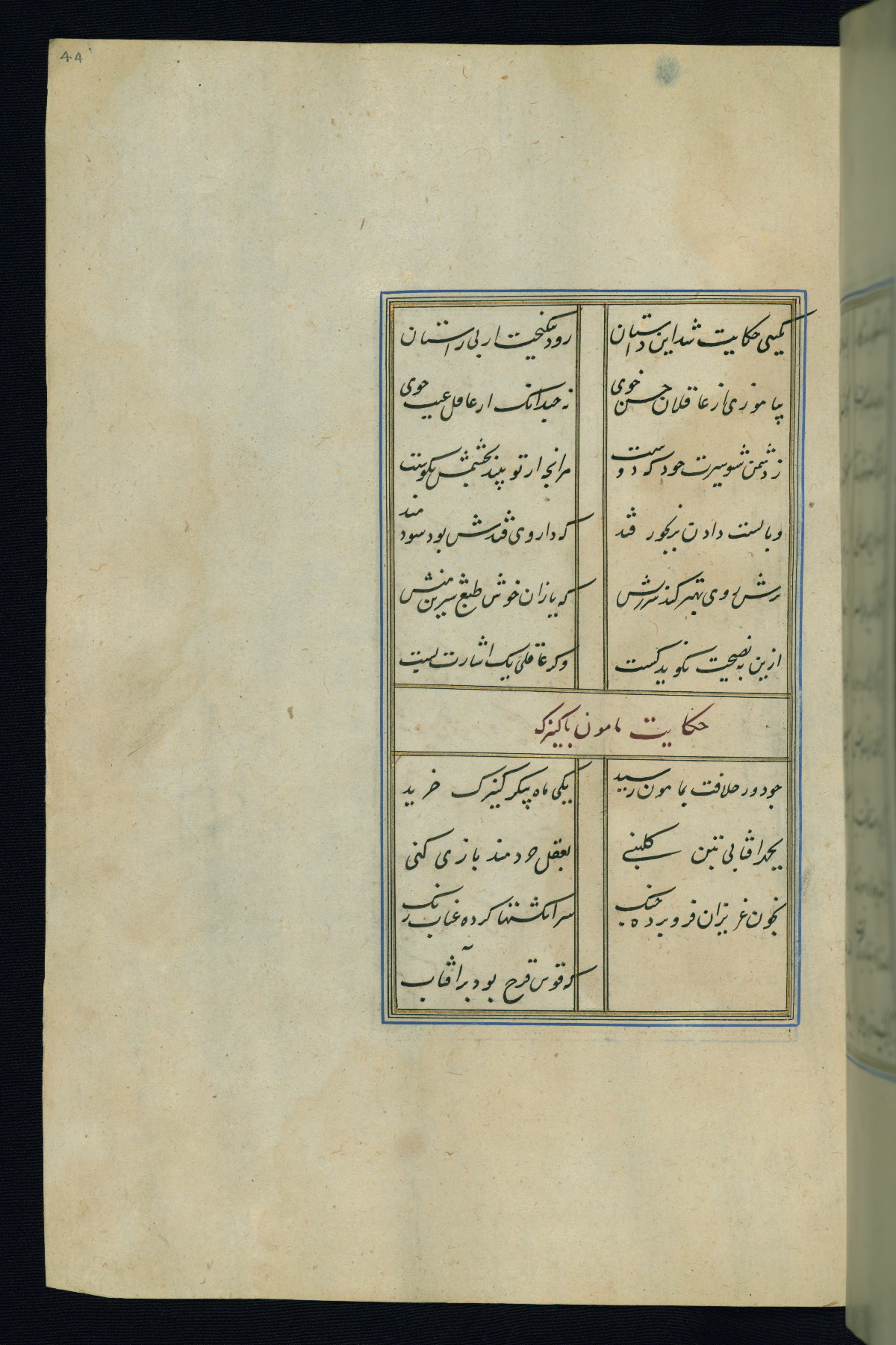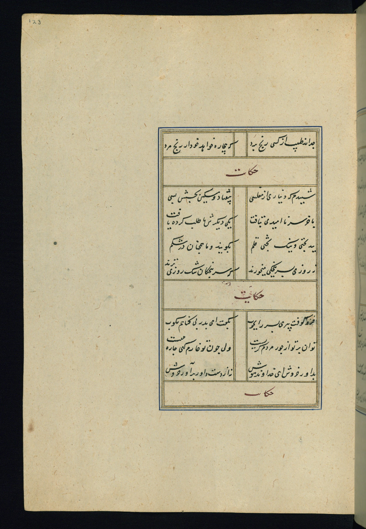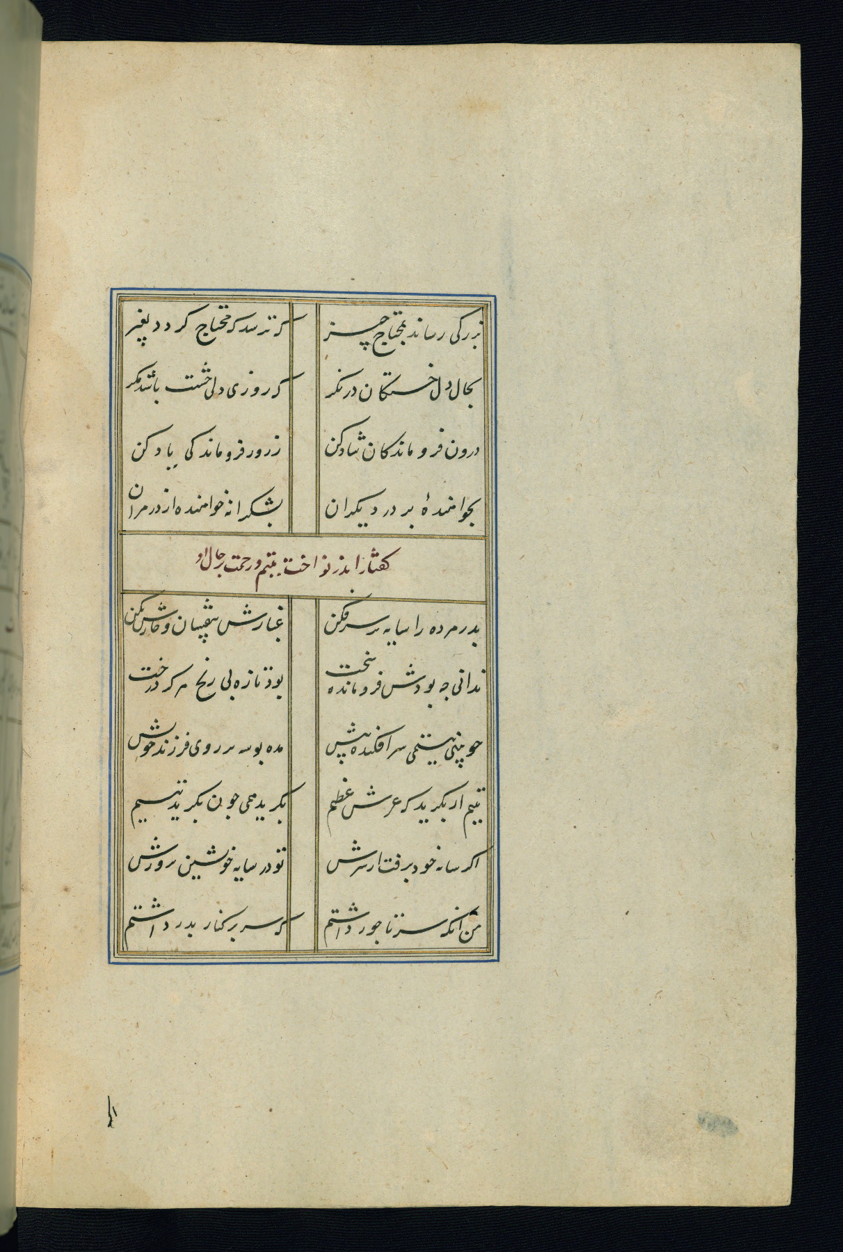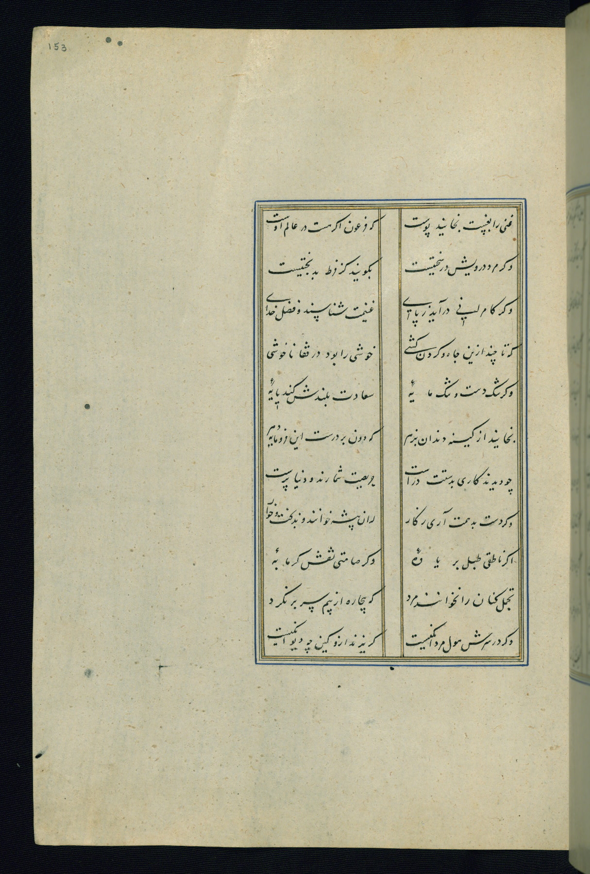 This is an illuminated and illustrated Safavid copy of the Būstān (The garden or The orchard), composed by Sa’dī (d. 691 AH / 1292 CE). It was written in black nasta’līq script in the ninth century AH / sixteenth CE in Iran. The codex opens with a frontispiece with the title Kitāb-i būstān inscribed in an illuminated medallion (fol. 1a), followed by a double-page illustration of a banquet scene in a landscape (fols. 1b-2a). Additionally, there are five paintings illustrating the text (fols. 25a, 55b, 58a, 93b, and 119b). The brown leather, blind-stamped binding decorated with a central oval and pendants is not contemporary with the manuscript.
