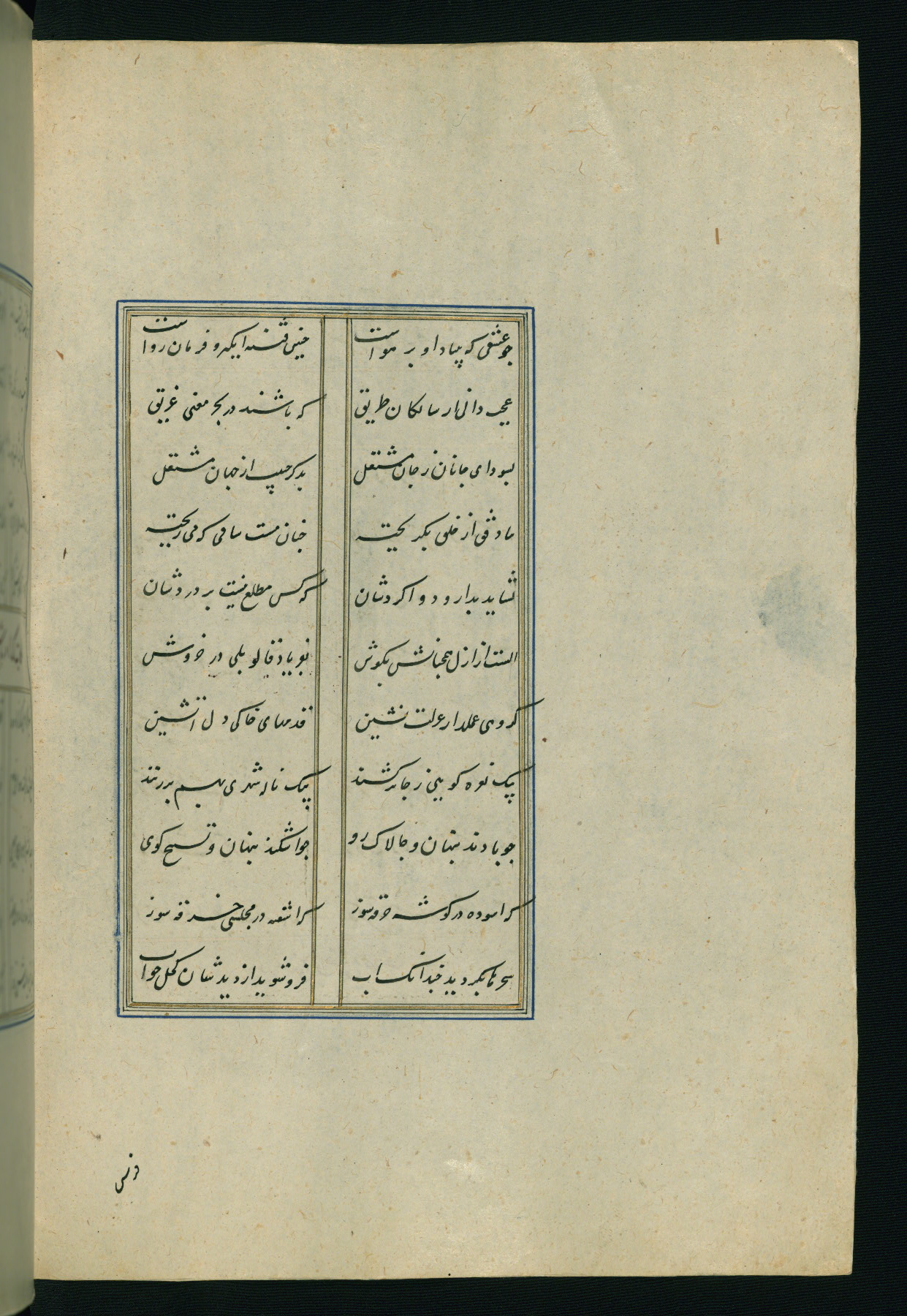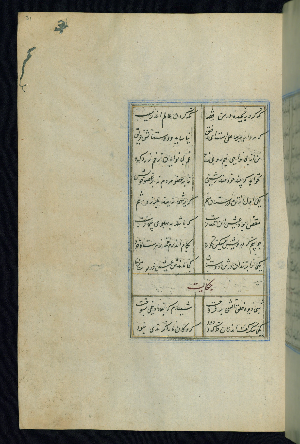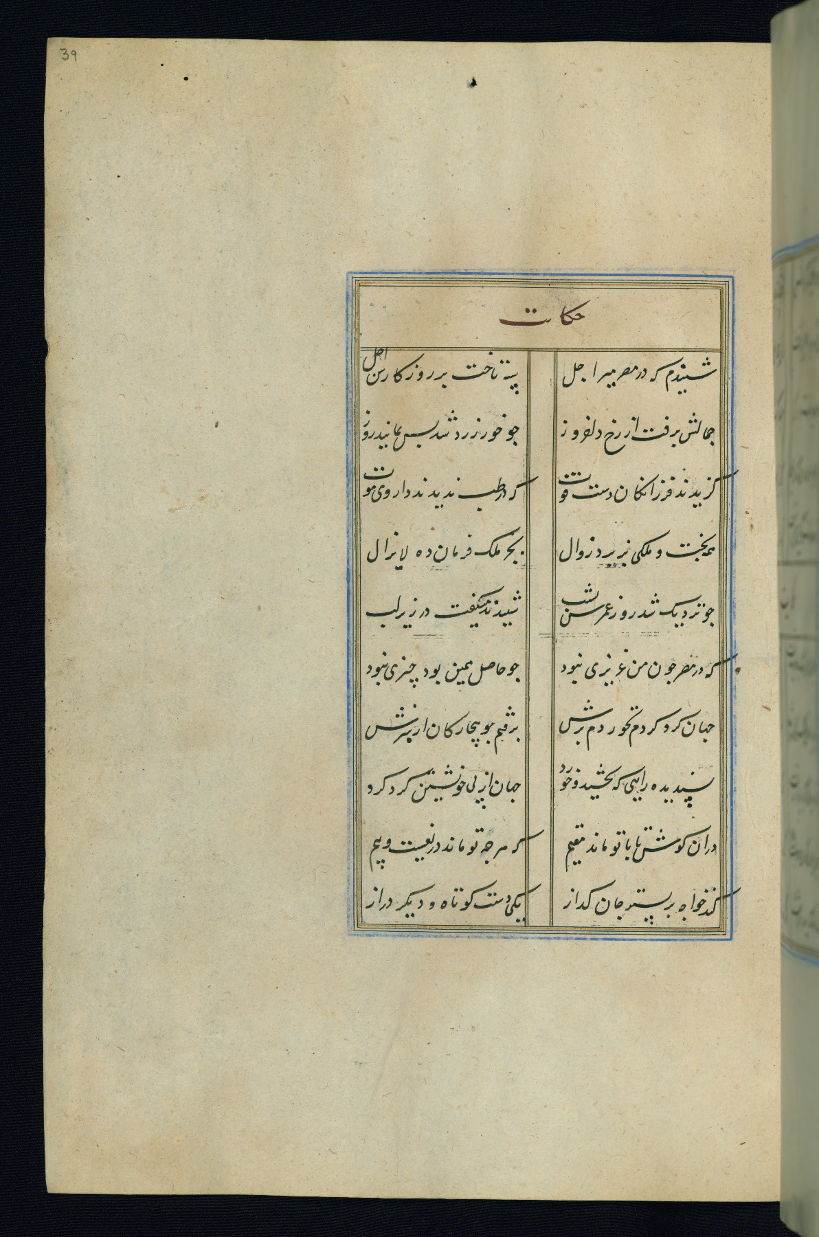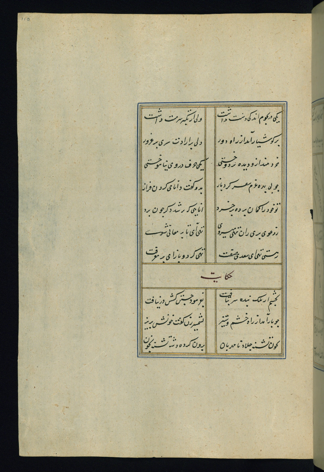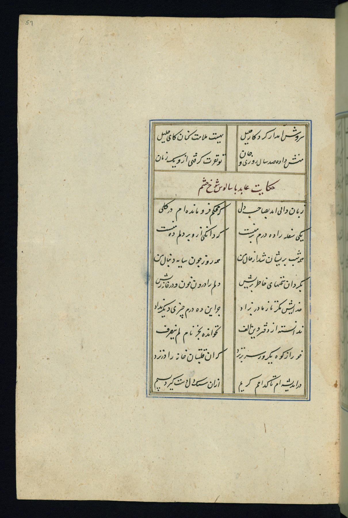 This is an illuminated and illustrated Safavid copy of the Būstān (The garden or The orchard), composed by Sa’dī (d. 691 AH / 1292 CE). It was written in black nasta’līq script in the ninth century AH / sixteenth CE in Iran. The codex opens with a frontispiece with the title Kitāb-i būstān inscribed in an illuminated medallion (fol. 1a), followed by a double-page illustration of a banquet scene in a landscape (fols. 1b-2a). Additionally, there are five paintings illustrating the text (fols. 25a, 55b, 58a, 93b, and 119b). The brown leather, blind-stamped binding decorated with a central oval and pendants is not contemporary with the manuscript.