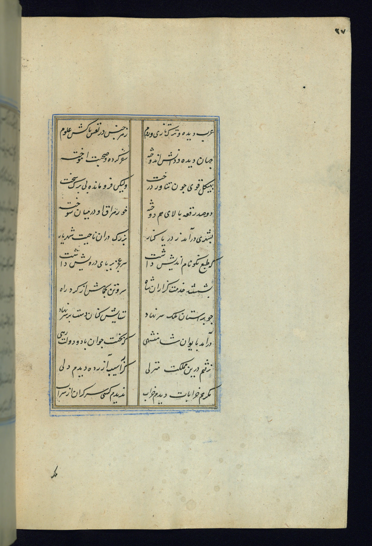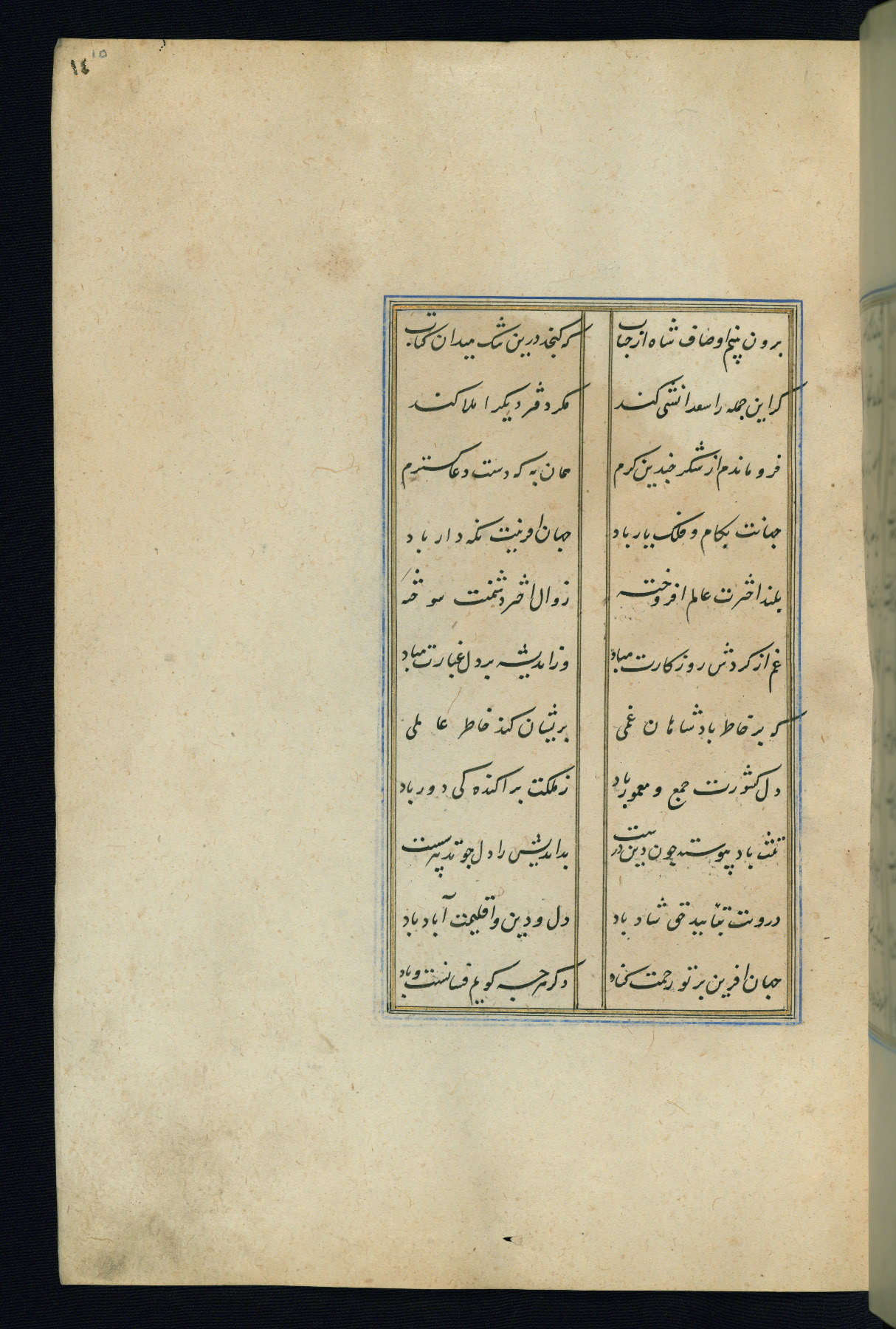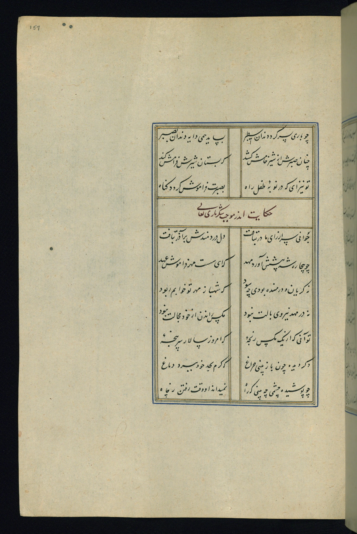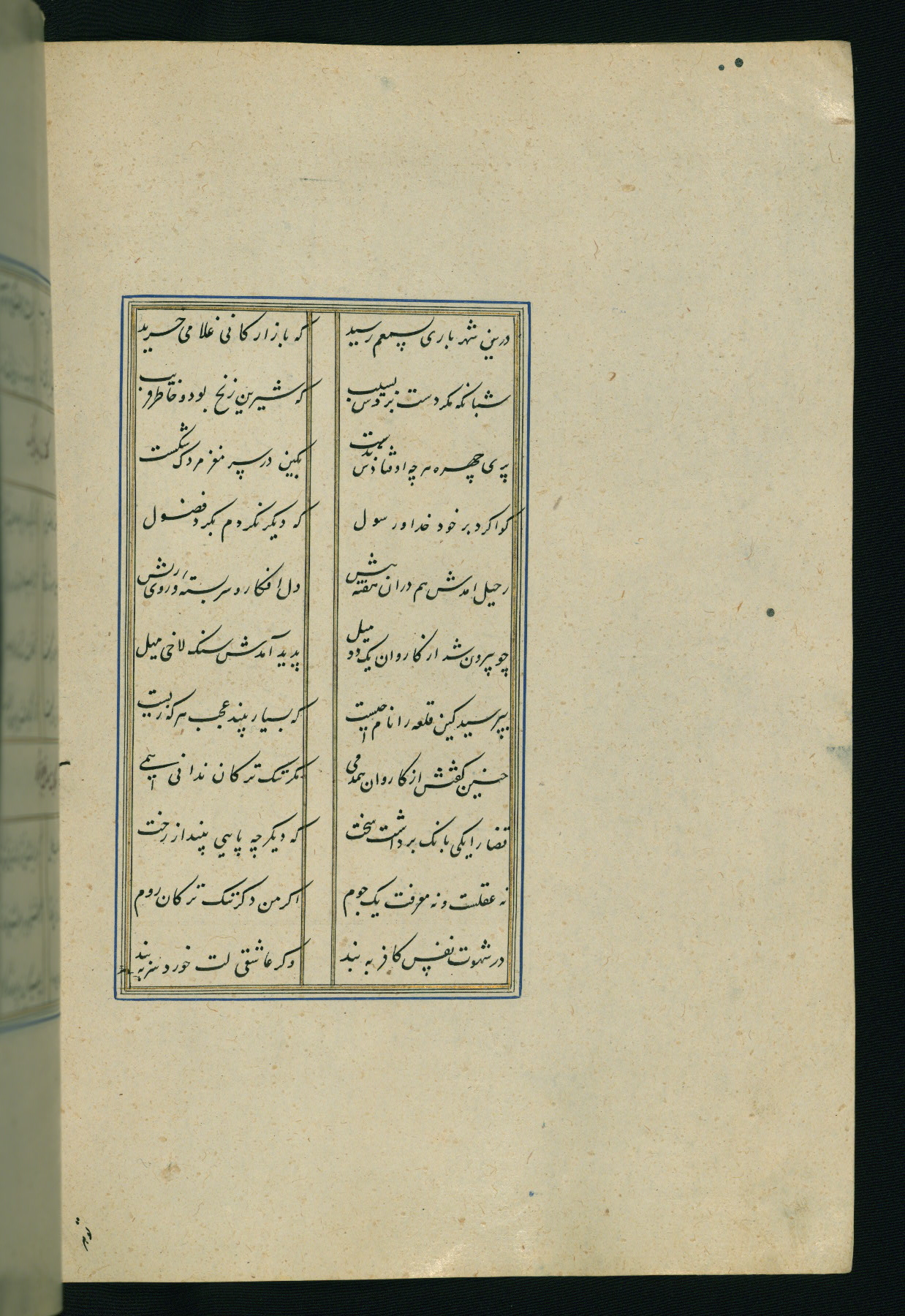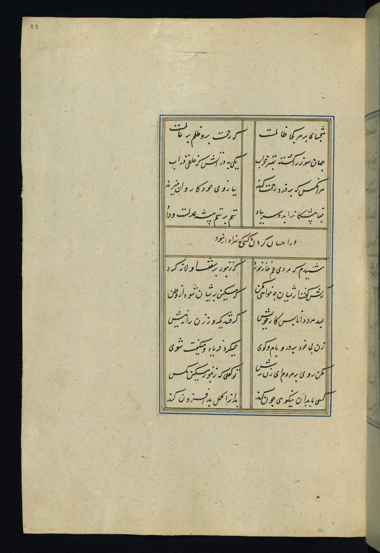 This is an illuminated and illustrated Safavid copy of the Būstān (The garden or The orchard), composed by Sa’dī (d. 691 AH / 1292 CE). It was written in black nasta’līq script in the ninth century AH / sixteenth CE in Iran. The codex opens with a frontispiece with the title Kitāb-i būstān inscribed in an illuminated medallion (fol. 1a), followed by a double-page illustration of a banquet scene in a landscape (fols. 1b-2a). Additionally, there are five paintings illustrating the text (fols. 25a, 55b, 58a, 93b, and 119b). The brown leather, blind-stamped binding decorated with a central oval and pendants is not contemporary with the manuscript.